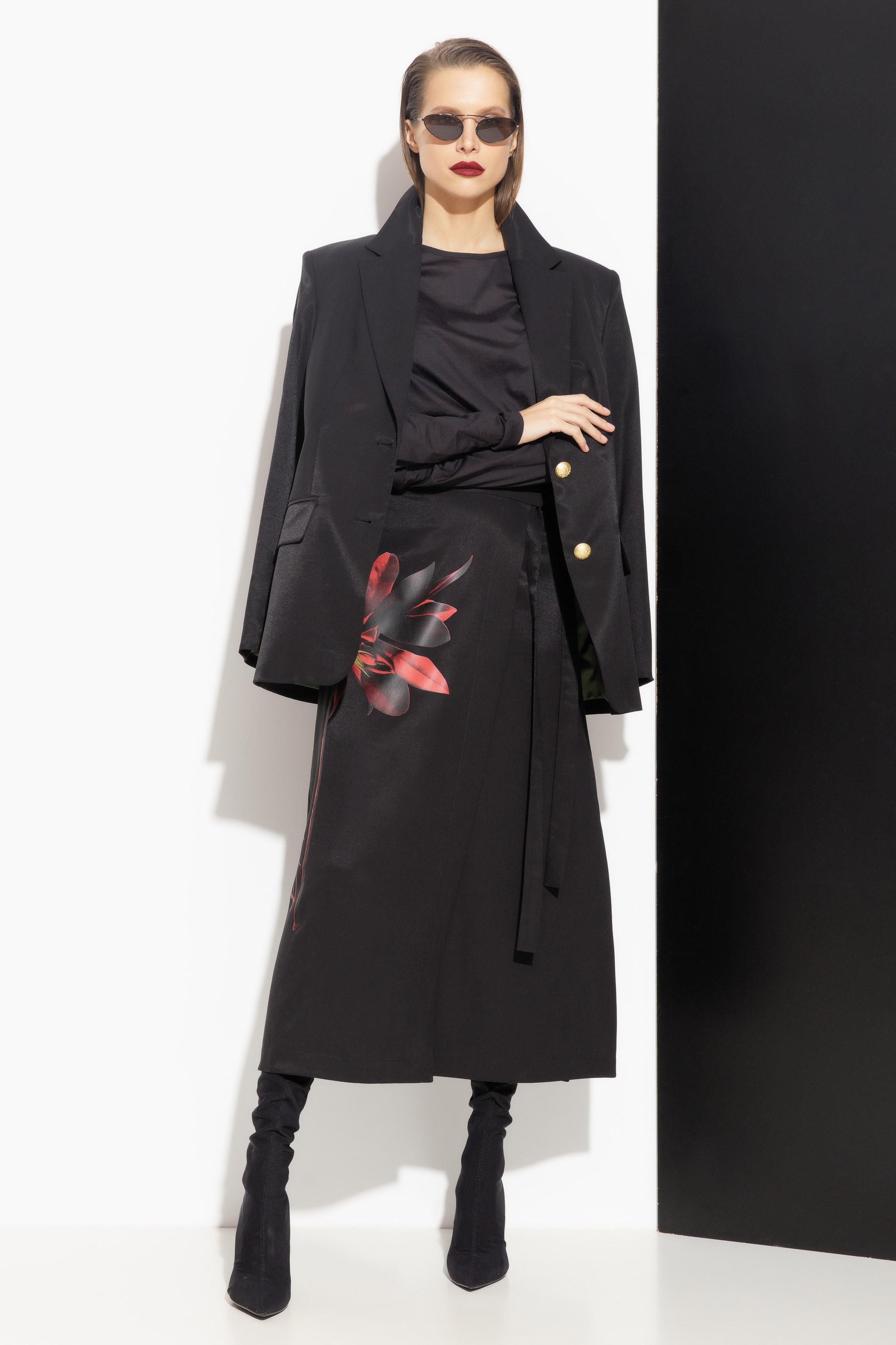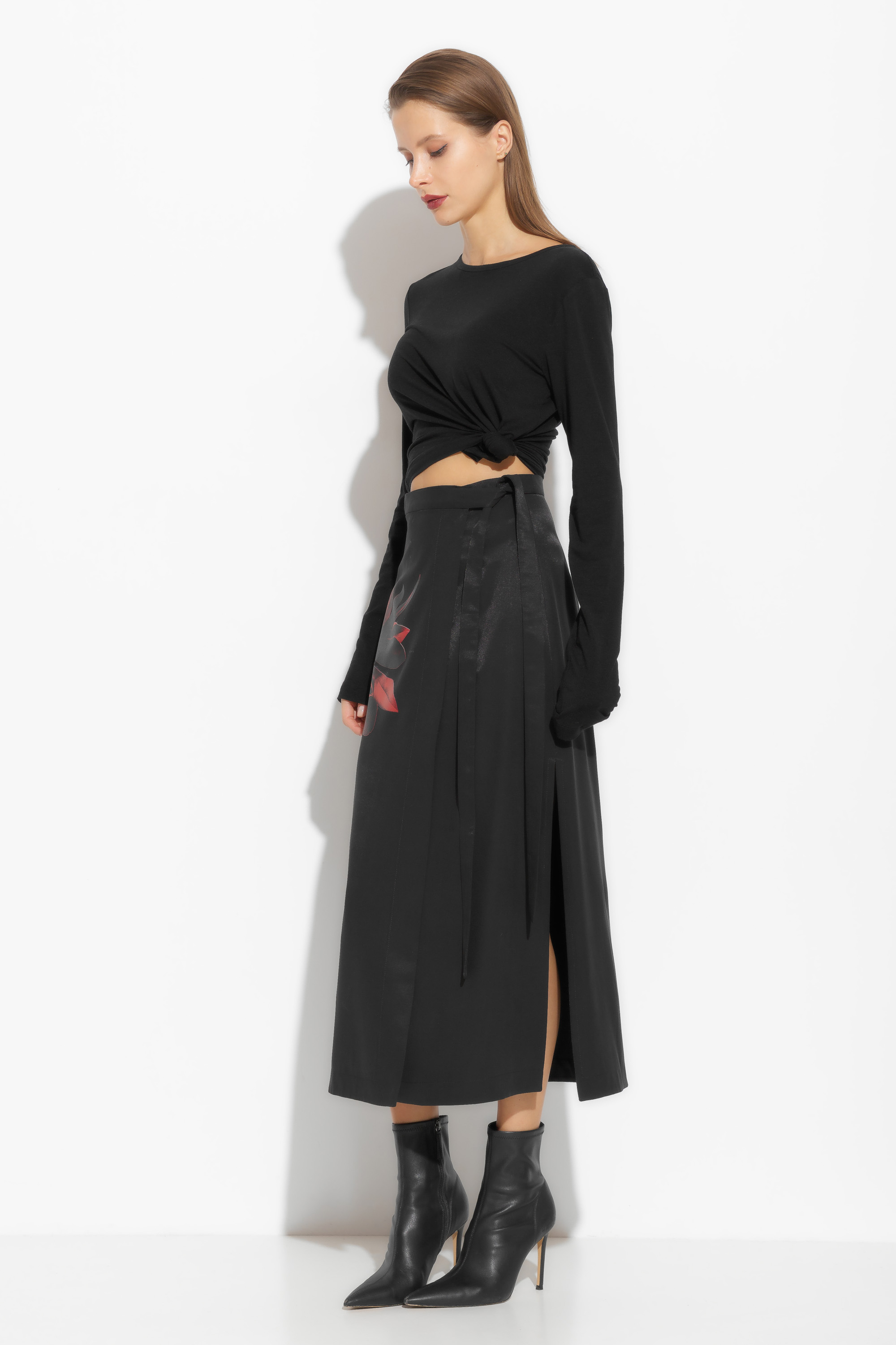 Юбка женская, полуприлегающего силуэта, длинной ниже колен, расширенная от линии бедер к низу, на притачном поясе, застёгивающимся на один крючок и одну потайную пуговицу, с запахом, без подкладки. Передние части юбки цельные с цельнокроеной планкой, правая часть декорирована принтом. Задняя часть юбки цельнокроеная с четырьмя выточками. Пояс юбки с правой стороны с цельнокроеной завязкой, на левой части по поясу настрочена завязка. По левому боковому шву в нижней части разрез.