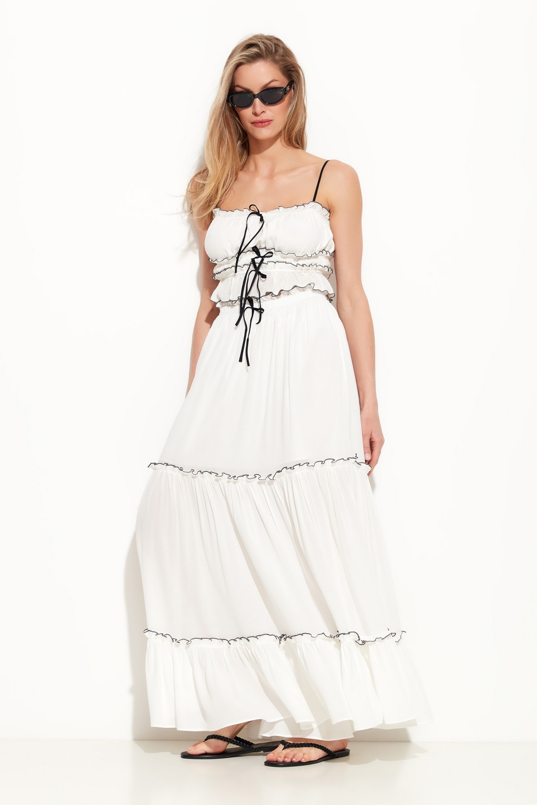Юбка полуприлегающего силуэта в длине макси. Пояс изделия на эластичной резинке, что обеспечивает комфортную посадку в процессе носки. Нижняя часть декорирована объемным воланом. Юбка станет идеальным помощником в создании эффектных летних образов по любому случаю.