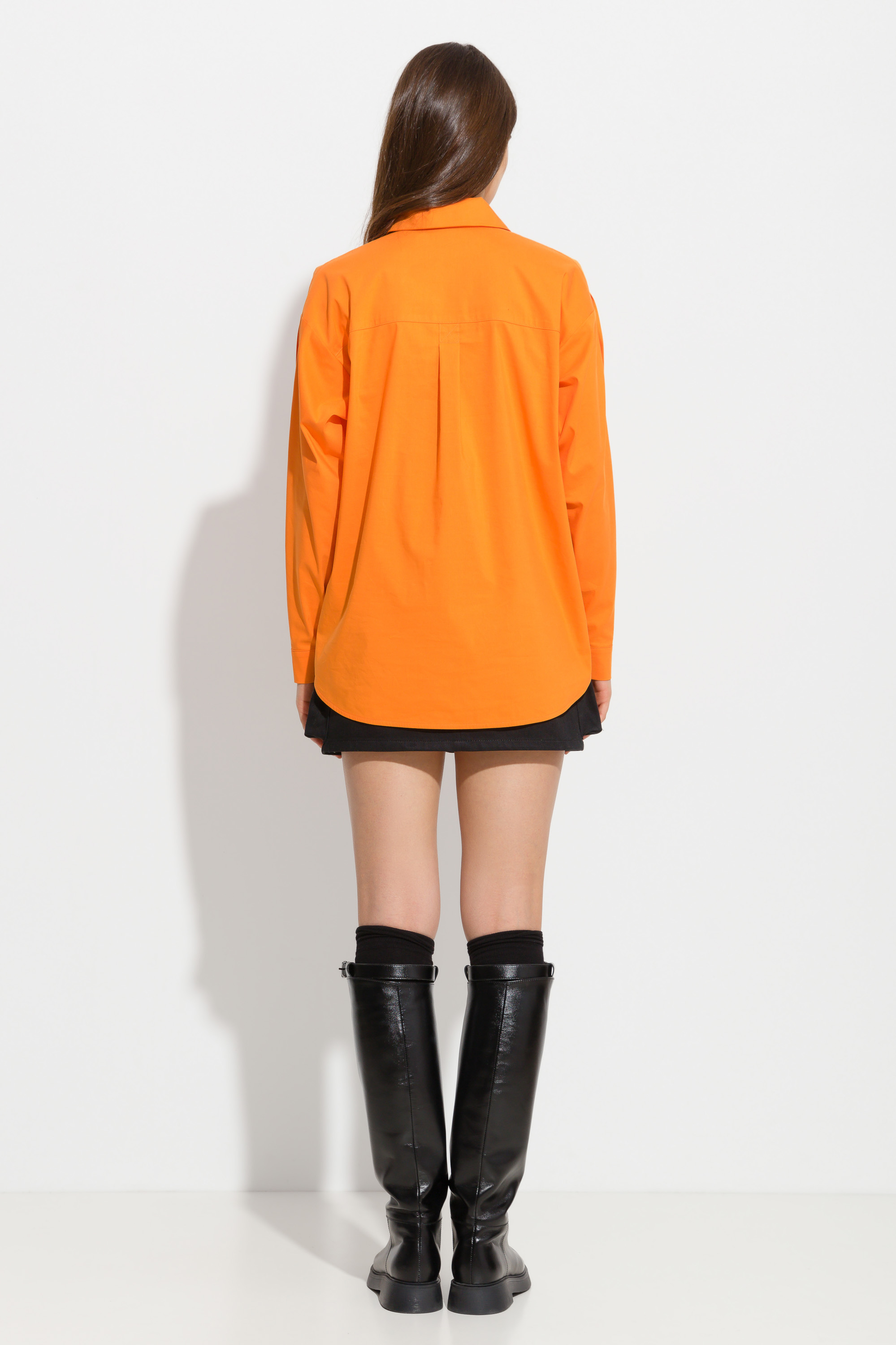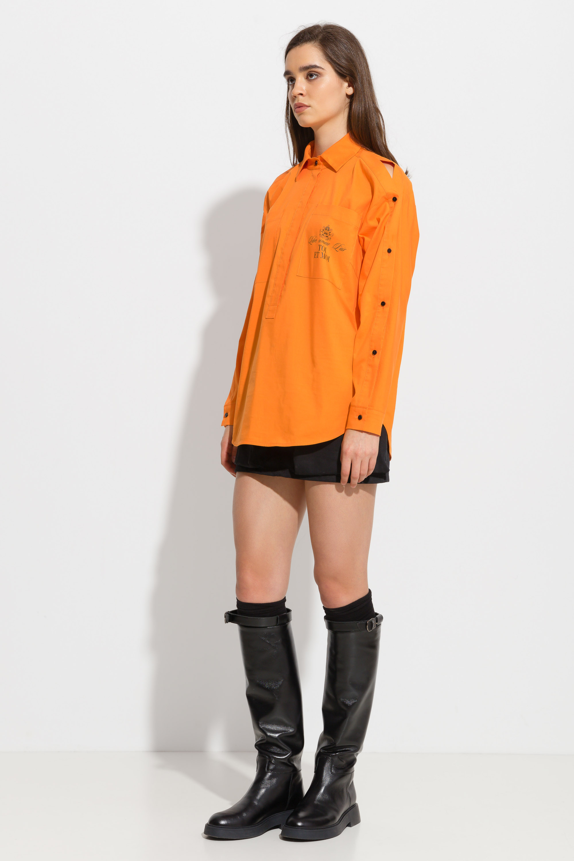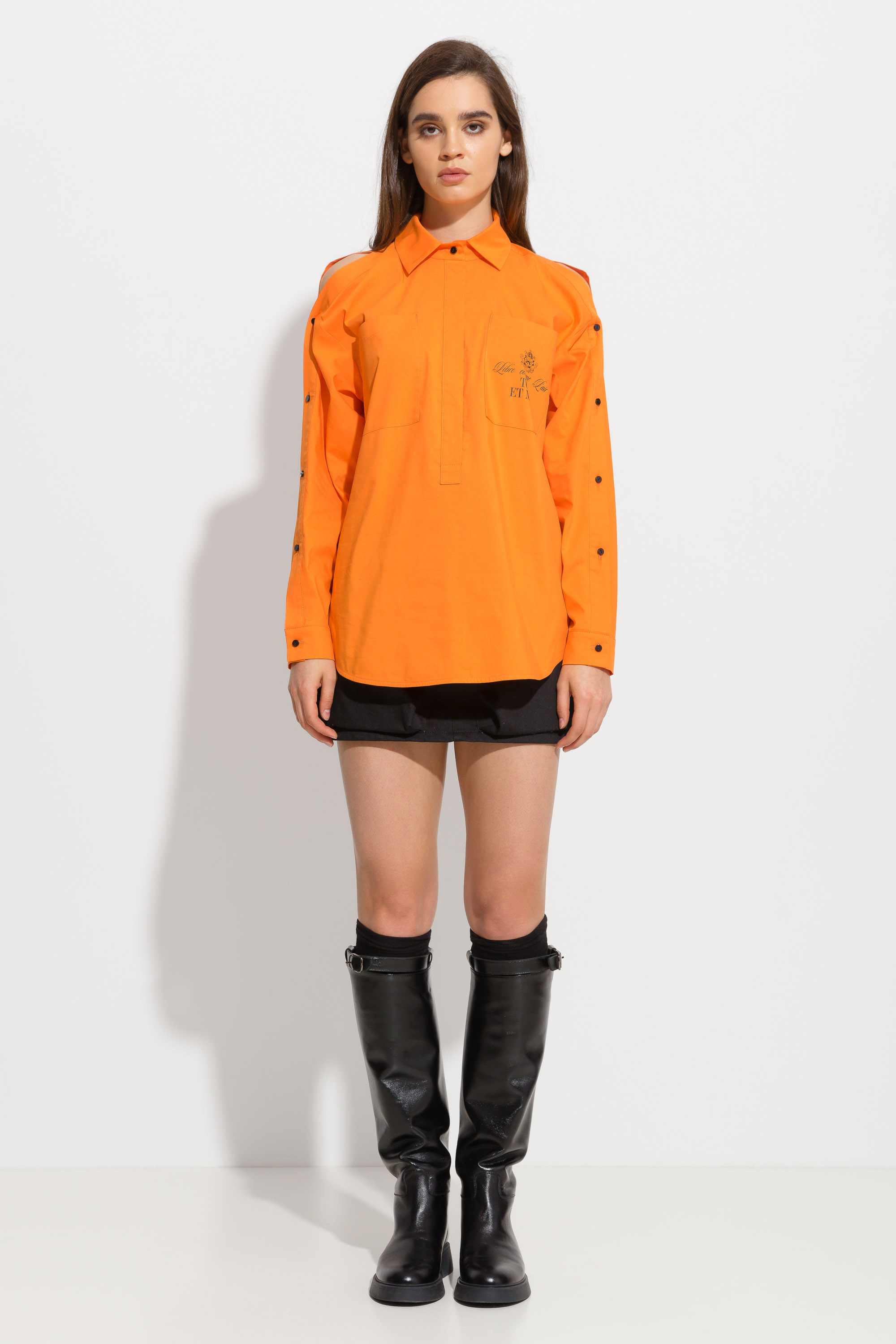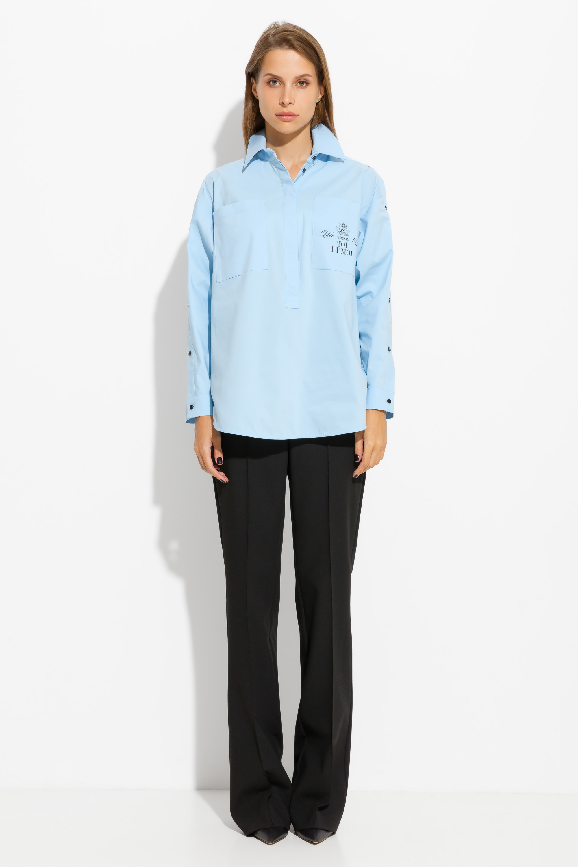 Блузка свободного кроя, длиной до середины линии бедер. Перед изделия декорирован накладным карманом с принтом. Воротник стояче-отложной. Рукава декорированы разрезами, которые регулируются при помощи пуговиц. Трендовая модель для создания стильных аутфитов.
