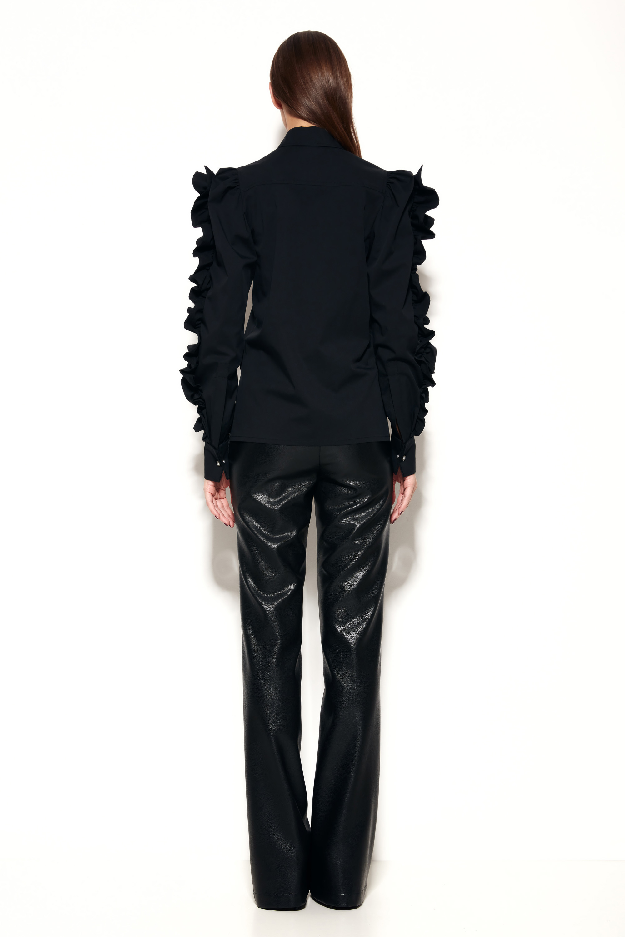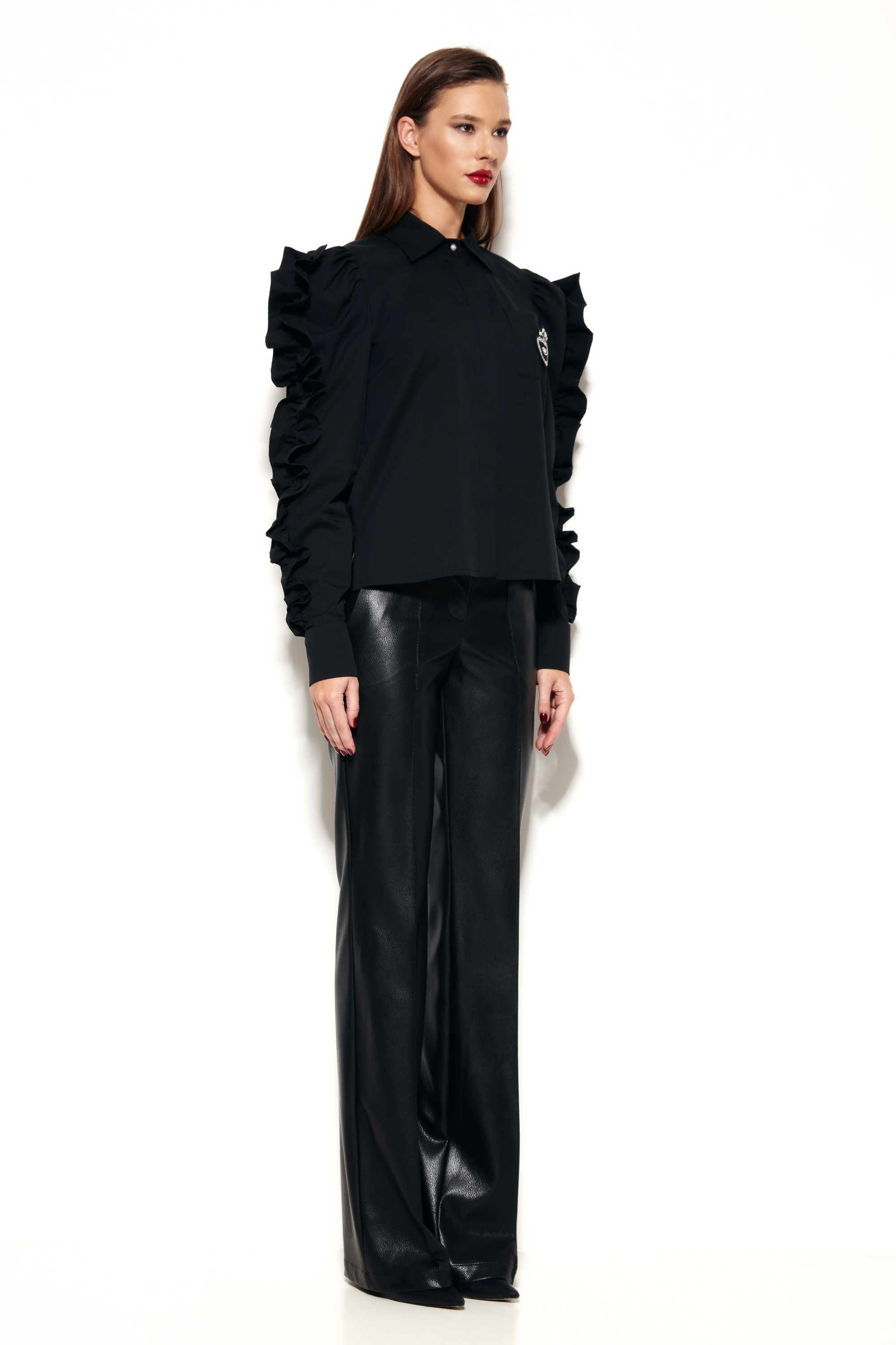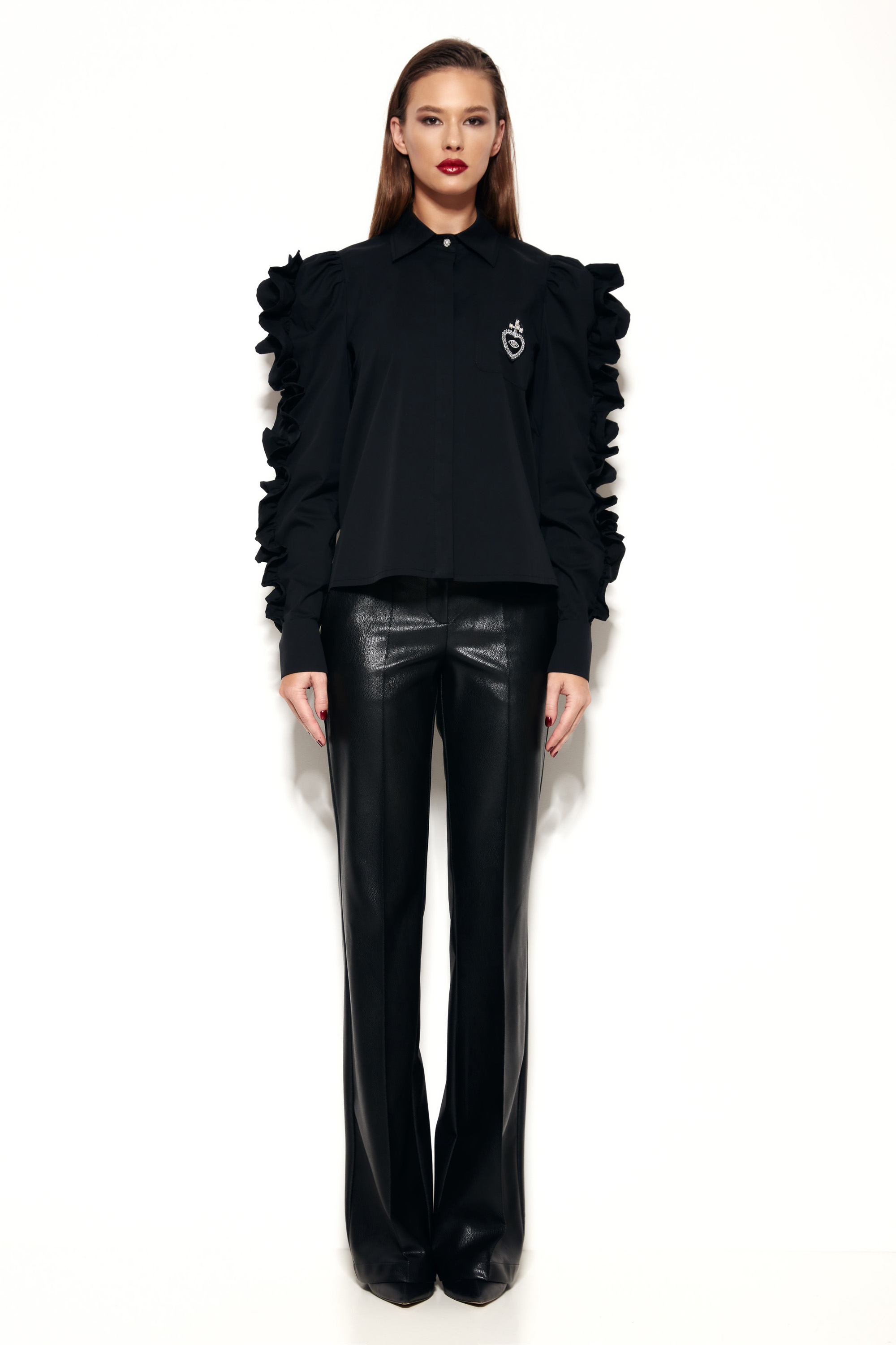 Блуза полуприлегающего силуэта, длиной до середины линии бедер. Воротник отложной. На груди накладной карман декорированный нашивкой. Рукава на широких манжетах, с воланами из аналогичной ткани. Классическая, эффектная модель, которая идеально подойдет для образов как по особому случаю, так и для стильных ежедневных аутфитов.