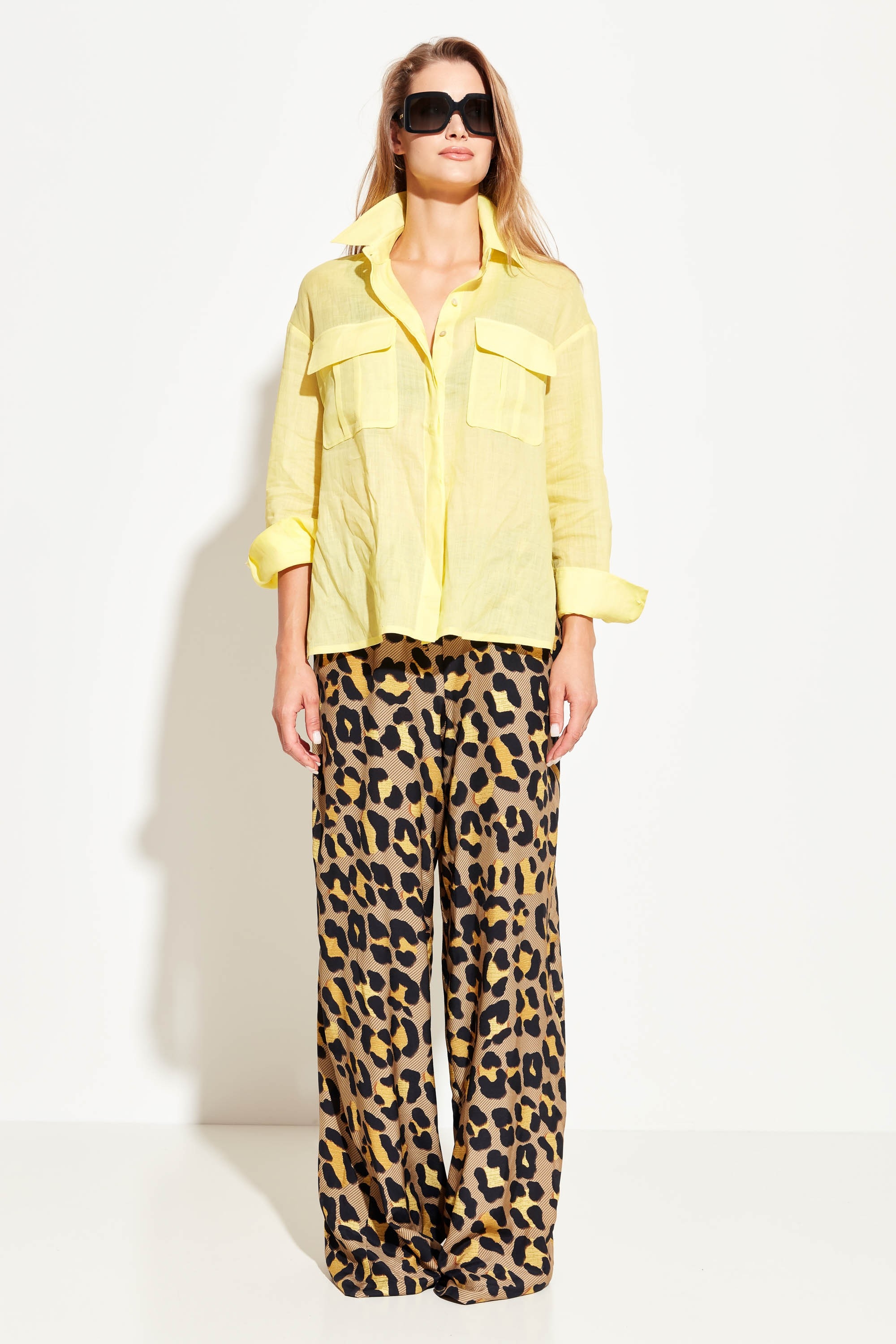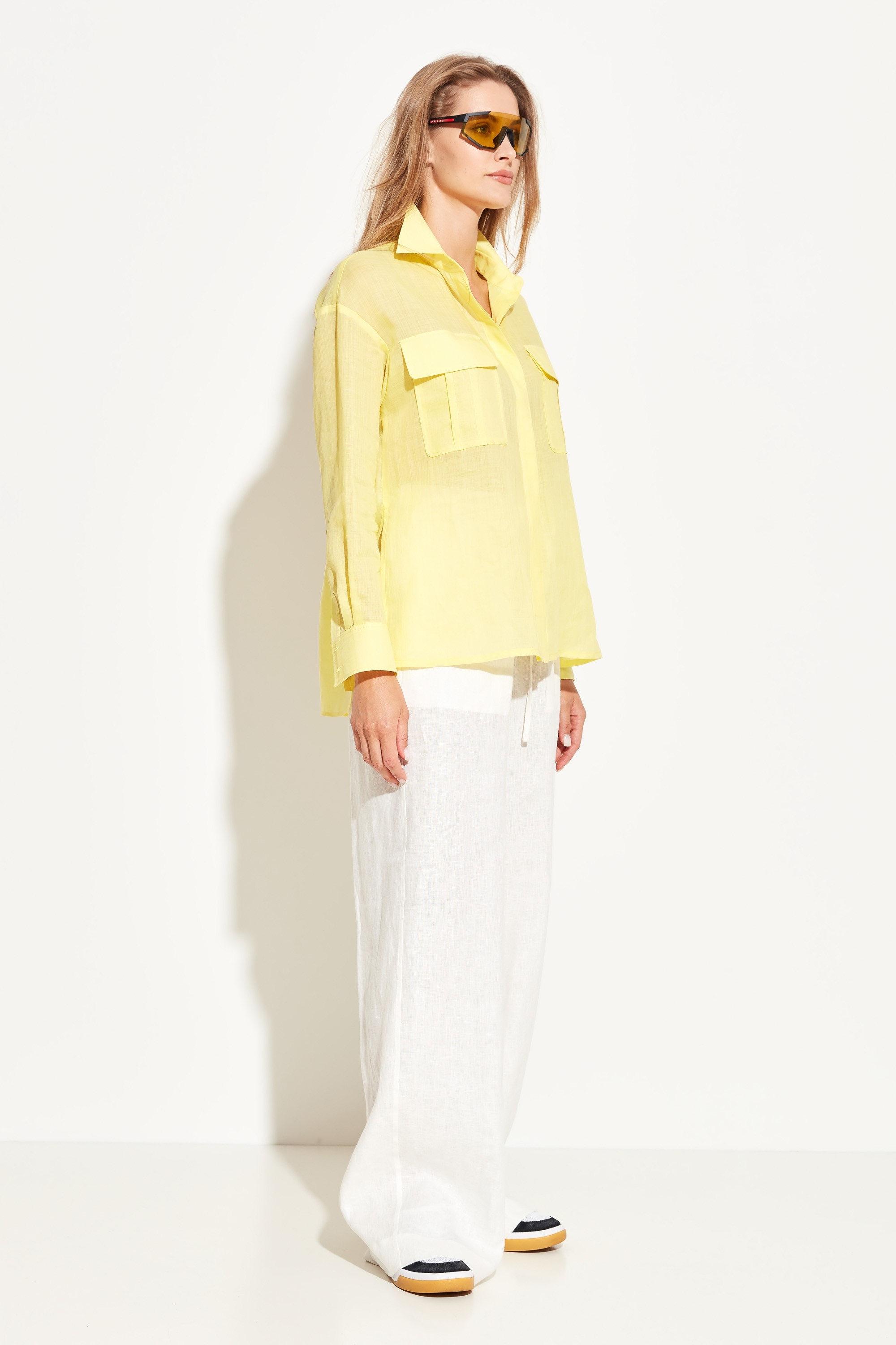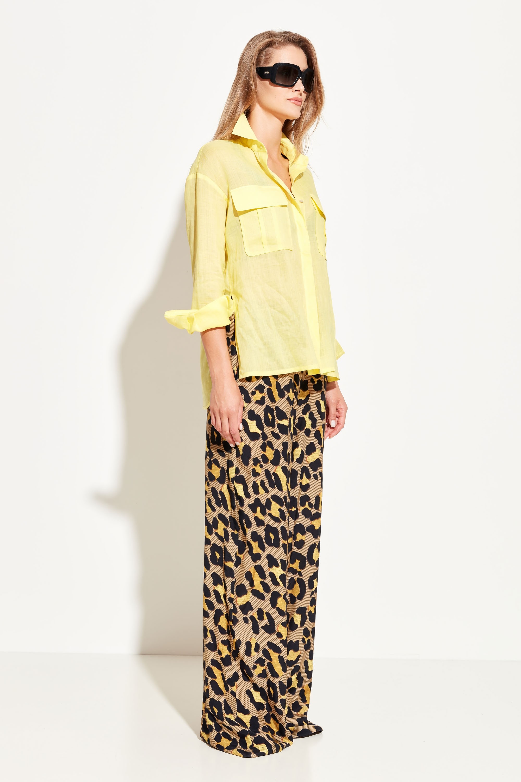 Блуза полуприлегающего силуэта, разновеликой длины. Воротник стояче-отложной. Линия плеч спущена. На груди накладные карманы с клапанами. Полупрозрачная ткань и расслабленный крой блузы добавляют образу воздушности и романтичности. Стильная модель для создания летних аутфитов.