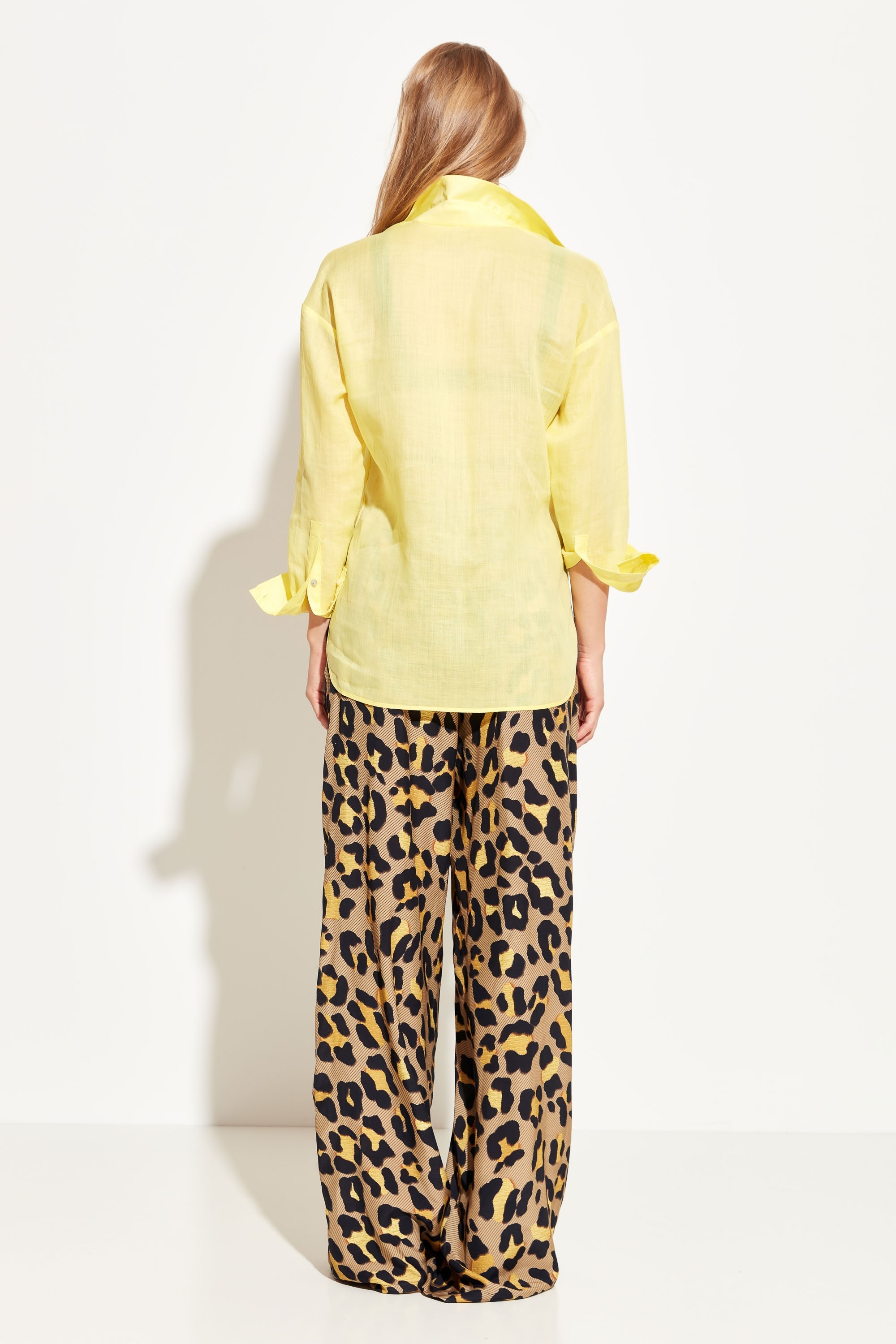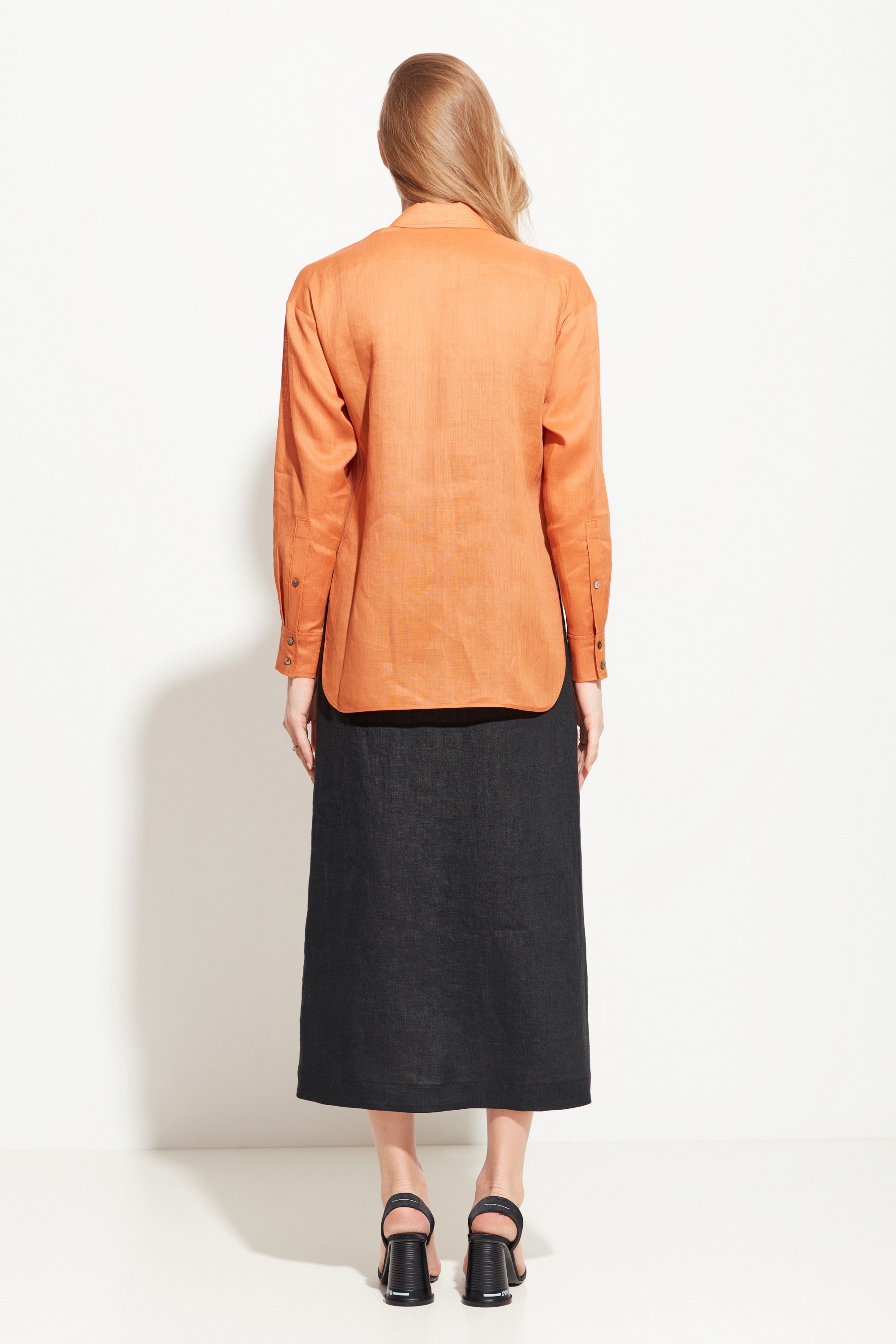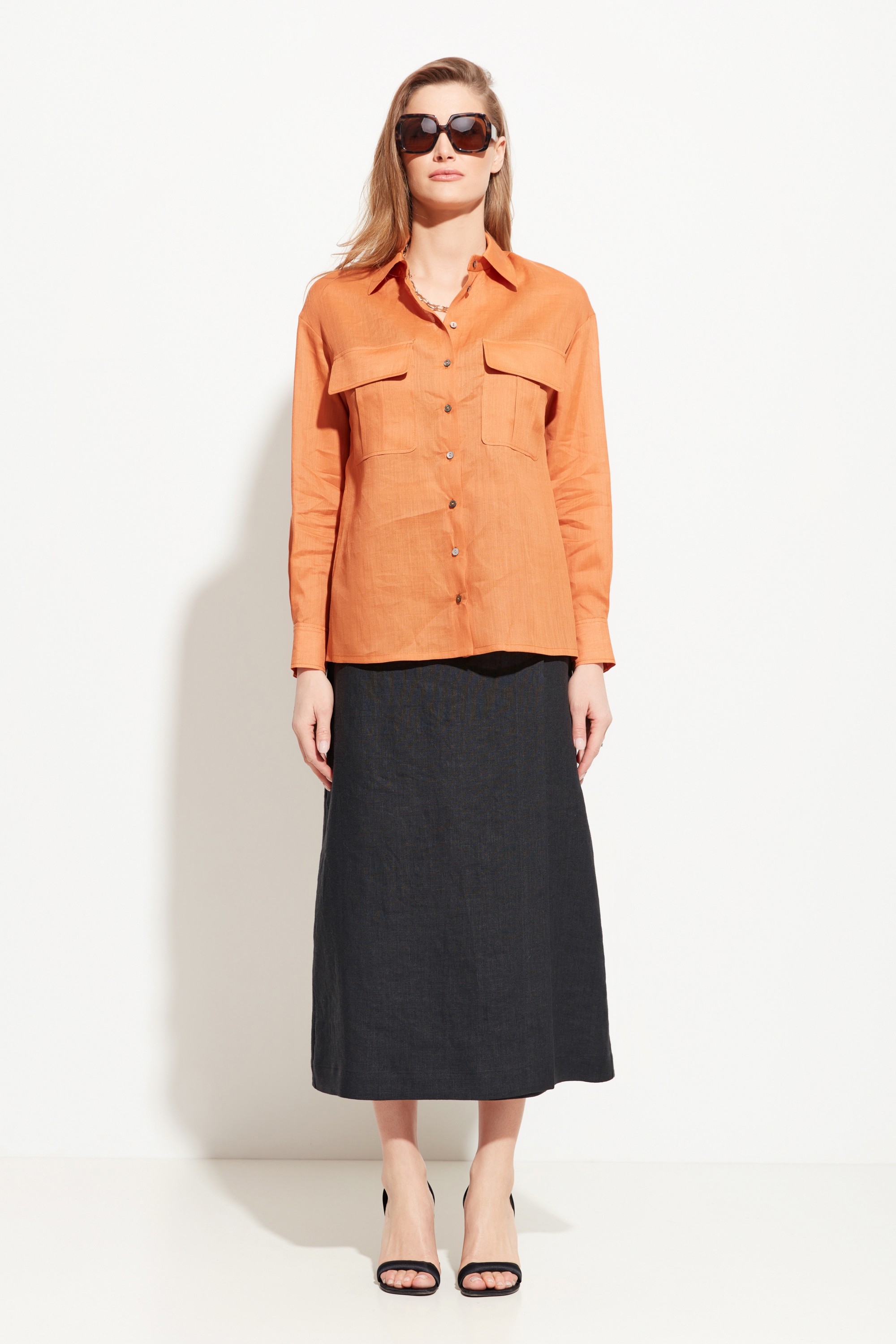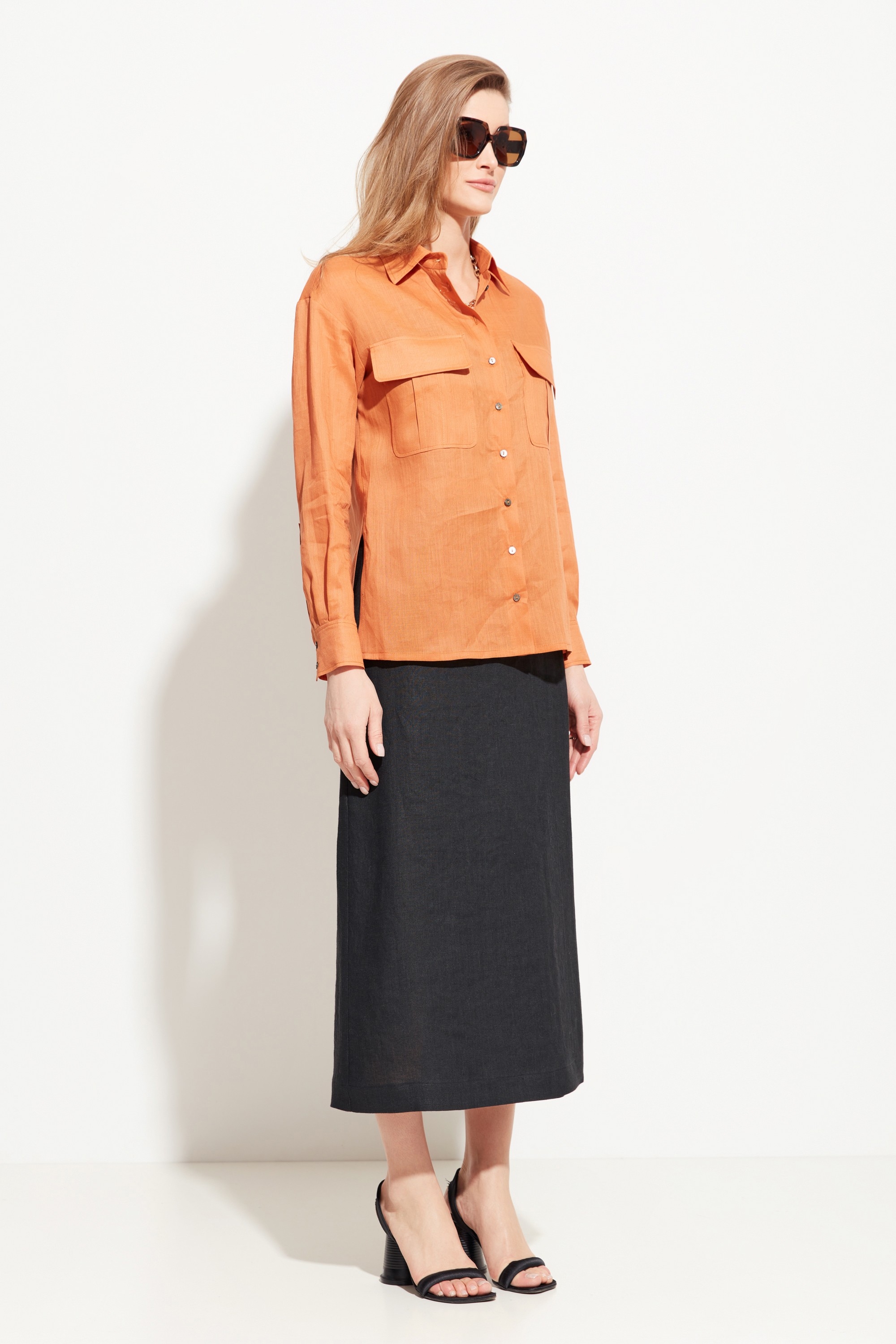 Блуза полуприлегающего силуэта, разновеликой длины. Воротник стояче-отложной. Линия плеч спущена. На груди накладные карманы с клапанами. Полупрозрачная ткань и расслабленный крой блузы добавляют образу воздушности и романтичности. Стильная модель для создания летних аутфитов.