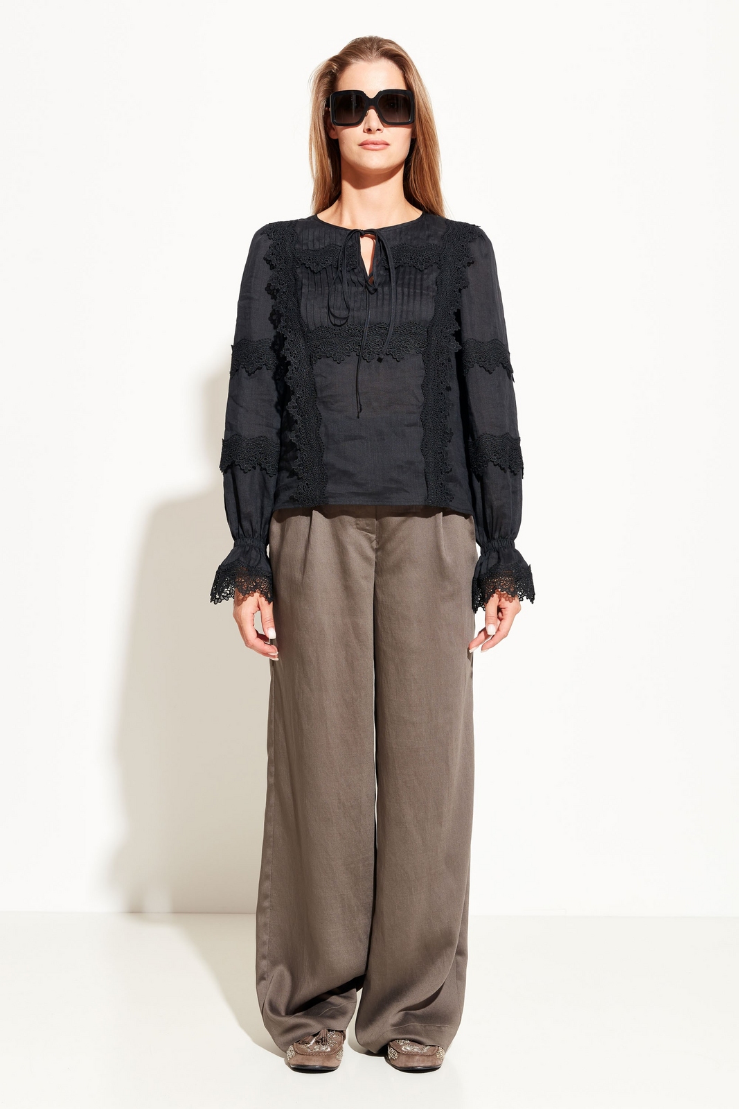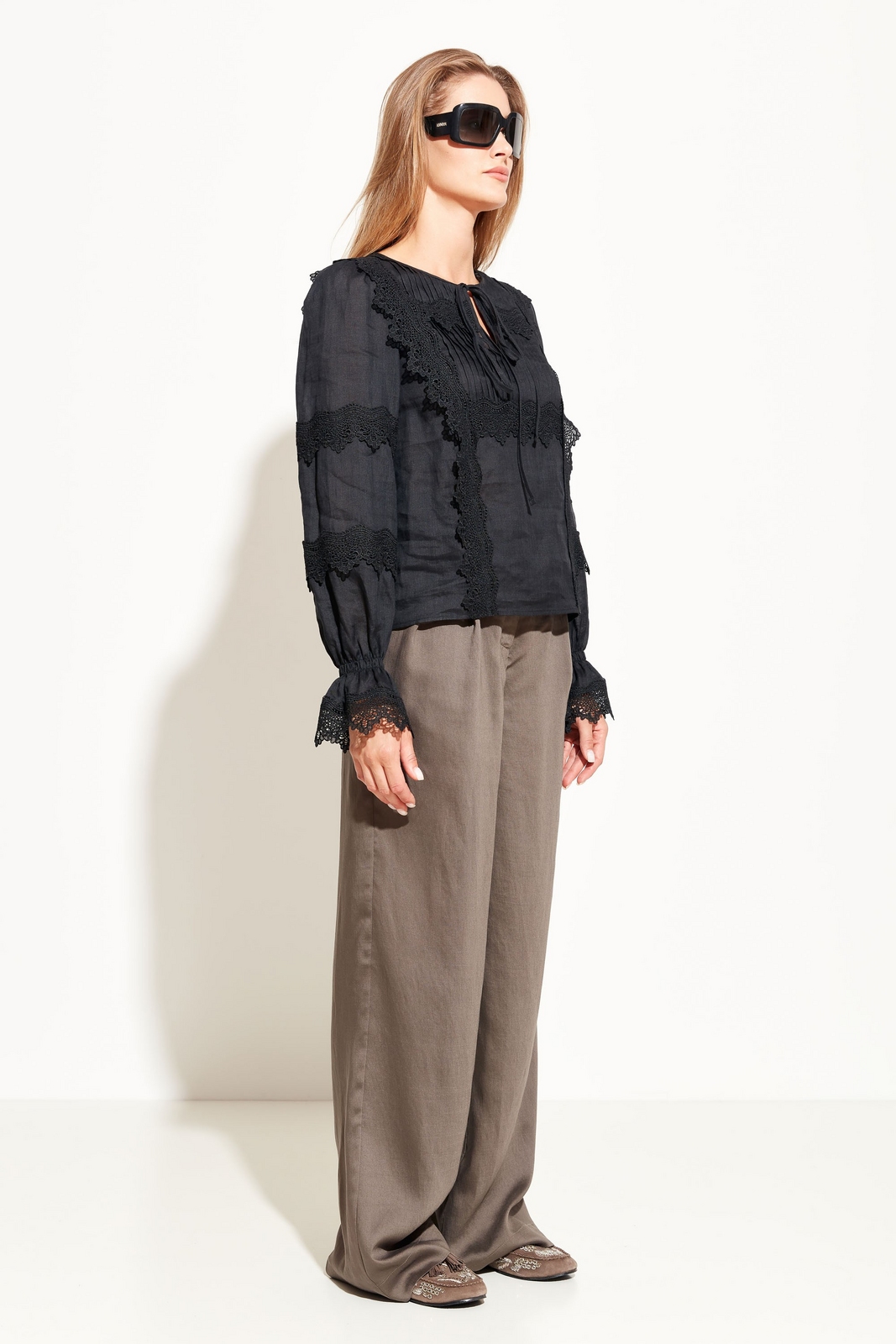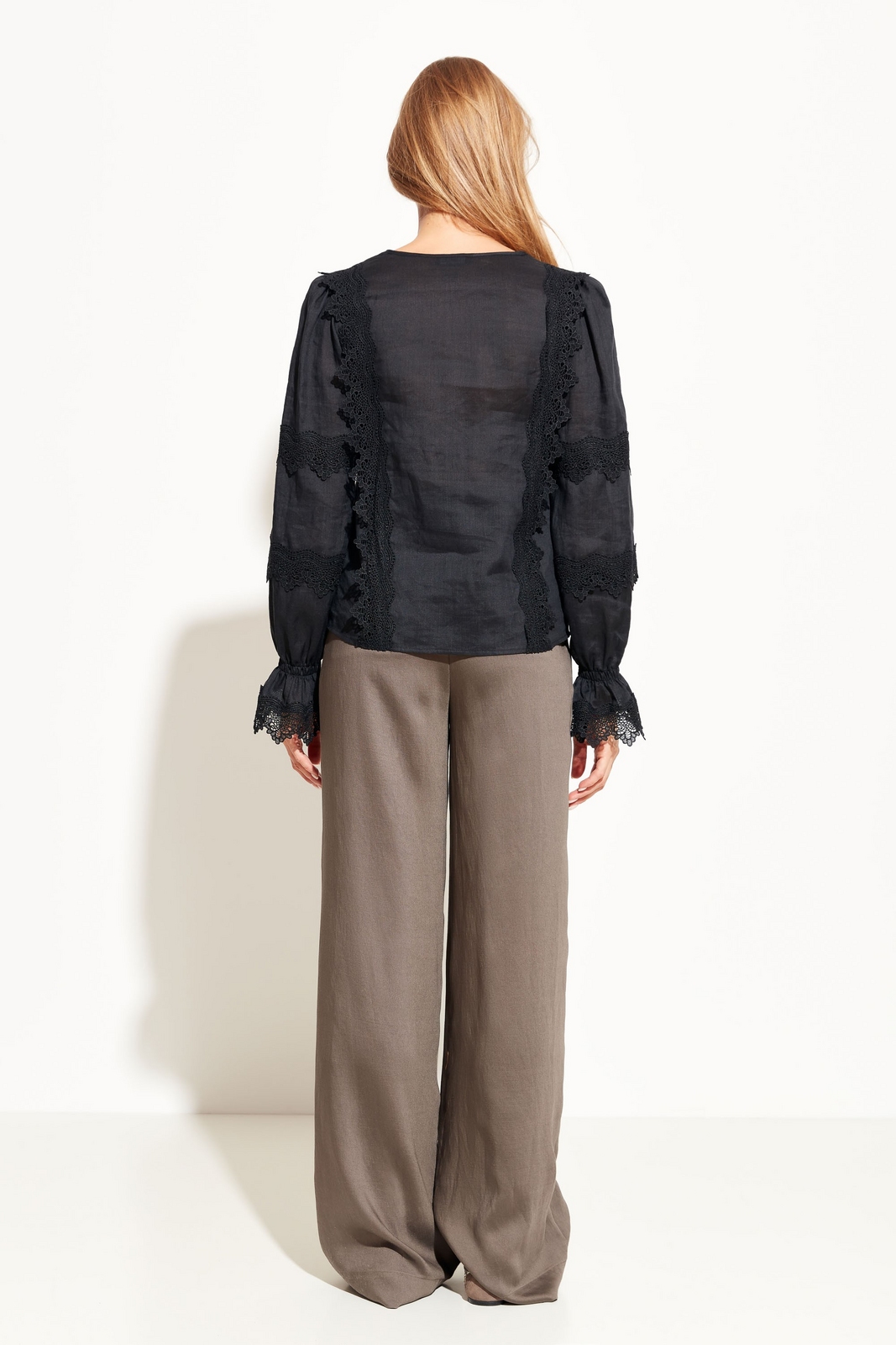 Блуза прямого кроя, лдиной до середины линии бедер. Округлый вырез горловины. Длинные рукава с манжетами, декорированными кружевом. Перед и спинка декорированы кружевными вставками. Классическая модель, которая идеально подойдет для создания романтичных образов.