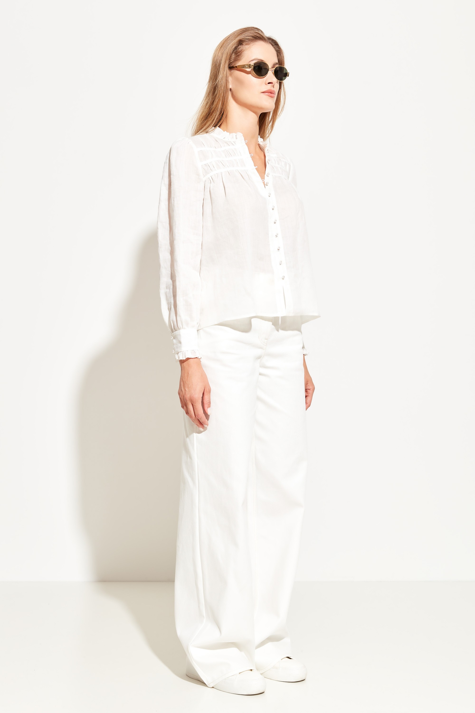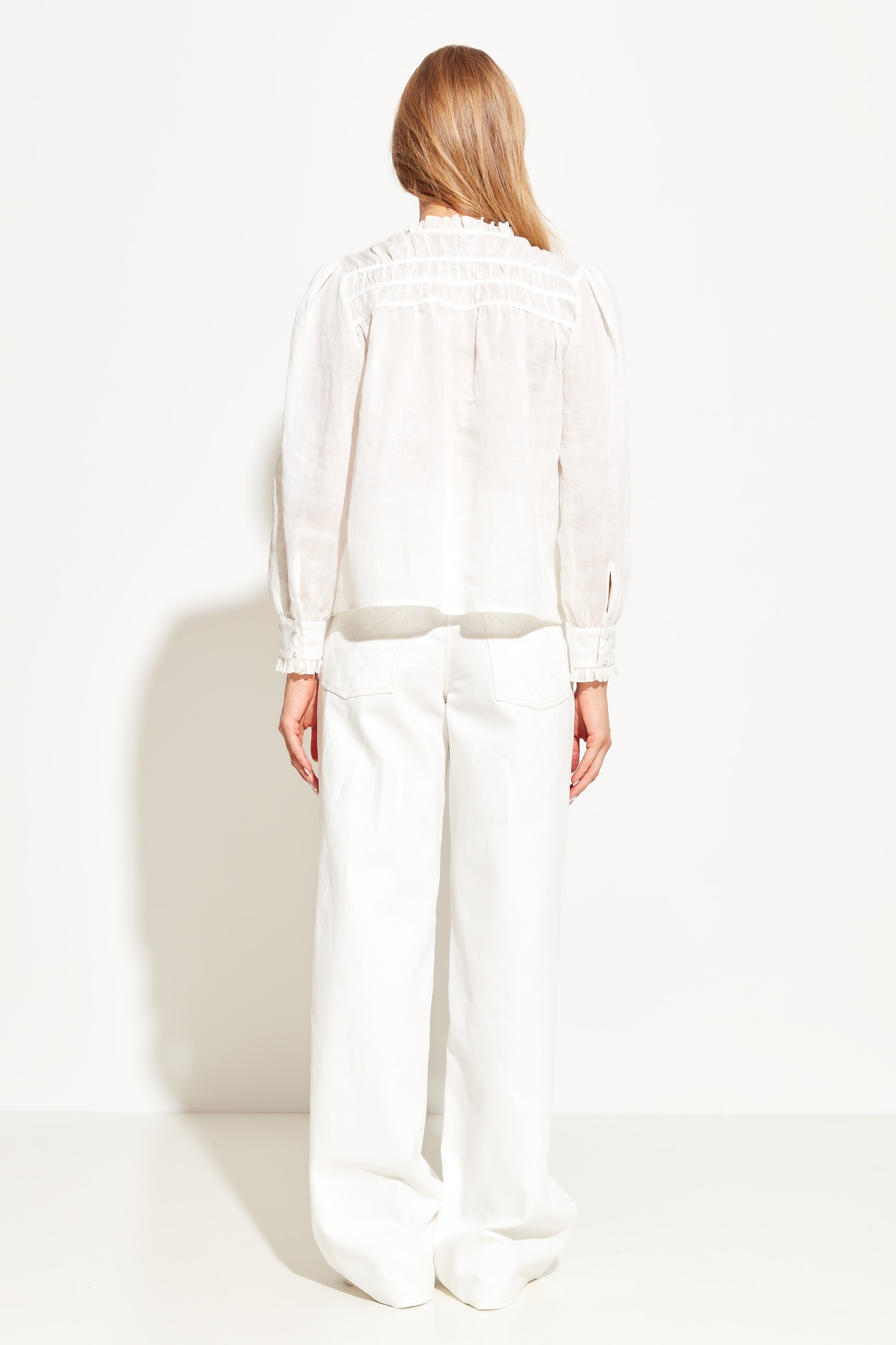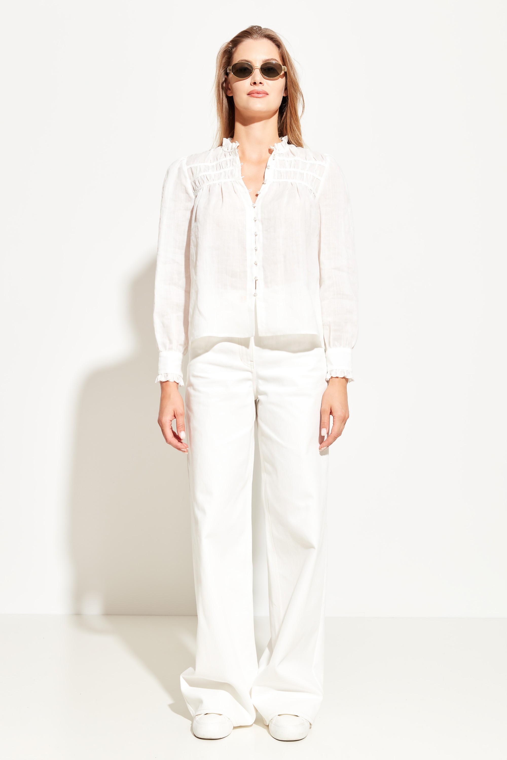 Блуза прямого кроя, длиной до середины линии бедер. Округлый вырез горловины. Горловина декорирована сборками и воланами. Длинные рукава, с воланами на манжетах. Классическая модель, которая любому образу добавит романтичности и расслабленности.