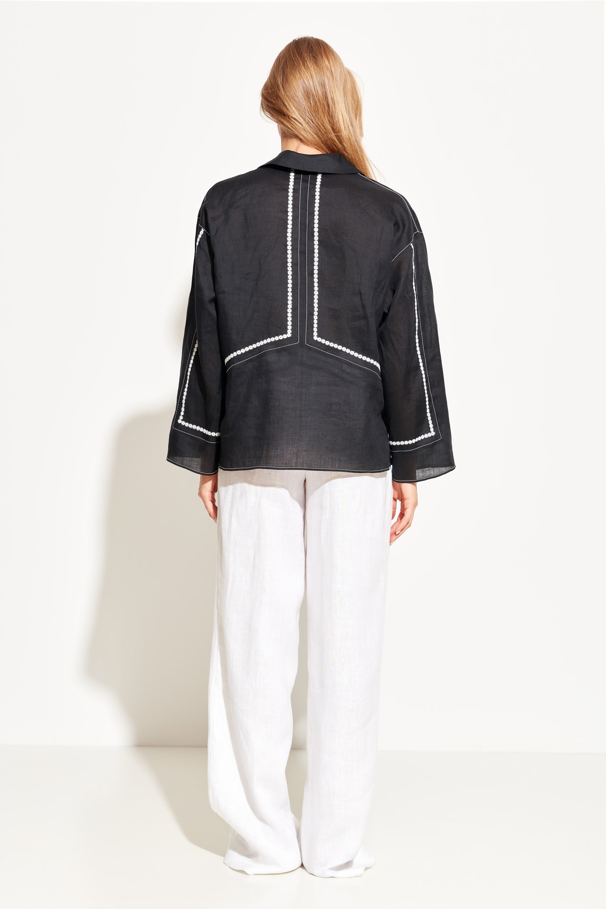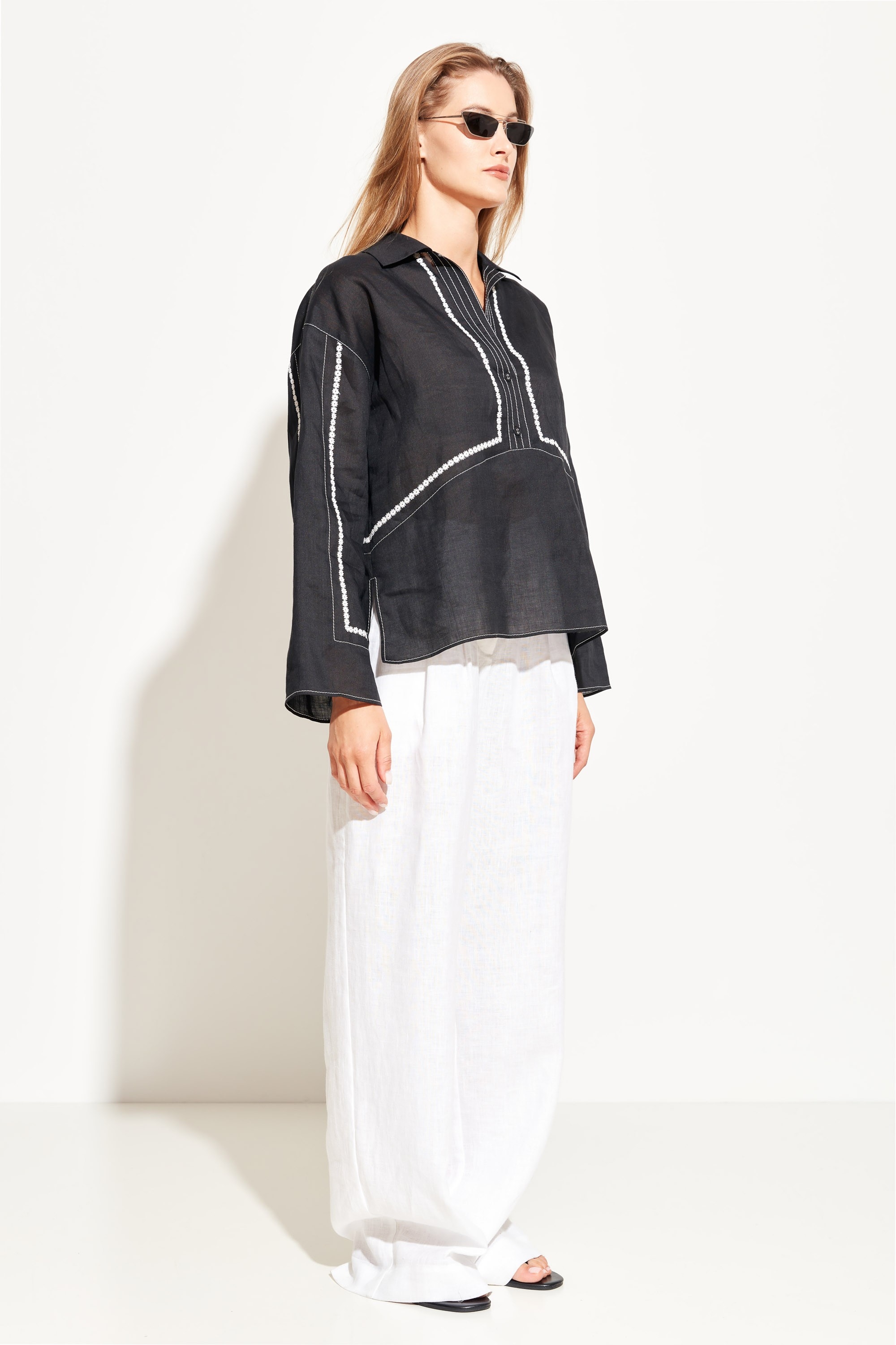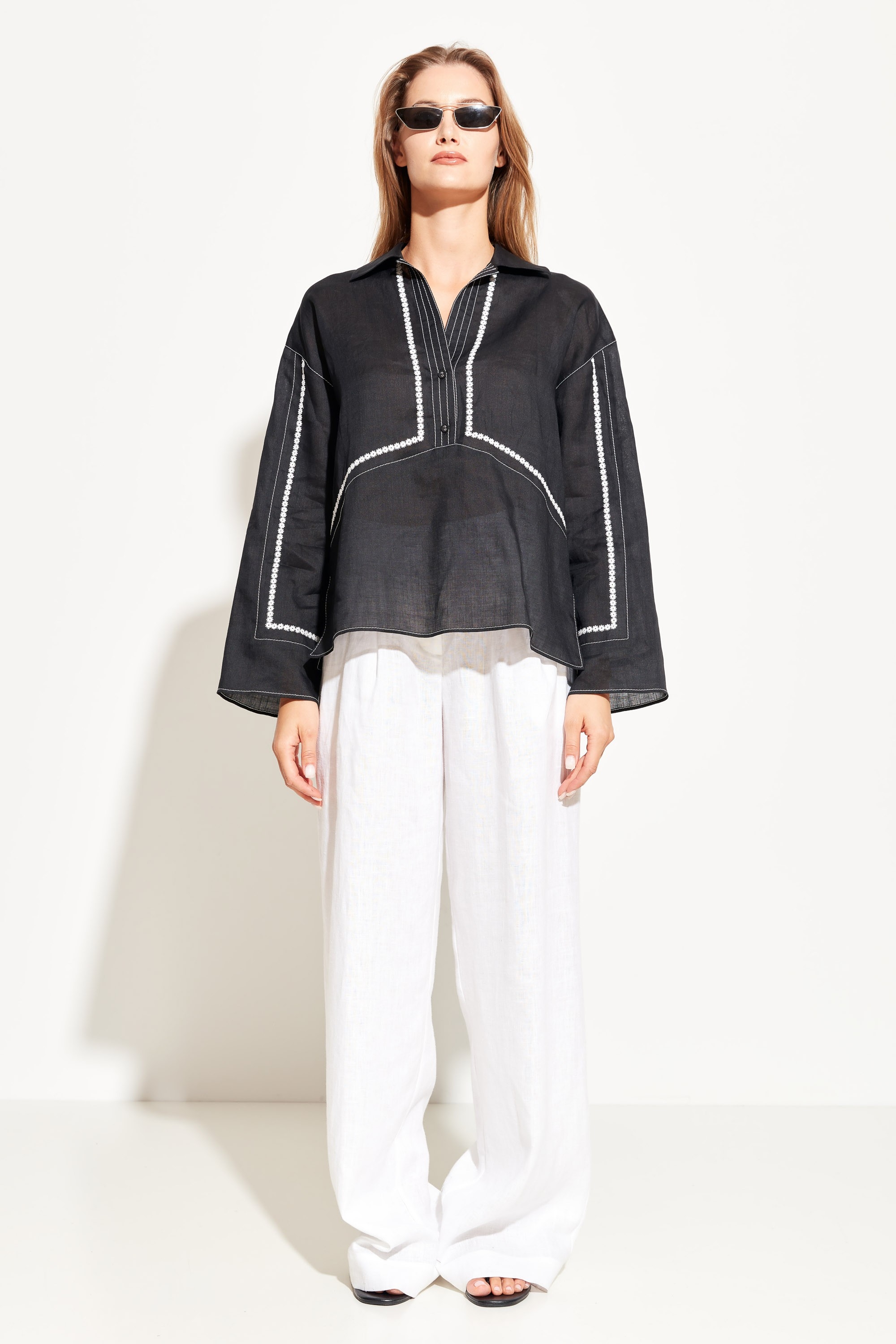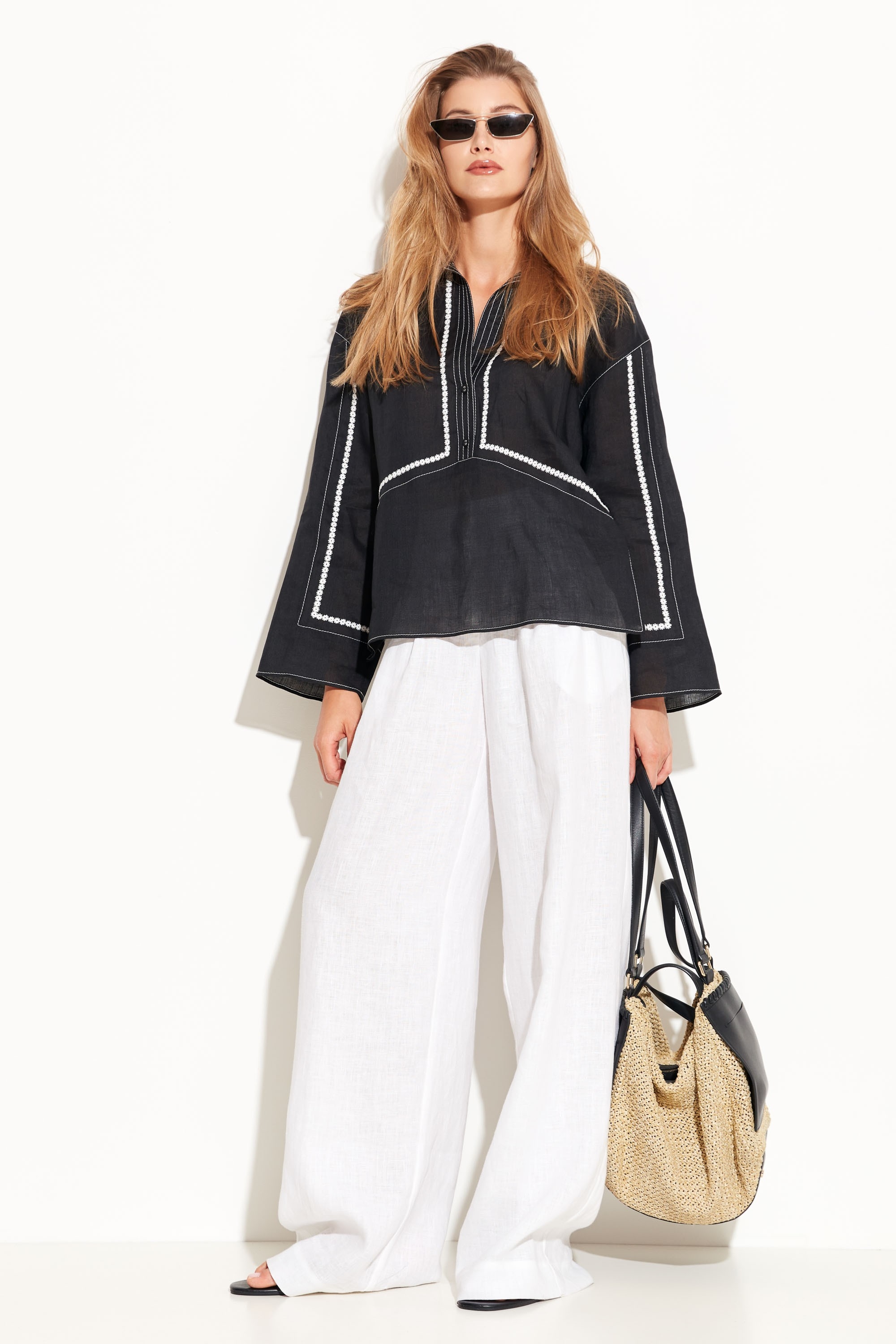 Блуза прямого кроя, длиной до линии бедер. Рукава длинные, декорированы кружевом. Линия плеч спущена.Воротник отложной. На передней и задней частях блузы декор в виде кружева. Свободный, классический крой изделия позволяет создавать образы в различных стилях и по любому случаю.