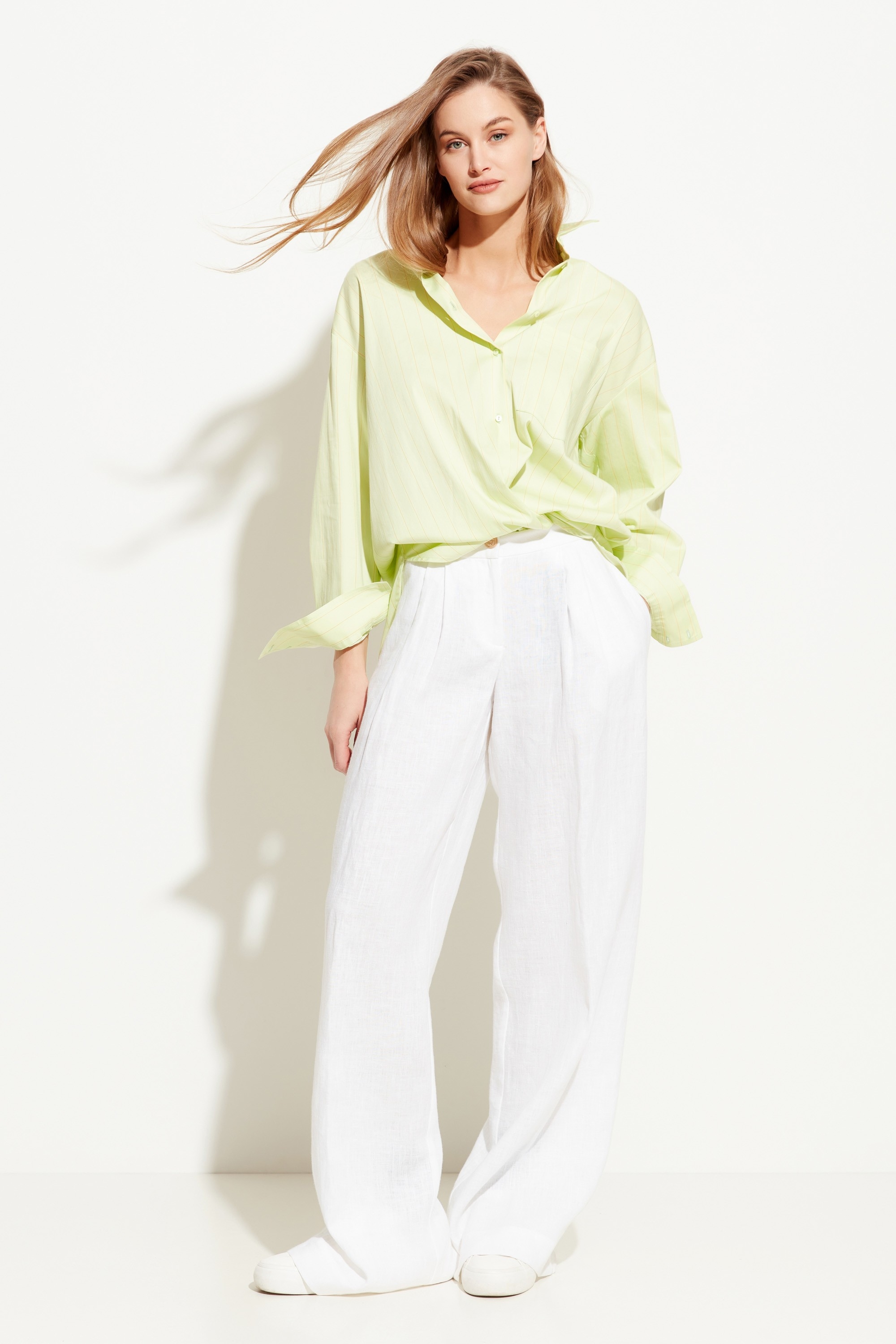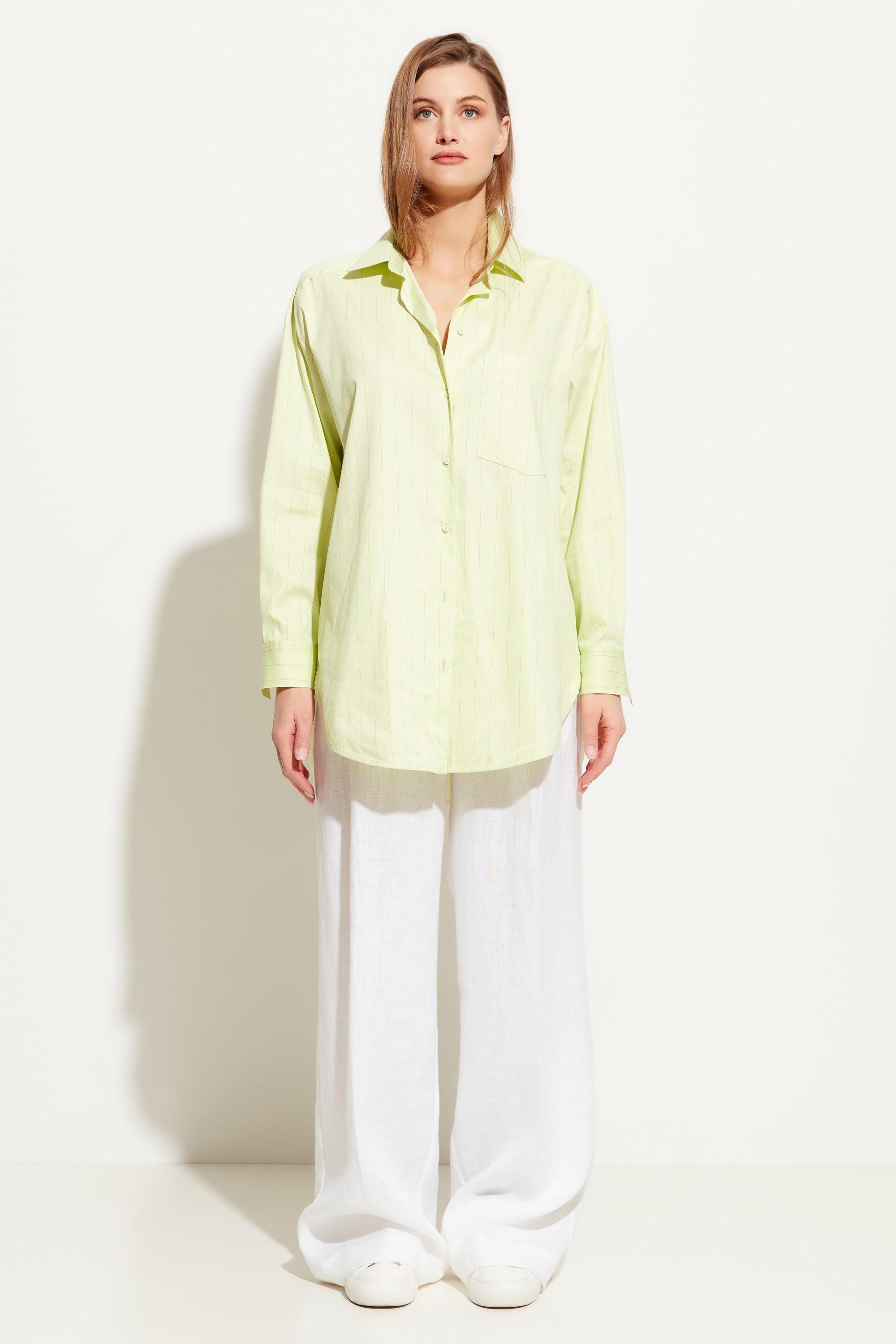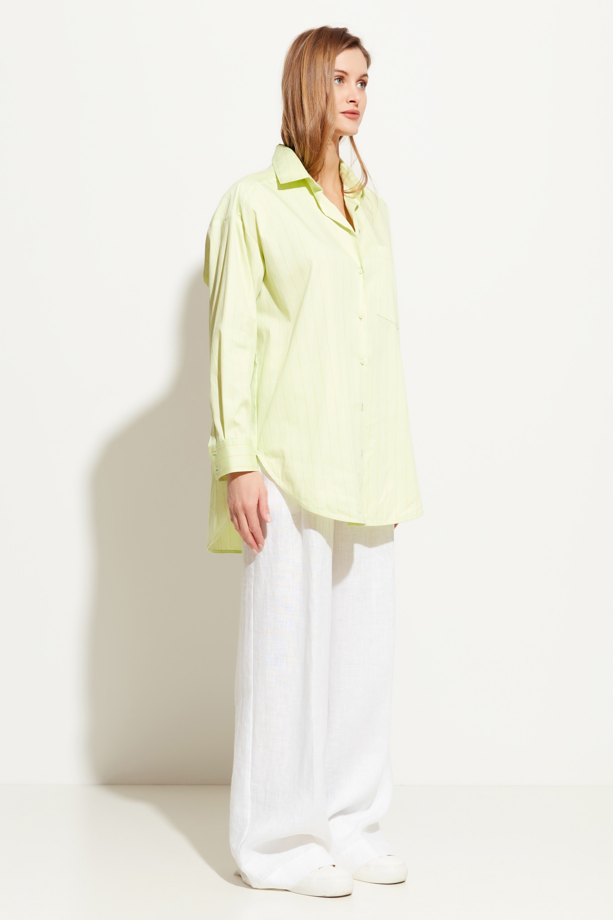 Блуза свободного кроя, длиной ниже линии бедер. Воротник стояче-отложной. Линия плеч спущена. На груди накладной карман. Классическая расцветка в тонкую полоску позволяет сочетать блузу с любым типом низа и создавать образы в различных стилях.