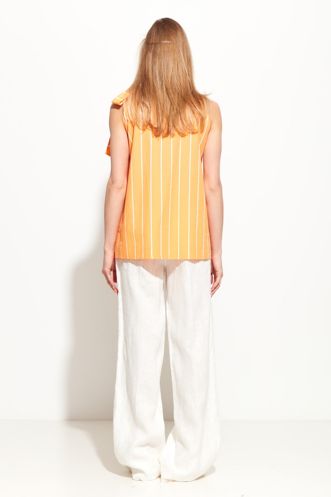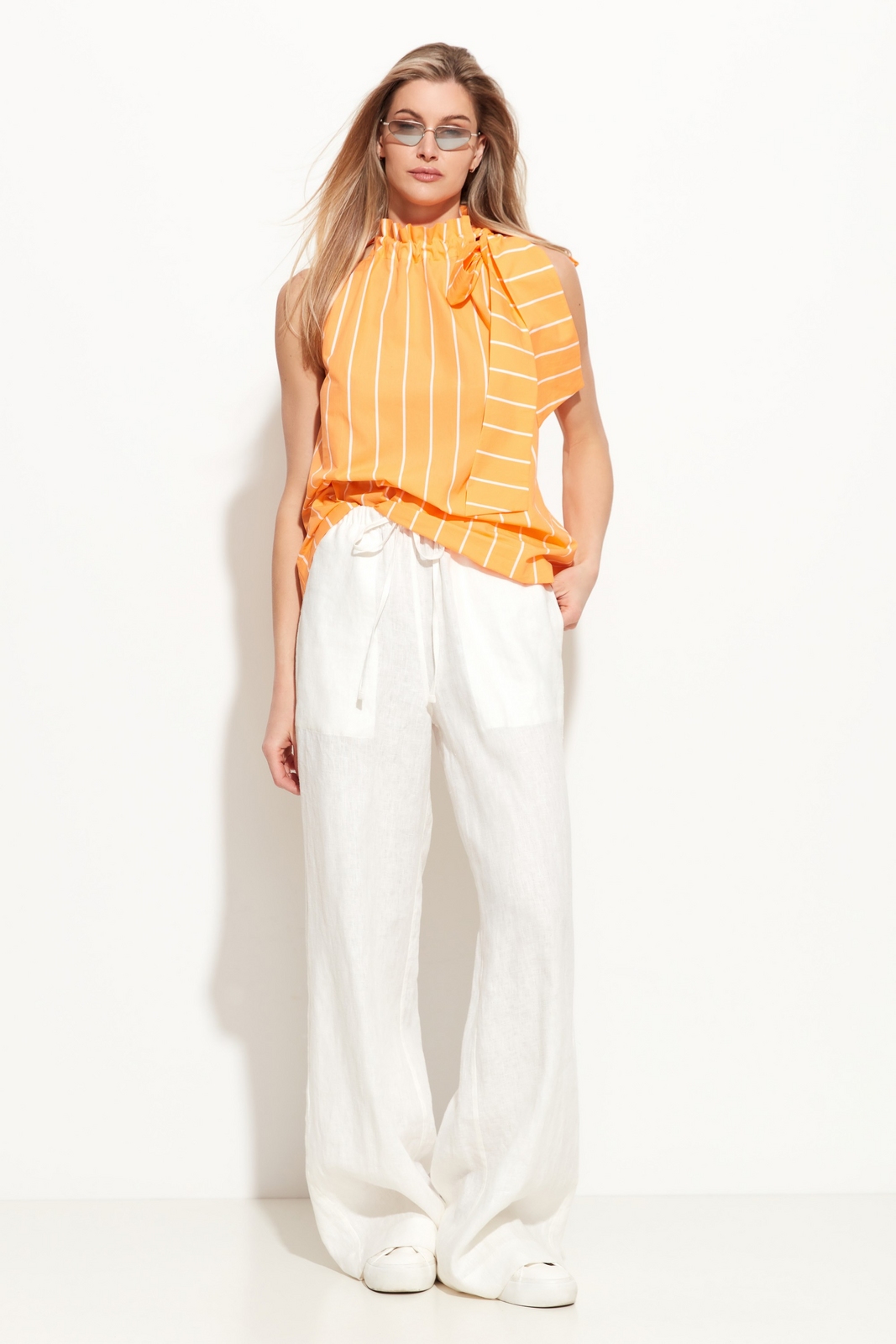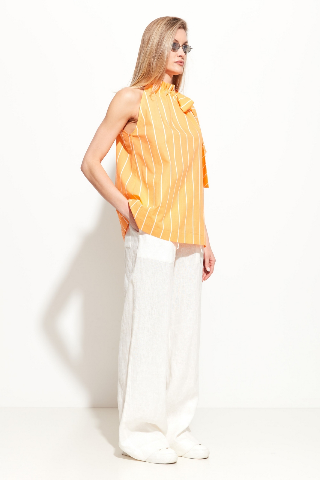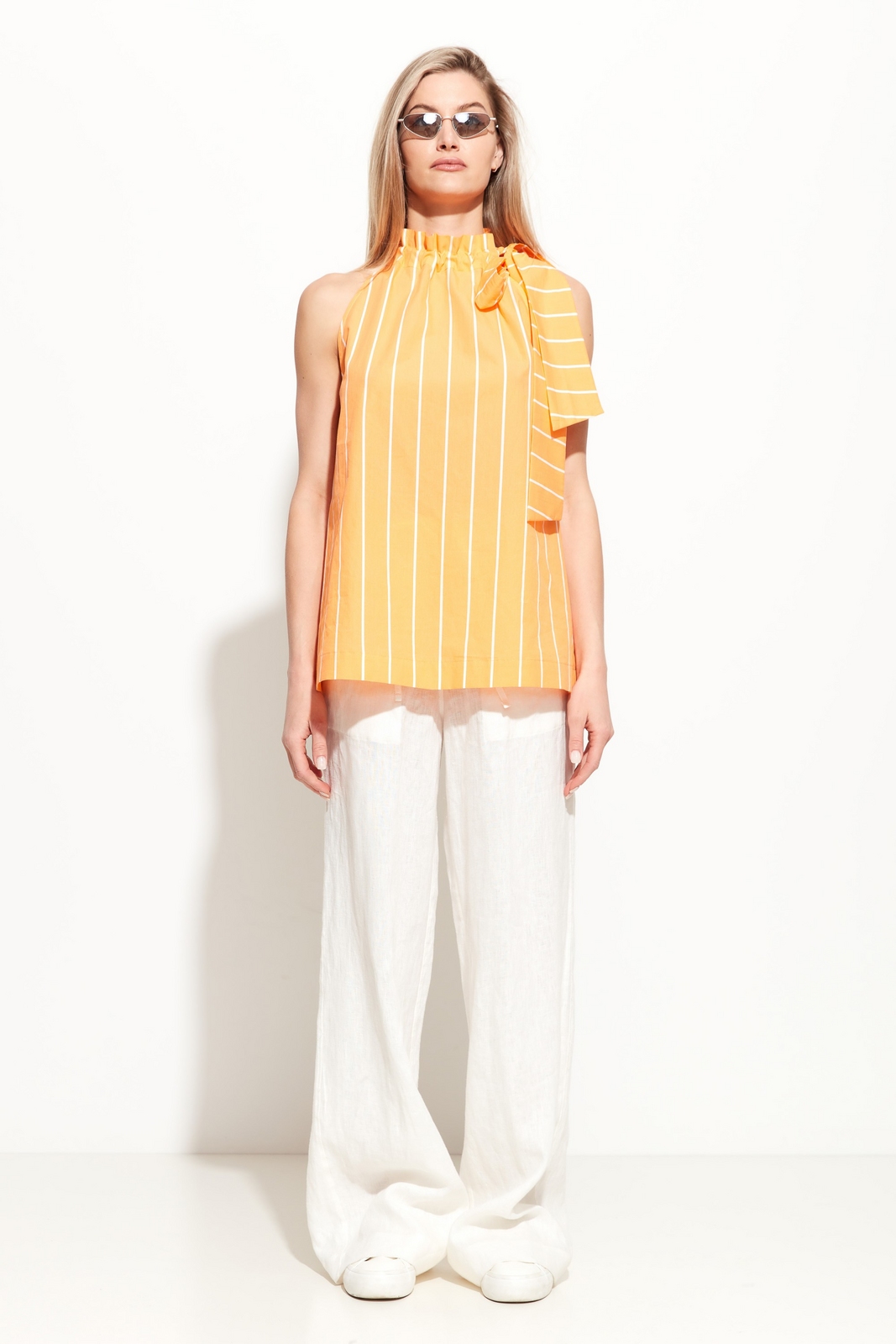 Блуза полуприлегающего силуэта, длиной ниже линии бедер. Воротник стойка, декорированный широкой лентой из аналогичной ткани. Линия плеч открыта. Вертикальная полоска визуально удлиняет силуэт и добавляет образу расслабленности и легкости. Блуза идеально сочетается как с брюками и джинсами, так с юбками и шортами.