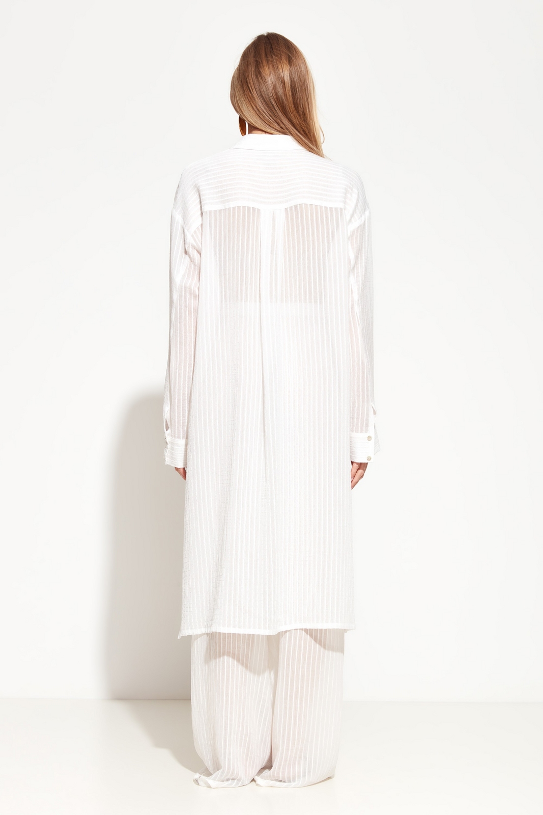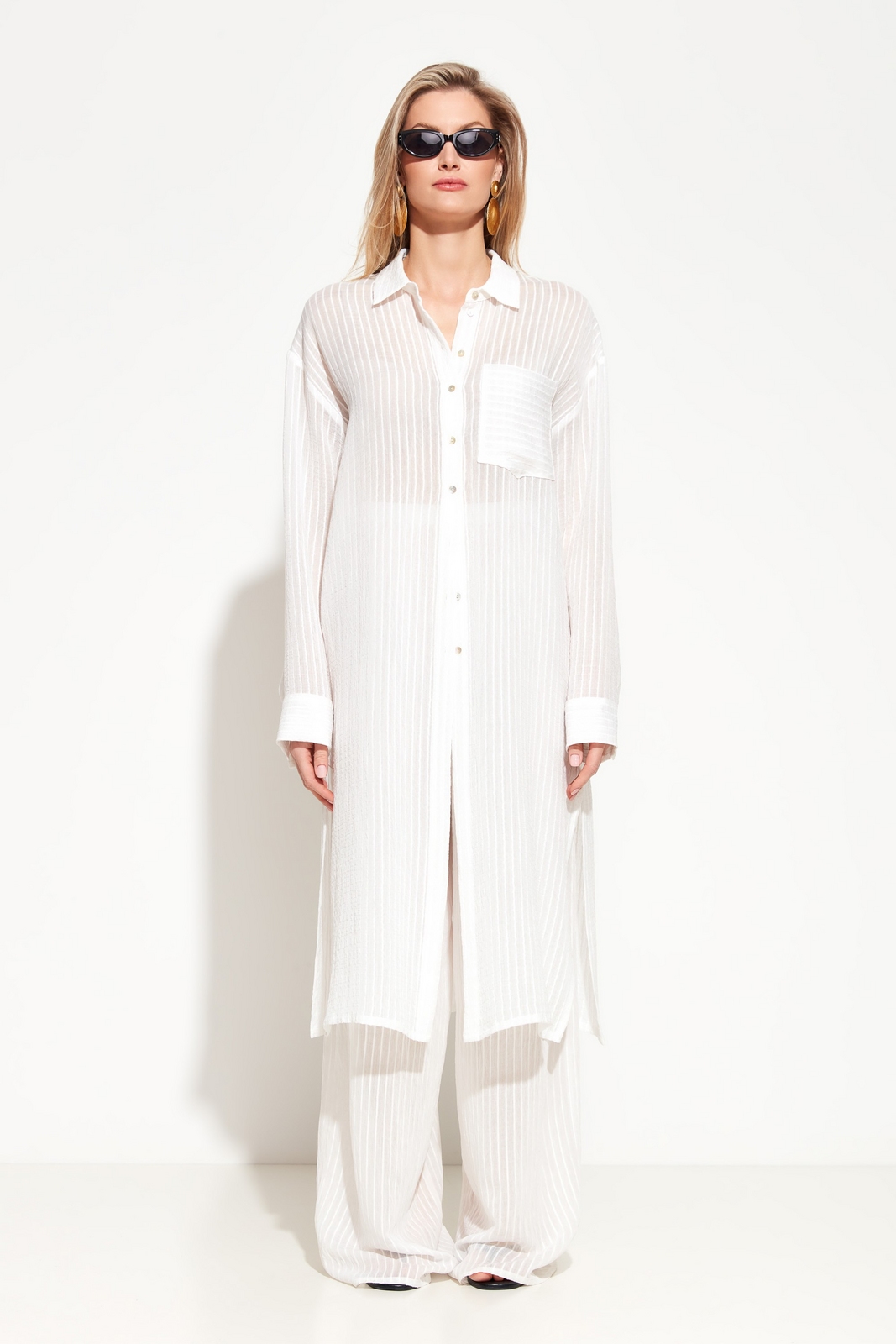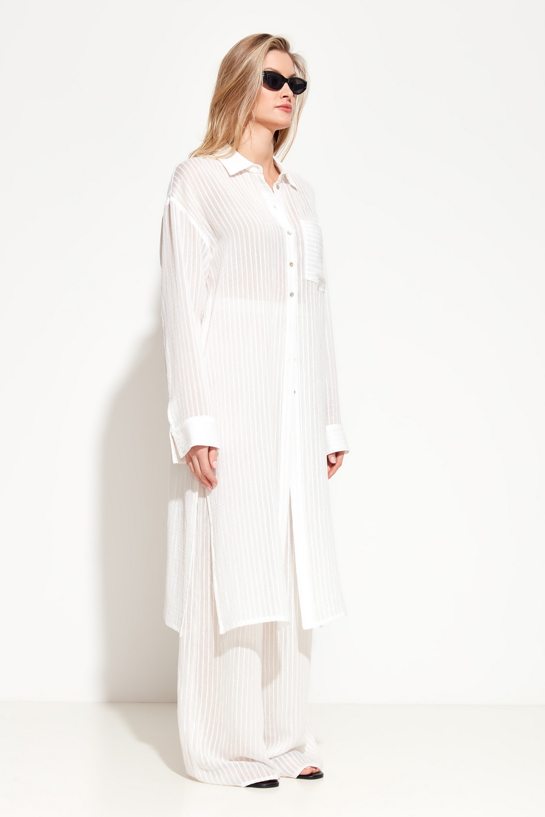 Блуза прямого кроя, длиной ниже линии бедер. Воротние отложной. На груди накладной карман. Линия плеч спущена. Полупрозрачный силуэт позволяет создавать трендовые многослойные образы в различных стилях.Универсальная модель, которая подойдет к любому типу гардероба.