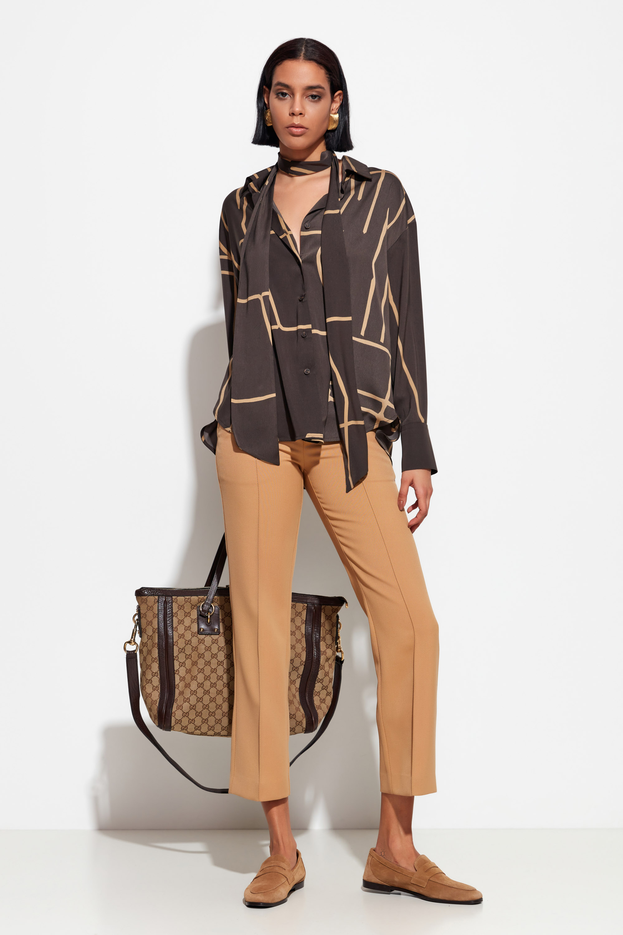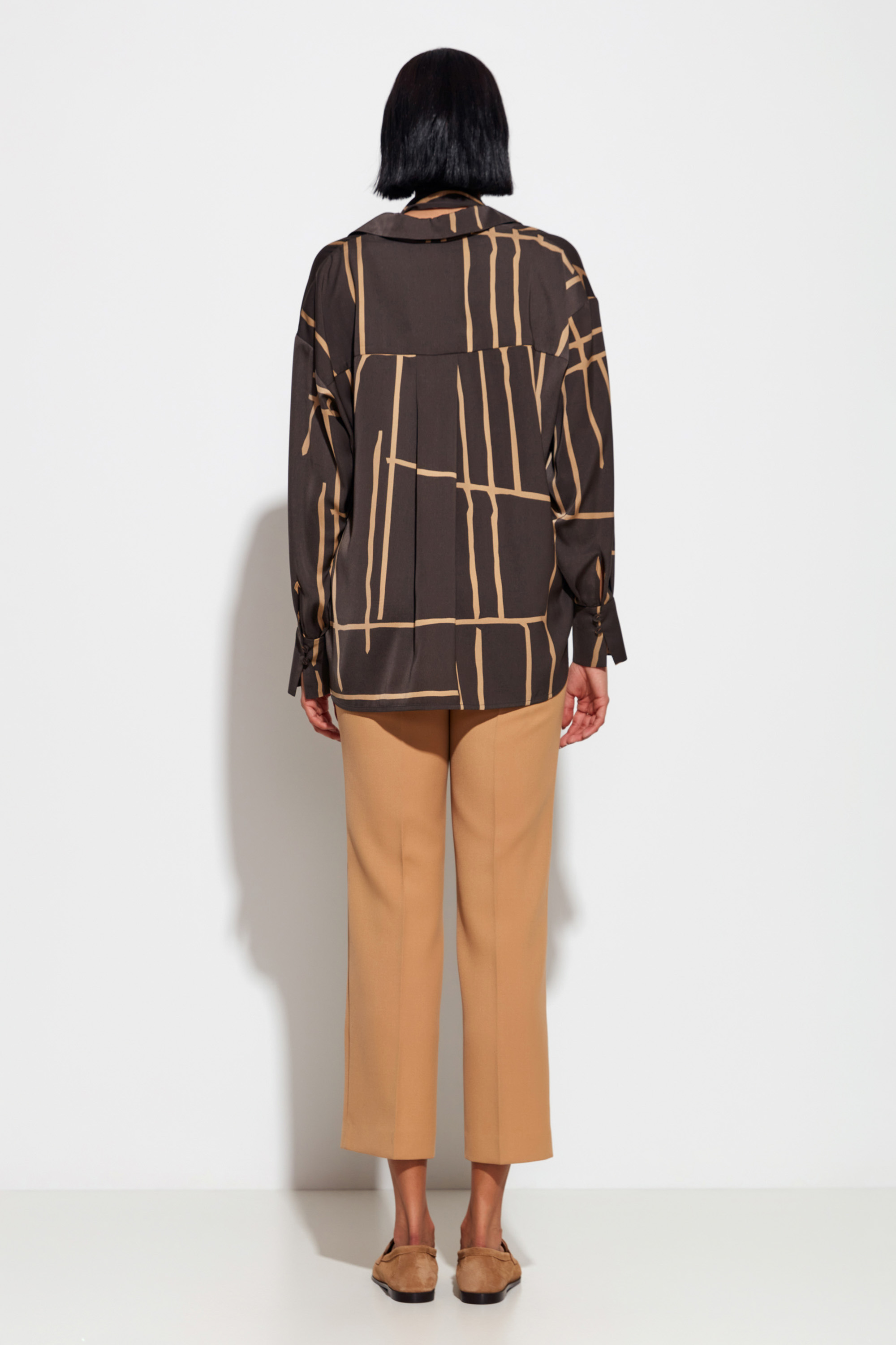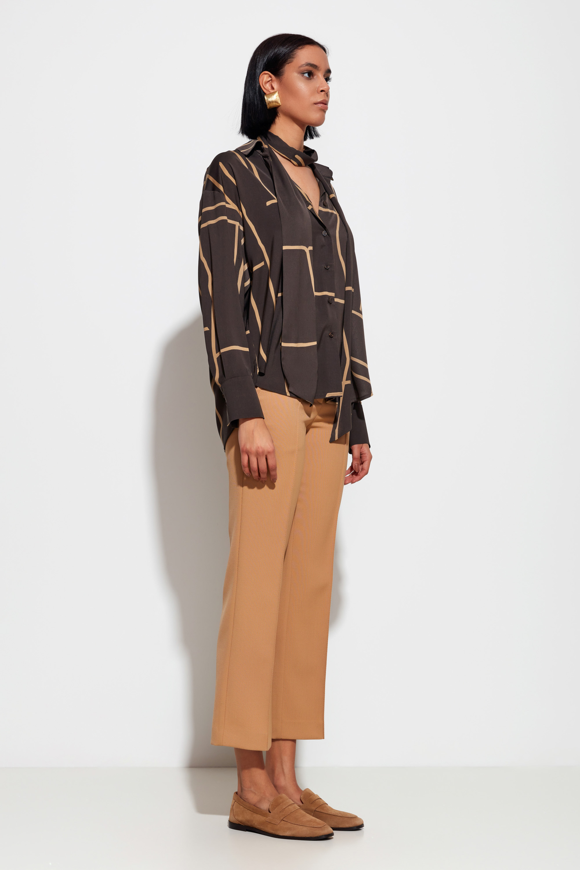Коричневая блуза в геометричный принт Lakbi из коллекции осень-зима 2025/26 — это современный взгляд на деловой и повседневный стиль. Модель выполнена из лёгкой и приятной на ощупь ткани, украшенной выразительным геометричным принтом в нейтральной гамме. Свободный крой, рубашечный воротник и аккуратная застёжка на пуговицы делают эту блузу универсальным решением для разных случаев — от офиса до стильного городского выхода.