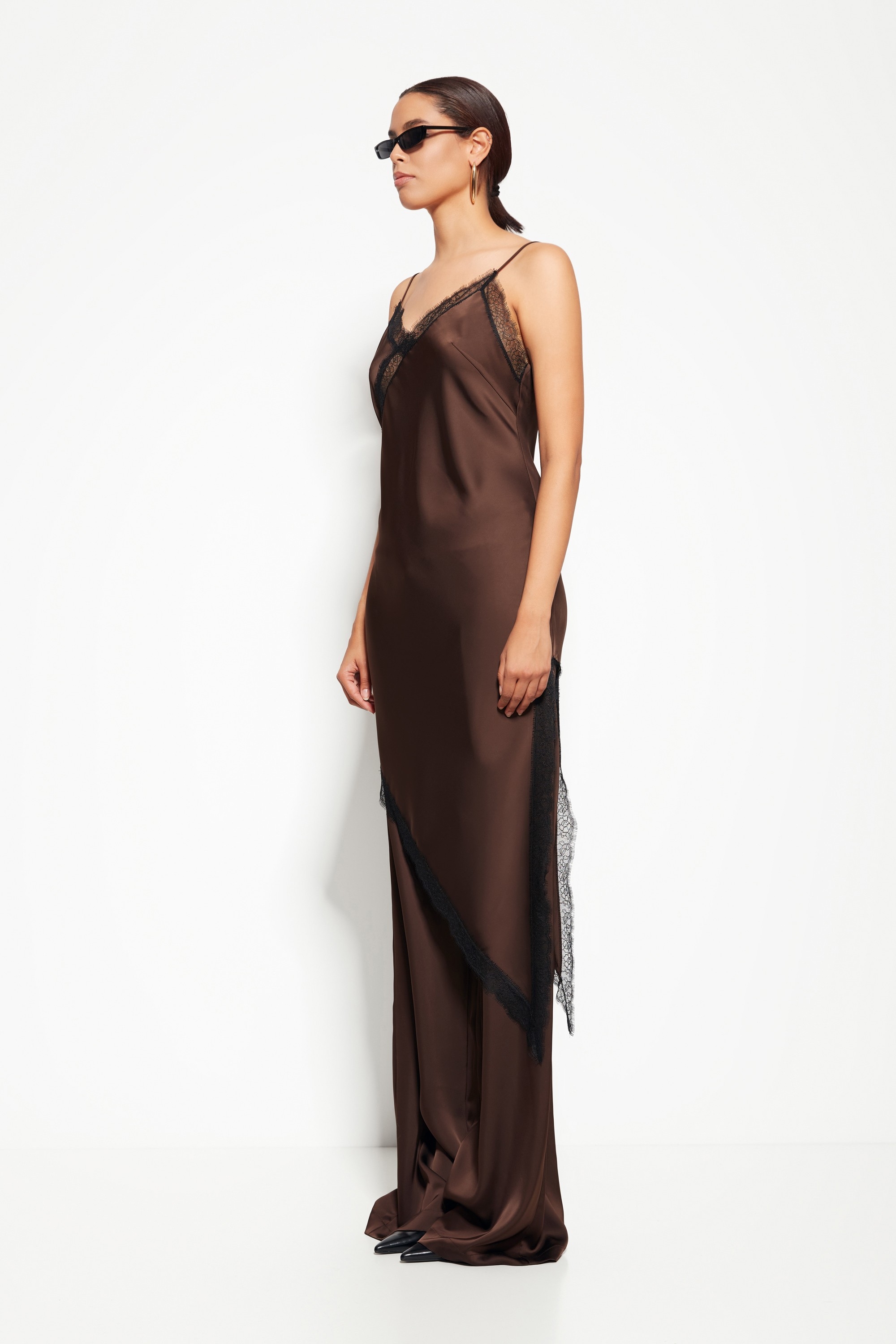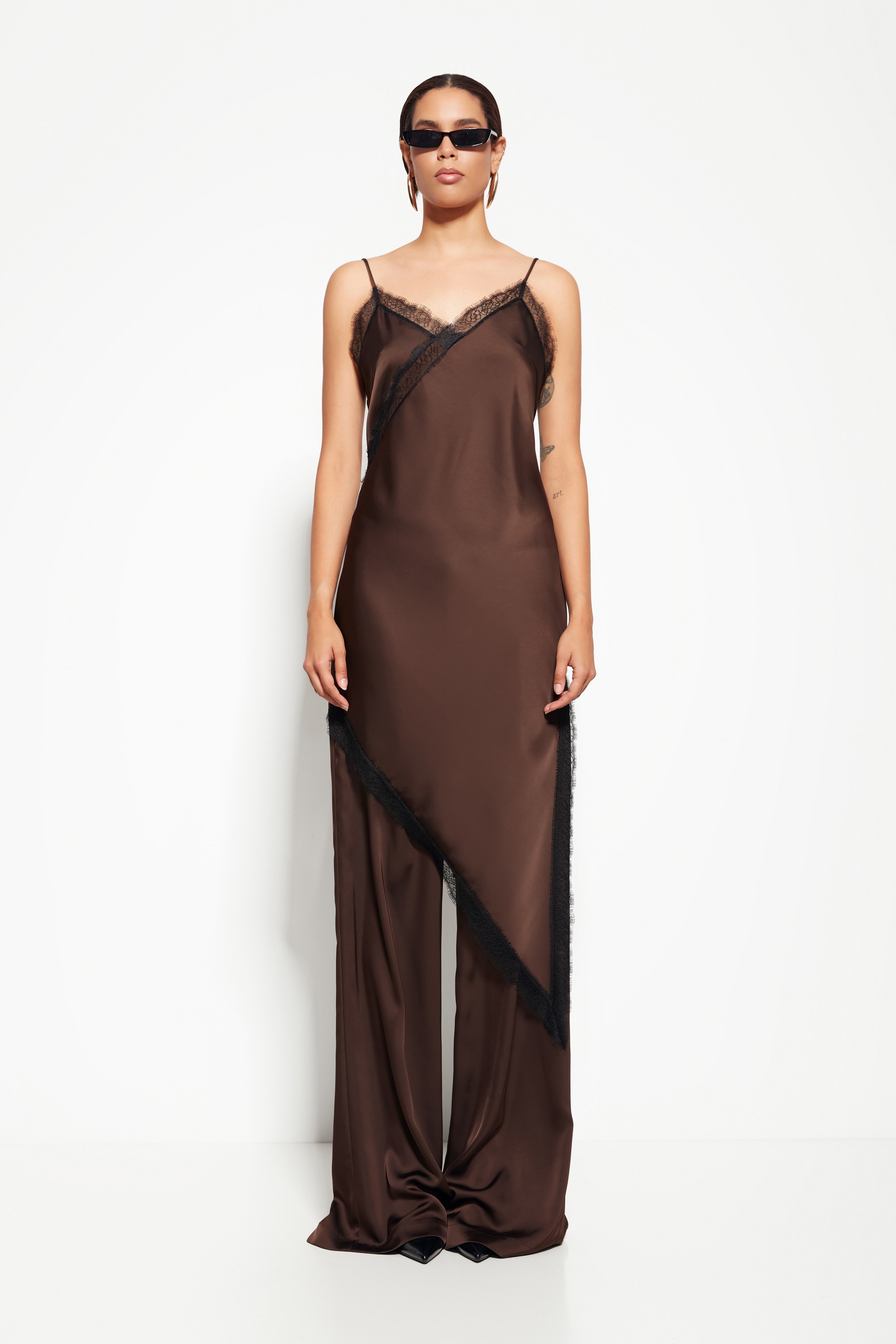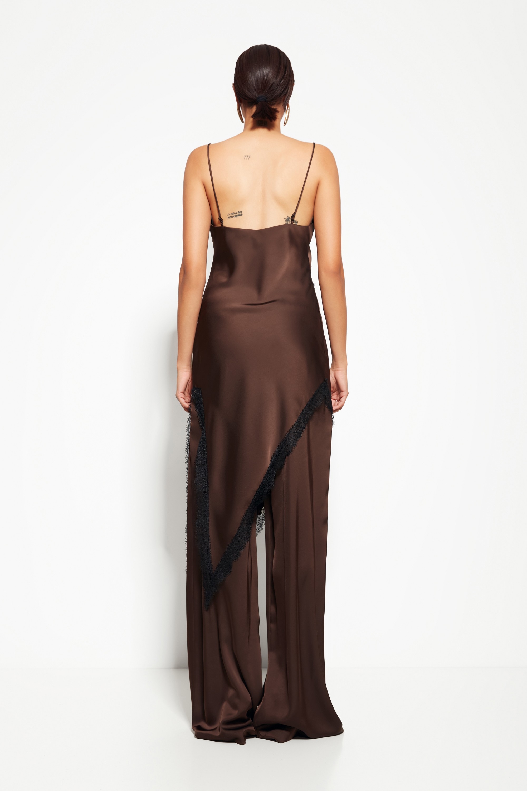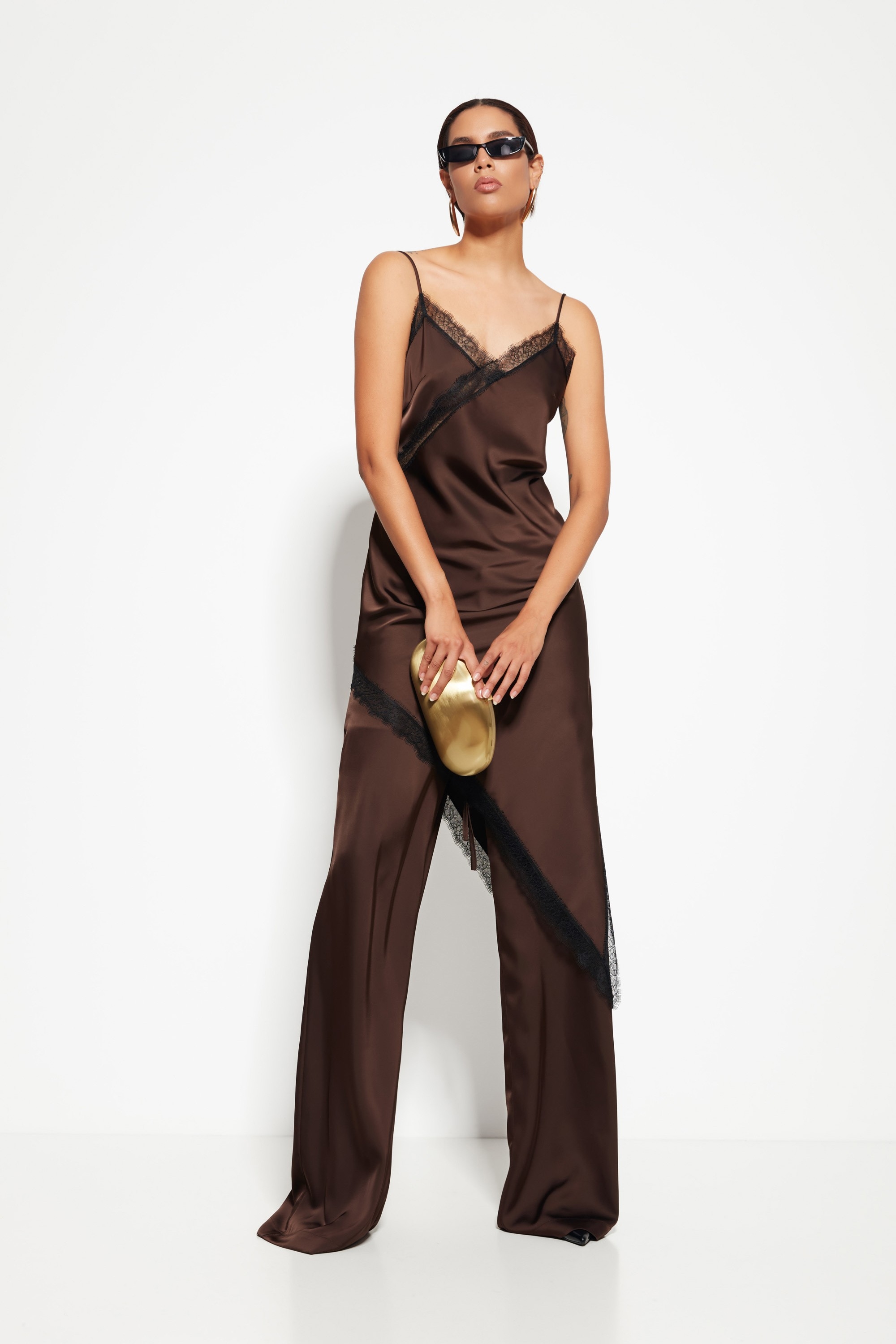 Модель из коллекции Party 2026 — блузка на бретелях с асимметричным низом, создающая динамичный и выразительный силуэт. Кружевные вставки по бокам добавляют образу изысканности и лёгкости.