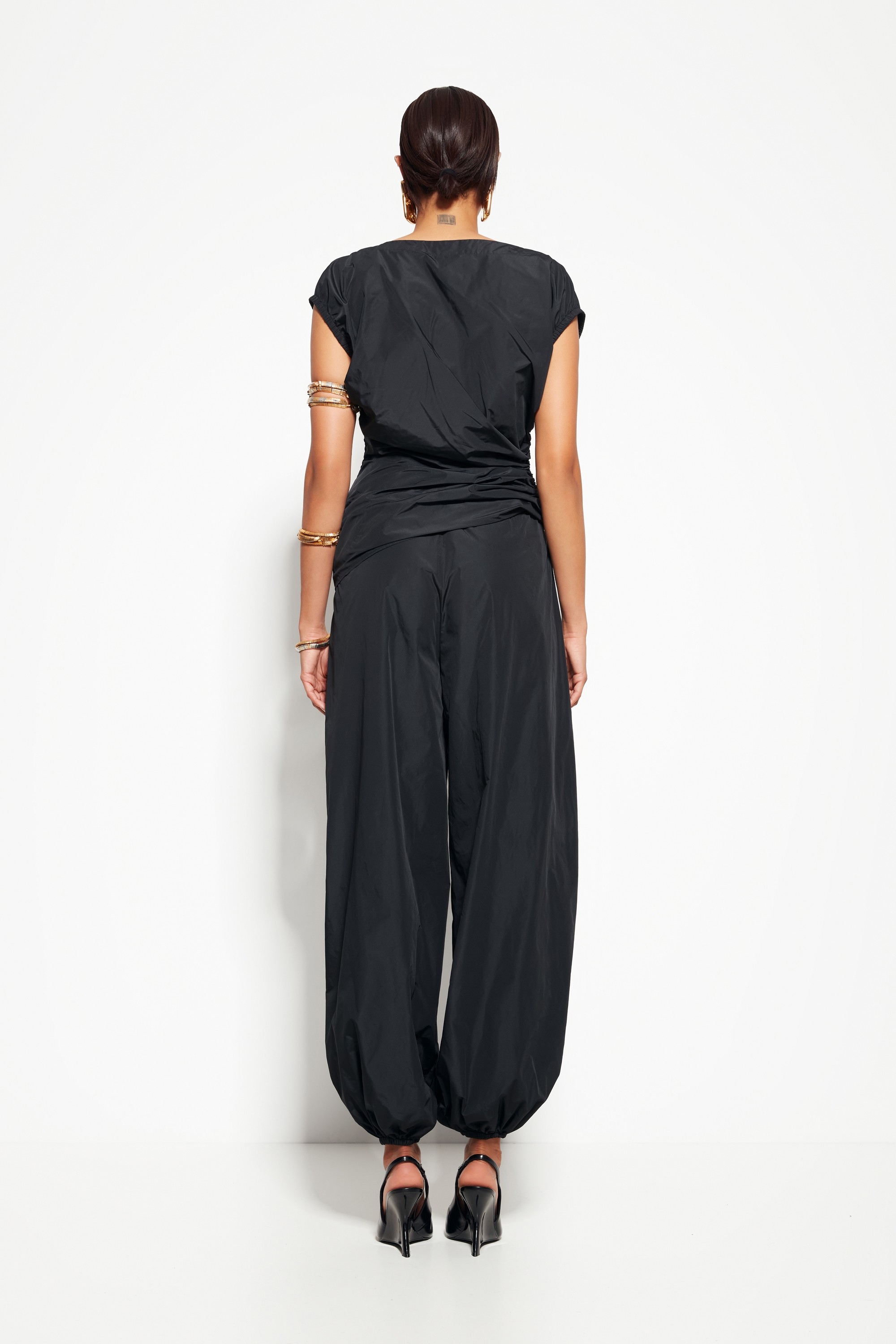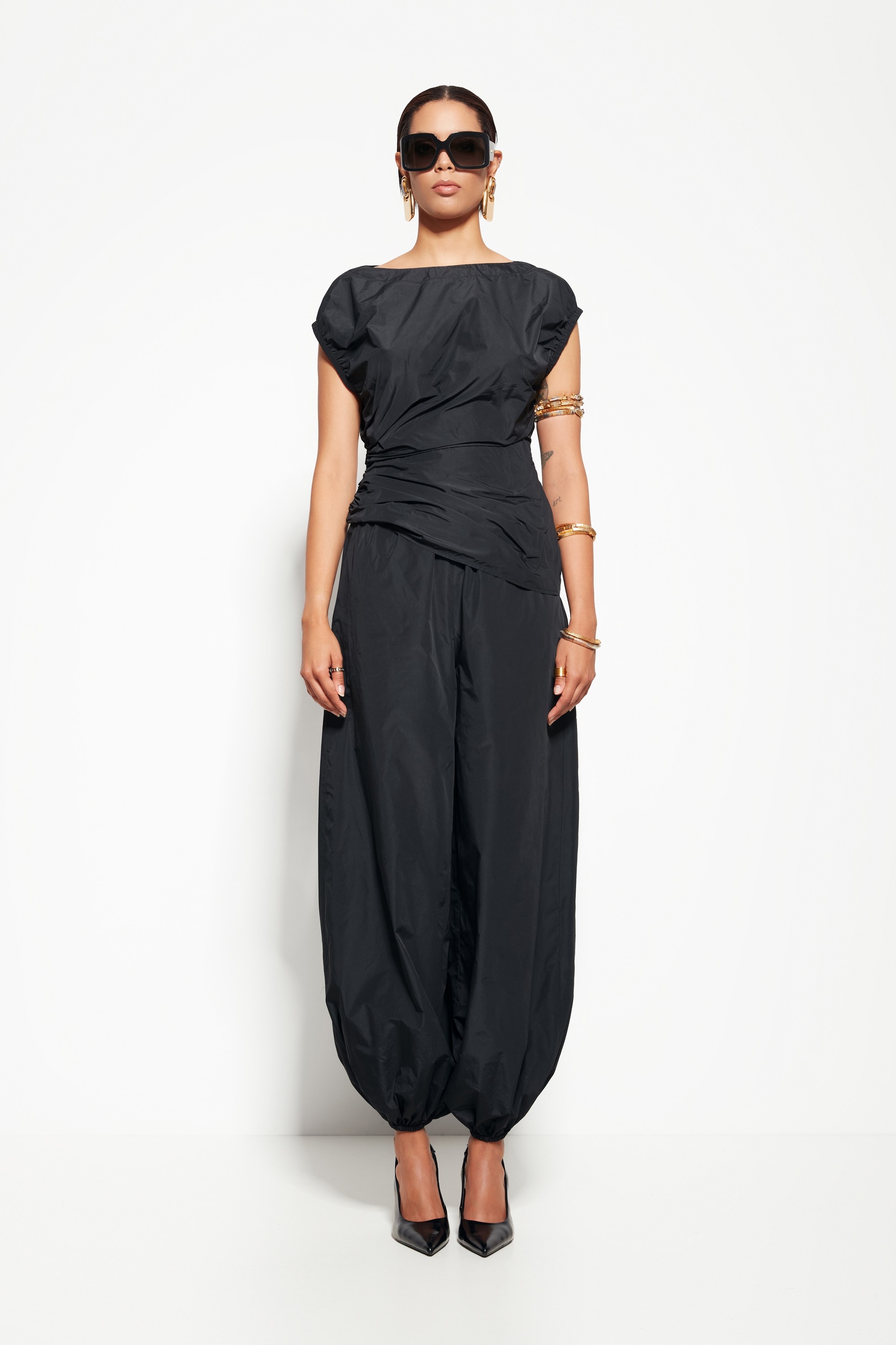 Модель из коллекции Party 2026 — блузка с драпировкой по бокам, создающая плавные линии и подчёркивающая женственность силуэта. Лёгкая ткань и свободный крой обеспечивают комфорт и свободу движений.