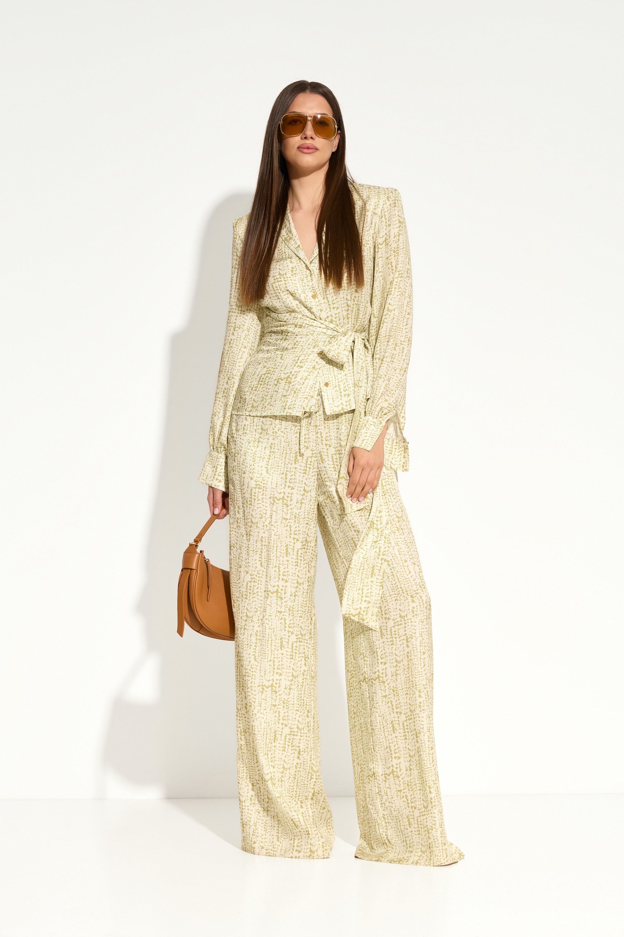 Блуза Lakbi 55799 выполнена из струящейся ткани с нежным принтом, которая придаёт образу лёгкость, женственность и утончённость. Модель имеет полуприлегающий силуэт, подчёркивающий фигуру, и вшитый широкий пояс на запах из аналогичной ткани, позволяющий акцентировать талию и создавать изящный силуэт.