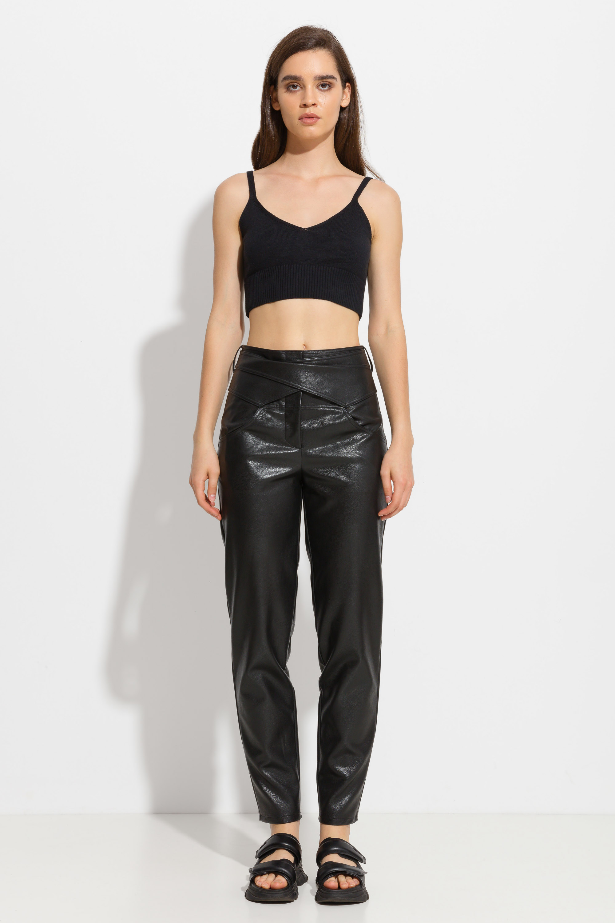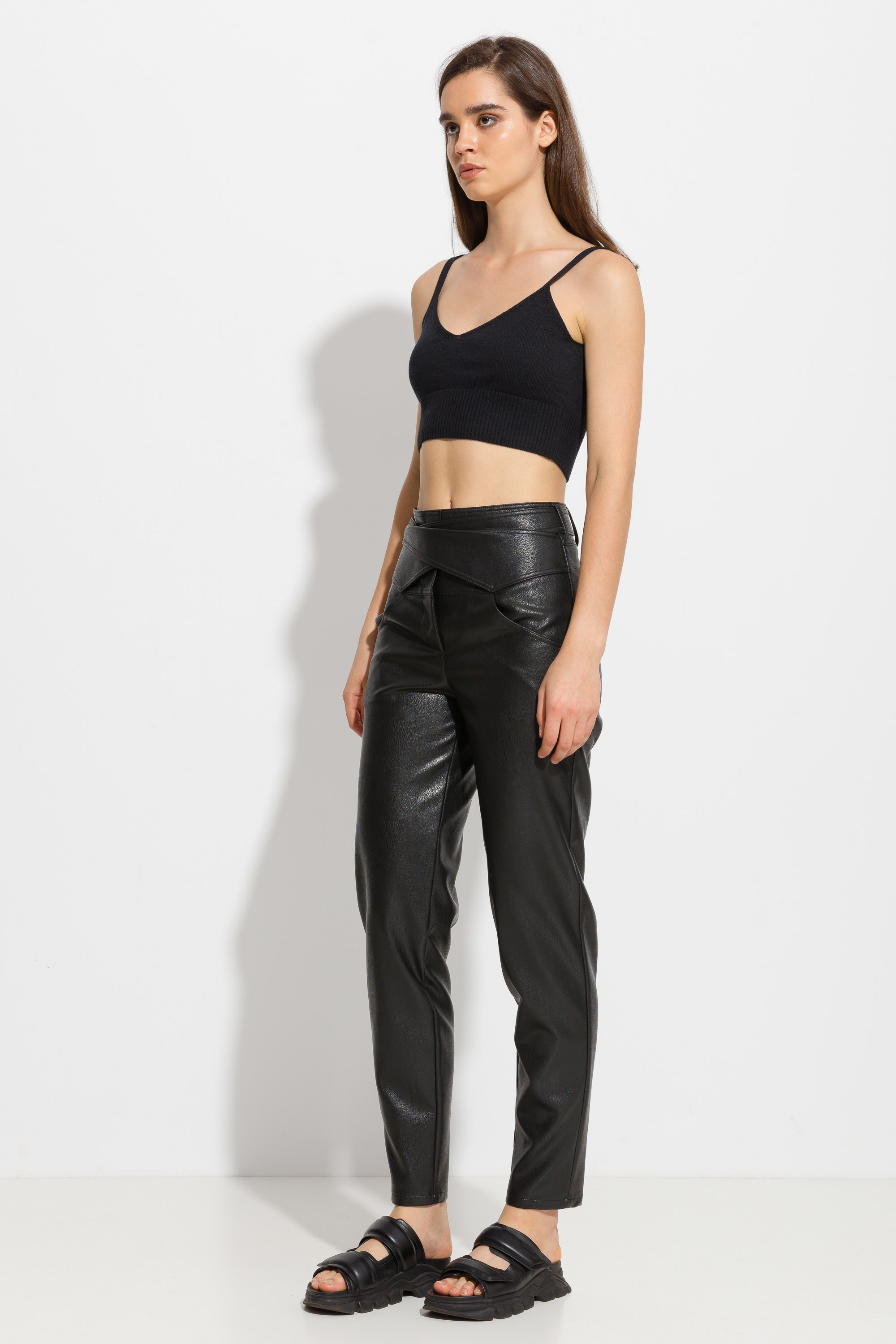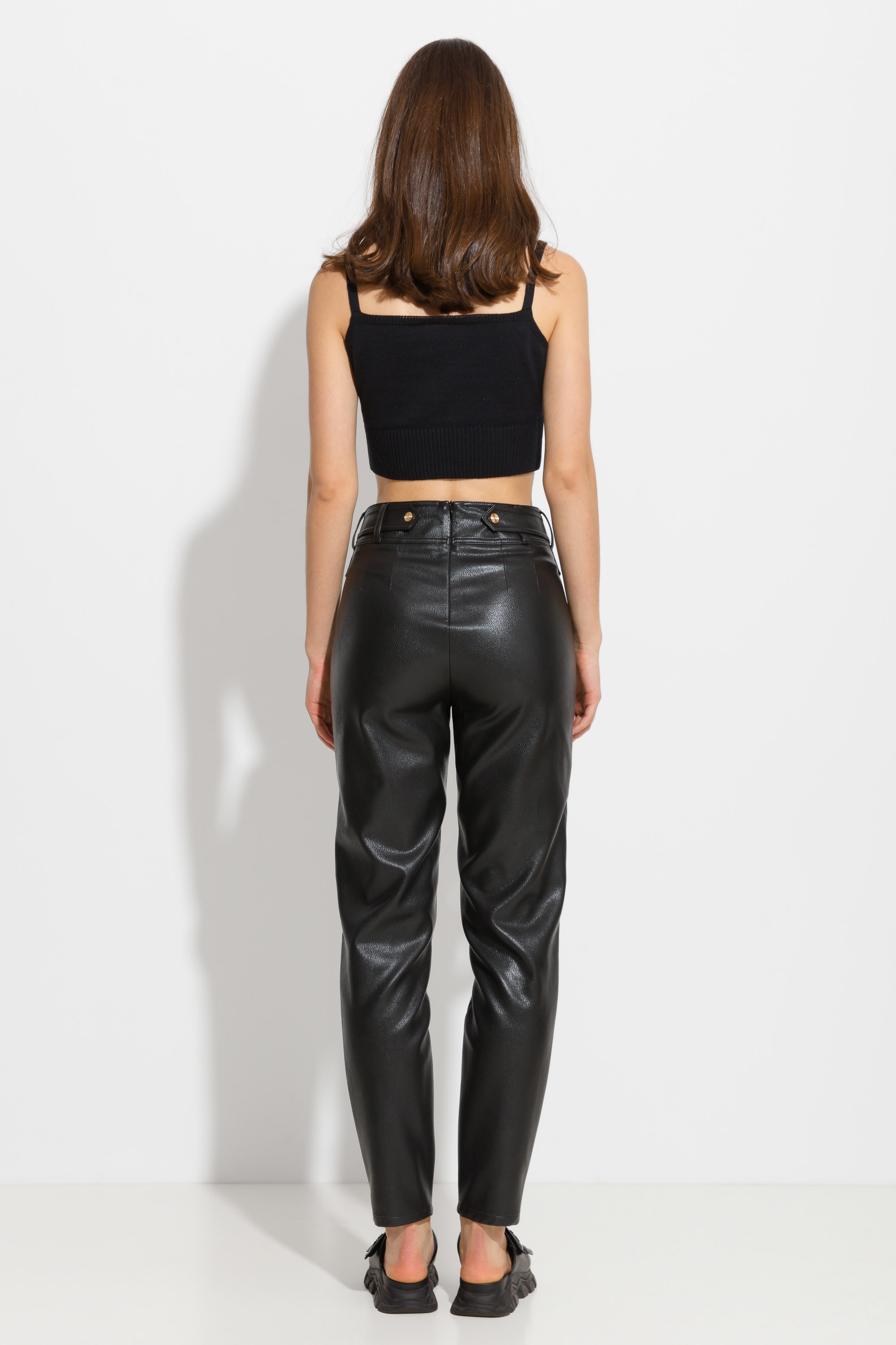 Брюки из эко-кожи с фигурным поясом