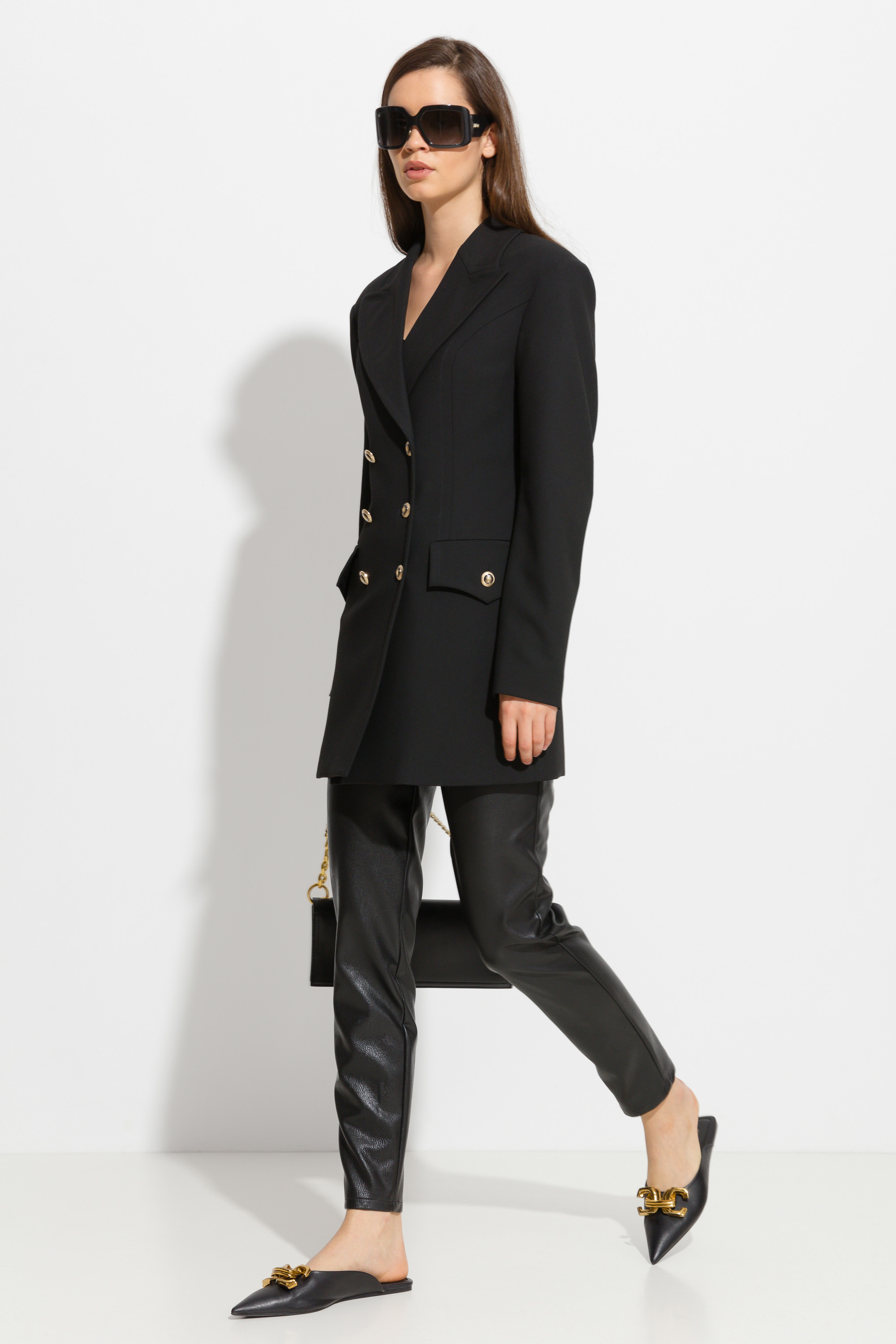 Брюки из эко-кожи прямого кроя, зауженные от линии бедер к низу. Посадка средняя. Классическая, базовая модель, которая идеально подходит для создания стильных ежедневных аутфитов.