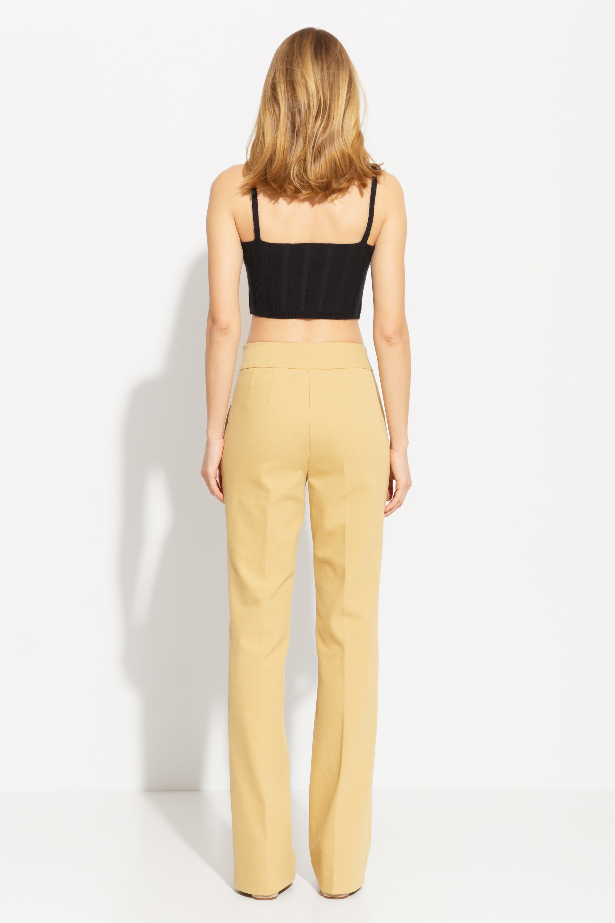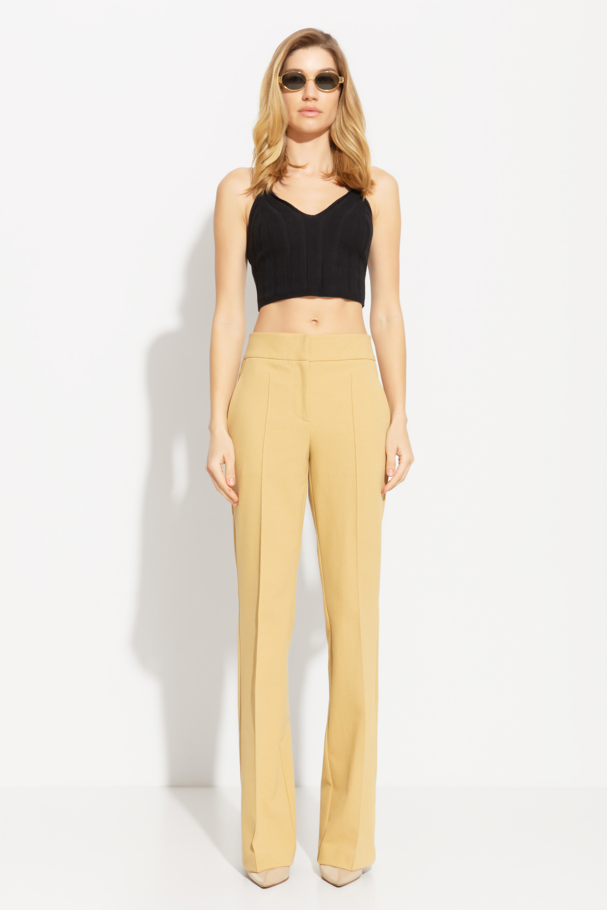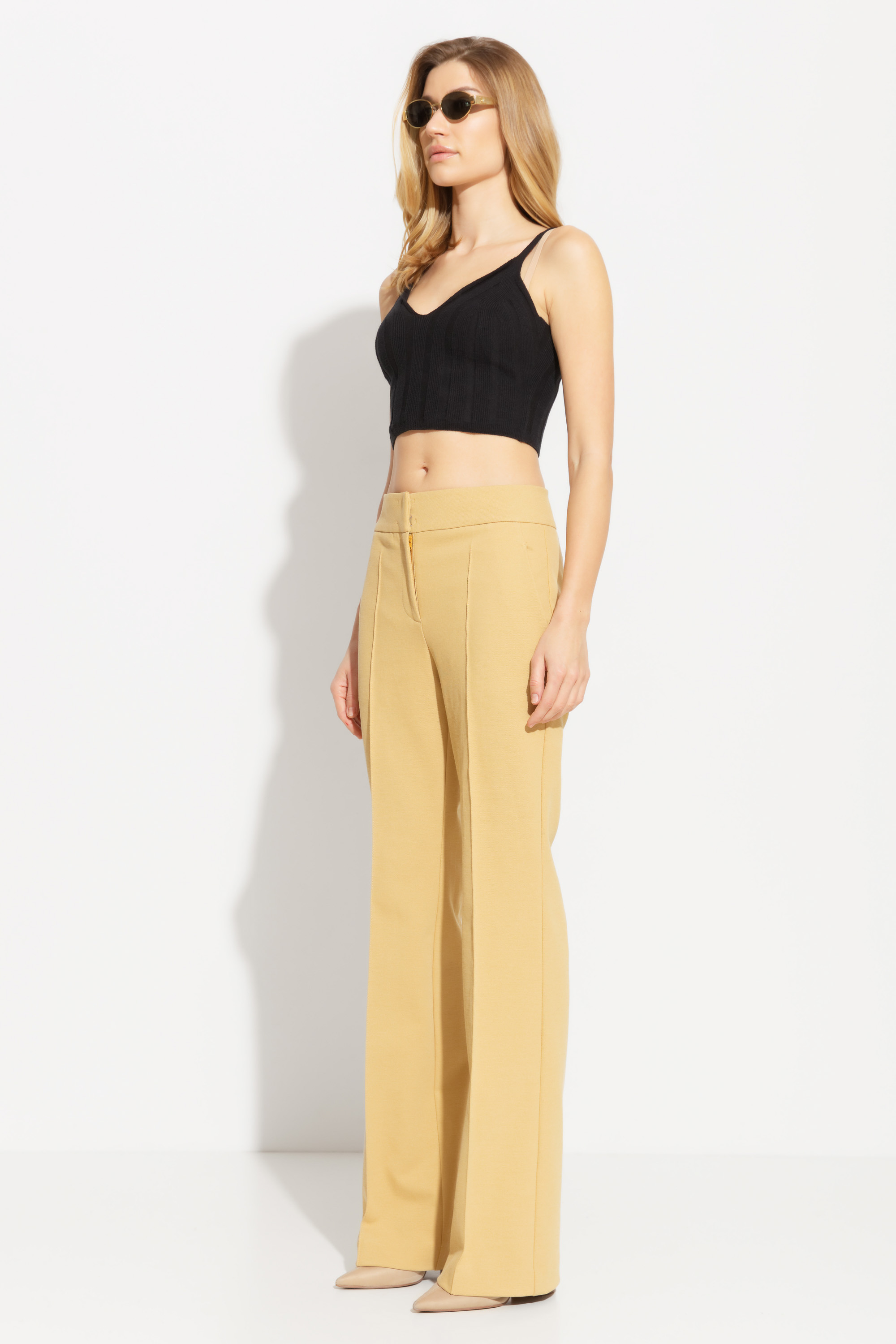 Брюки прилегающего силуэта, который подчеркивает фигуру, а расклешенные штанины добавляют легкости и изящества. Сшиты из качественного материала и имеют притачной пояс, который обеспечивает комфортную посадку на талии. Передние части брюк имеют застроченные канты, а боковые части обработаны карманами, что делает их практичными и удобными в использовании. Задние части брюк имеют две талиевые выточки, которые обеспечивают отличную посадку на фигуре. Пояс брюк украшен принтом, который добавляет им дополнительный шарм и индивидуальность. Носите эти брюки на работе или в повседневной жизни - они станут вашим любимым элементом гардероба.