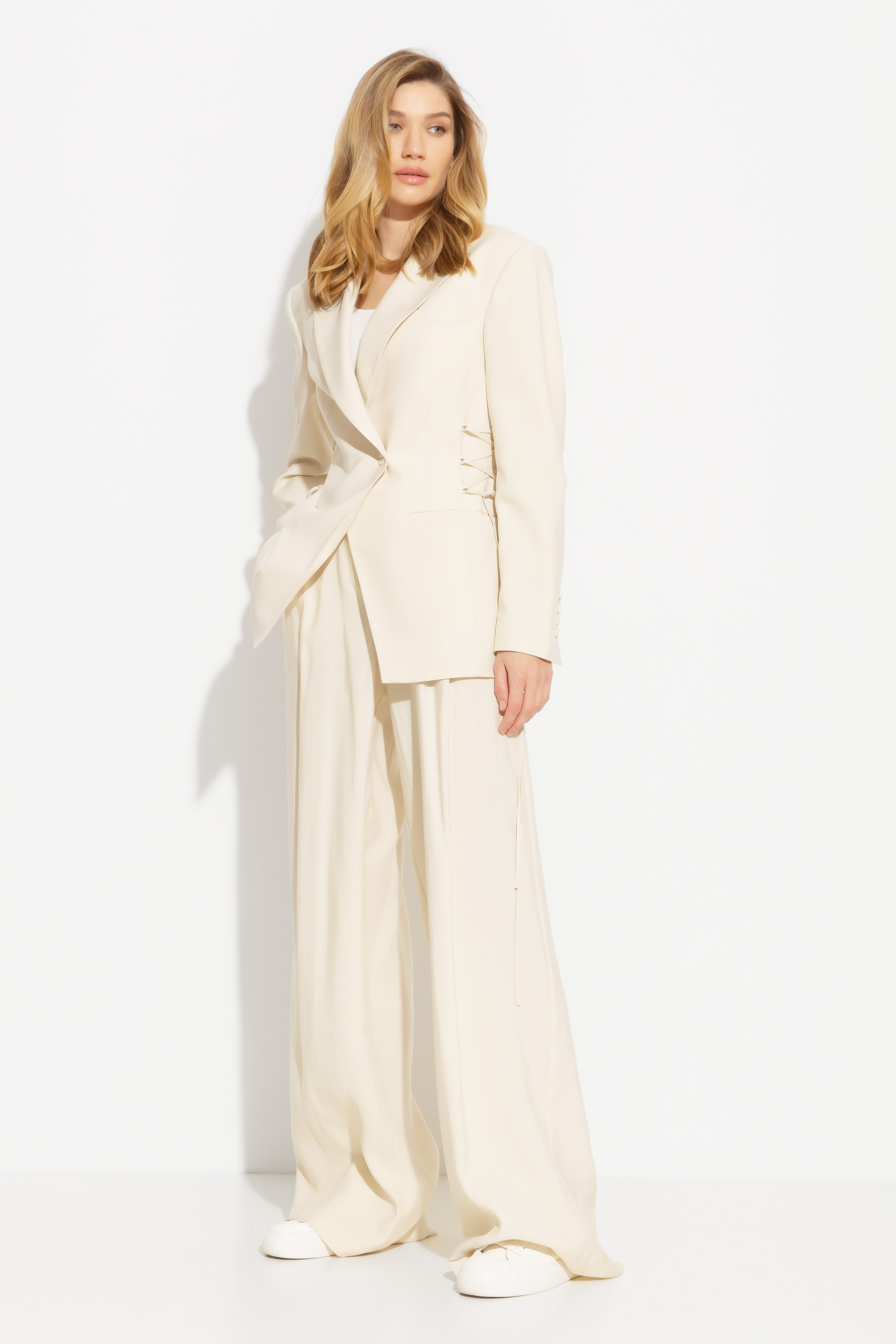 Брюки полуприлегающего силуэта подчеркивает фигуру и создает элегантный образ. Расширяются от линии бедер к низу, что придает им особую изюминку и делает их более интересными. Застежка в среднем шве переда на тесьму - «молния» обеспечивает надежность и удобство при носке. Задние части брюк с двумя талиевыми выточками добавляют изюминку и придают брюкам дополнительный шарм. Пояс брюк с пятью шлевками, застежка на металлический крючок, потайная петля и пуговица делают их более удобными и практичными в использовании. Носите эти брюки на работе или на встрече с друзьями - они станут вашим надежным спутником в любой ситуации.
