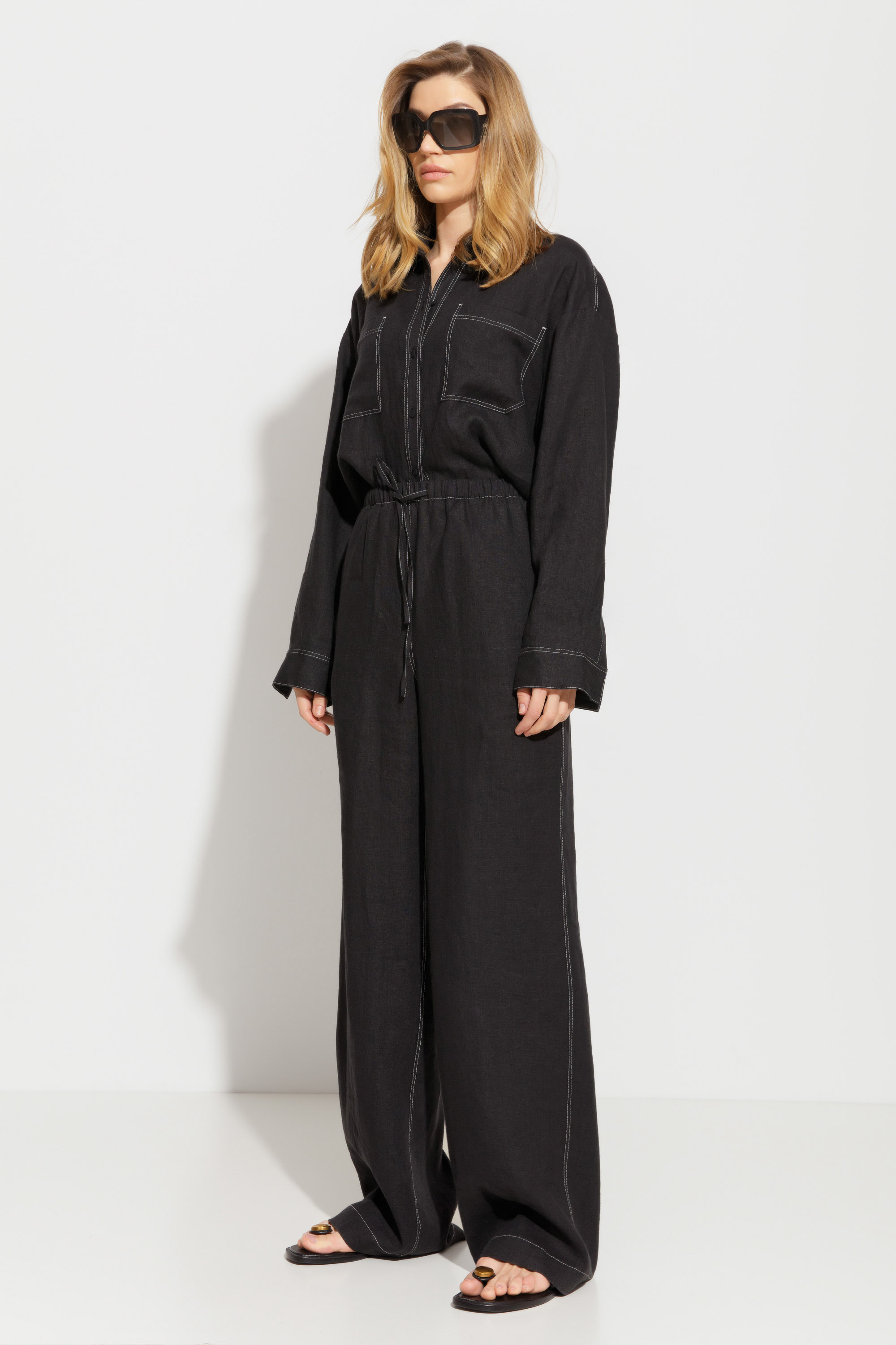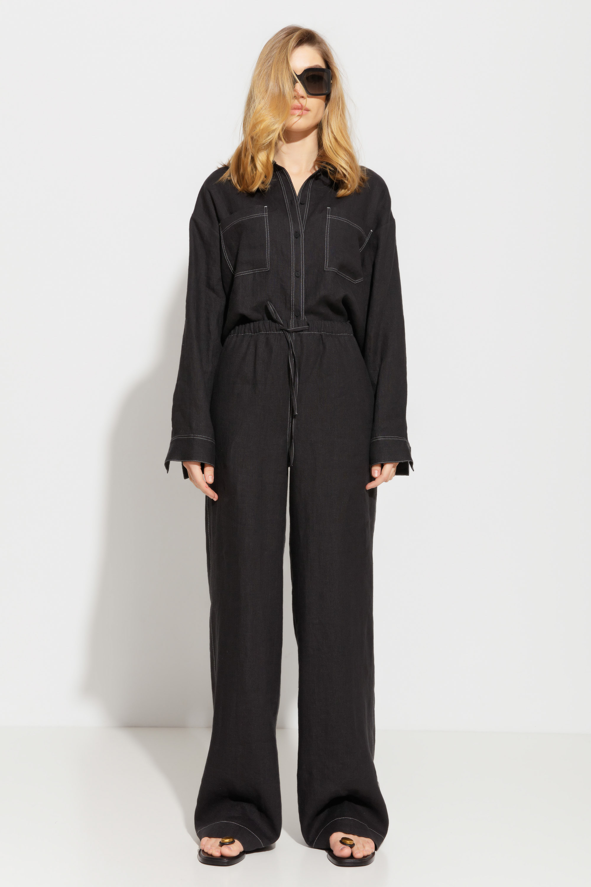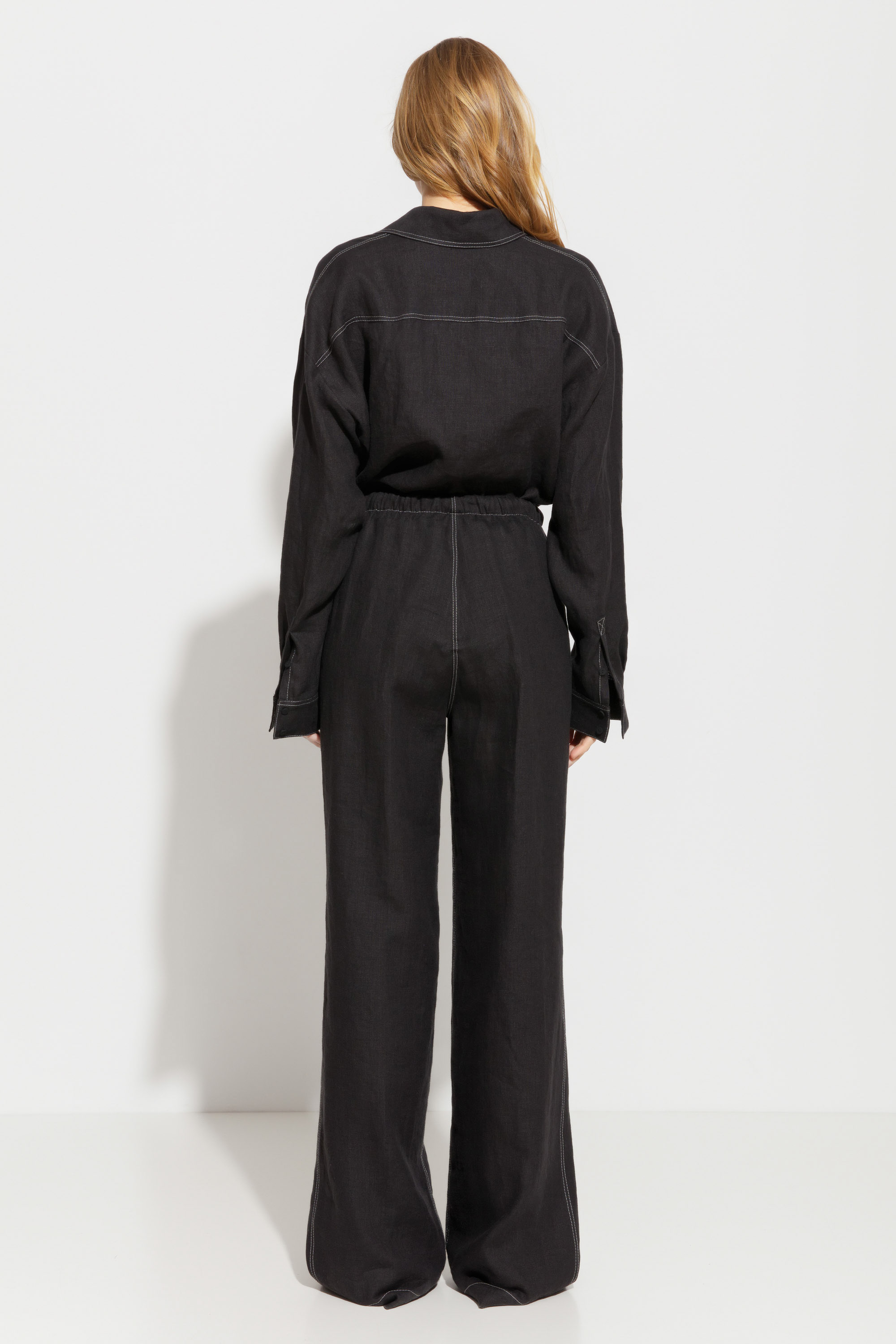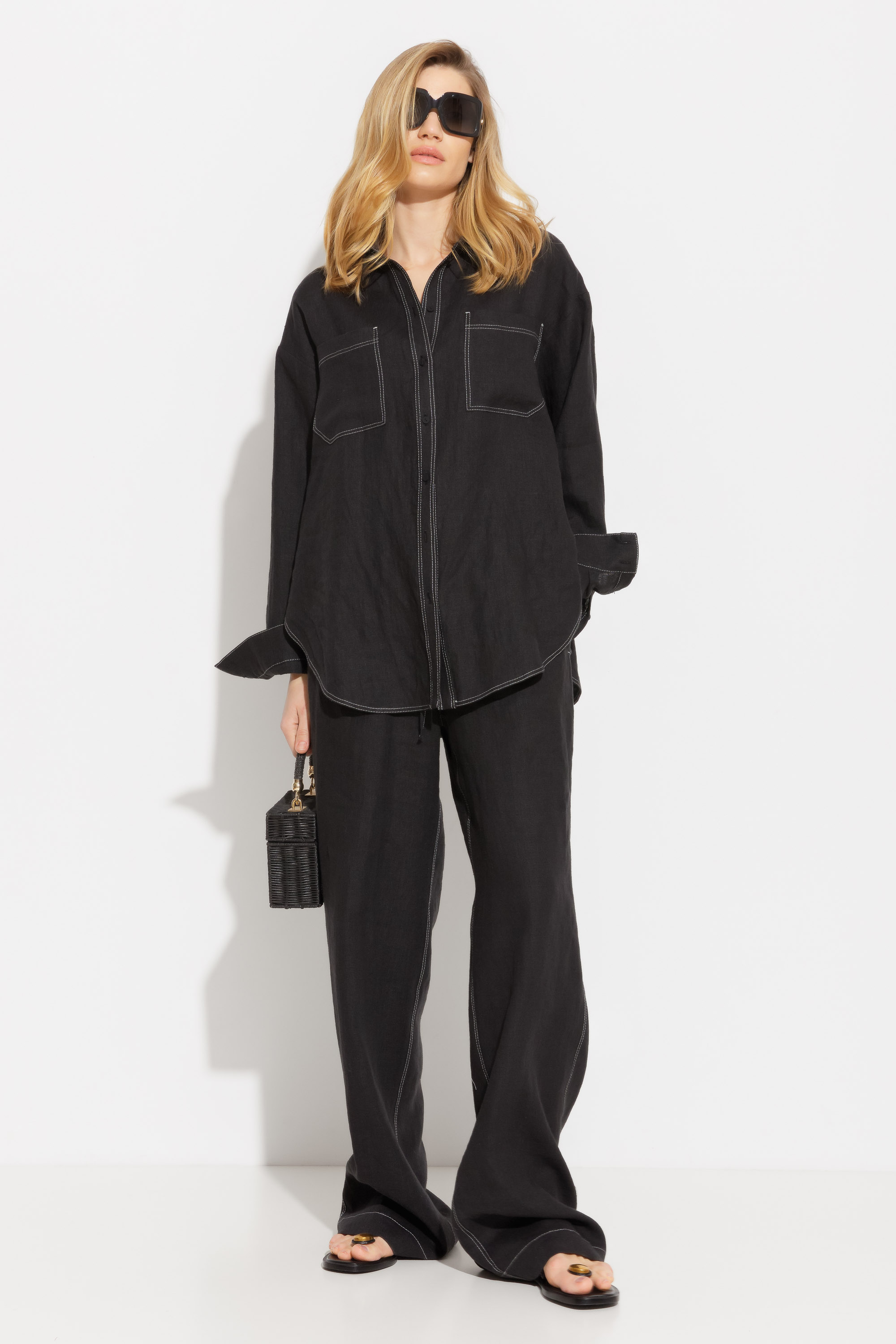 Брюки льняные прямого кроя, расширенные от линии бедер к низу. Посадка изделия средняя. По бокам прорезные карманы. Отделочные строчки выполнены нитками белого цвета и придают блузке дополнительную изысканность. Эти брюки - настоящий must-have в гардеробе каждой модницы. Базовая, универсальная и комфортная модель, с которой можно создавать различные стильные образы по любому случаю.