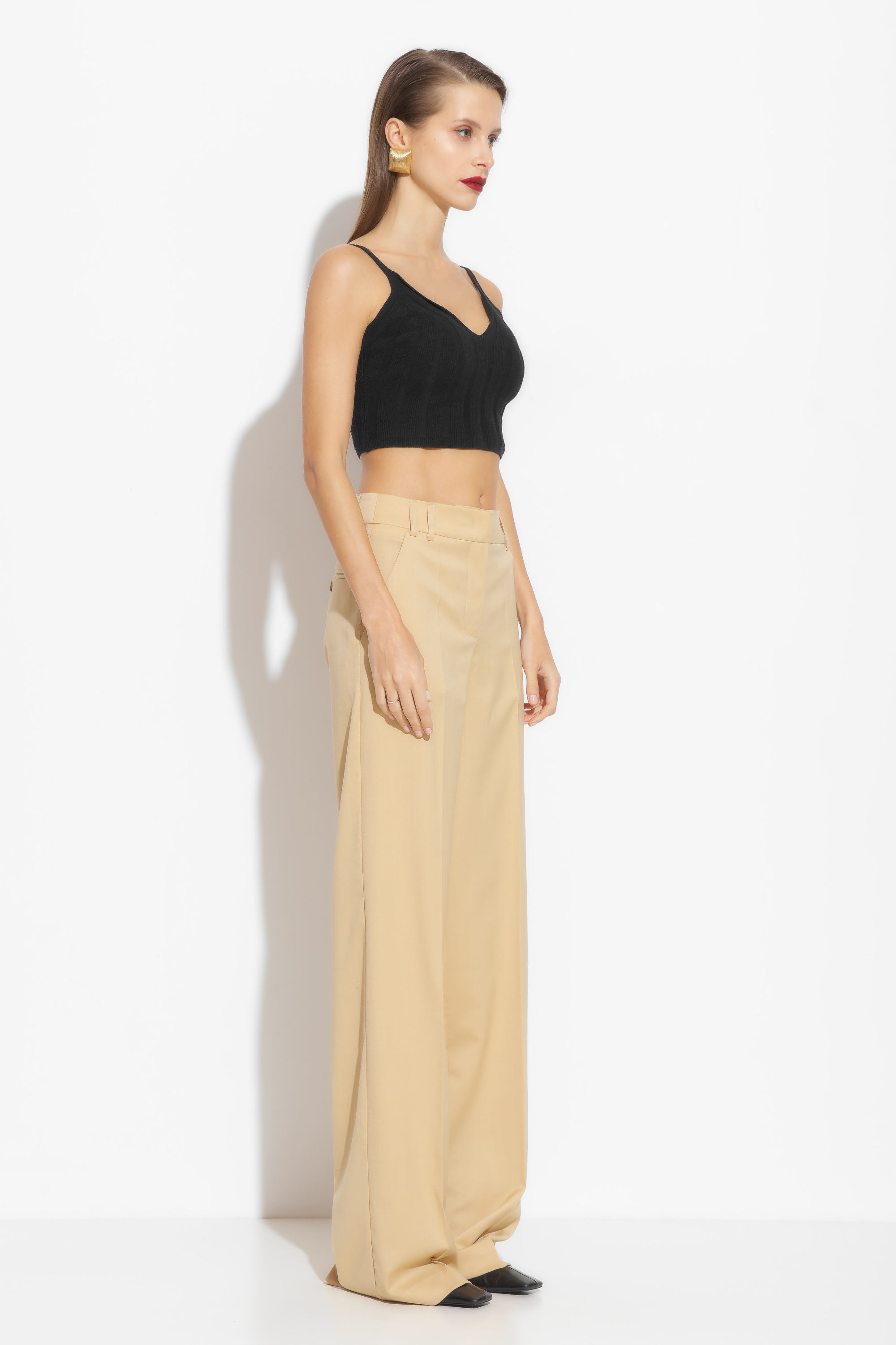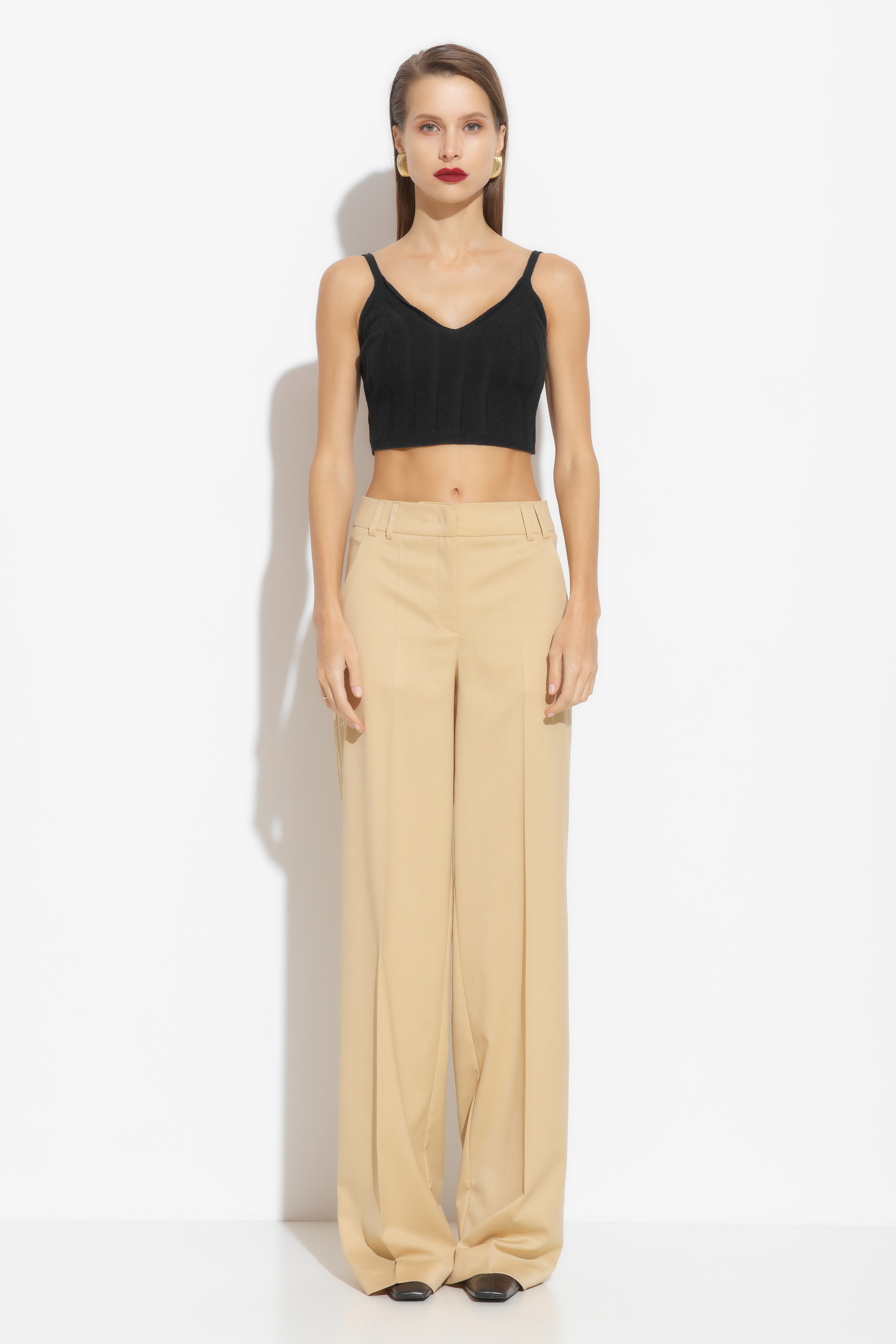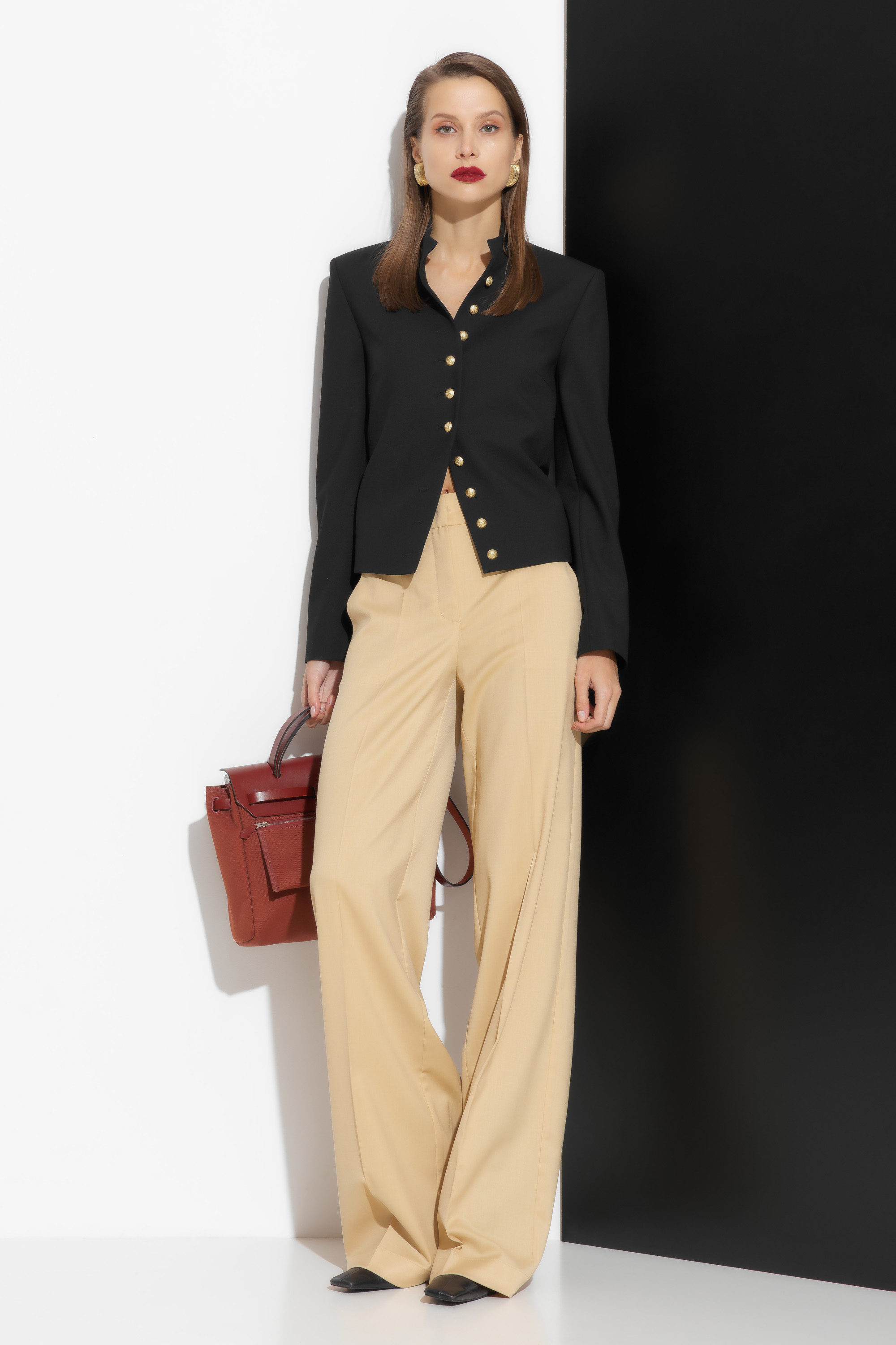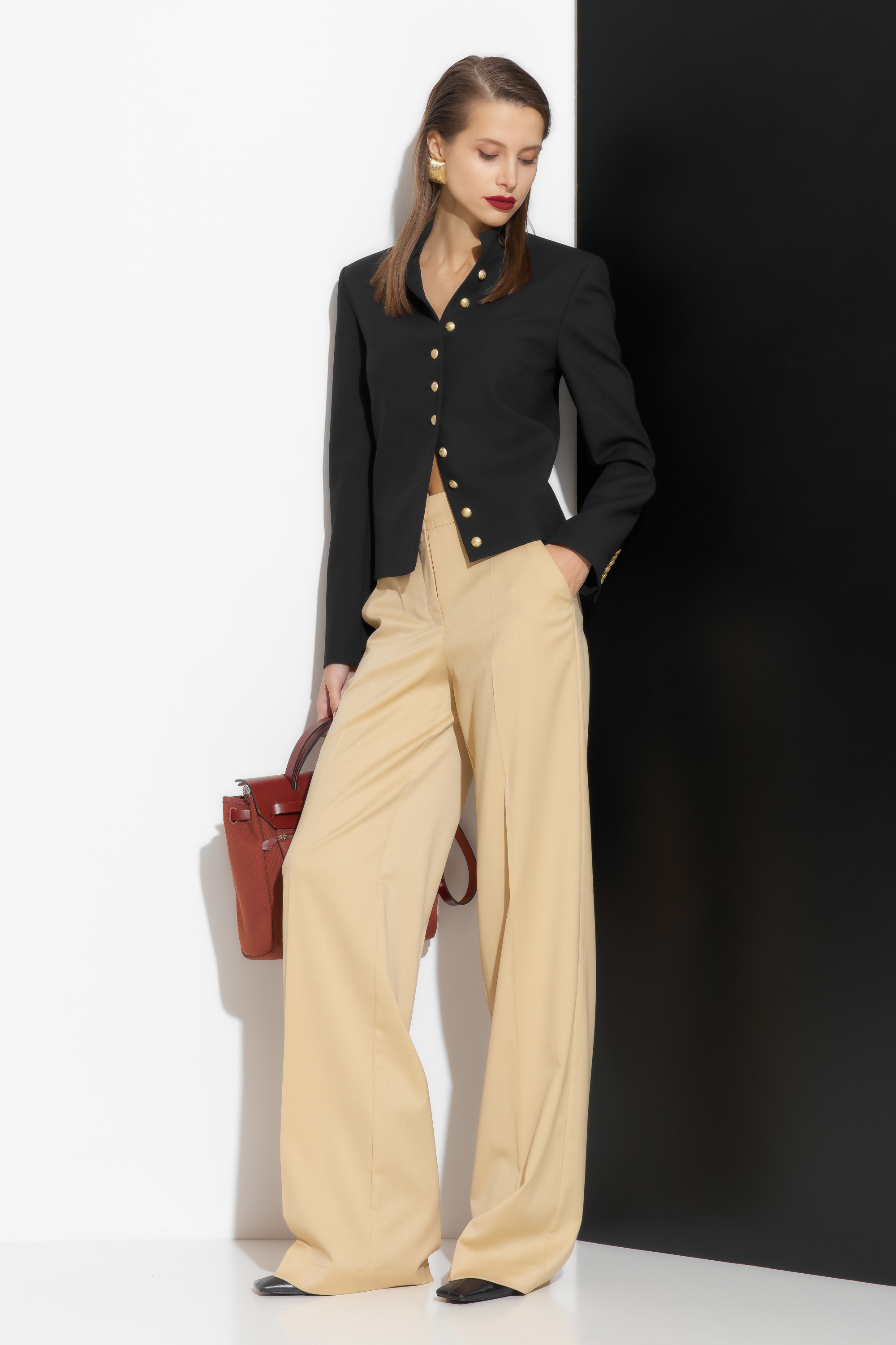 Брюки прямого кроя, расширенные от линии бедер к низу. Посадка изделия средняя. По бокам обрезные карманы. На бедрах прорезные карманы в рамку. Классический крой и цвет позволяют сочетать брюки с различным верхом и создавать стильные образы как для особых случаев, так и для ежедневных дел.