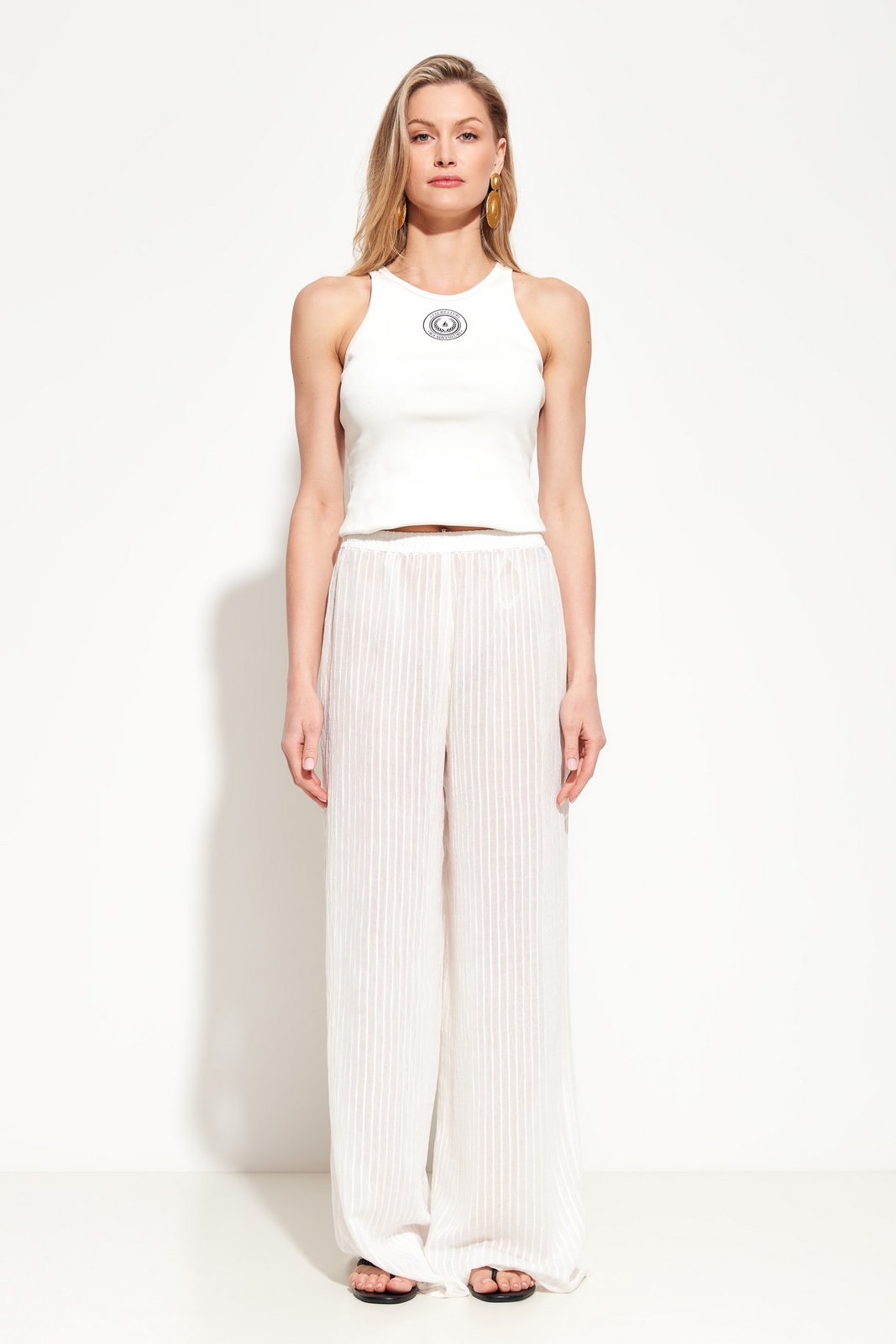 Брюки полуприлегающего силуэта, расширенные от линии бедер к низу. Посадка изделия средняя. Пояс на эластичной резинке, что обеспечивает комфорт при носке изделия. Полупрозрачная ткань в вертикальную полоску визуально удлиняет силуэт и делает ваш образ легким и эффектным.
