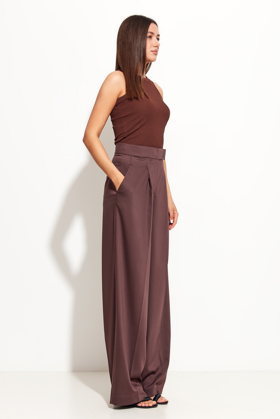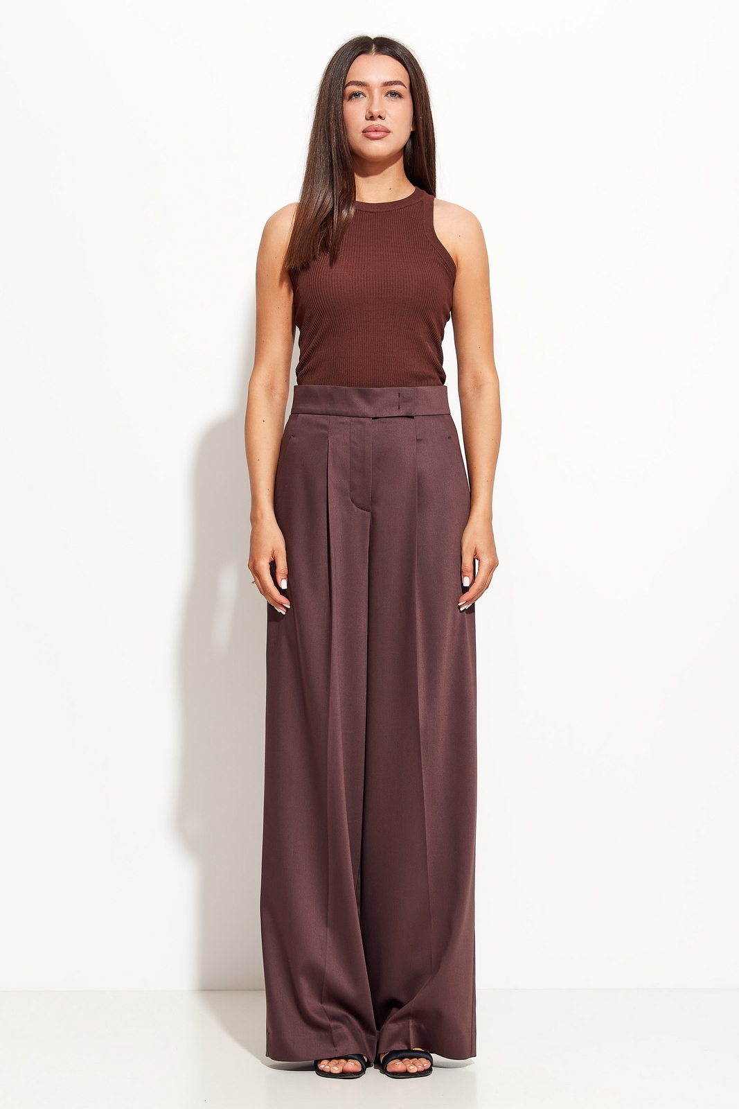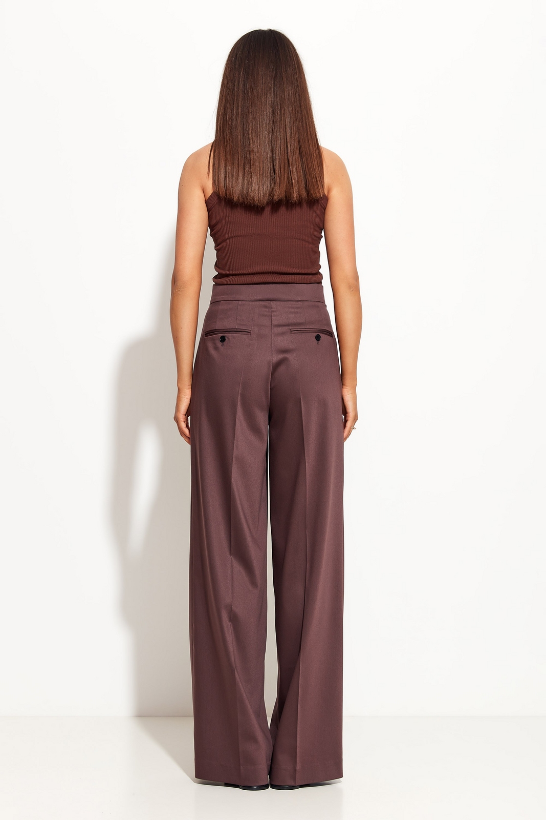 Брюки прямого кроя, расширенные от линии бедер к низу. Посадка изделия высокая. По бокам обрезные карманы. Спереди изделие с застроченными стрелками и заутюженными кантами. Стильная, классическая модель, которая идеально подойдет для создания эффектных образов по любому случаю.