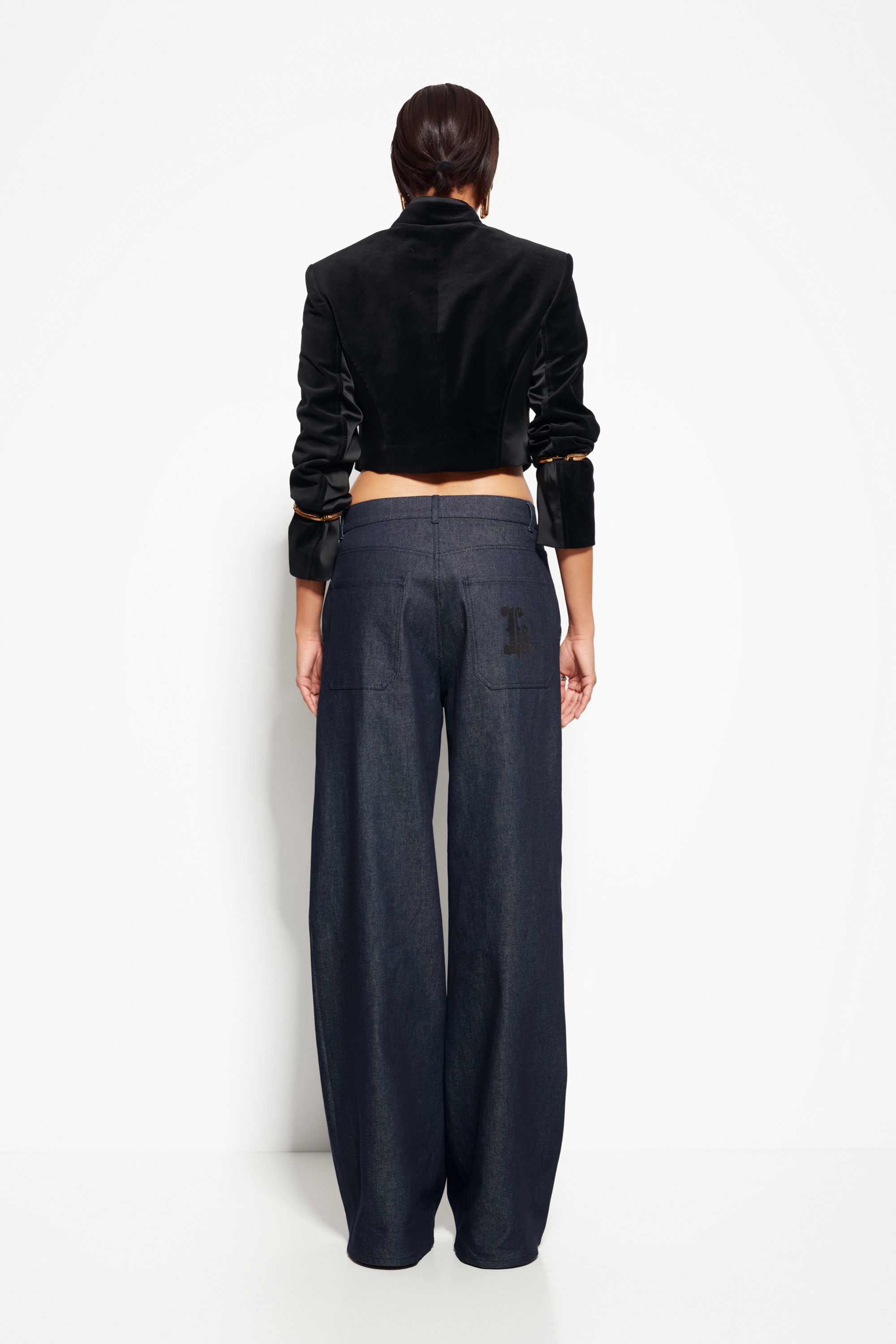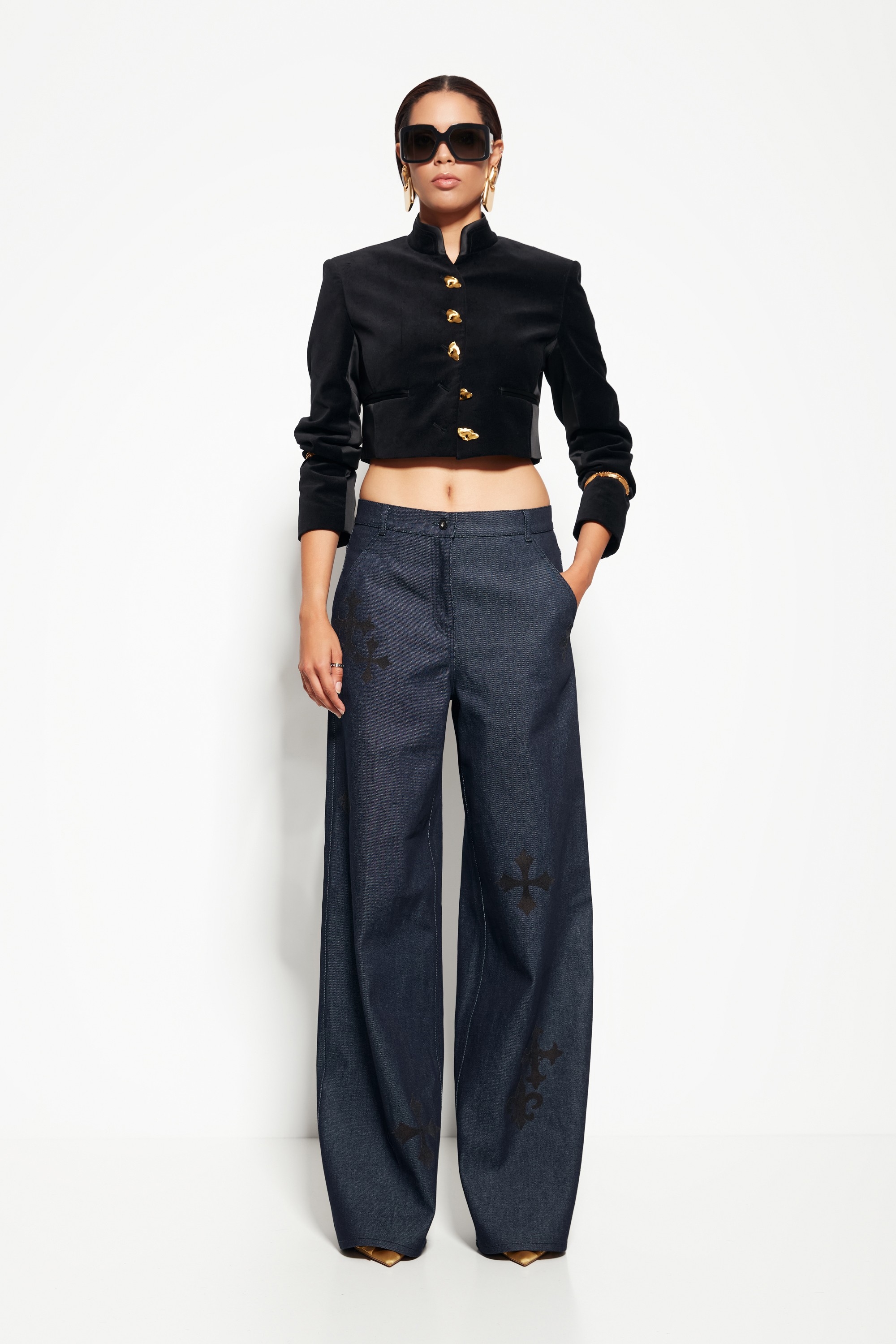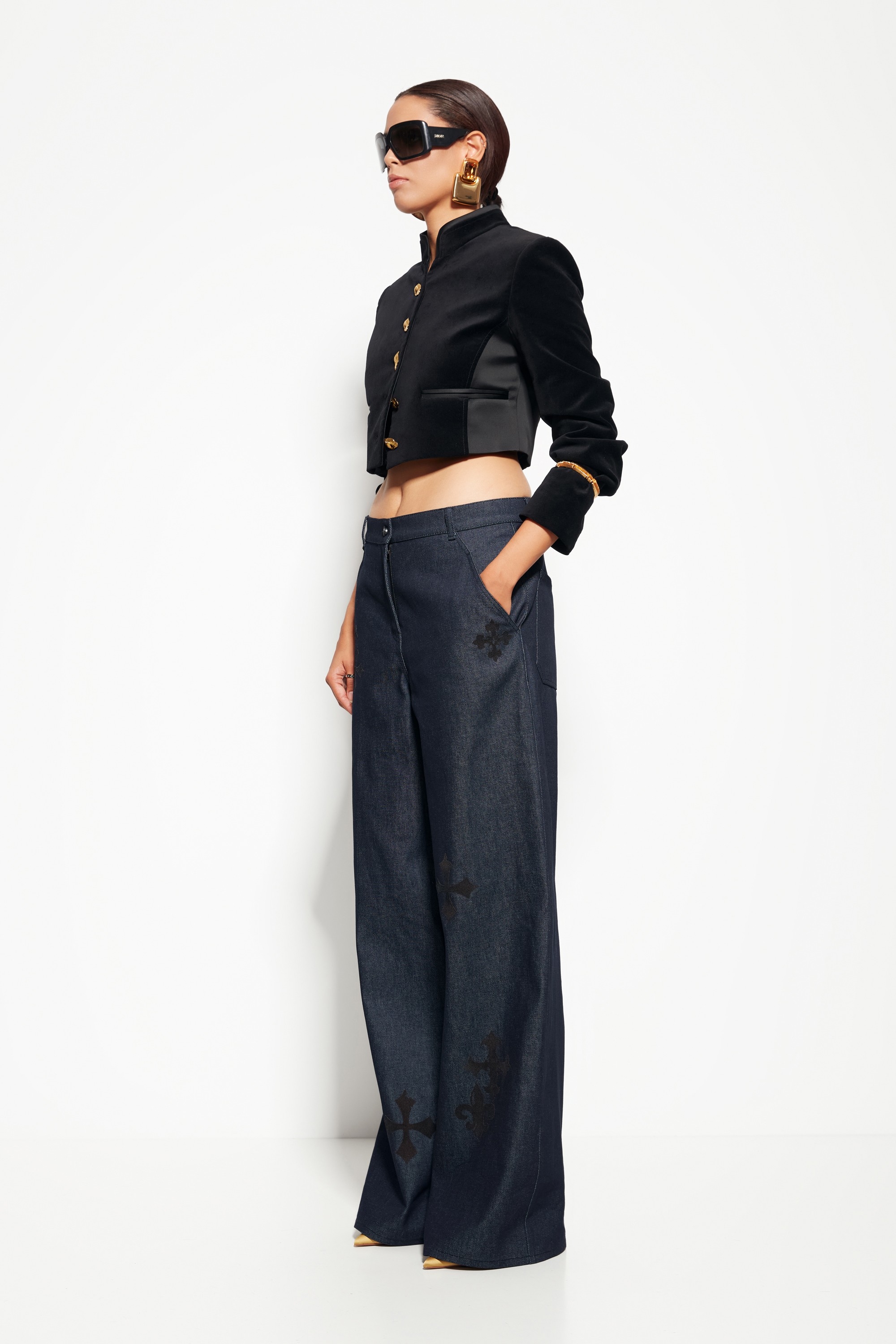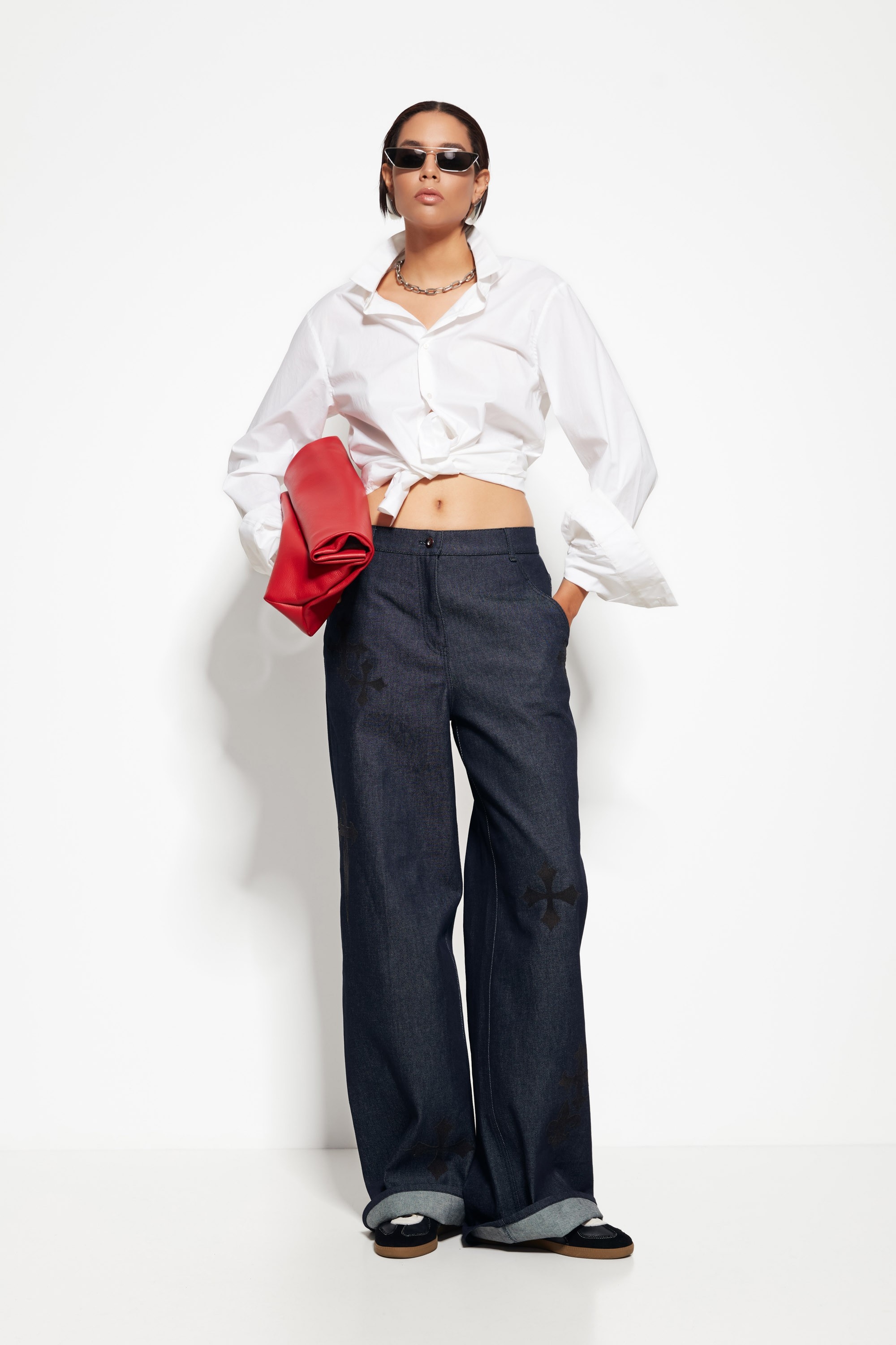 Модель из коллекции Party 2026 — джинсы с широкими штанинами и ярким принтом, создающие стильный и современный образ.