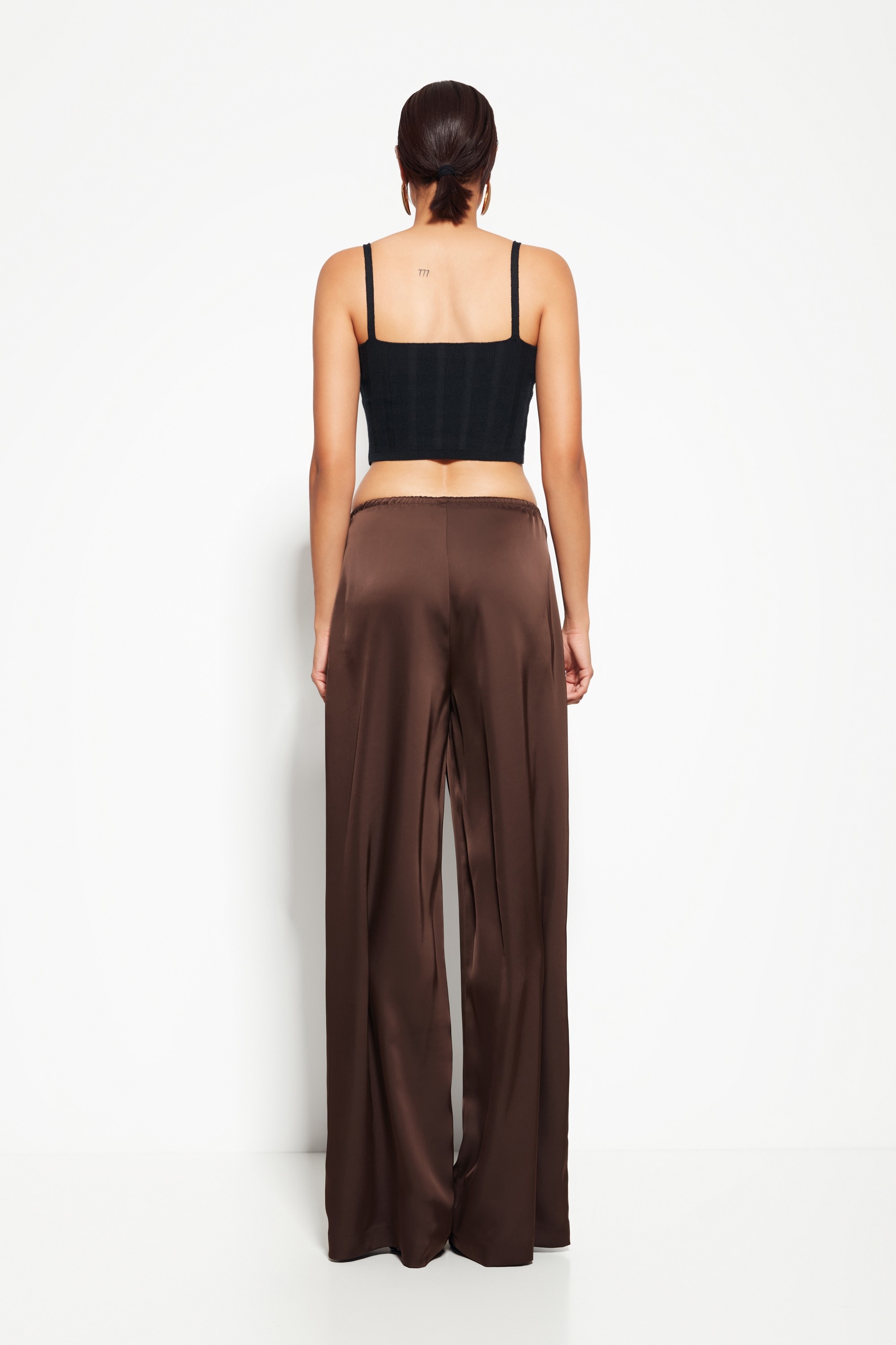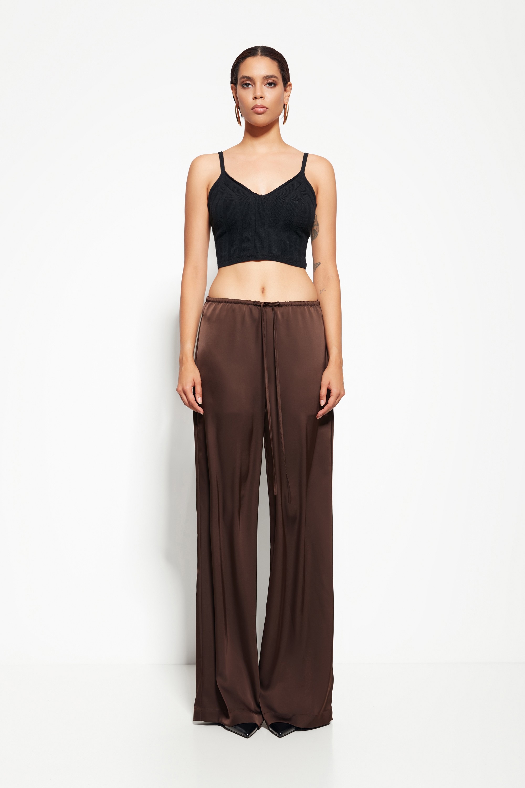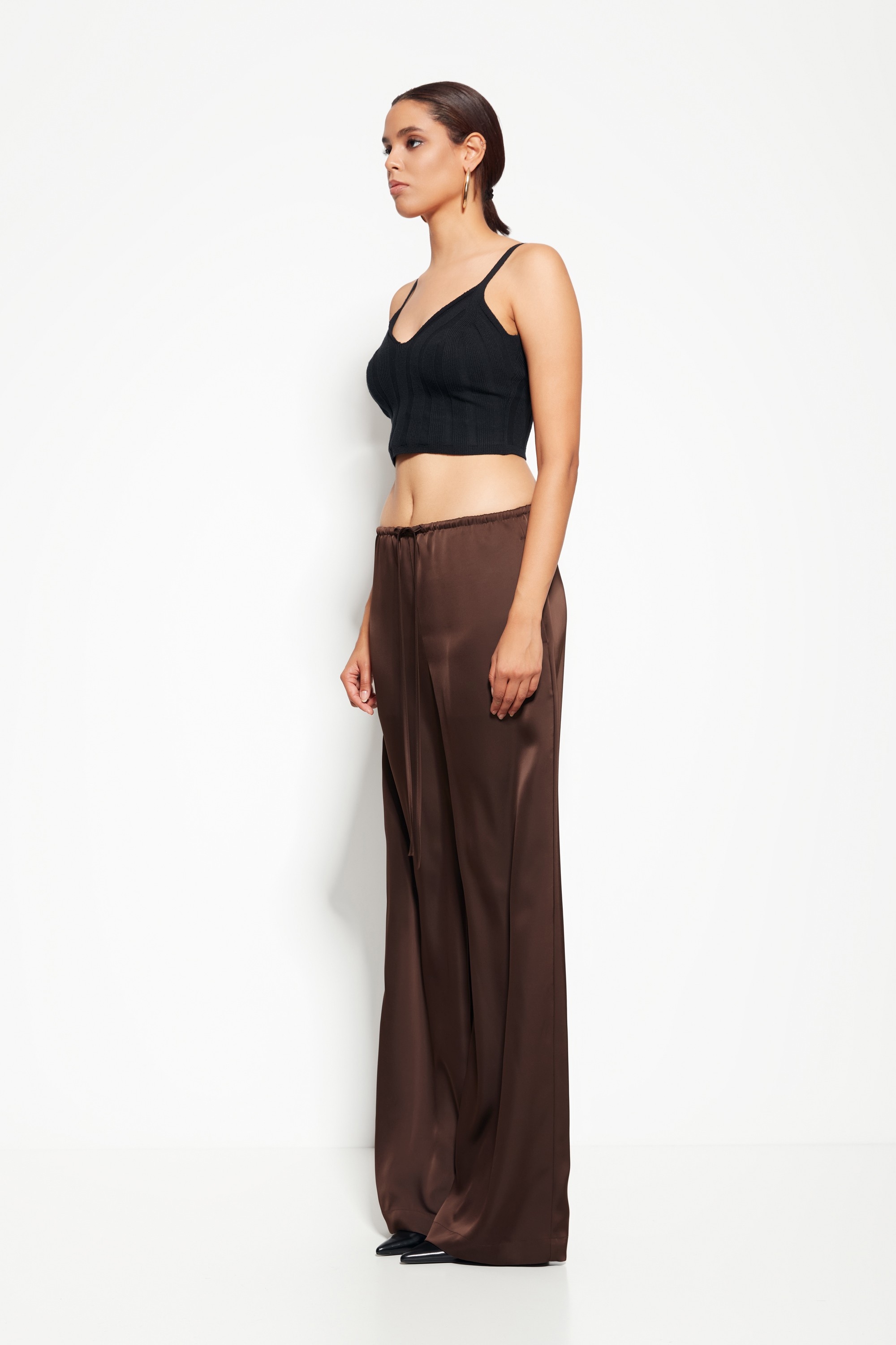 Модель из коллекции Party 2026 — брюки из струящейся ткани с прямым силуэтом, создающие лёгкий и элегантный образ. Отсутствие декора на поясе подчёркивает чистоту линий и универсальность модели.