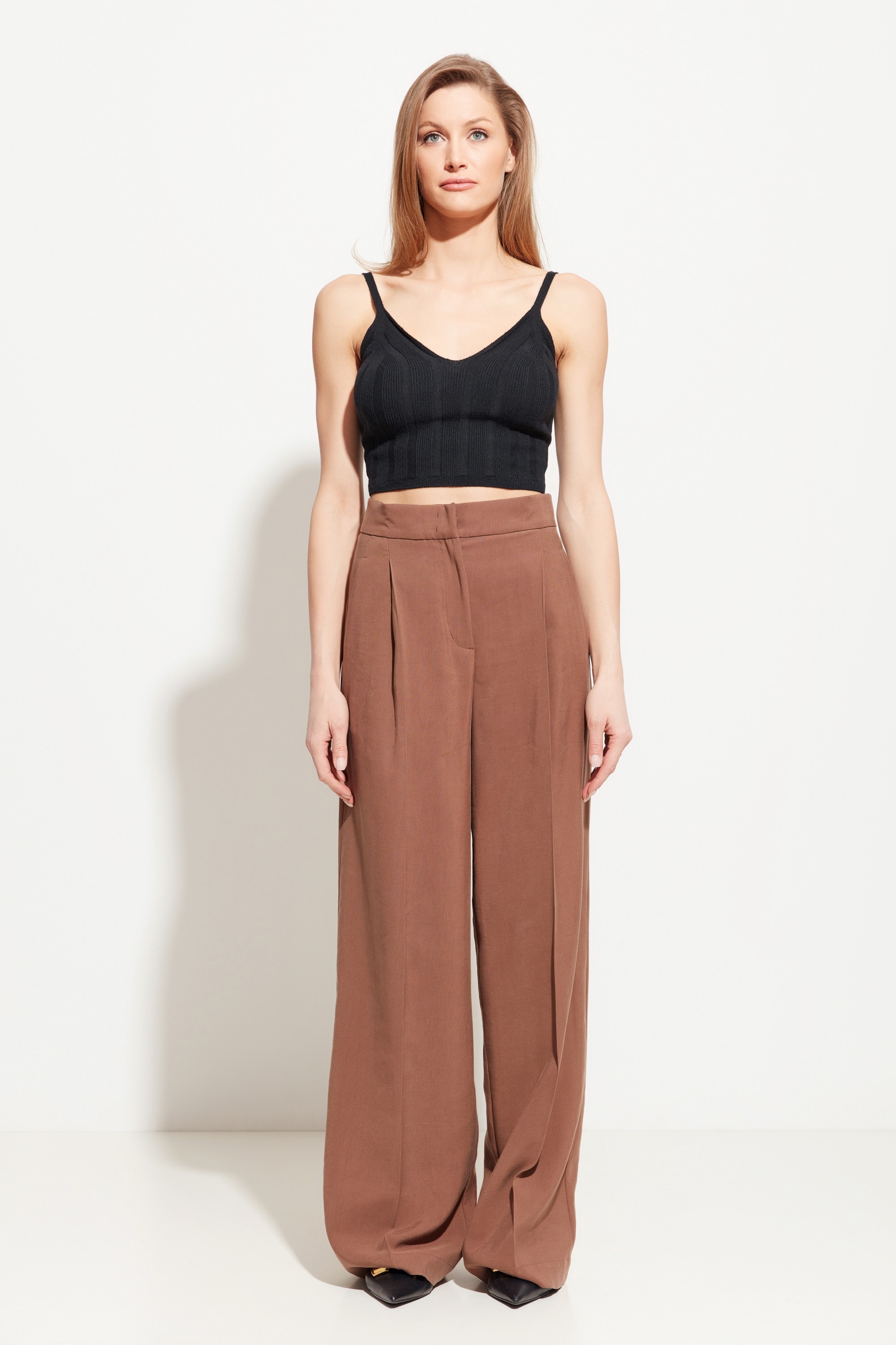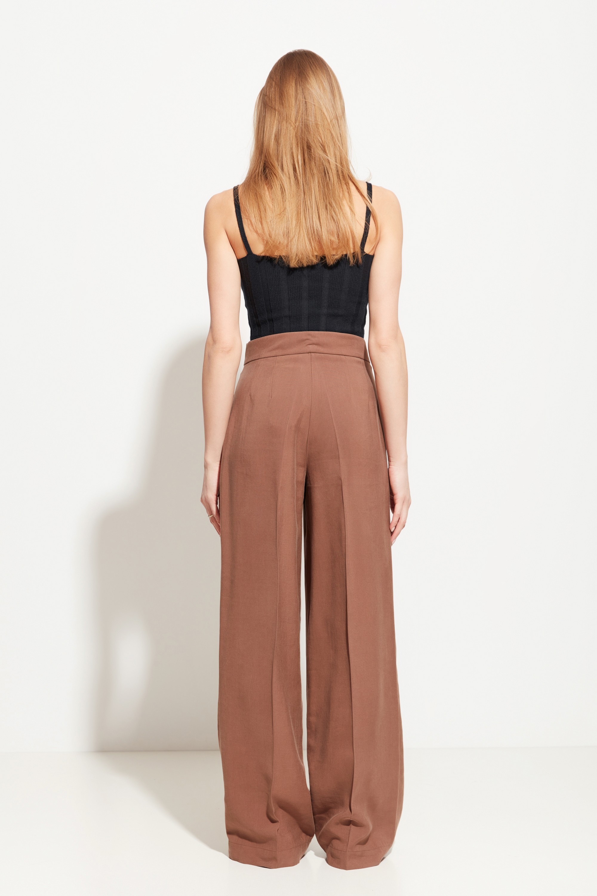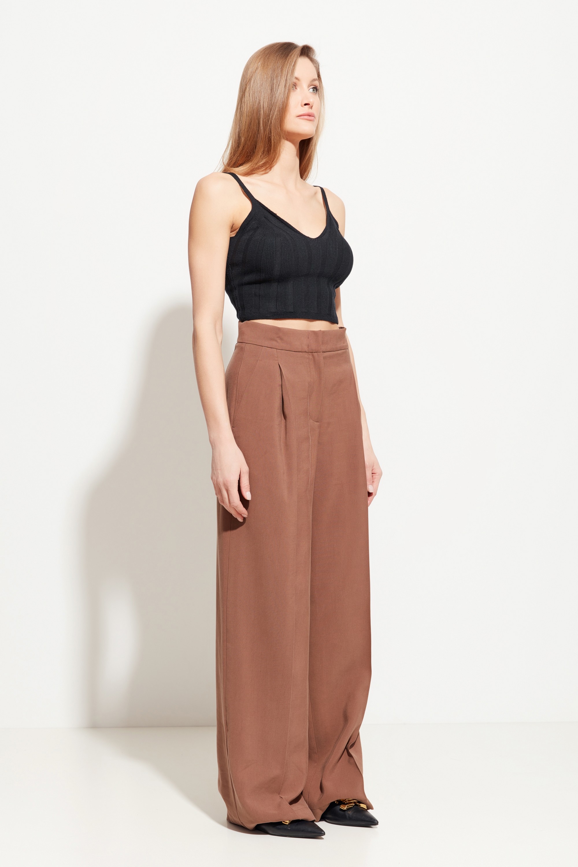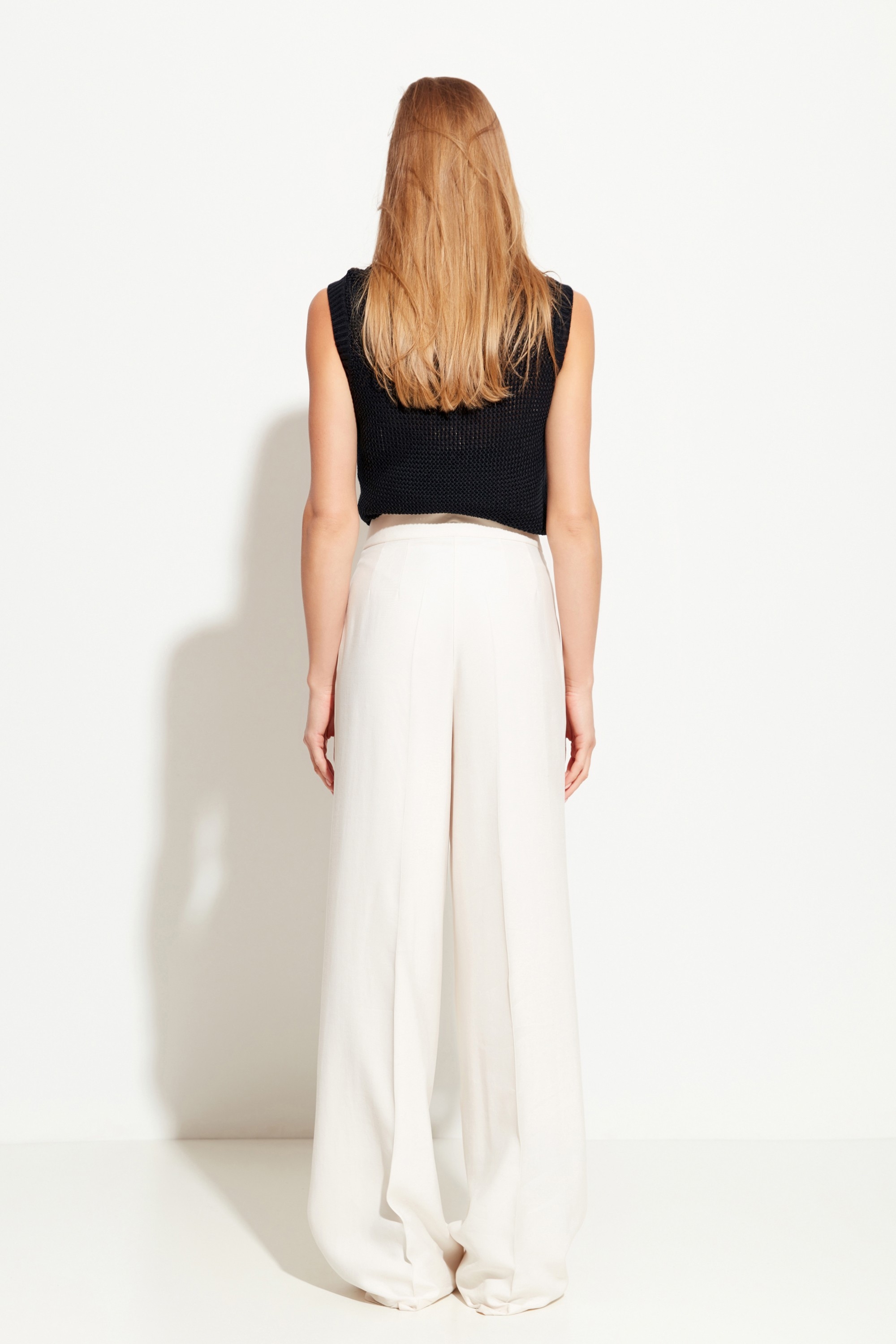 Брюки прямого кроя, расширенные от линии бедер к низу. Посадка изделия высокая. По бокам обрезные карманы. Спереди изделие с застроченными стрелками и заутюженными кантами. Стильная, классическая модель, которая идеально подойдет для создания эффектных образов по любому случаю.
