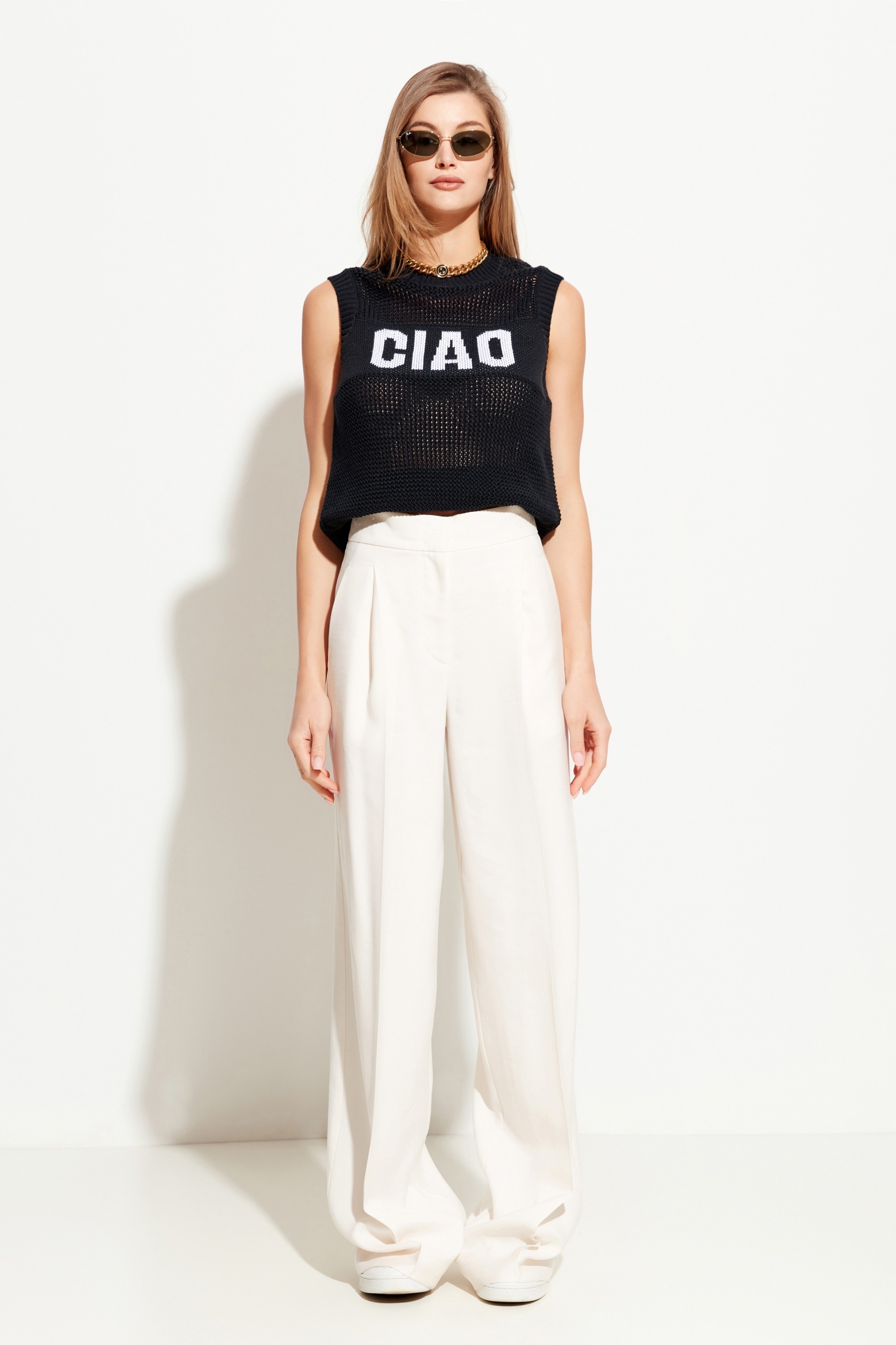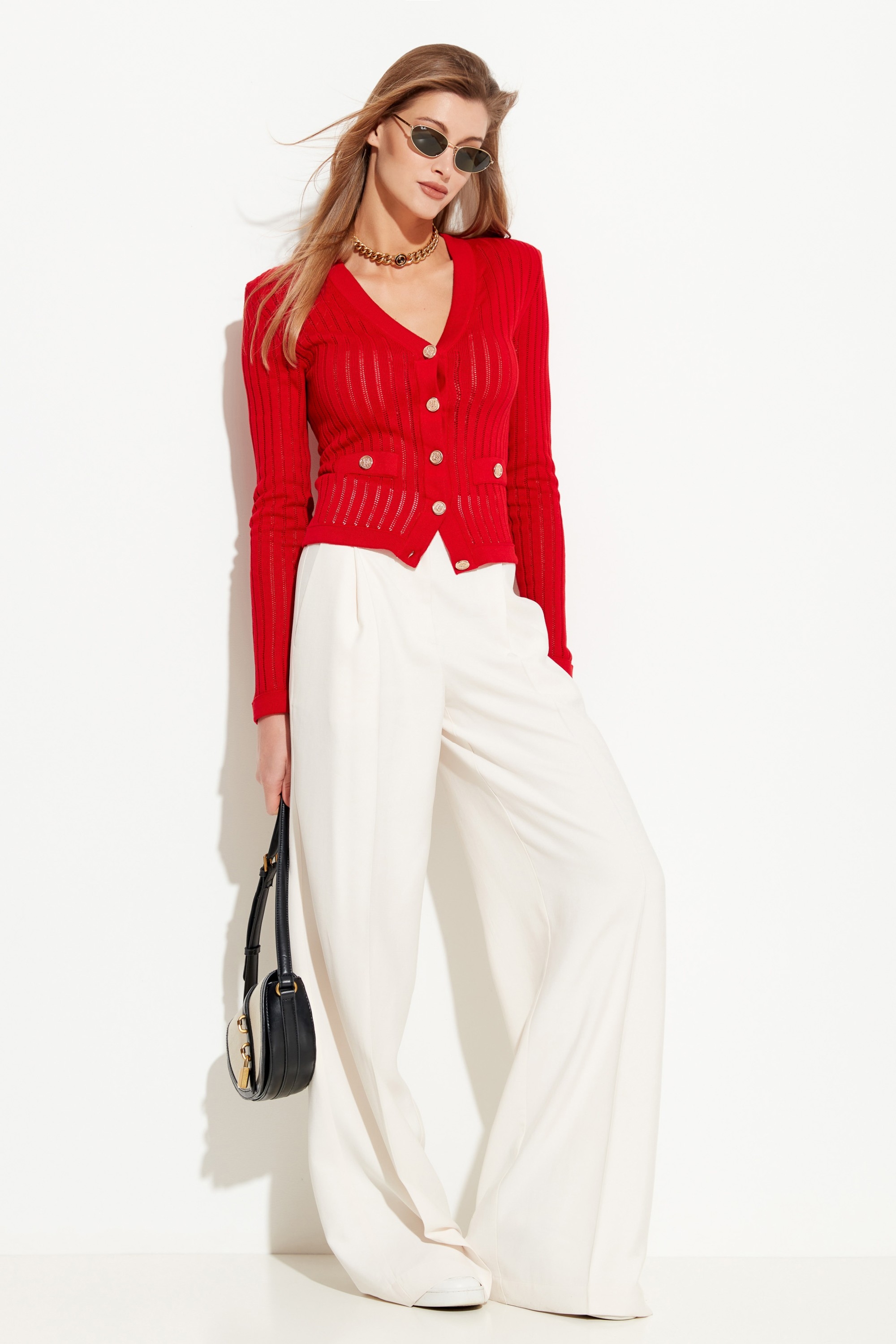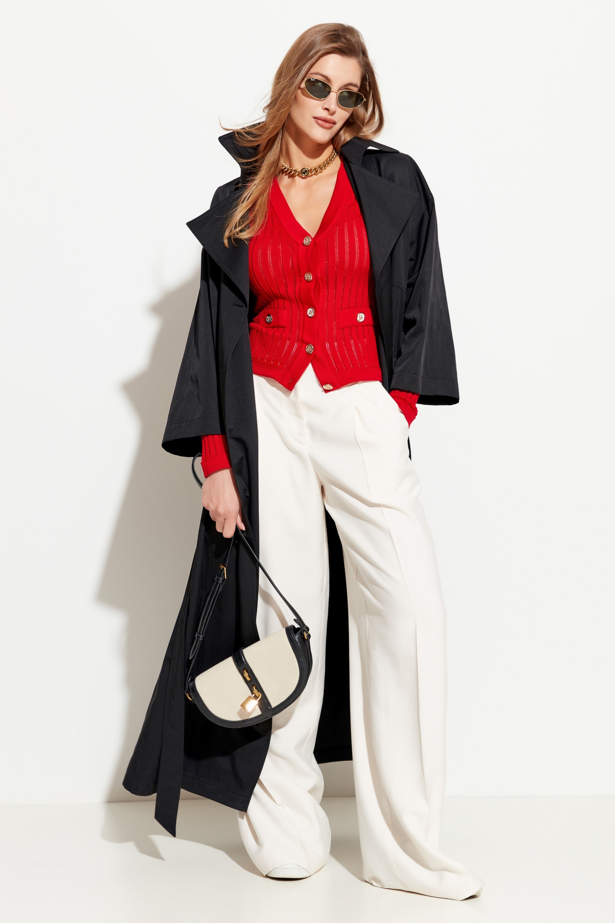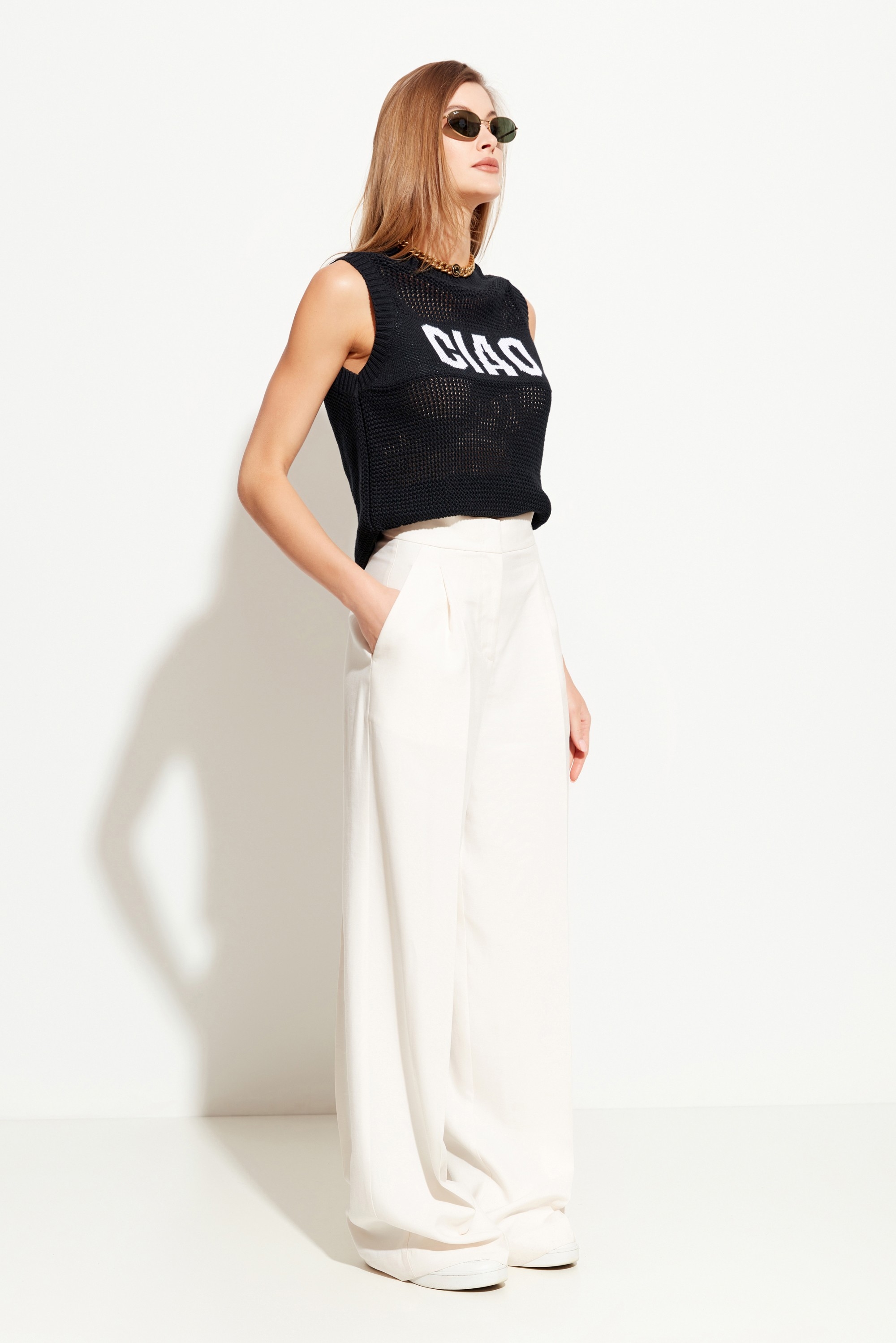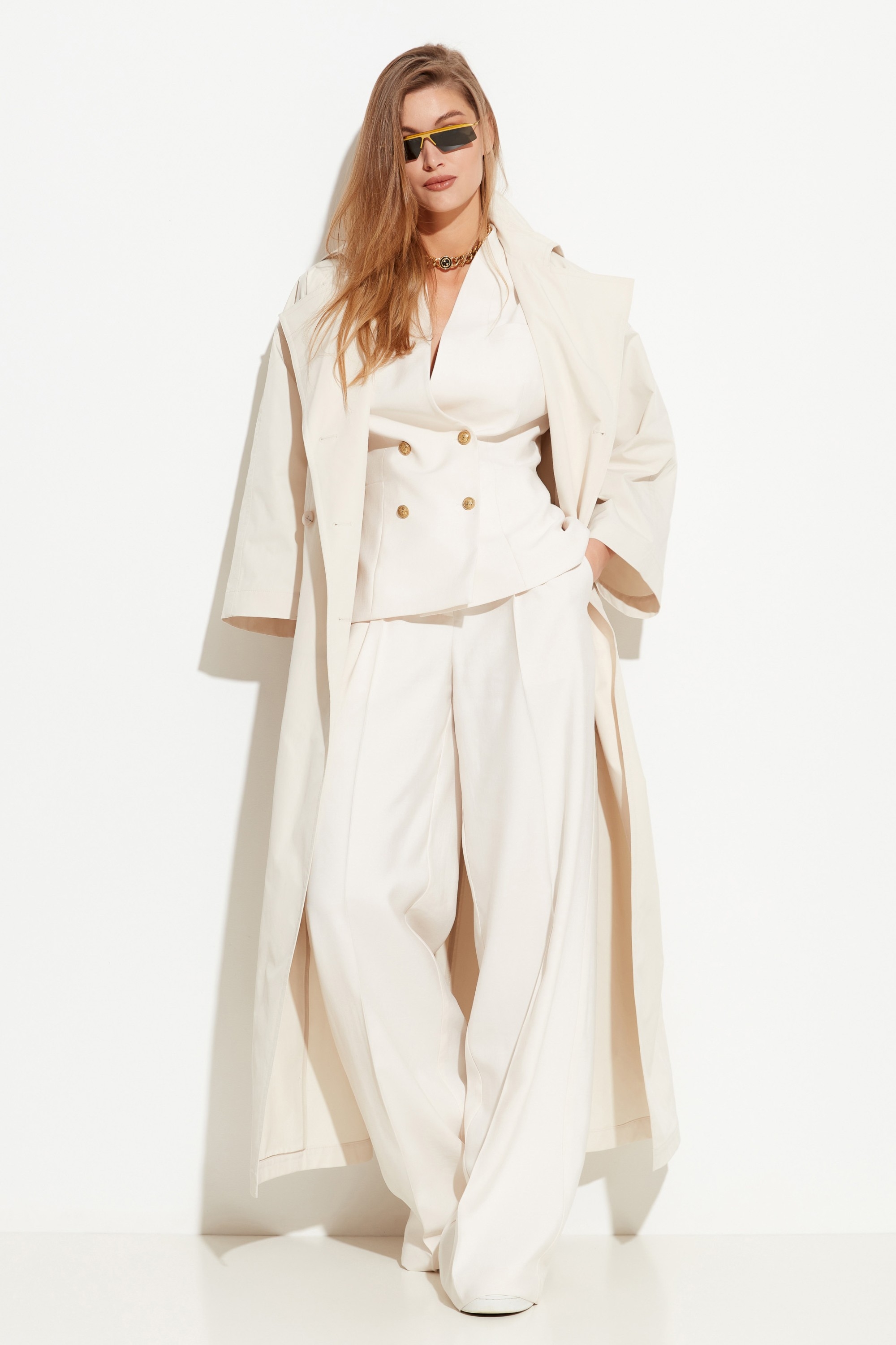 Брюки прямого кроя, расширенные от линии бедер к низу. Посадка изделия высокая. По бокам обрезные карманы. Спереди изделие с застроченными стрелками и заутюженными кантами. Стильная, классическая модель, которая идеально подойдет для создания эффектных образов по любому случаю.