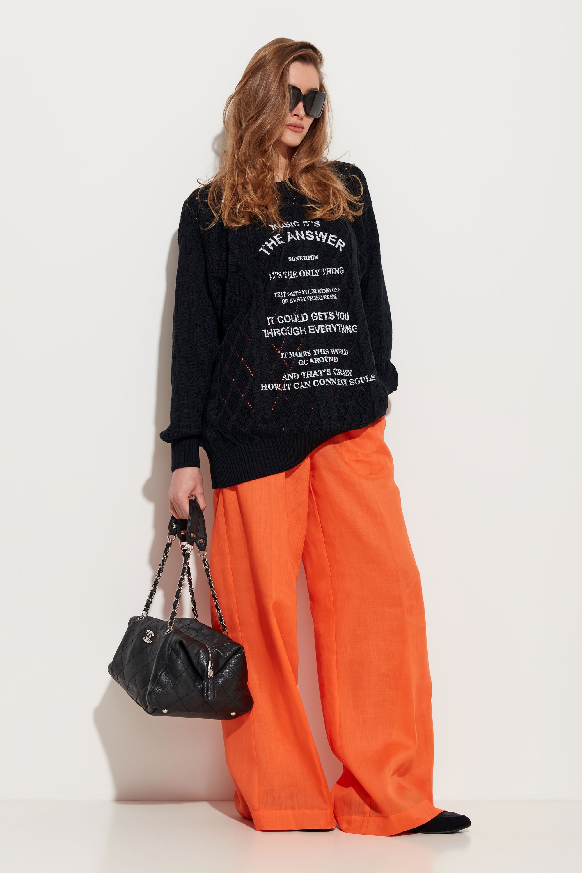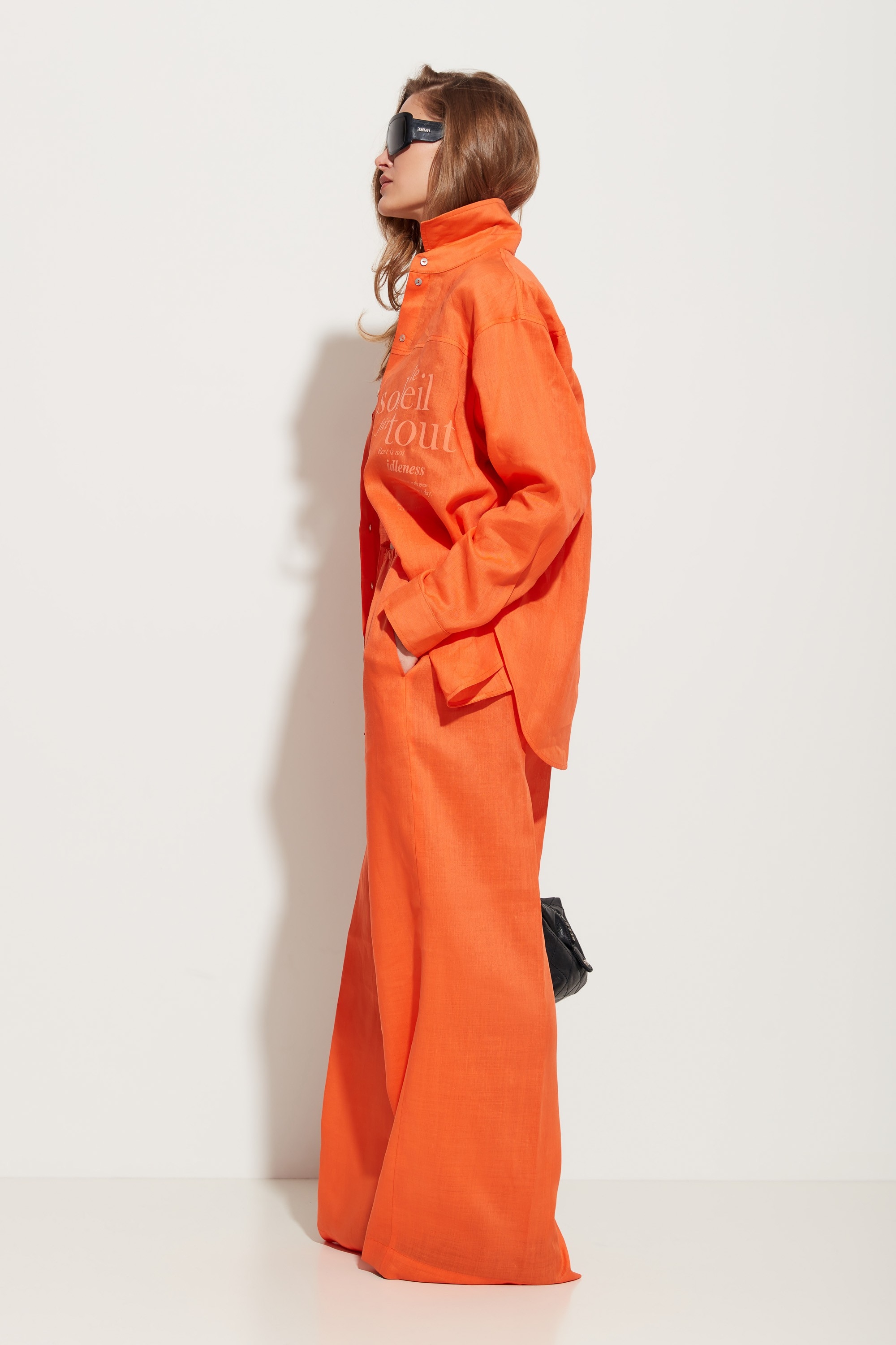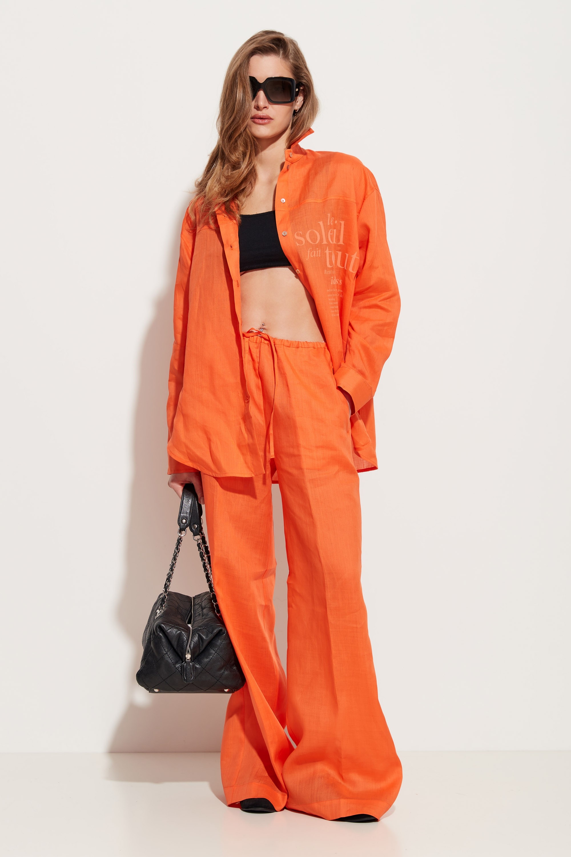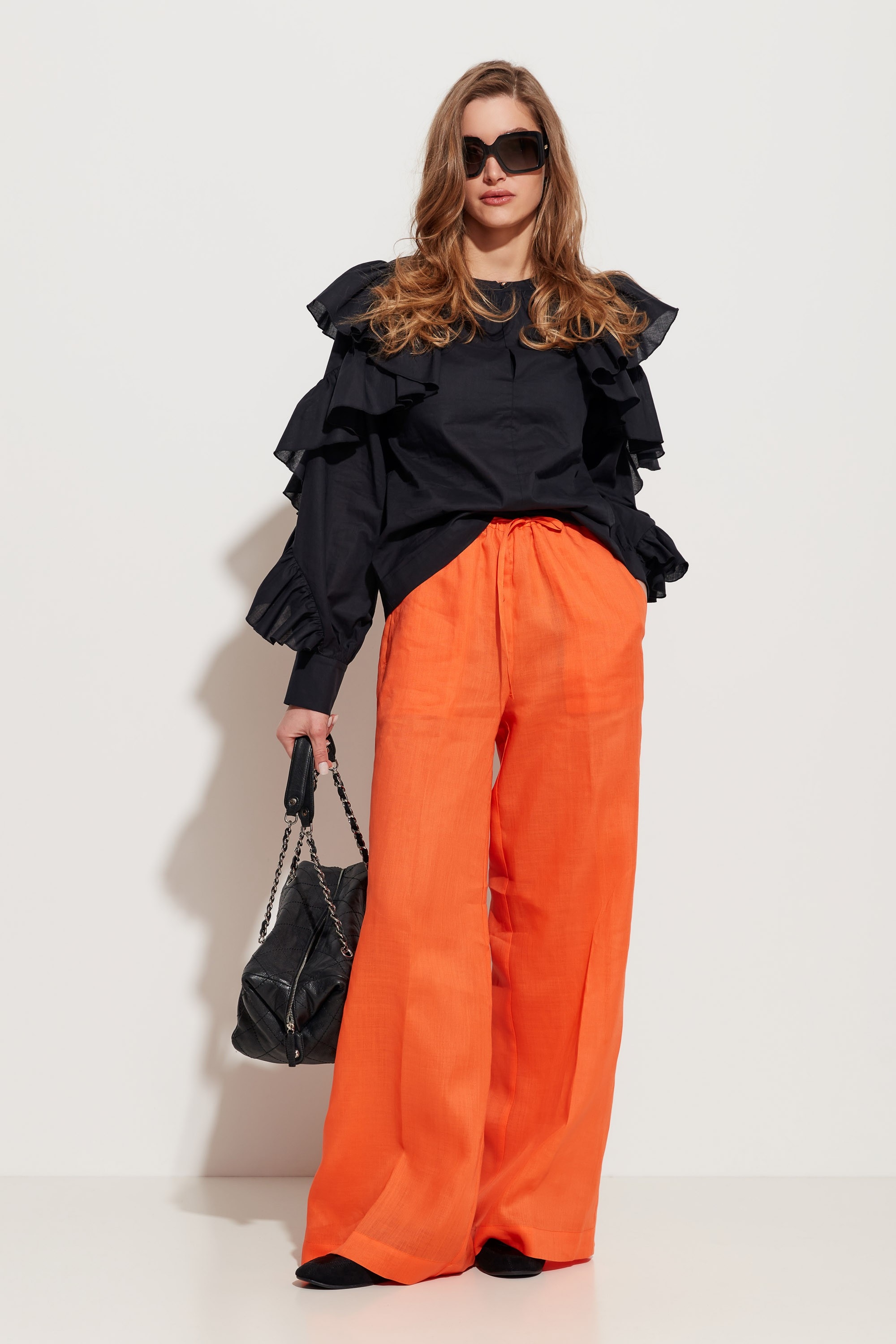 Брюки прямого кроя, расширенные от линии бедер к низу. Посадка изделия высокая. Объем талии регулируется при помощи протянутого шнура. По бокам карманы. Универсальная модель, которая сочетается с любым типом верха.