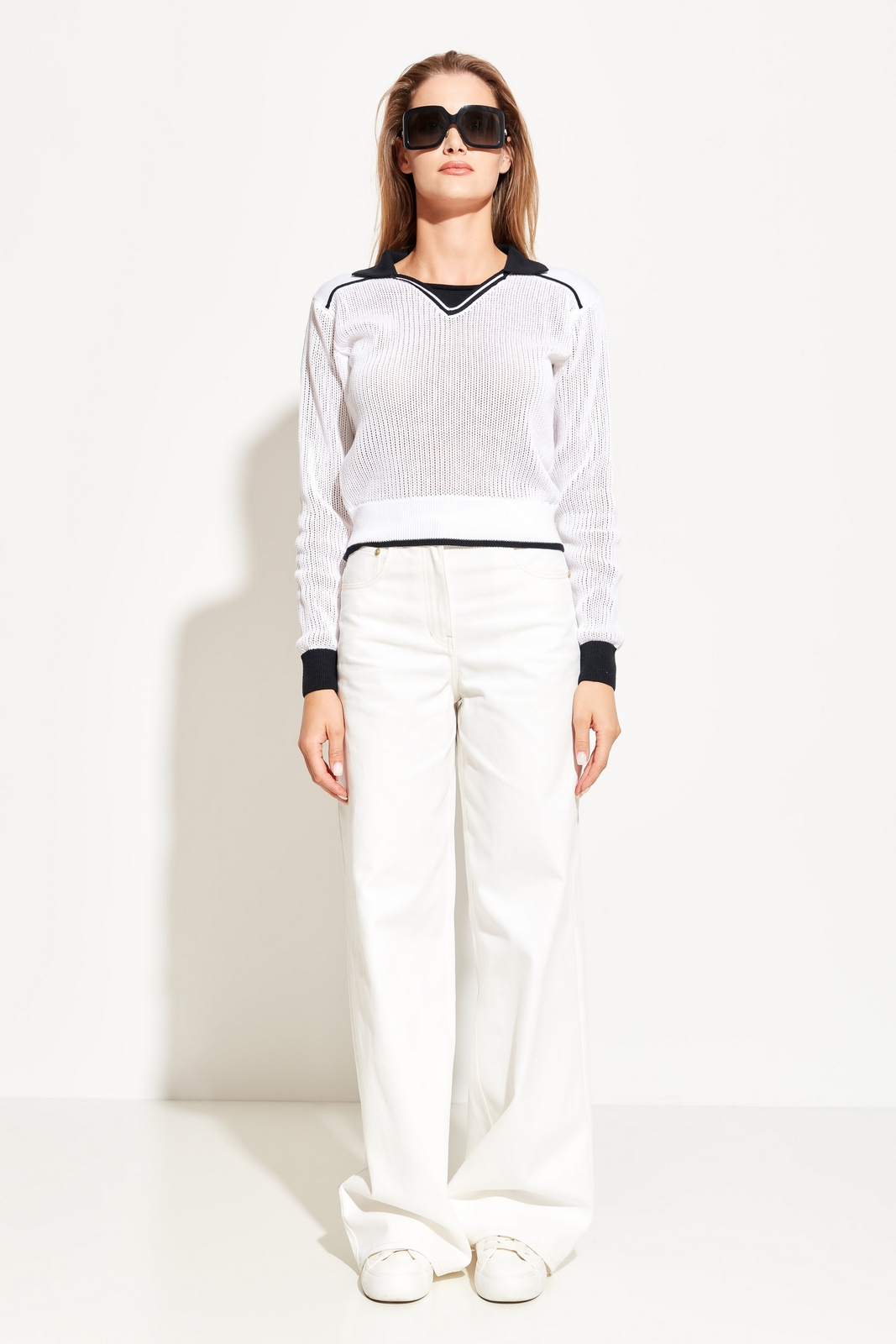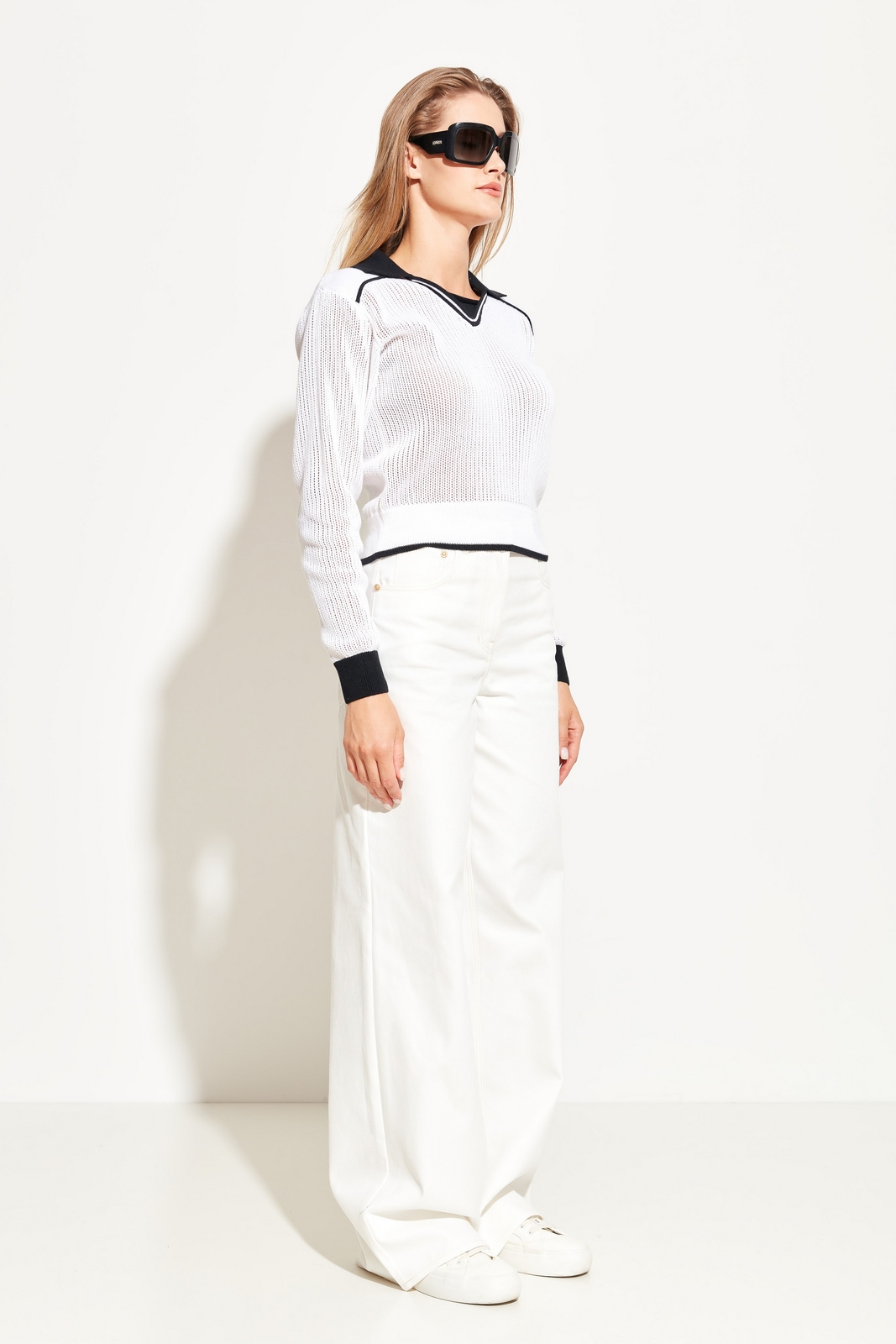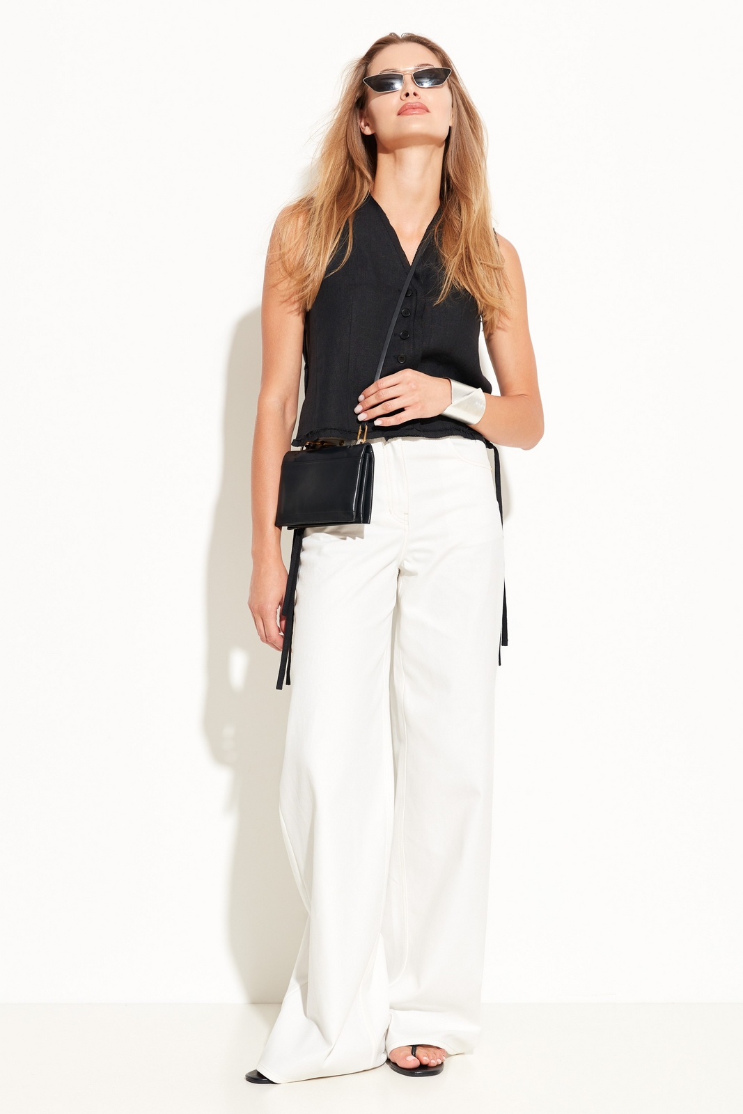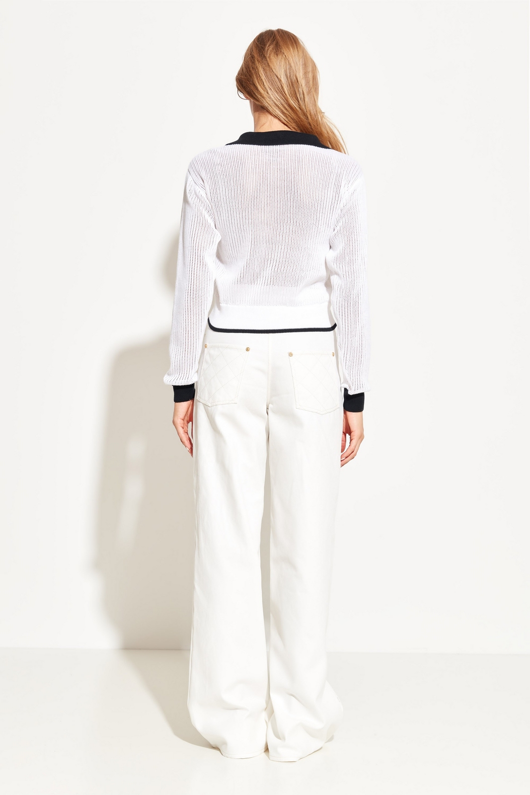 Джинсы полуприлегающего силуэта, расширенные от линии бедер к низу. Посадка изделия средняя. Сзади накладные карманы, декорированные строчкой "в ромб". Классическая ,универсальная модель, которая идеально подойдет для создания стильных летних аутфитов.