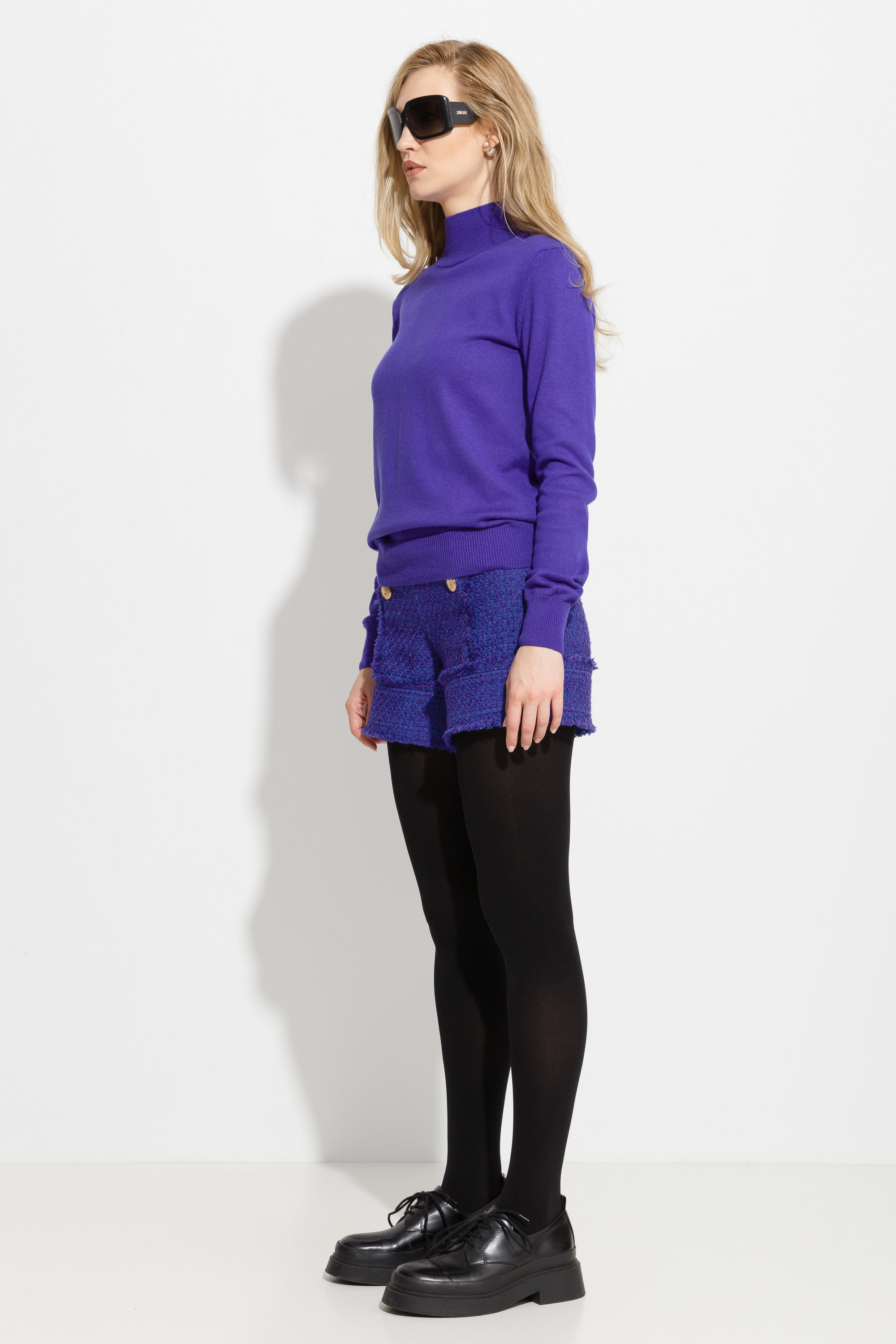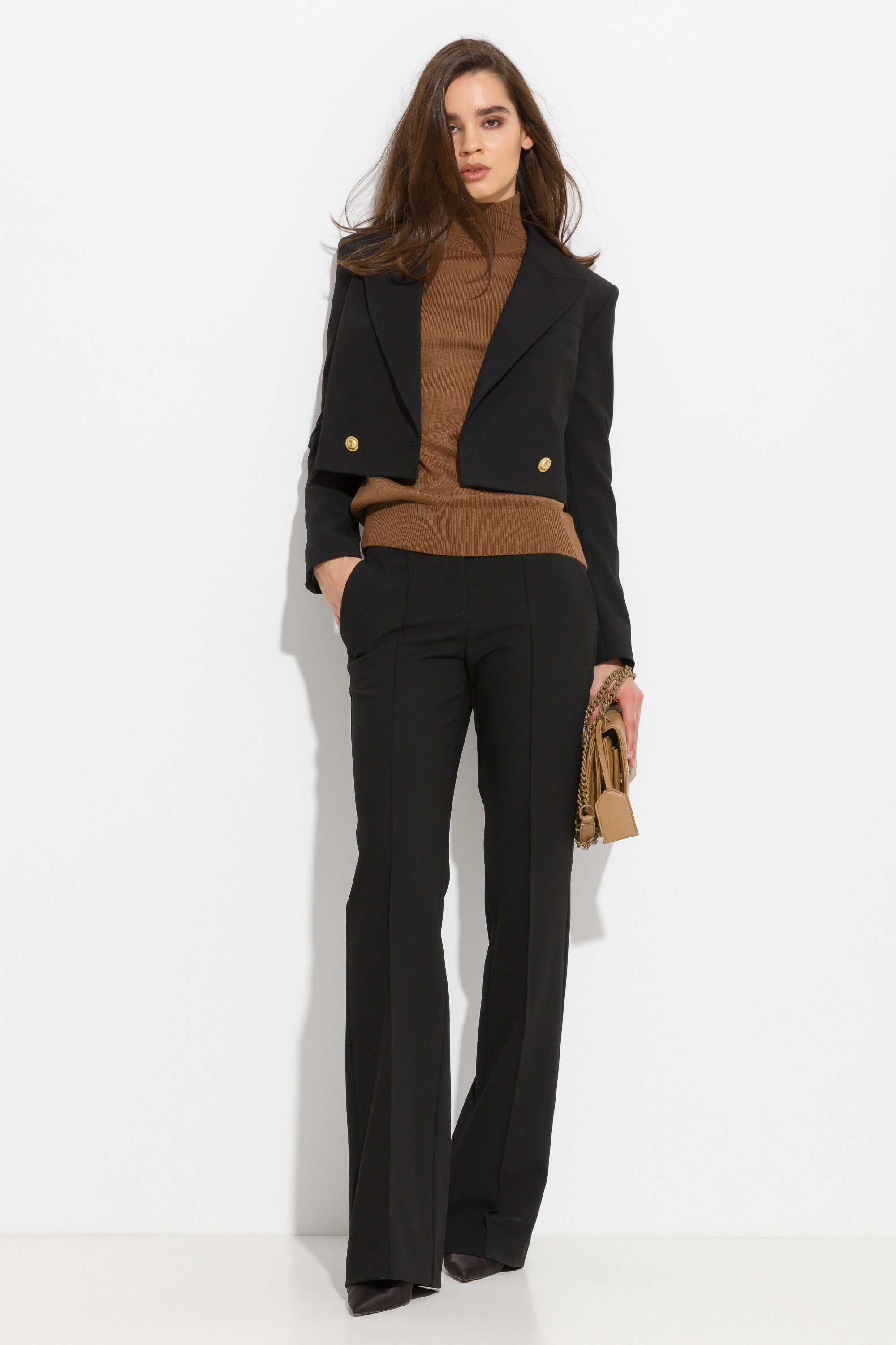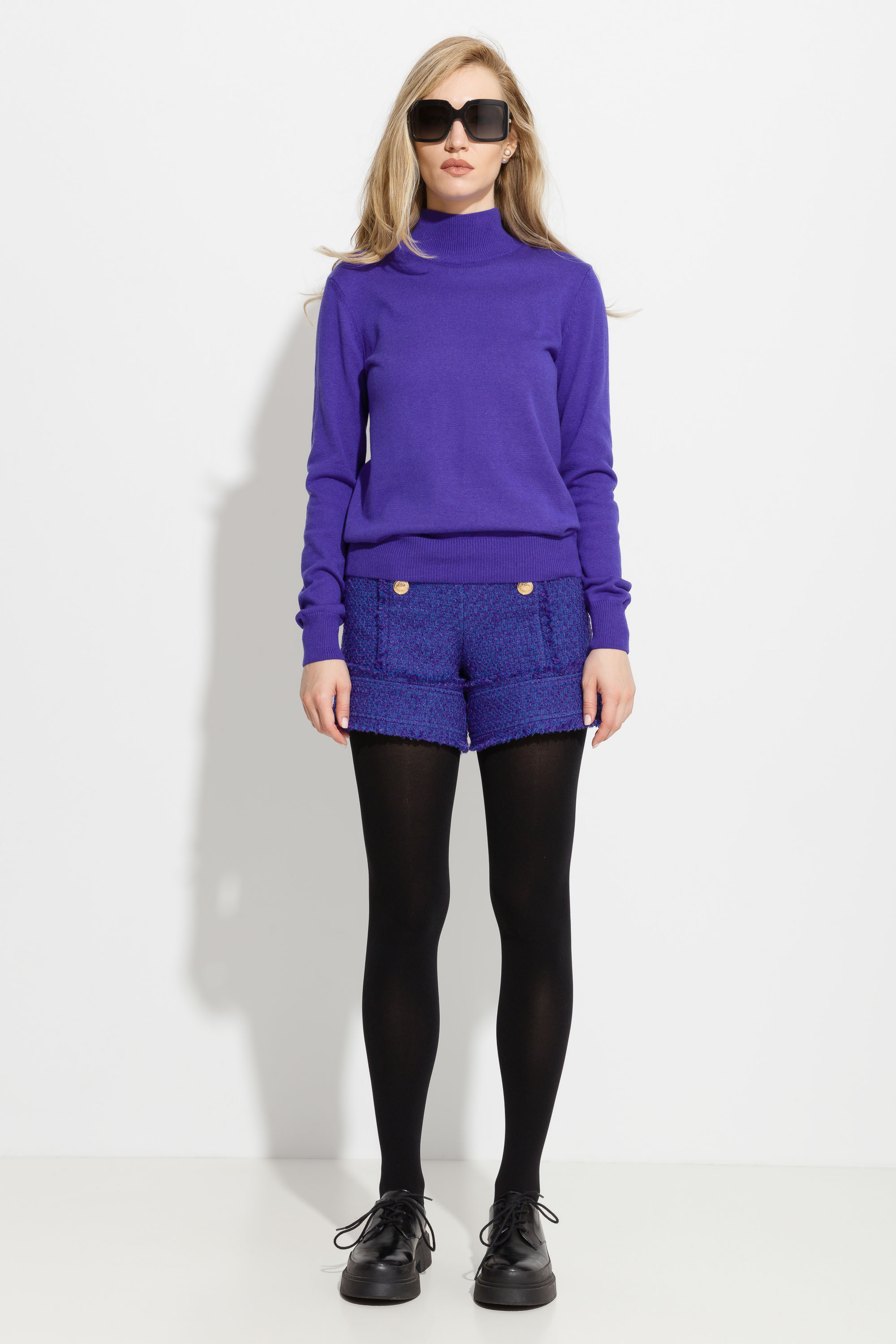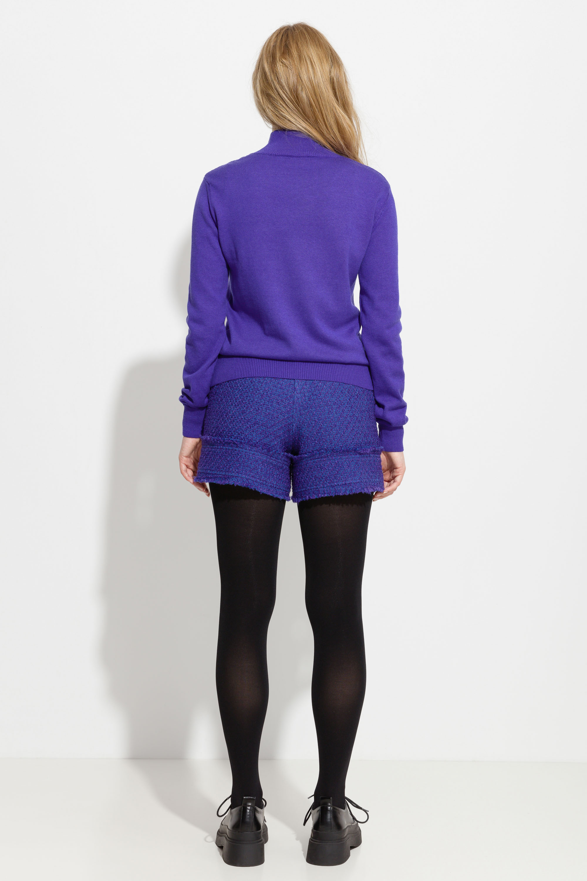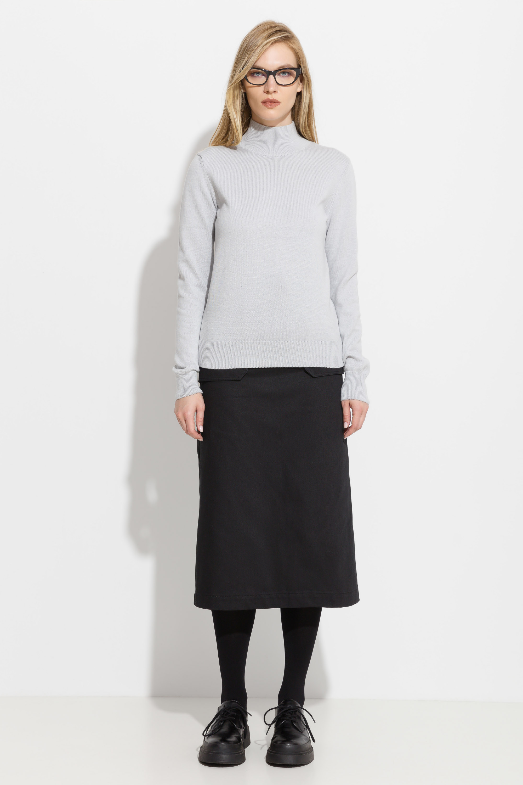Джемпер вязаный полуприлегающего силуэта, длиной выше линии бедер. Высокая горловина. Рукава и низ изделия на широких манжетах. Базовая модель, которая подойдет к любому типу гардероба.