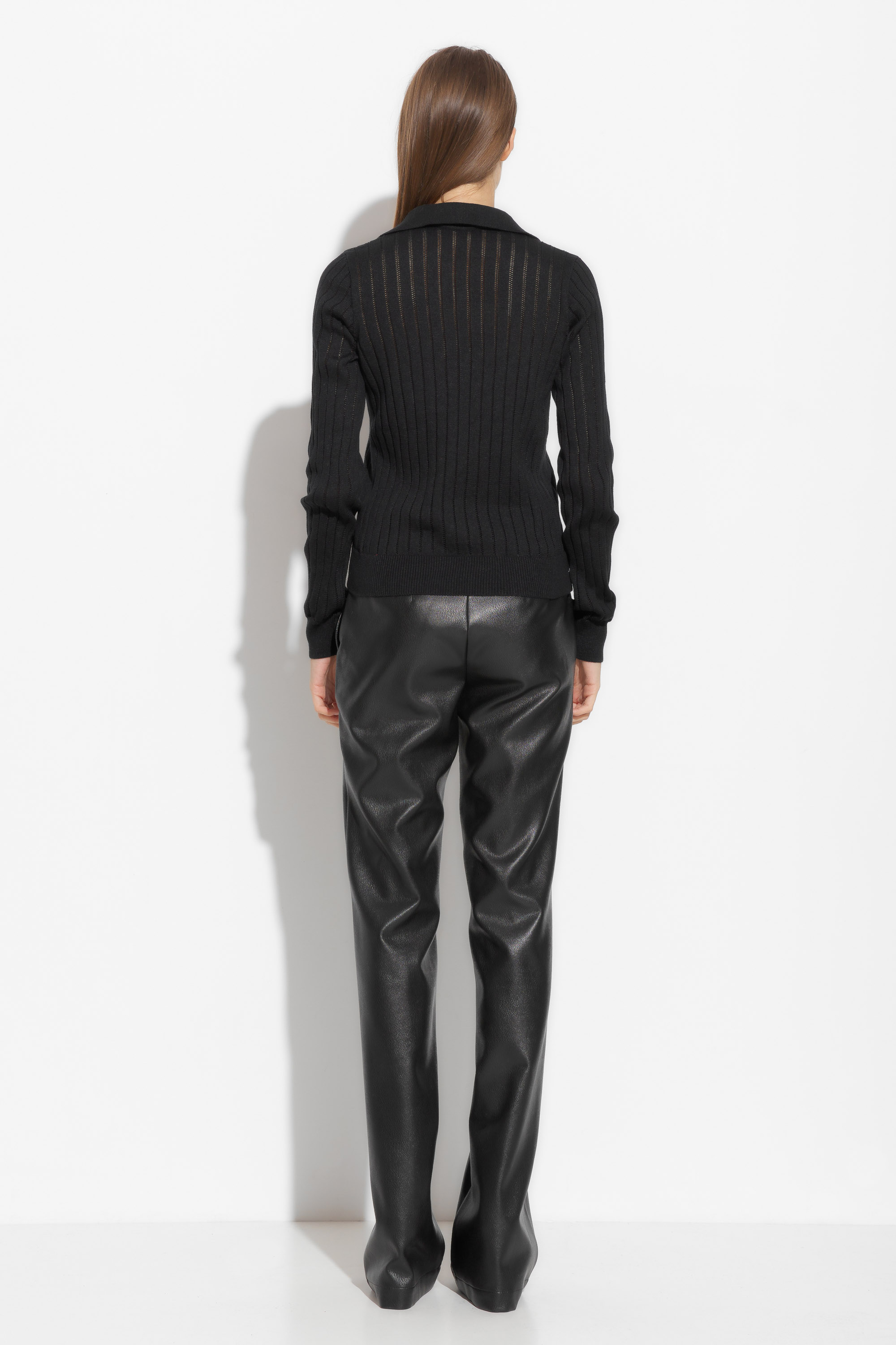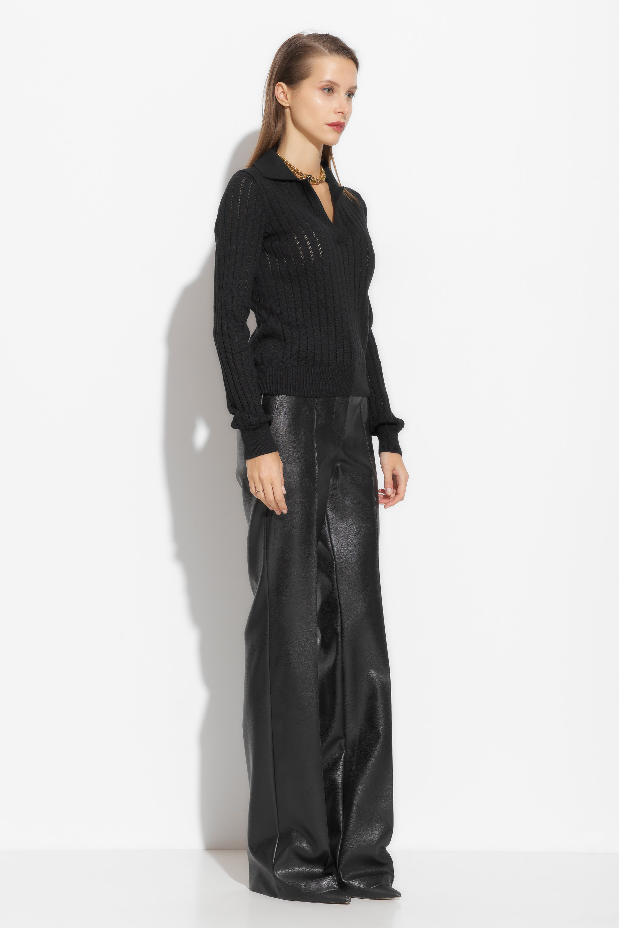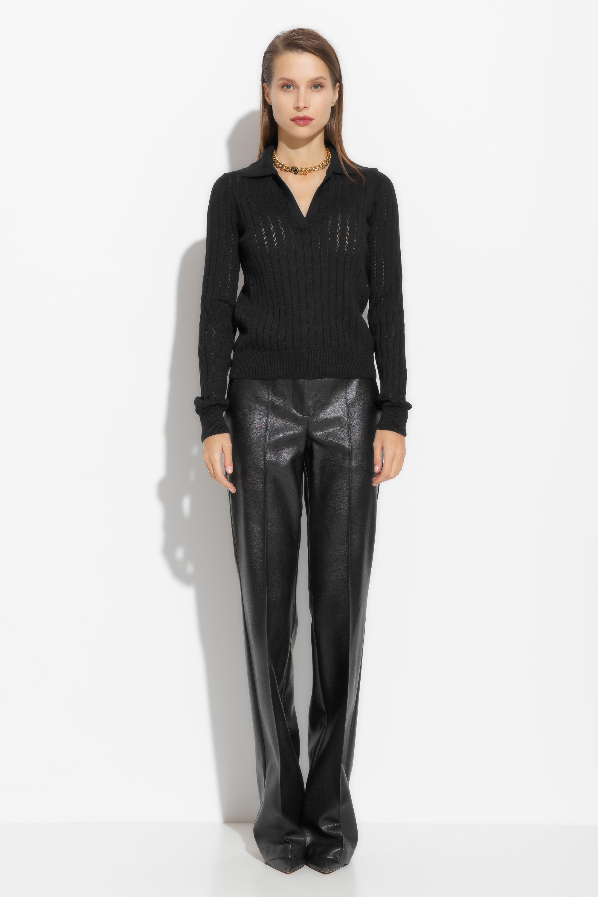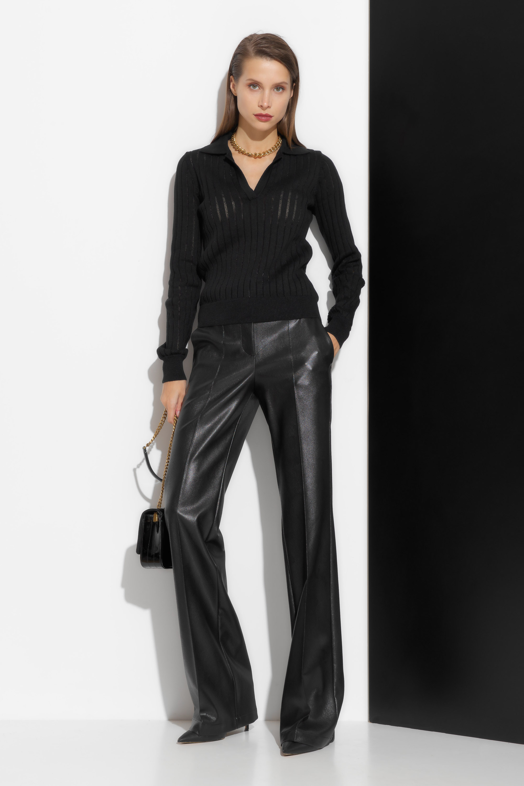Джемпер полуприлегающего силуэта, длиной выше линии бедер. V-образный вырез горловины. Воротник отложной. Полупрозрачная вязка добавляет образу легкости. Универсальная модель, которая подойдет к любому типу гардероба.