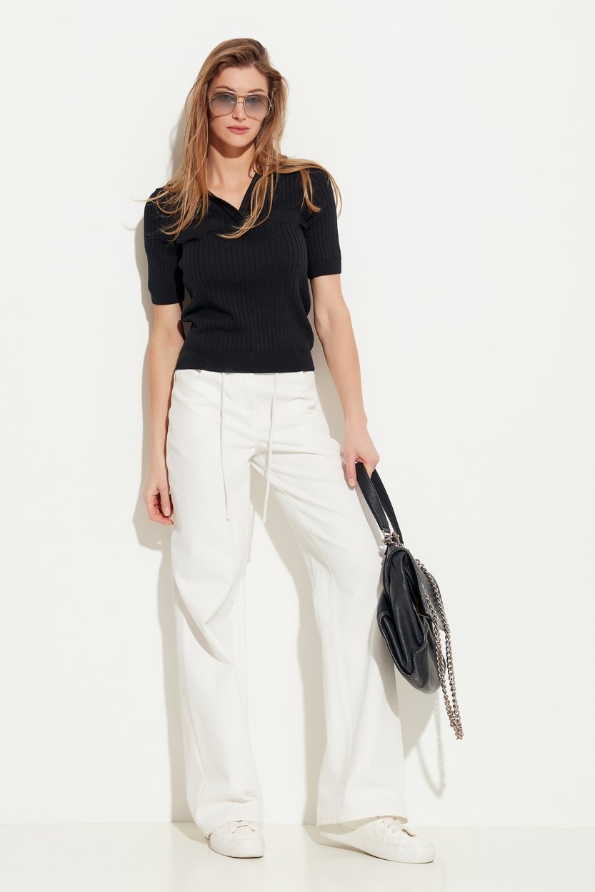 Состав: 50% хлопок, 50% ПАН. Джемпер вязаный полуприлегающего силуэта, длиной выше линии бедер. Воротник отложной. V-образный вырез горловины. Рукава короткие, на широких манжетах. Комфортная, базовая модель, которая подойдет к любому типу гардероба. Идеально сочетается как с брюками и джинсами, так с юбками и шортами.