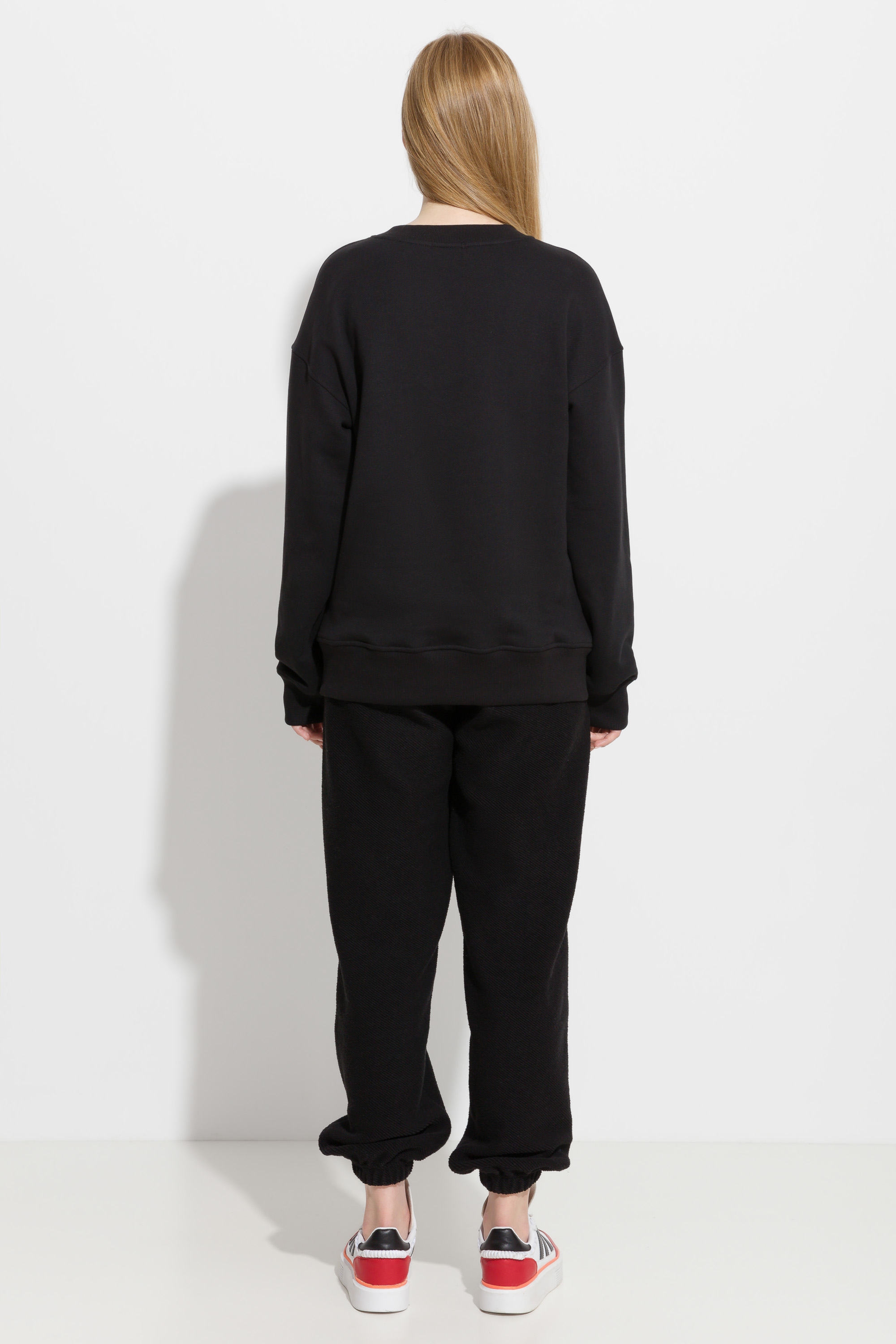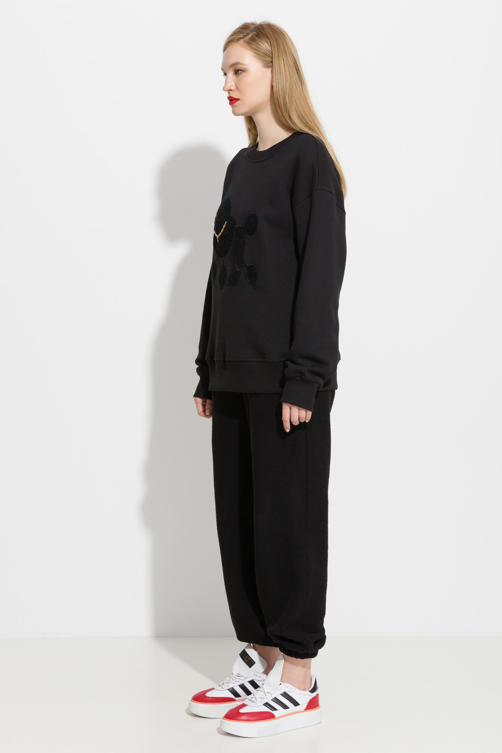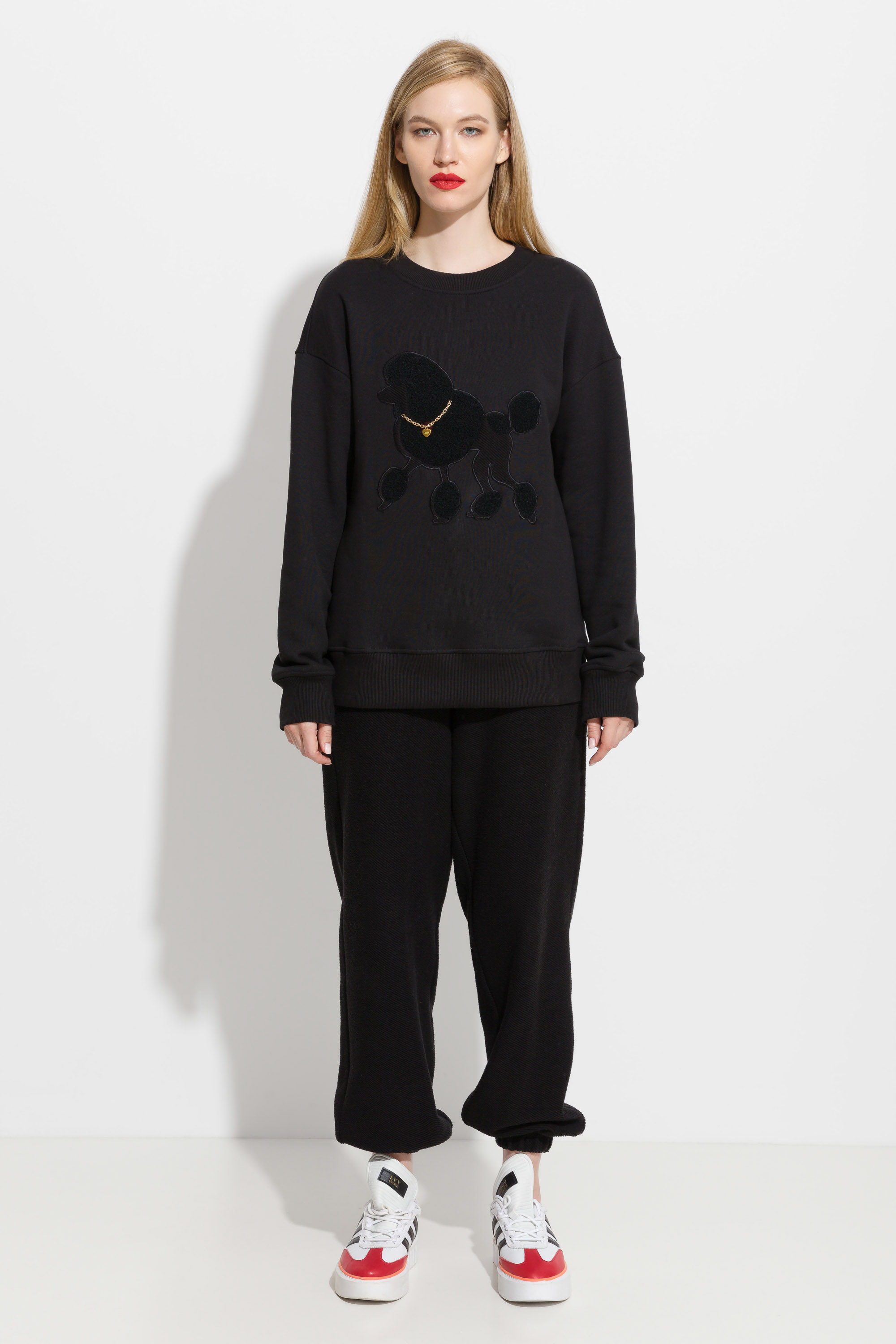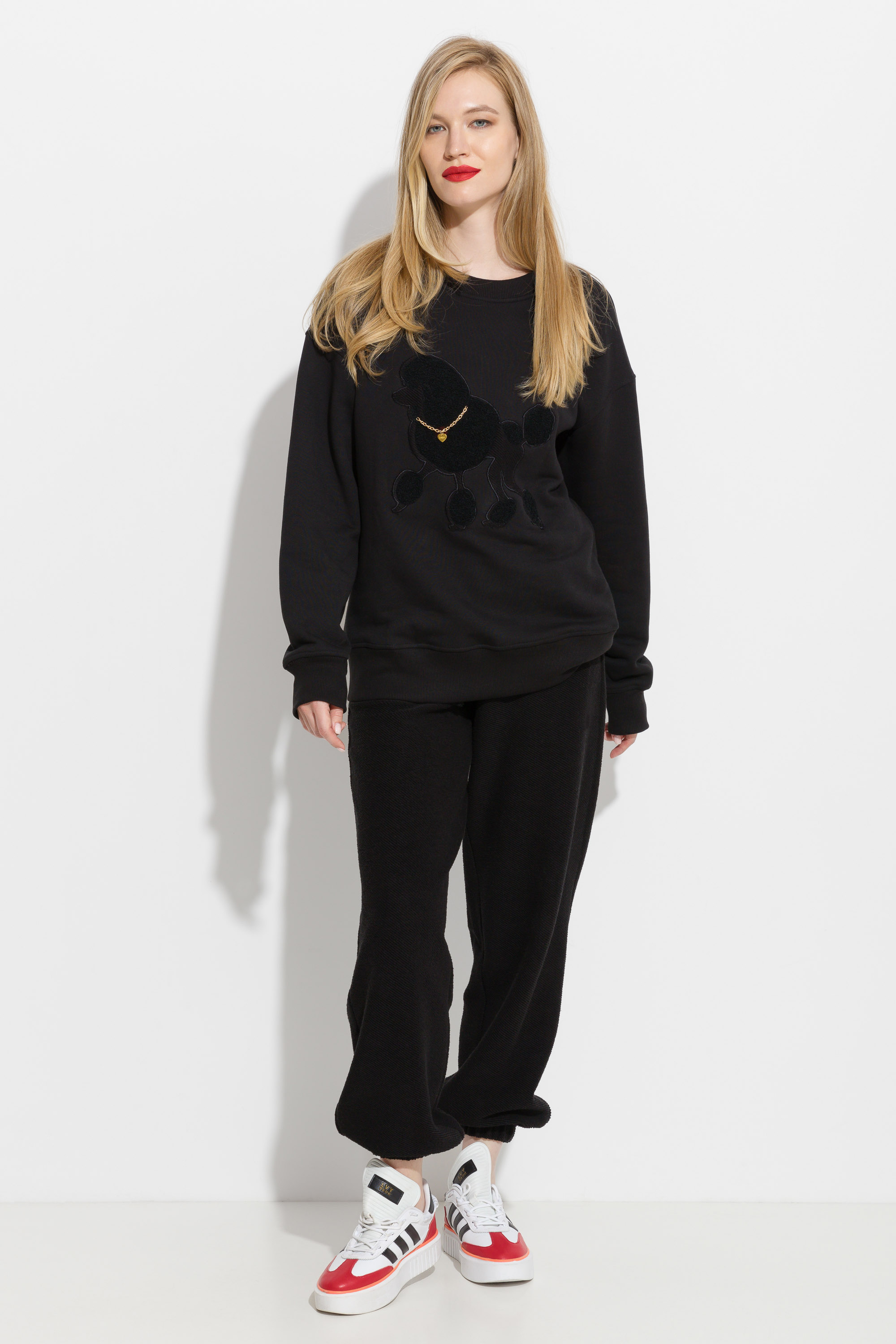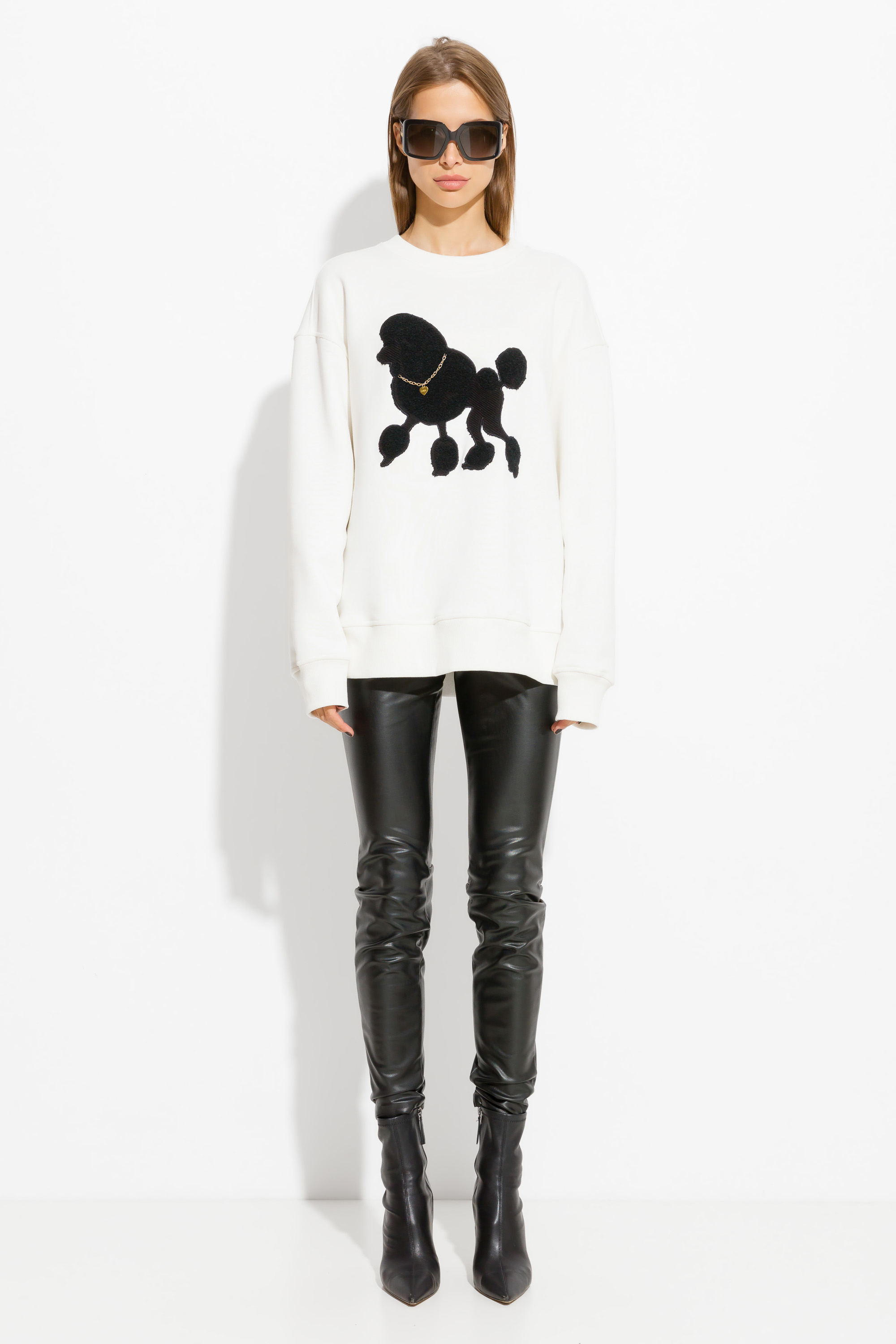Свитшот свободного кроя, длиной ниже линии бедер. Круглый вырез горловины. Линия плеча спущена. Рукава и низ изделия на широких манжетах. Перед изделия декорирован вышивкой в виде собаки (пуделя). Комфортная, стильная модель для создания ежедневных образов.