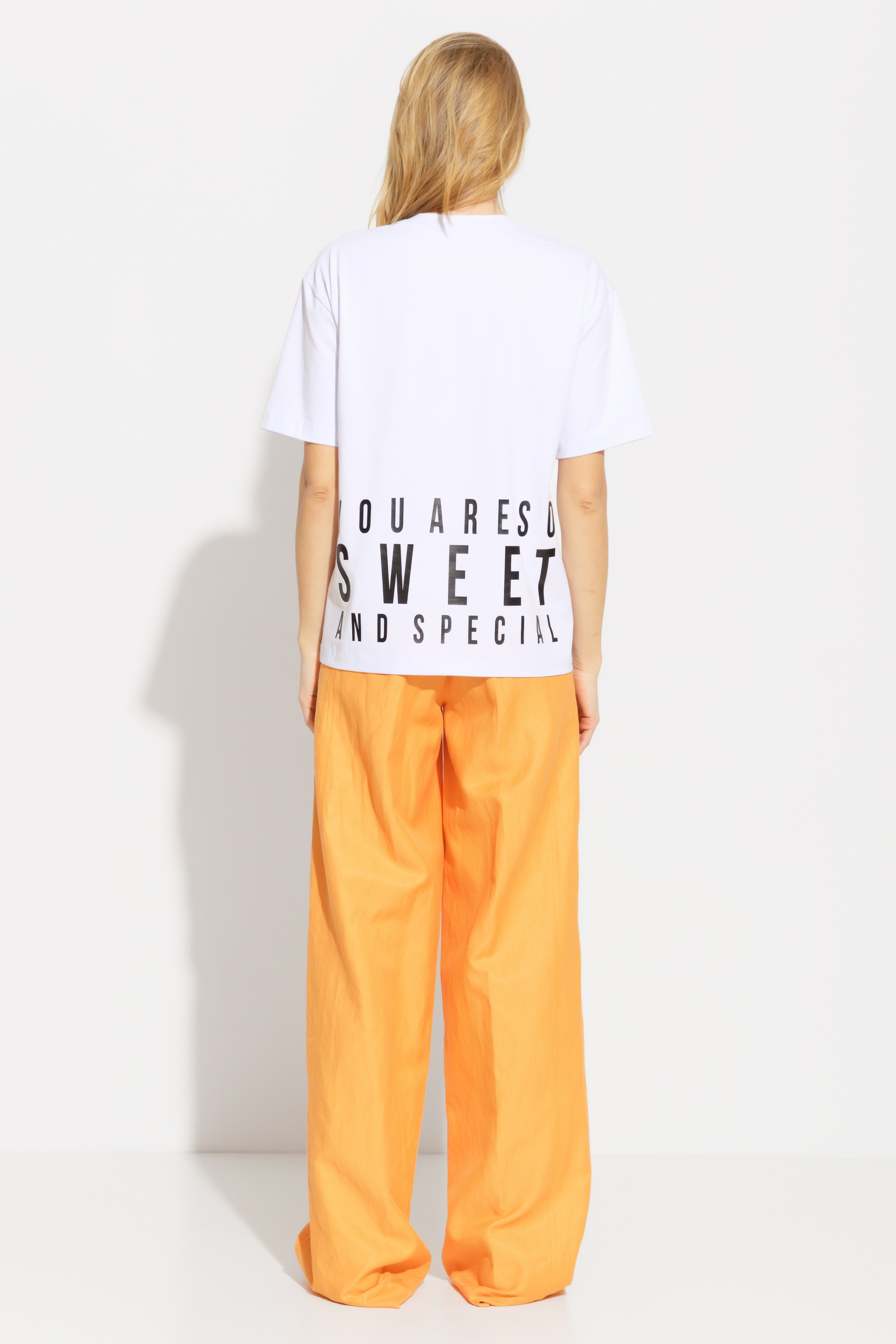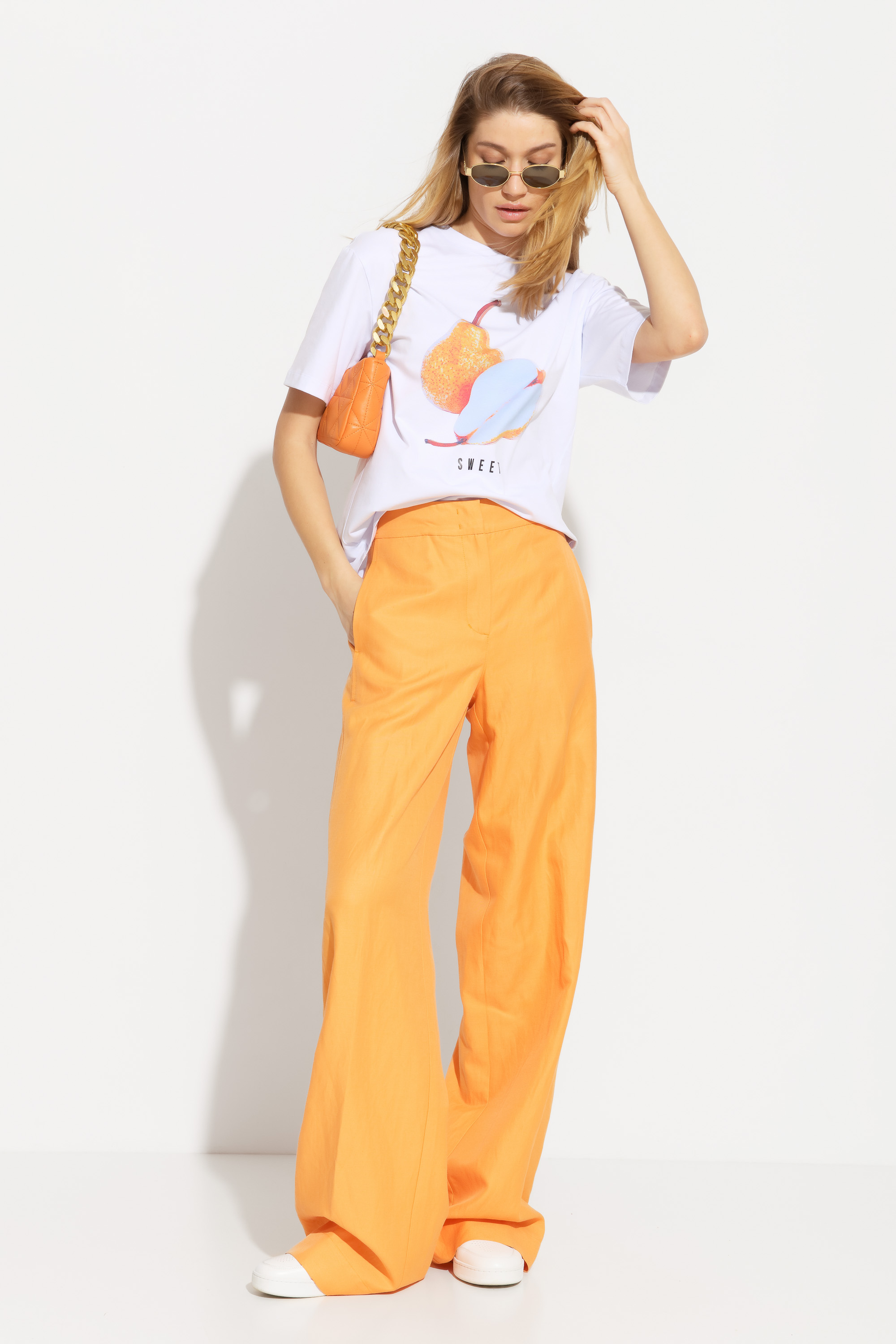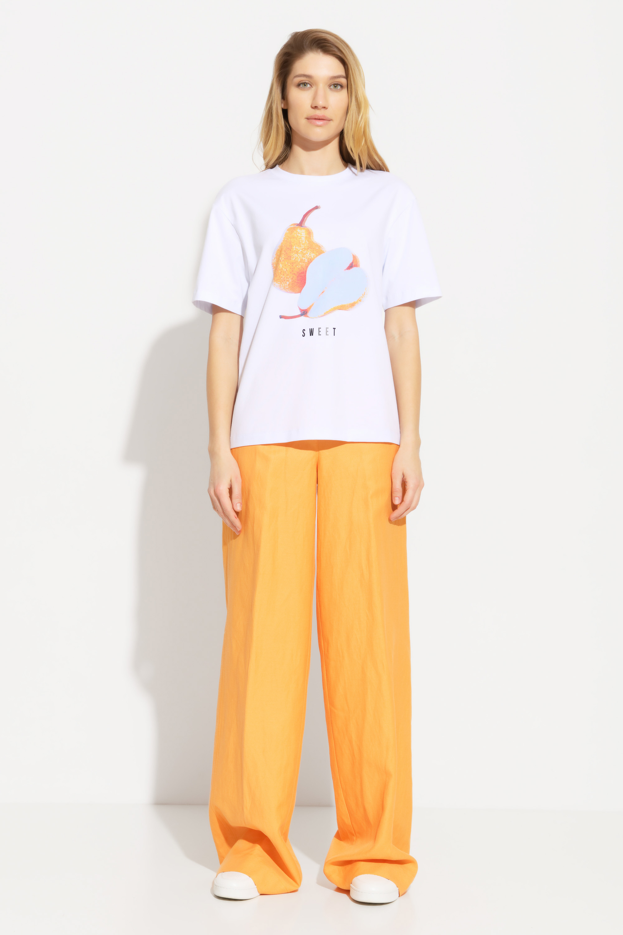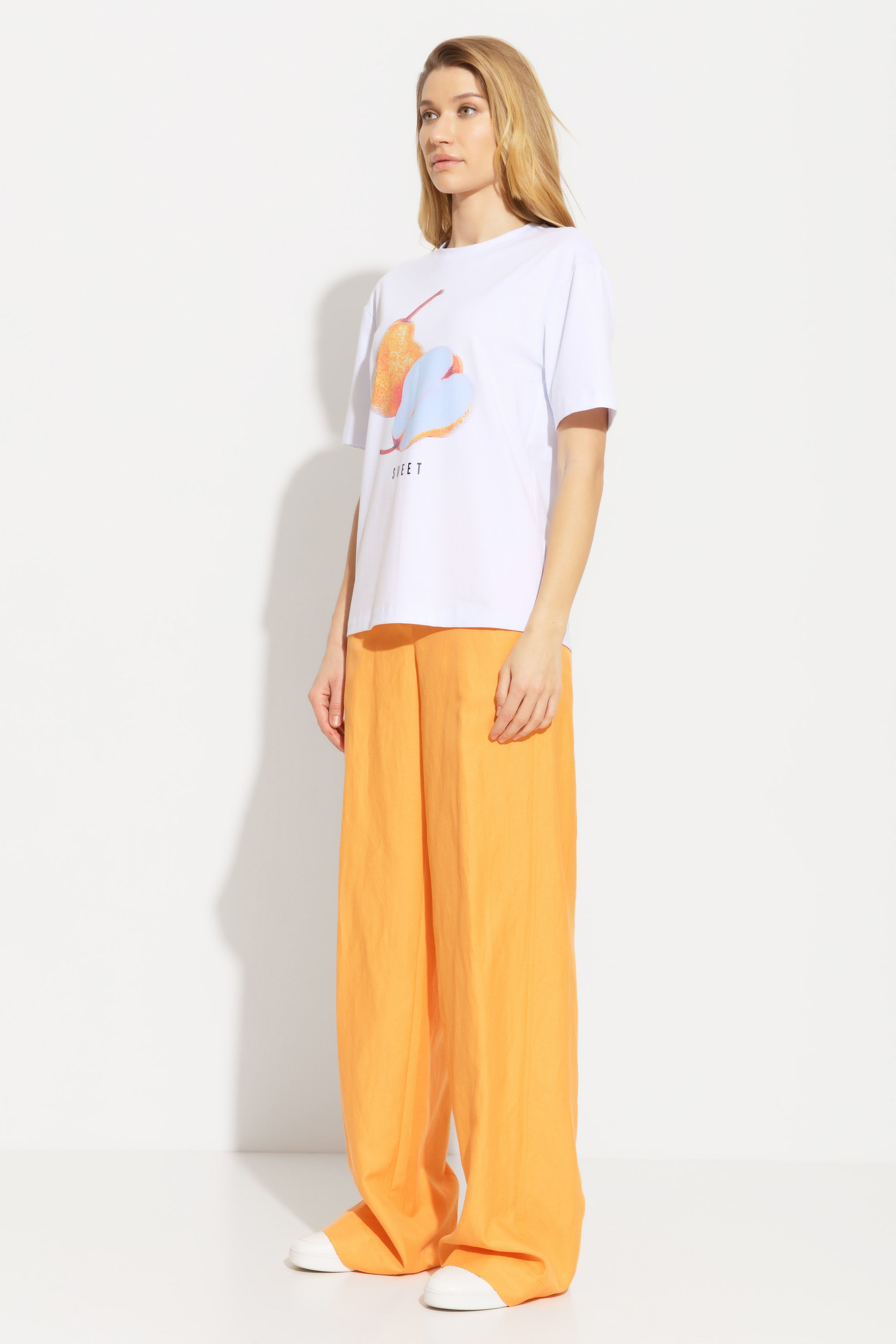 Футболка прямого кроя, длиной до середины линии бедер. Округлый вырез горловины. Линия плеч спущена, что обеспечивает легкость и комфорт при носке. Перед футболки декорирован ярким принтом, что добавляет образу свежести и незаурядности. Эта футболка - настоящая находка для модниц, которые ценят комфорт и стиль.