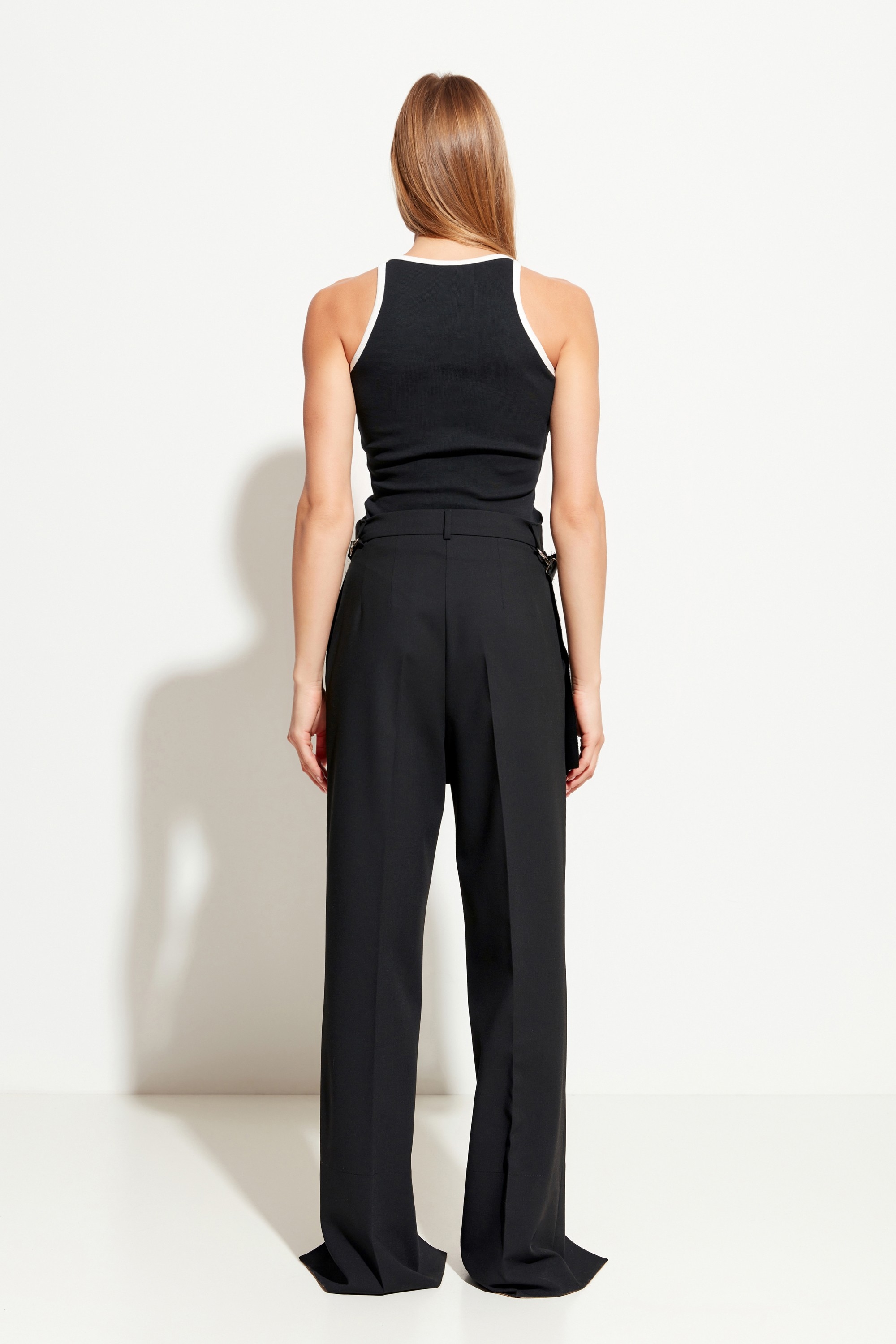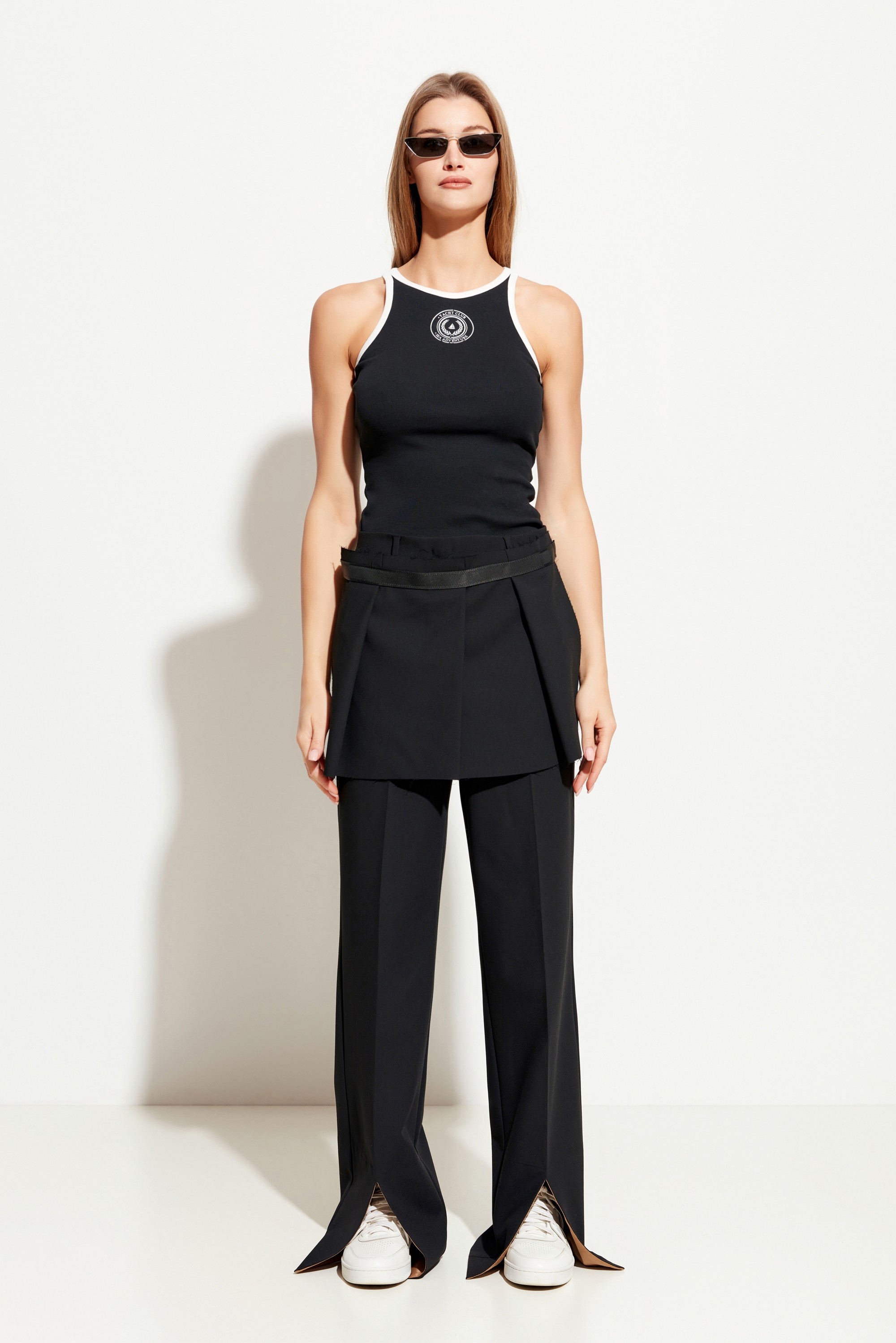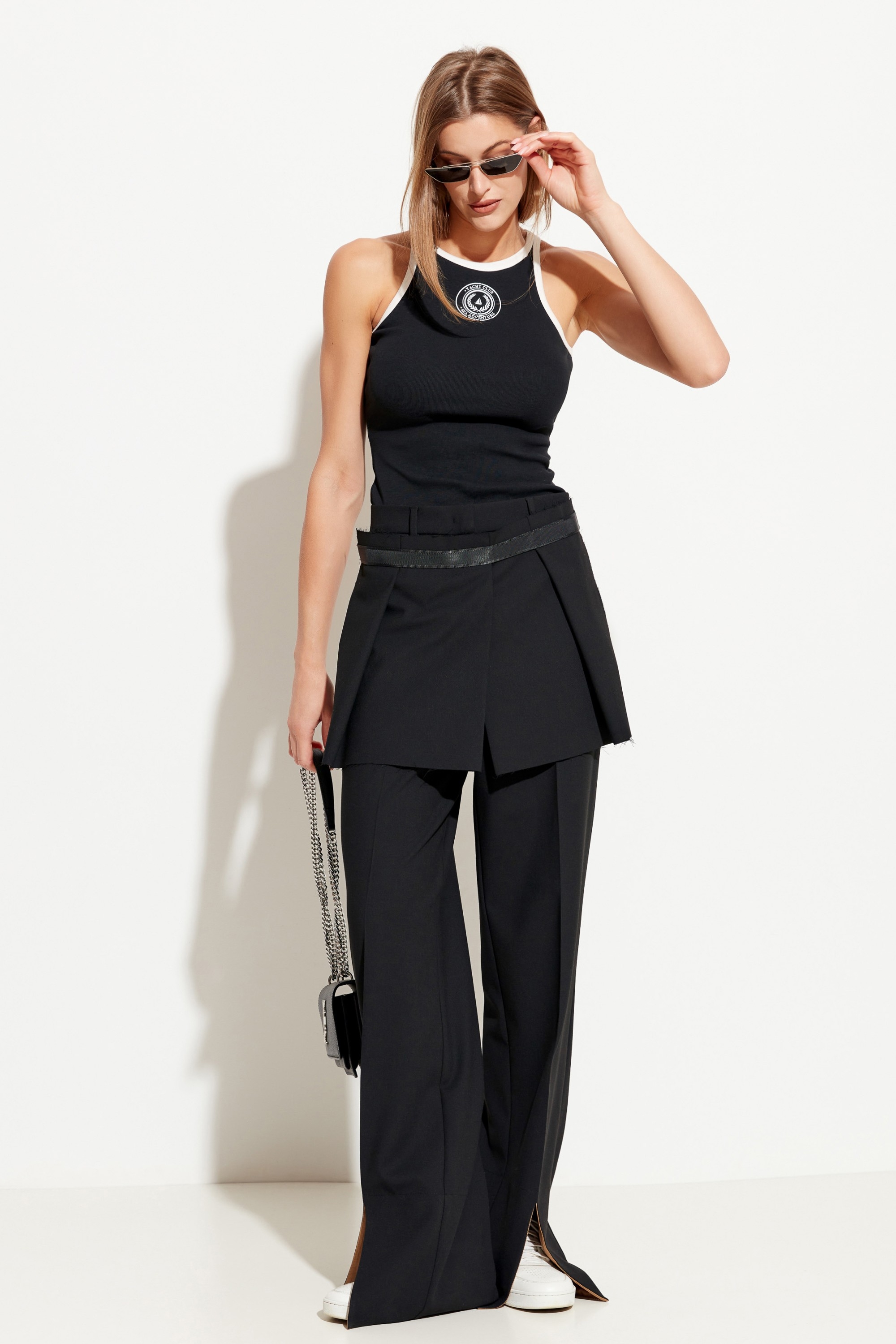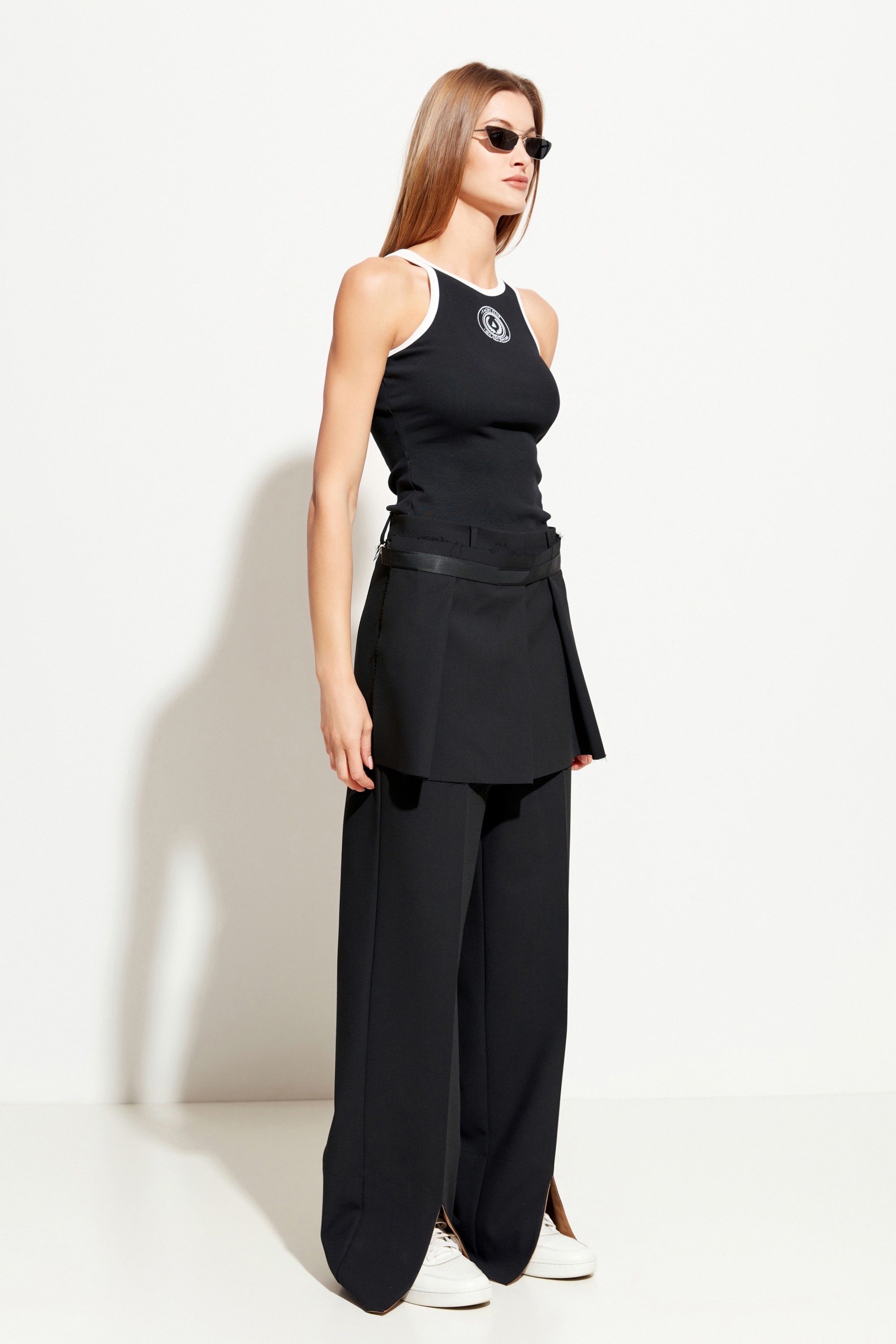 Майка прилегающего силуэта, на широких бретелях. Вырез горловины округлый. Передняя часть декорирована принтом. Универсальная, базовая модель, которая подойдет к любому образу.