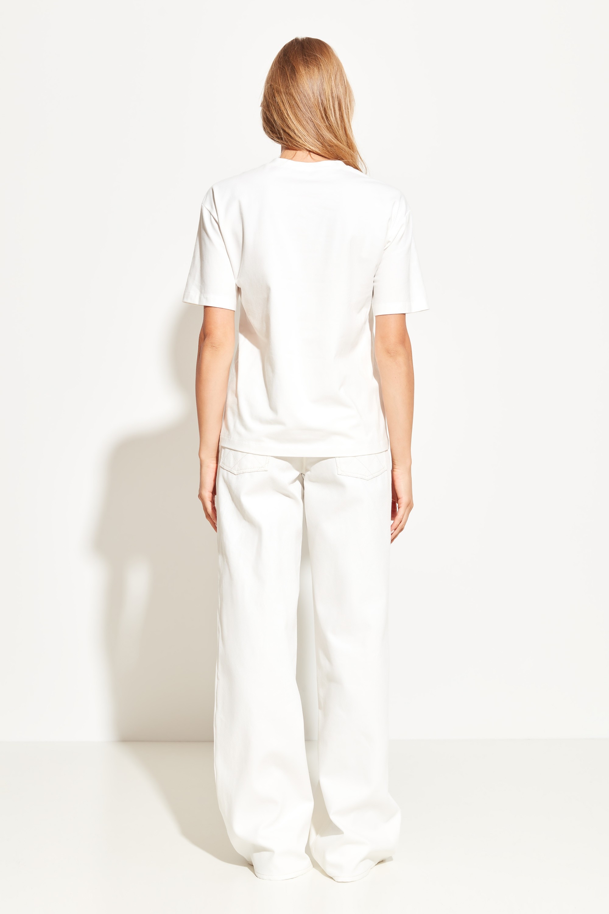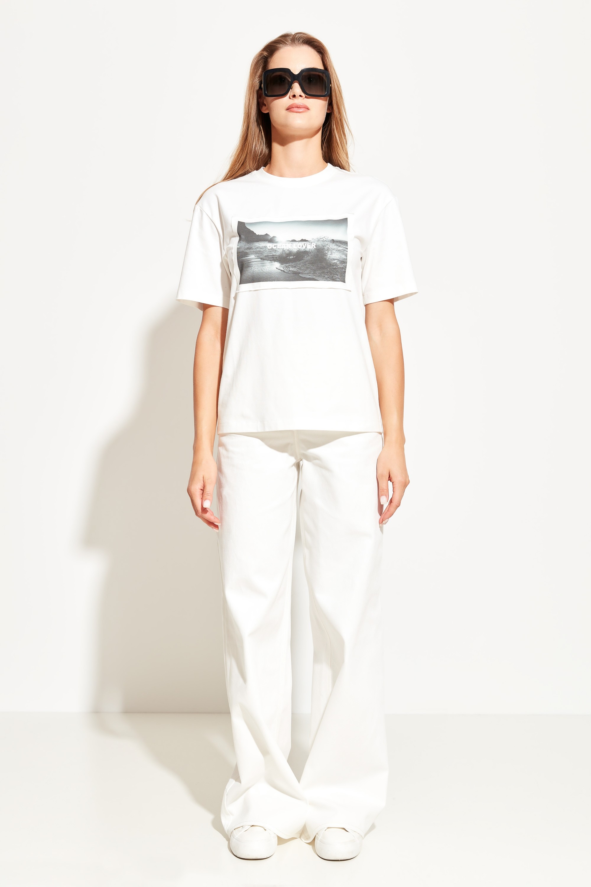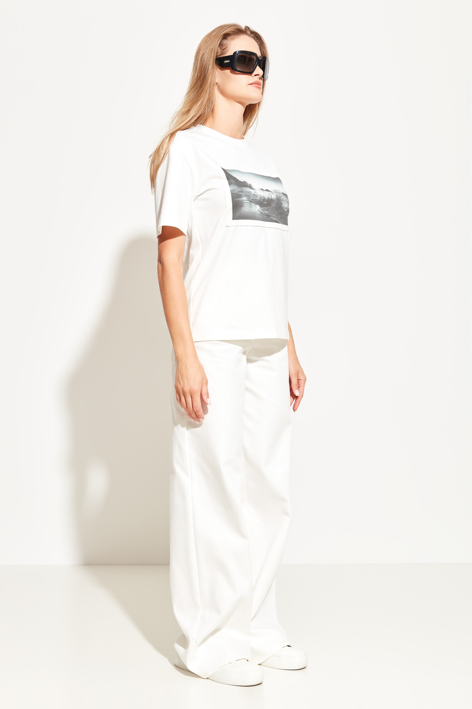 Футболка прямого кроя, длиной до середины линии бедер. Округлый вырез горловины. Линия плеч спущена. Перед дкорирован акцентым принтом. Базовая модель, которая подойдет к любому типу гардероба.