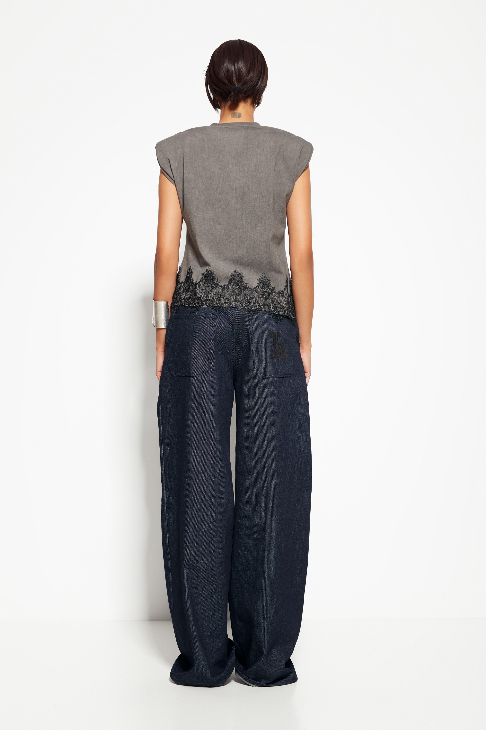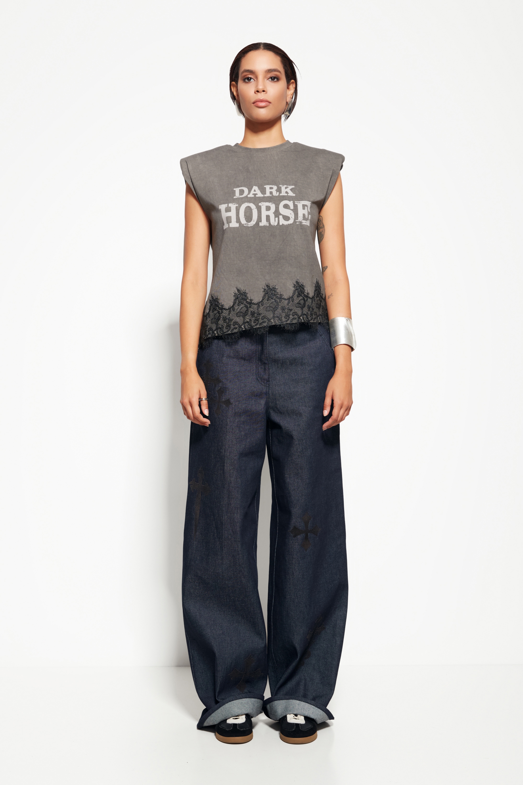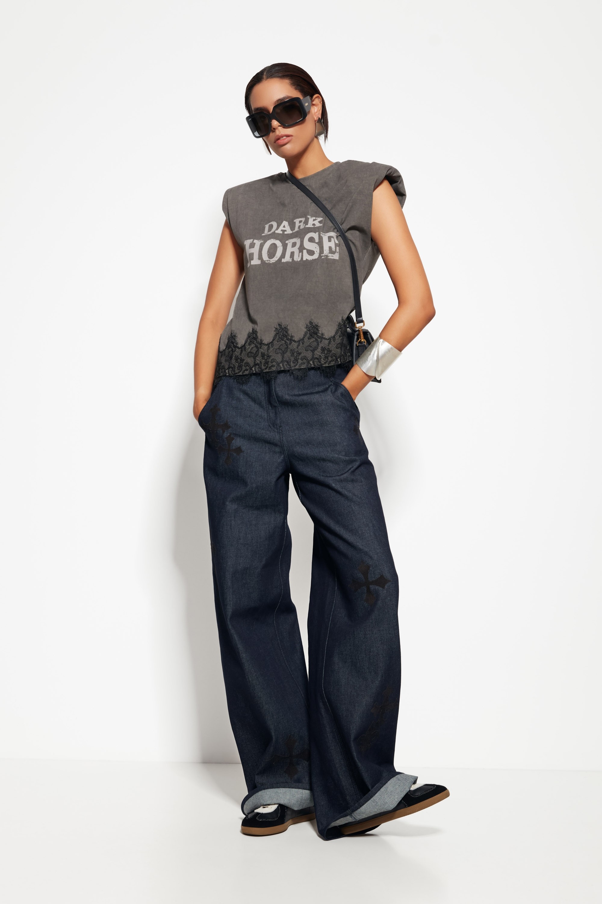 Декор: Подплечники, выразительный принт и кружевной декор по низу изделия, придающие джемперу оригинальность и стиль.