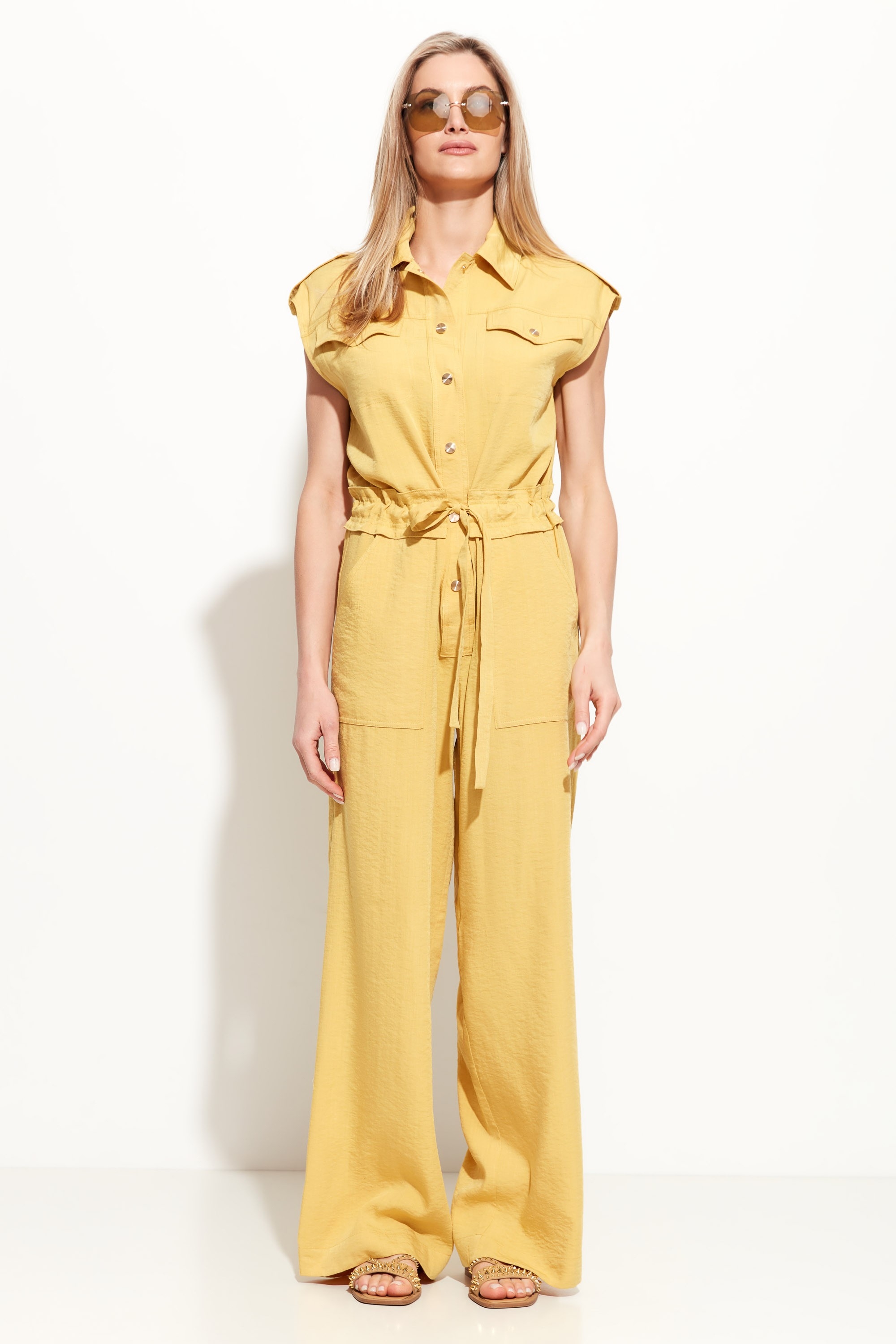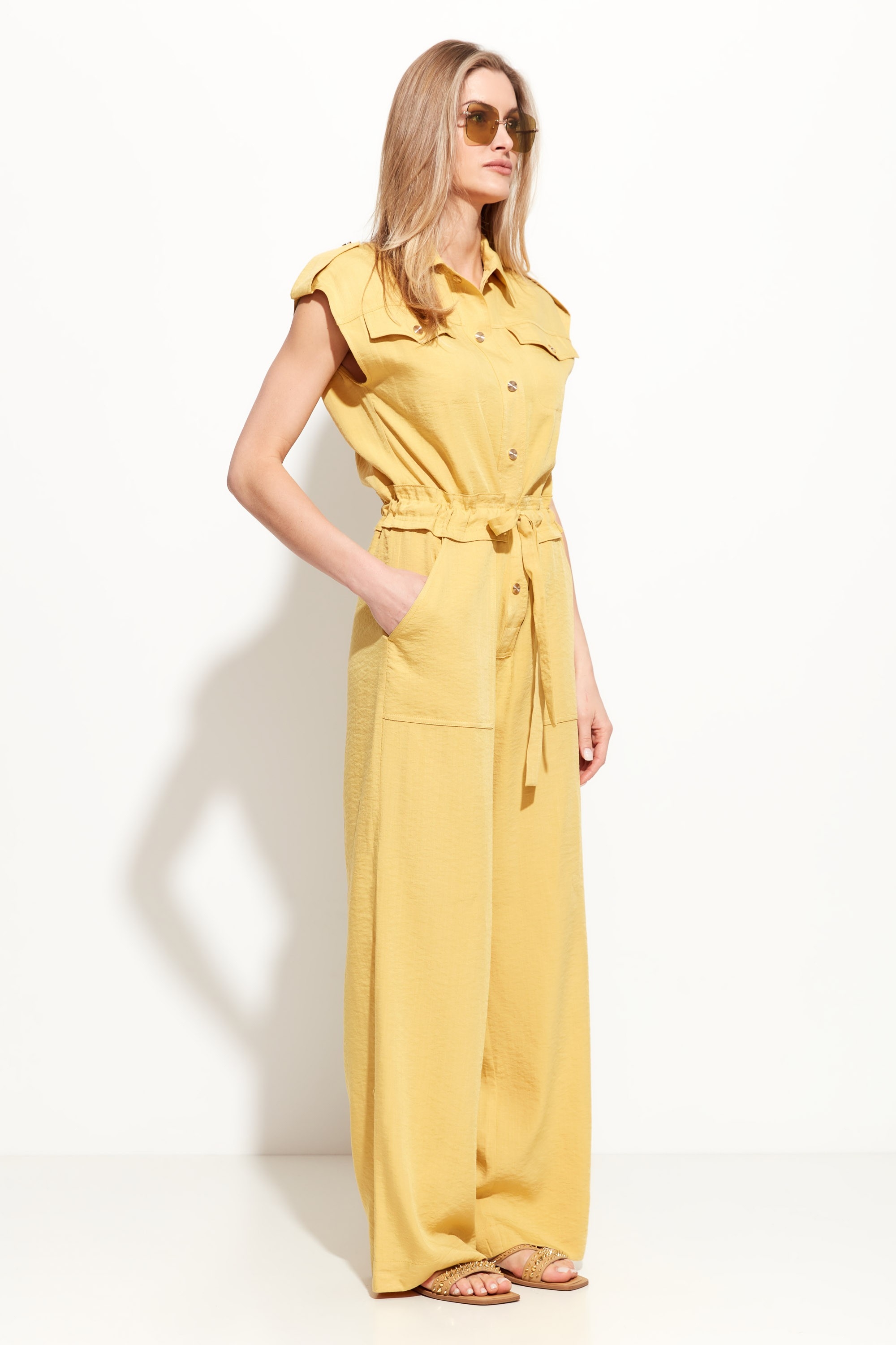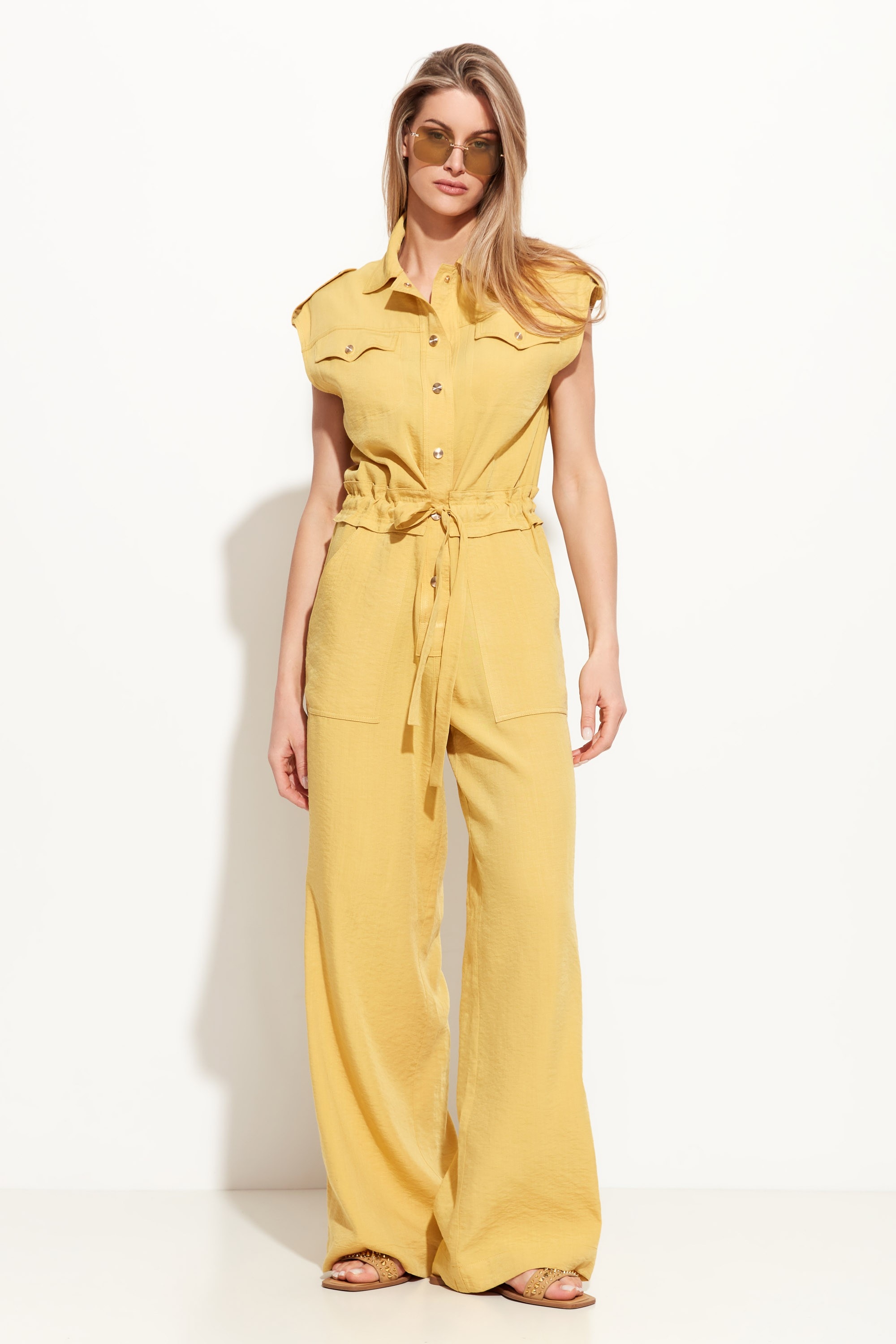 Комбинезон полуприлегающего силуэта с брюками. Воротник отложной. Линия плеч спущена. Объем талии регулируется при помощи пояса протянутого в кулиску. На груди накладные карманы с клапанами. На бедрах вместительные накладные карманы. Стильная модель, которая идеально подойдет для создания эффектных городских образов.