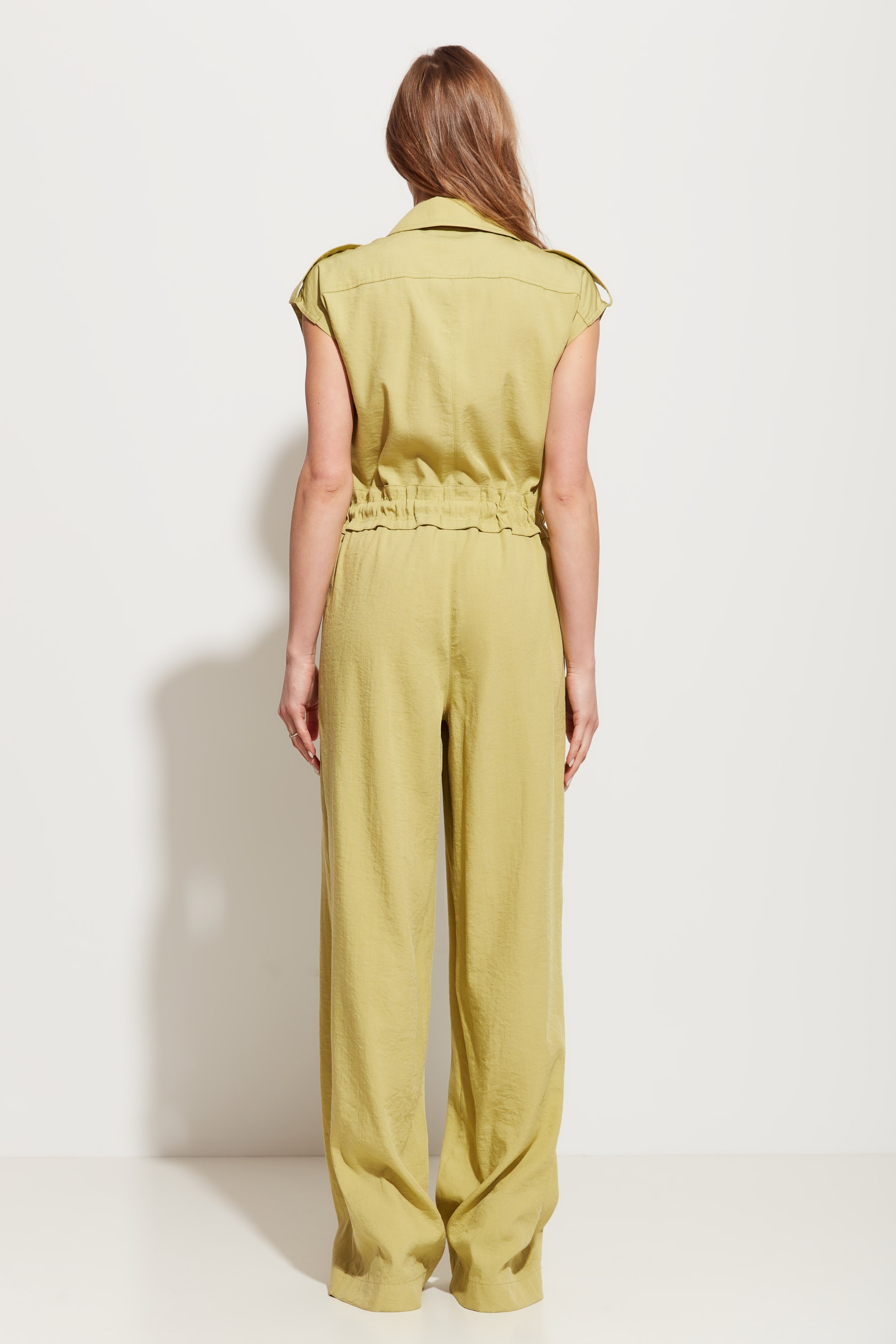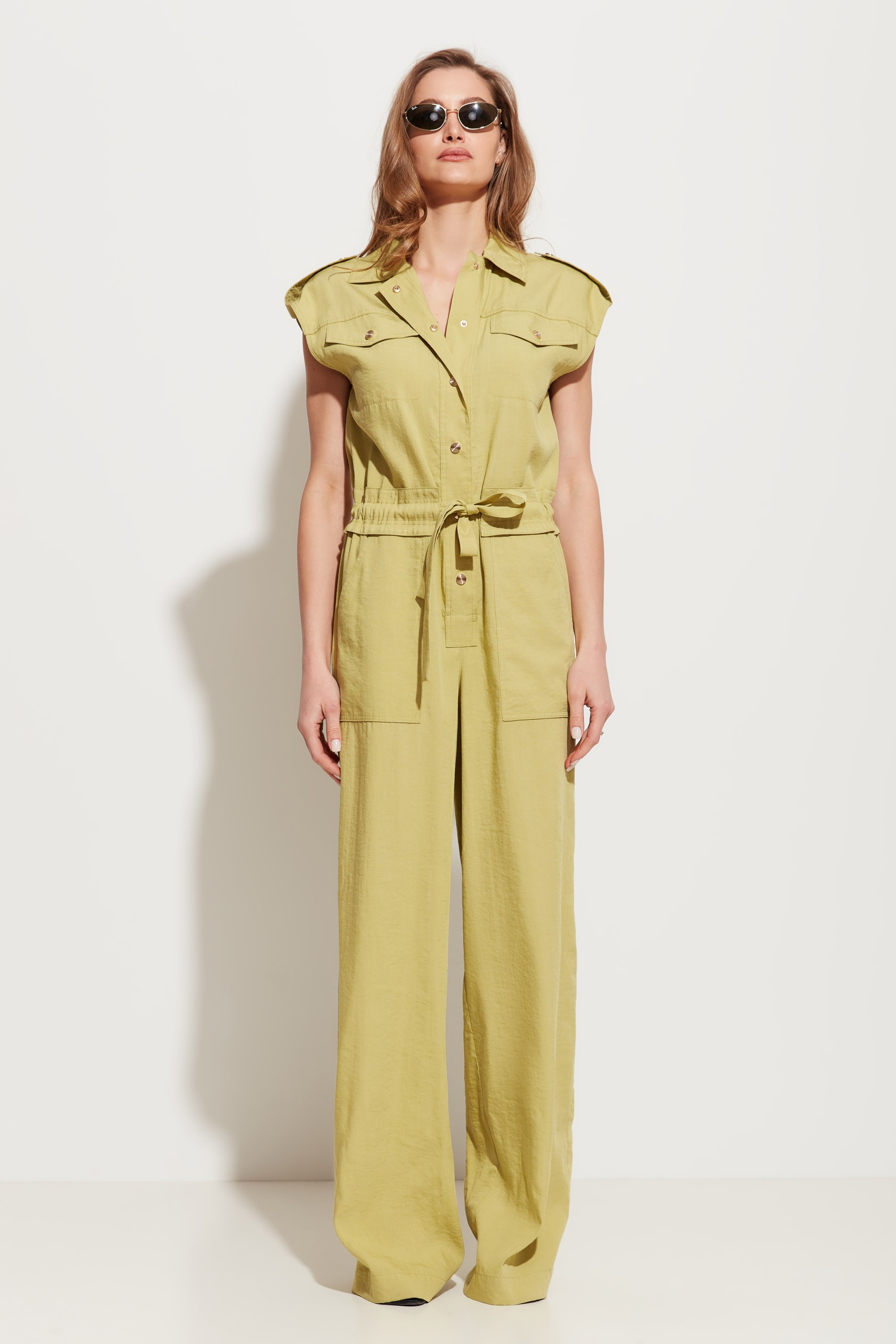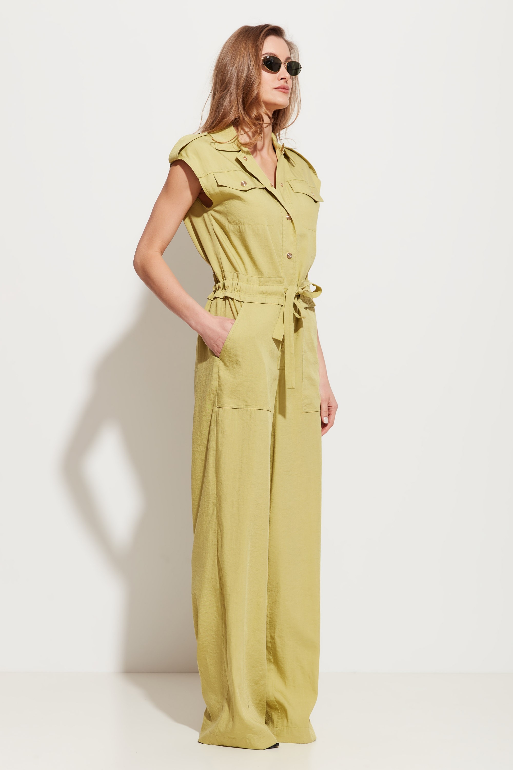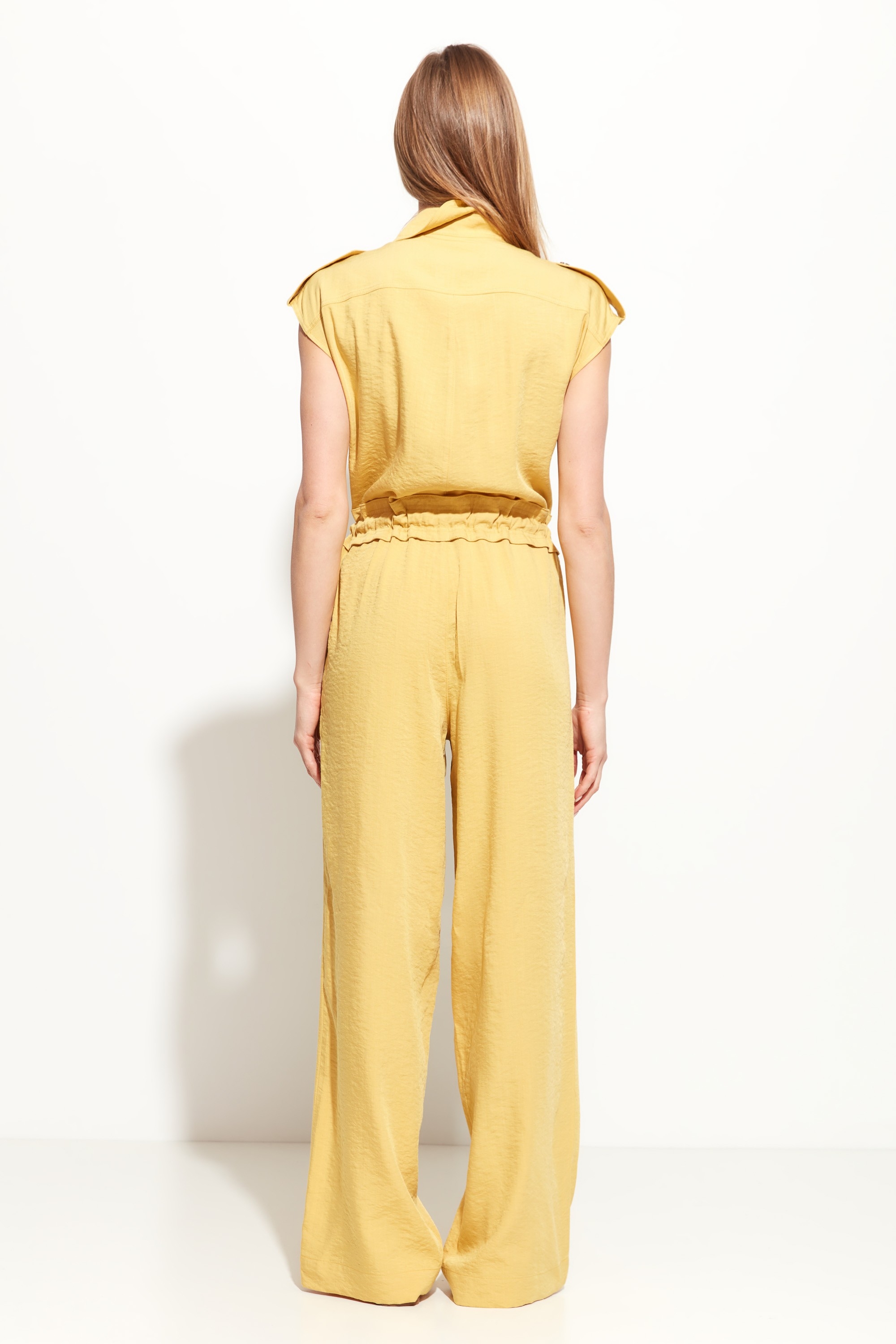 Комбинезон полуприлегающего силуэта с брюками. Воротник отложной. Линия плеч спущена. Объем талии регулируется при помощи пояса протянутого в кулиску. На груди накладные карманы с клапанами. На бедрах вместительные накладные карманы. Стильная модель, которая идеально подойдет для создания эффектных городских образов.