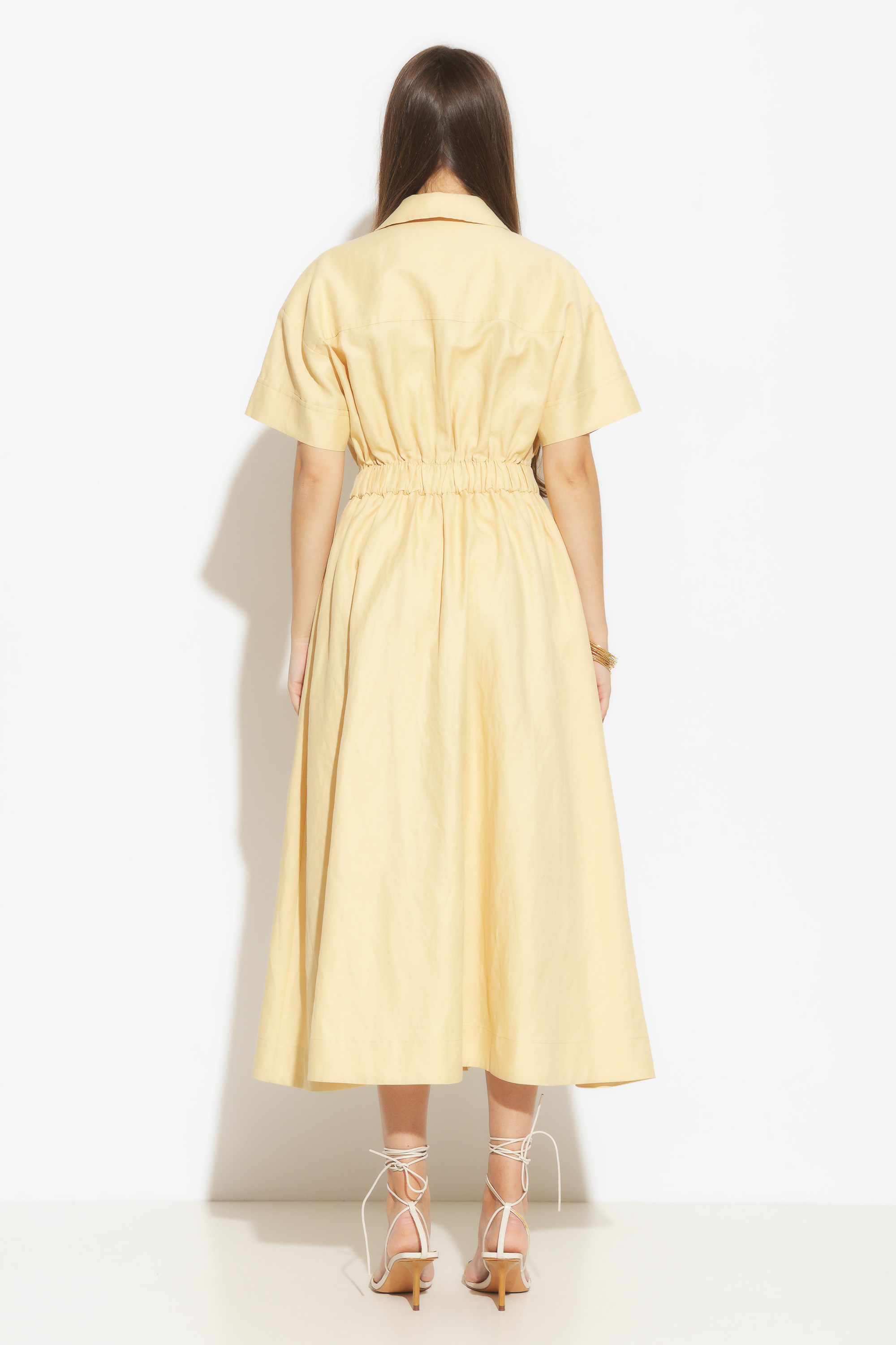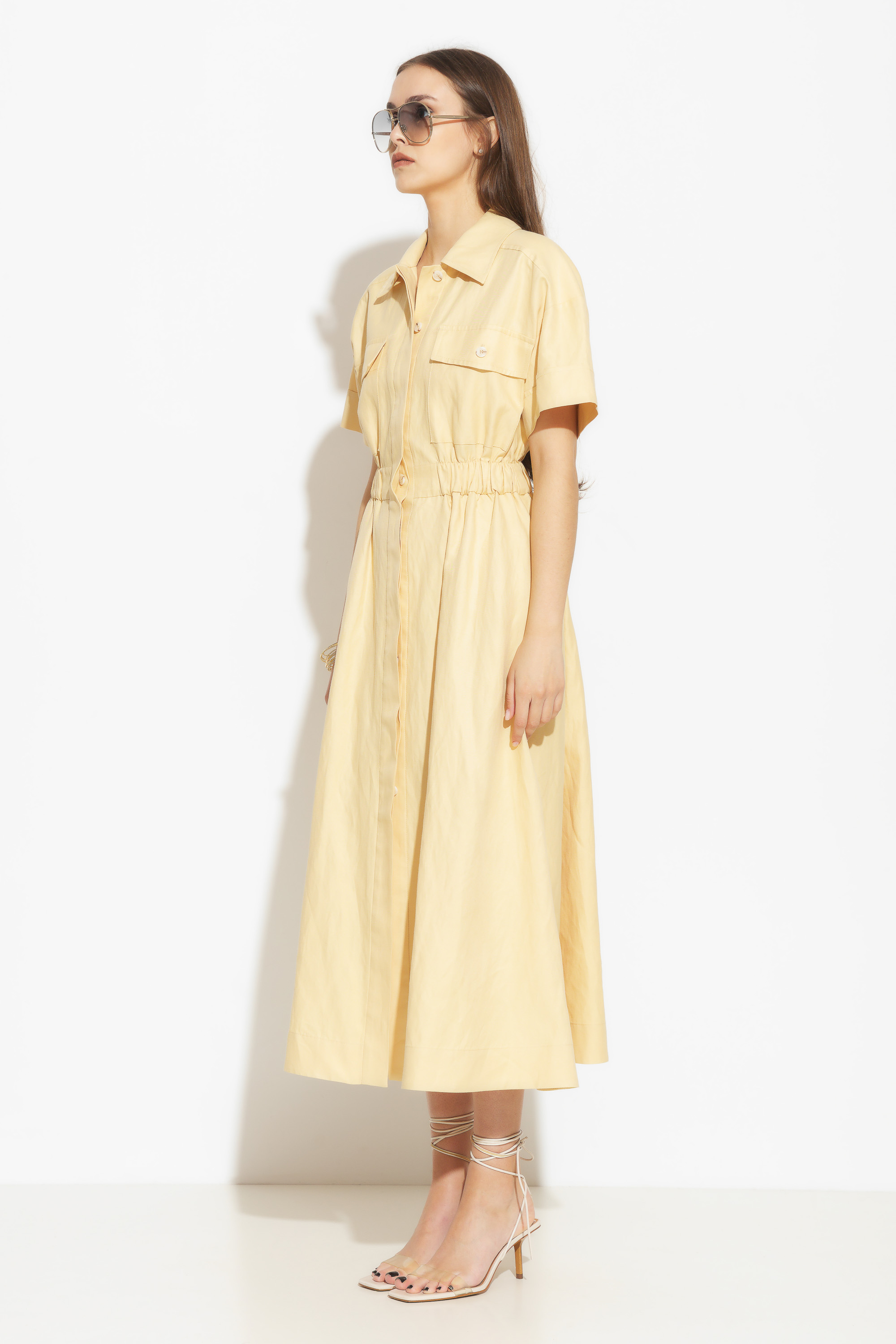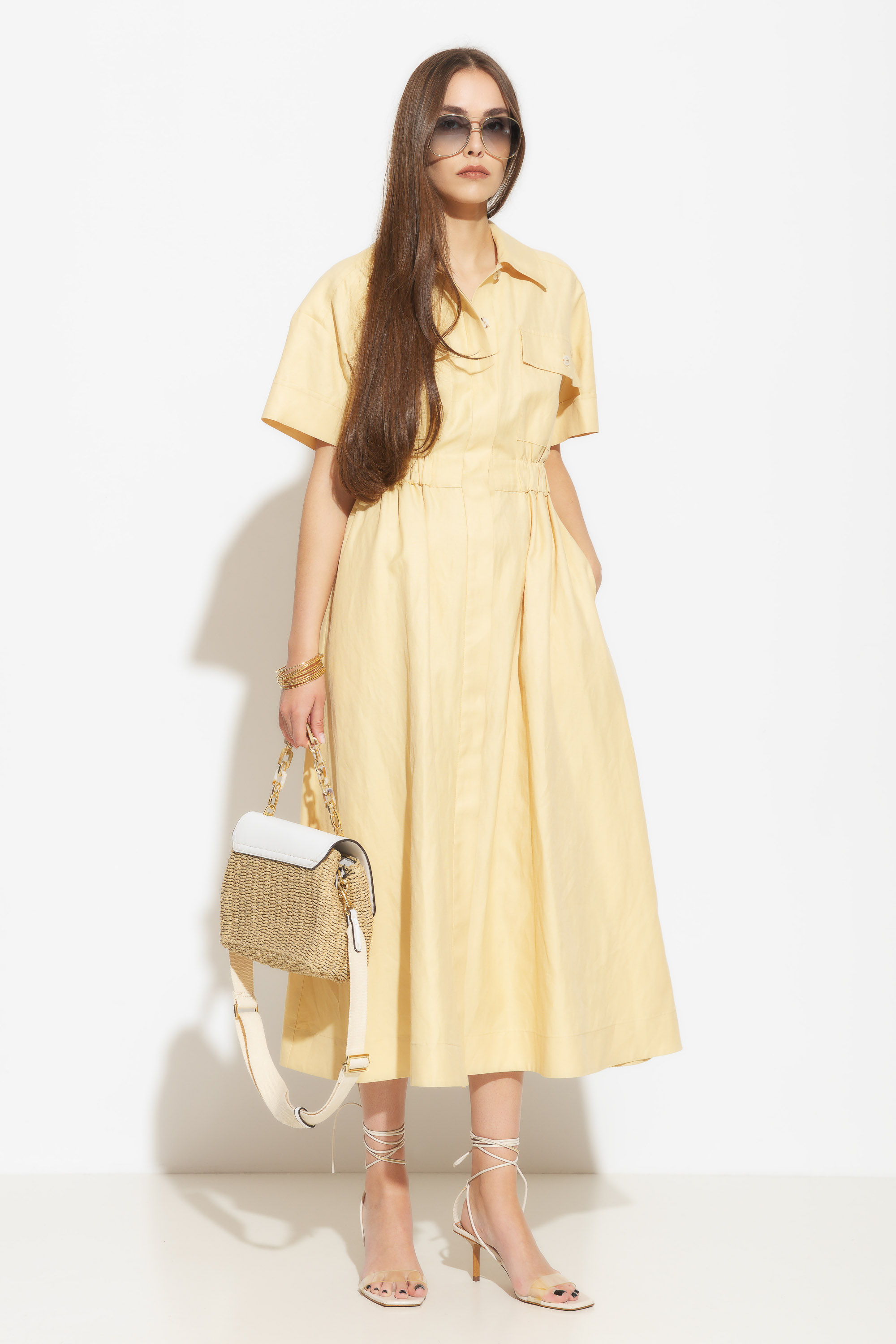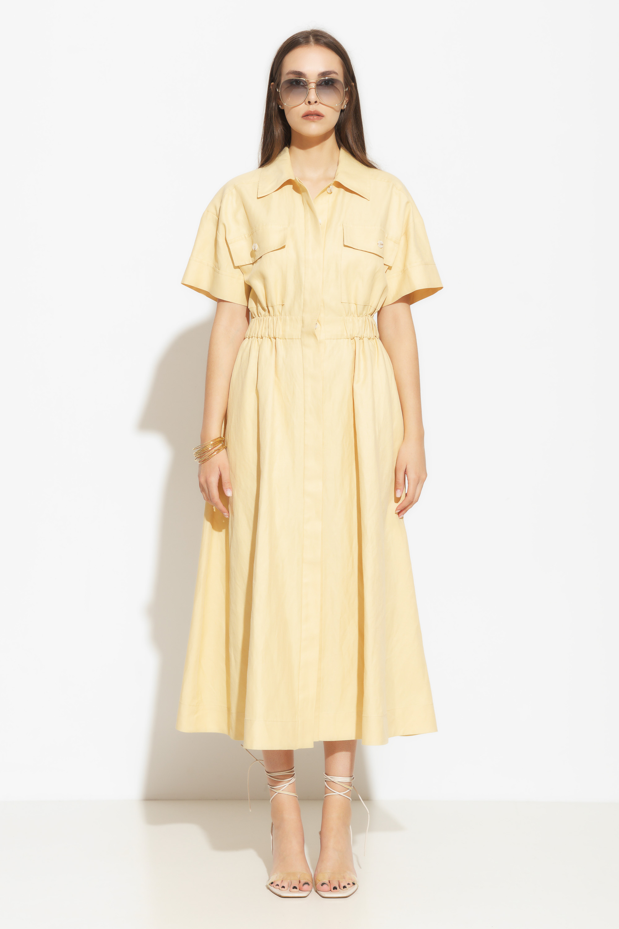 Платье миди полуприлегающего силуэта. Воротник отложной. Притачной пояс на нитке-резинке эффектно подчеркивает силуэт и гарантирует комфортную посадку изделия. На груди накладные карманы с клапанами, что добавляет эффектности. Это платье станет отличным выбором для особых случаев, вечеринок или романтических свиданий, когда вы хотите выглядеть изысканно и элегантно.