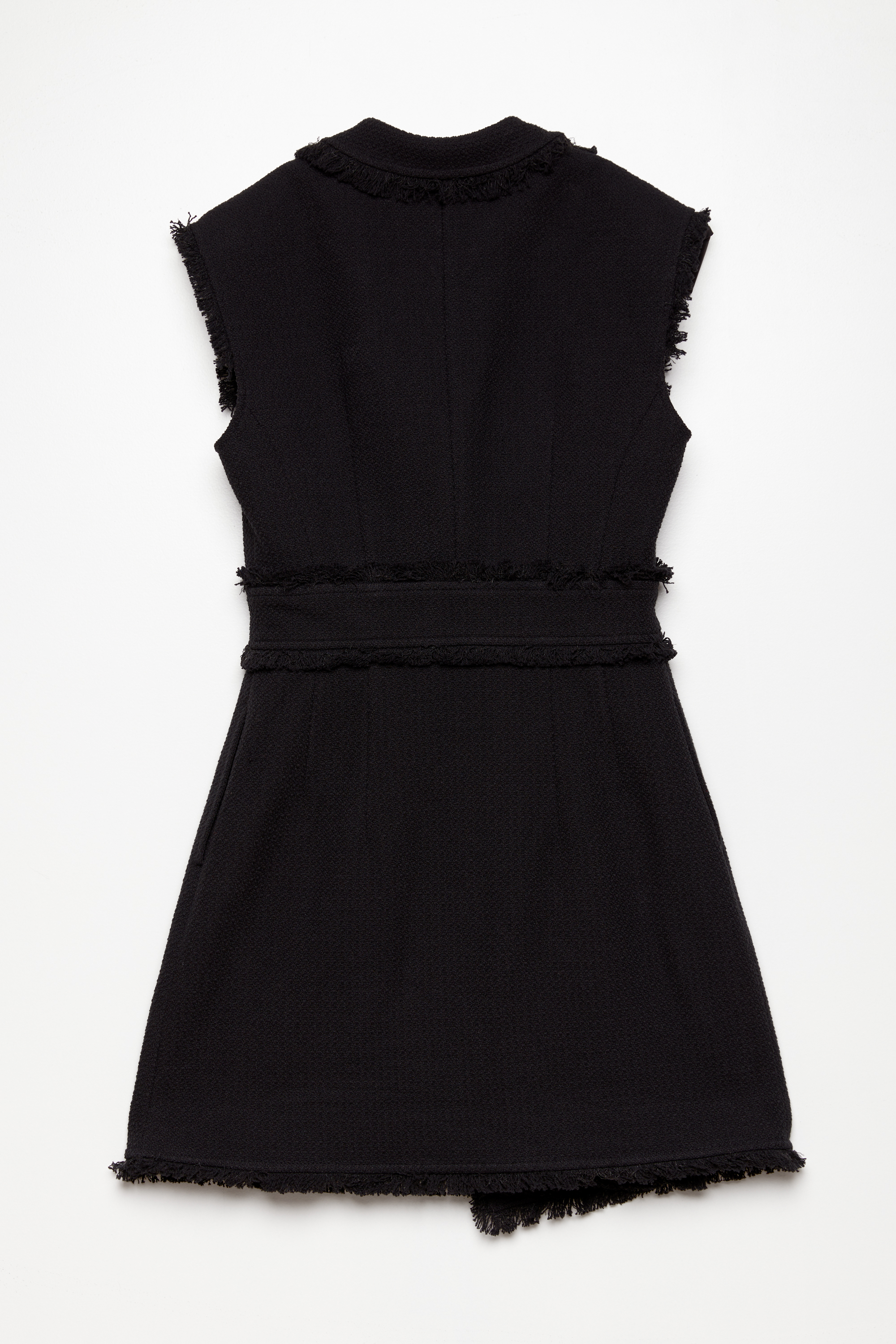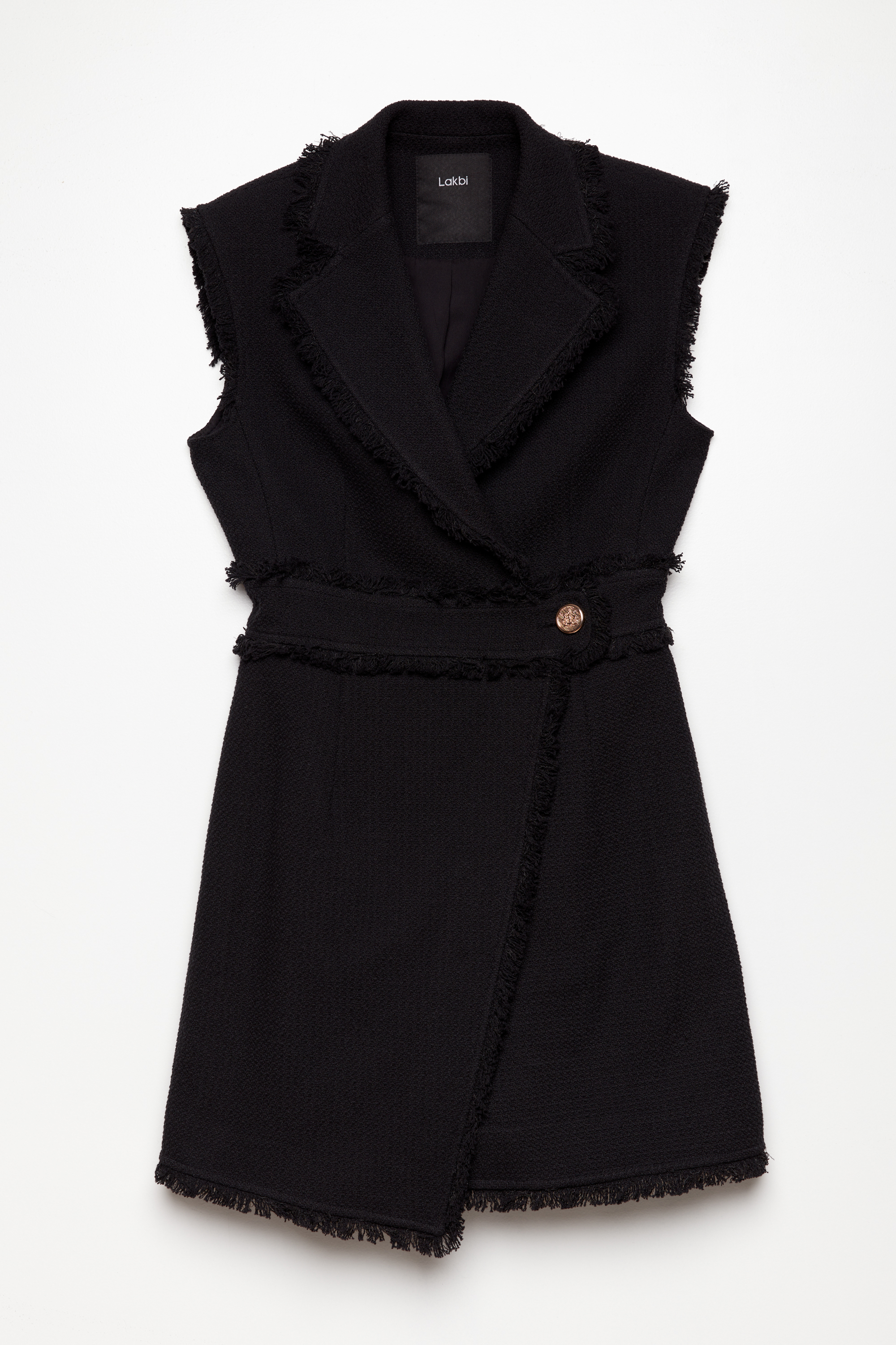 Платье твидовое в длине мини. Полуприлегающий силуэт и бахрома по краям изделия добавляет образу женственности и романтичности. Воротник отложной. Застегивается на акцентную пуговицу на талии. Классическая модель, которая станет незаменимым помощником в вашем гардеробе для создания эффектных и женственных образов.