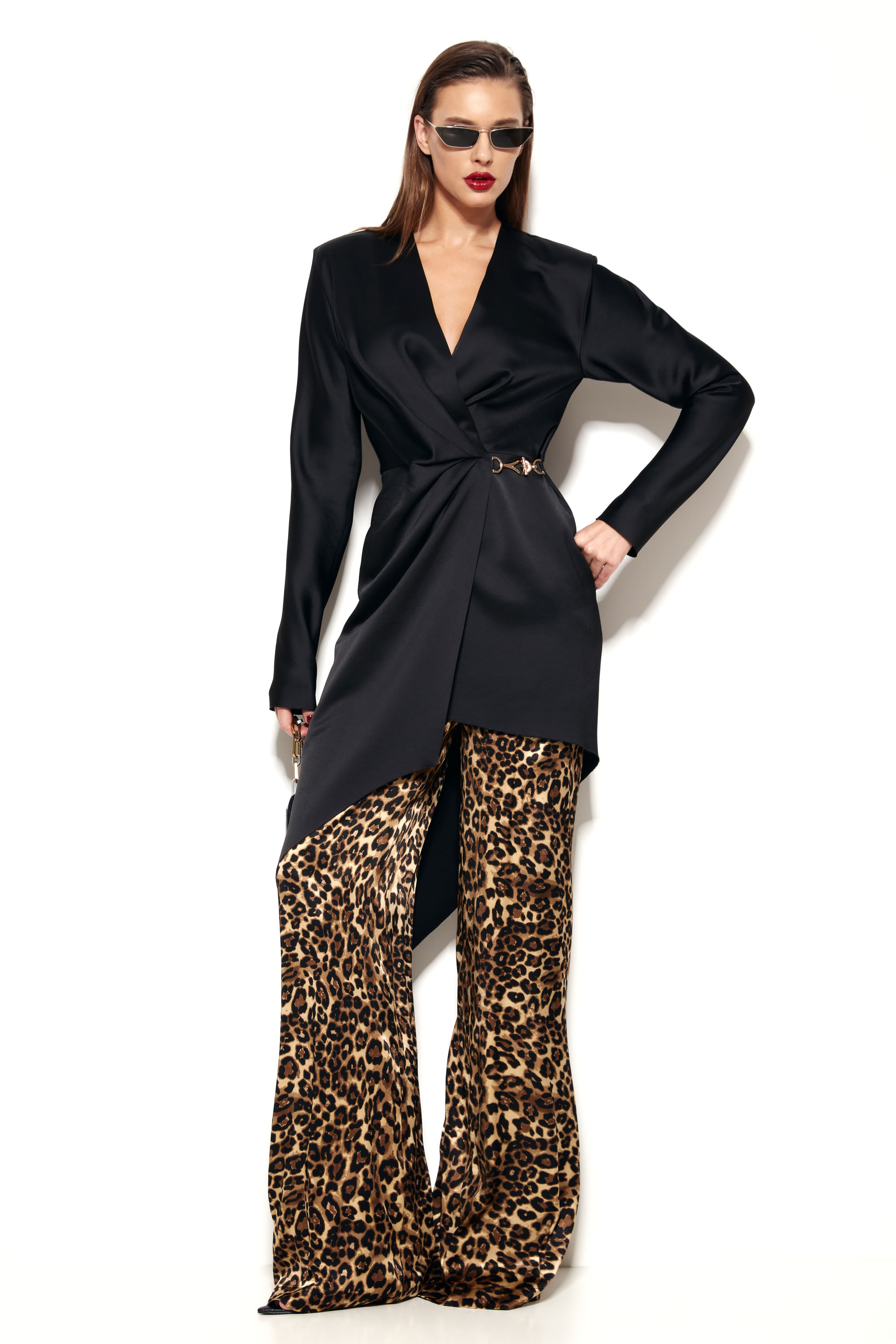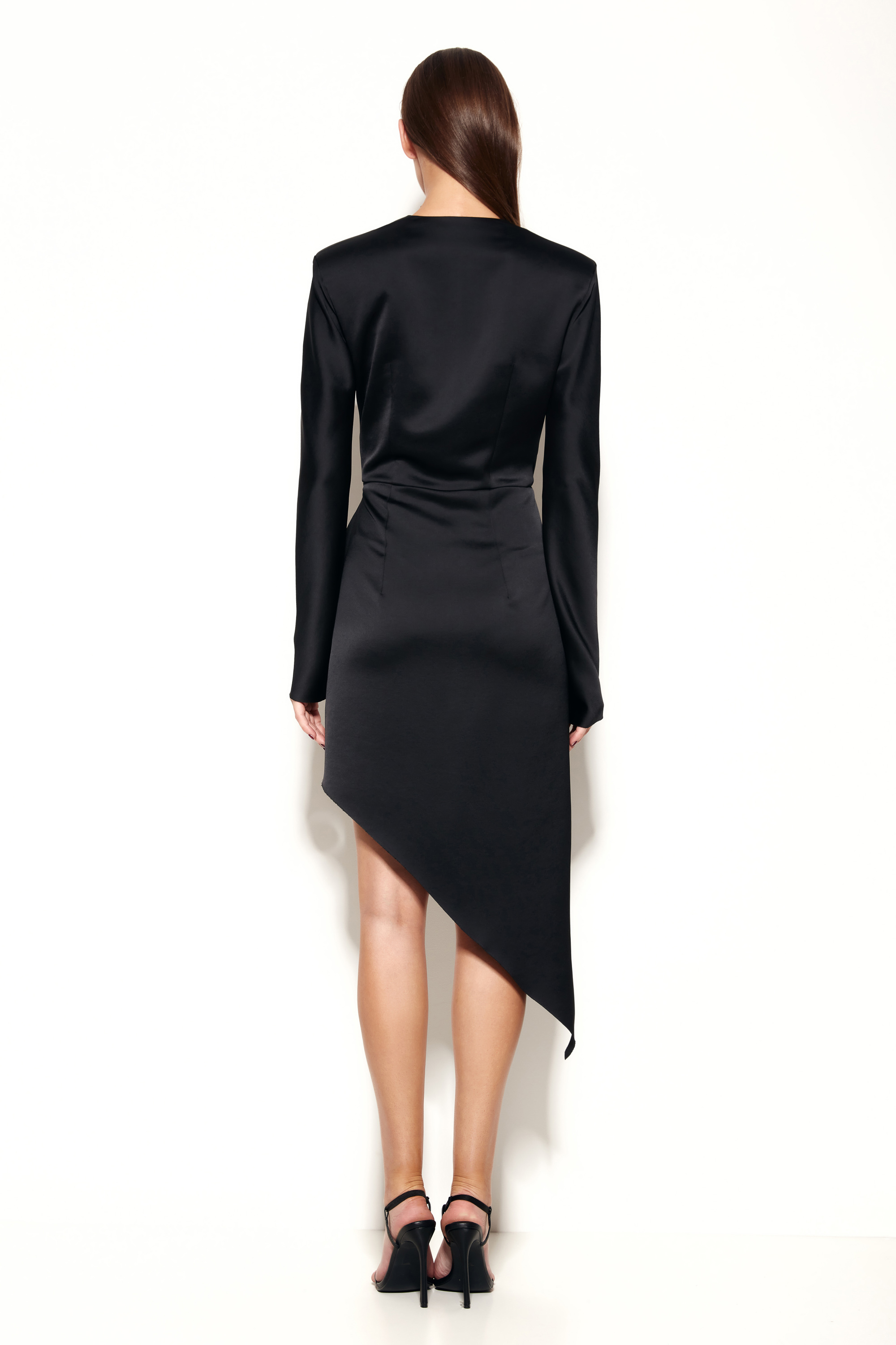 Платье полуприлегающего силуэта, асимметричной длины. V-образный вырез горловины. Застегивается на акцентную застежку на талии. Линия плеч расширена, с подплечниками. Эффектная модель для создания стильных и эффектных образов.