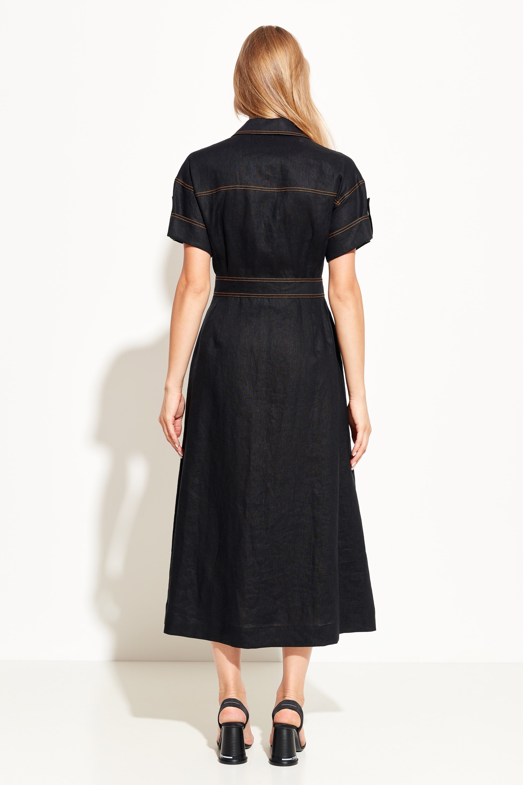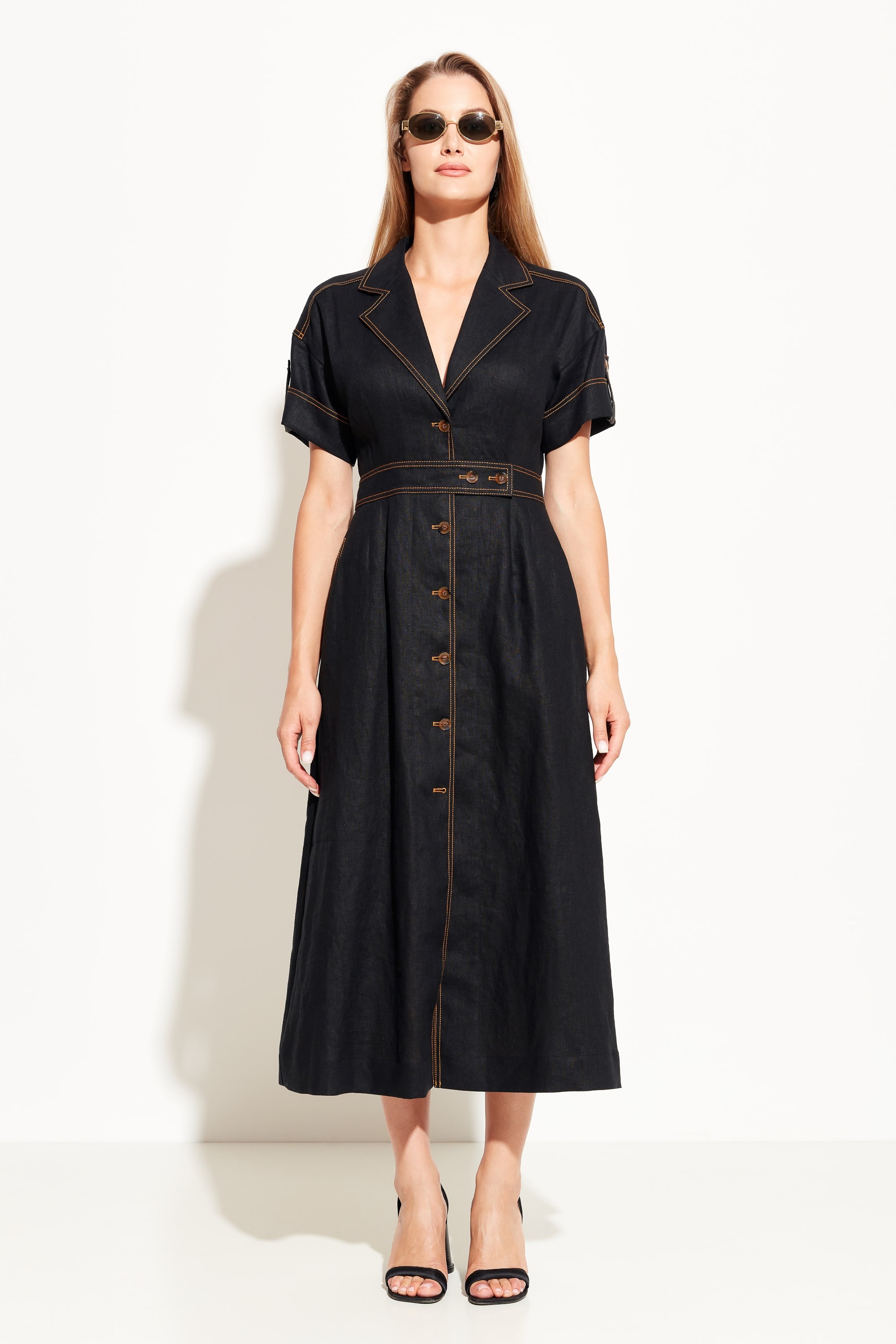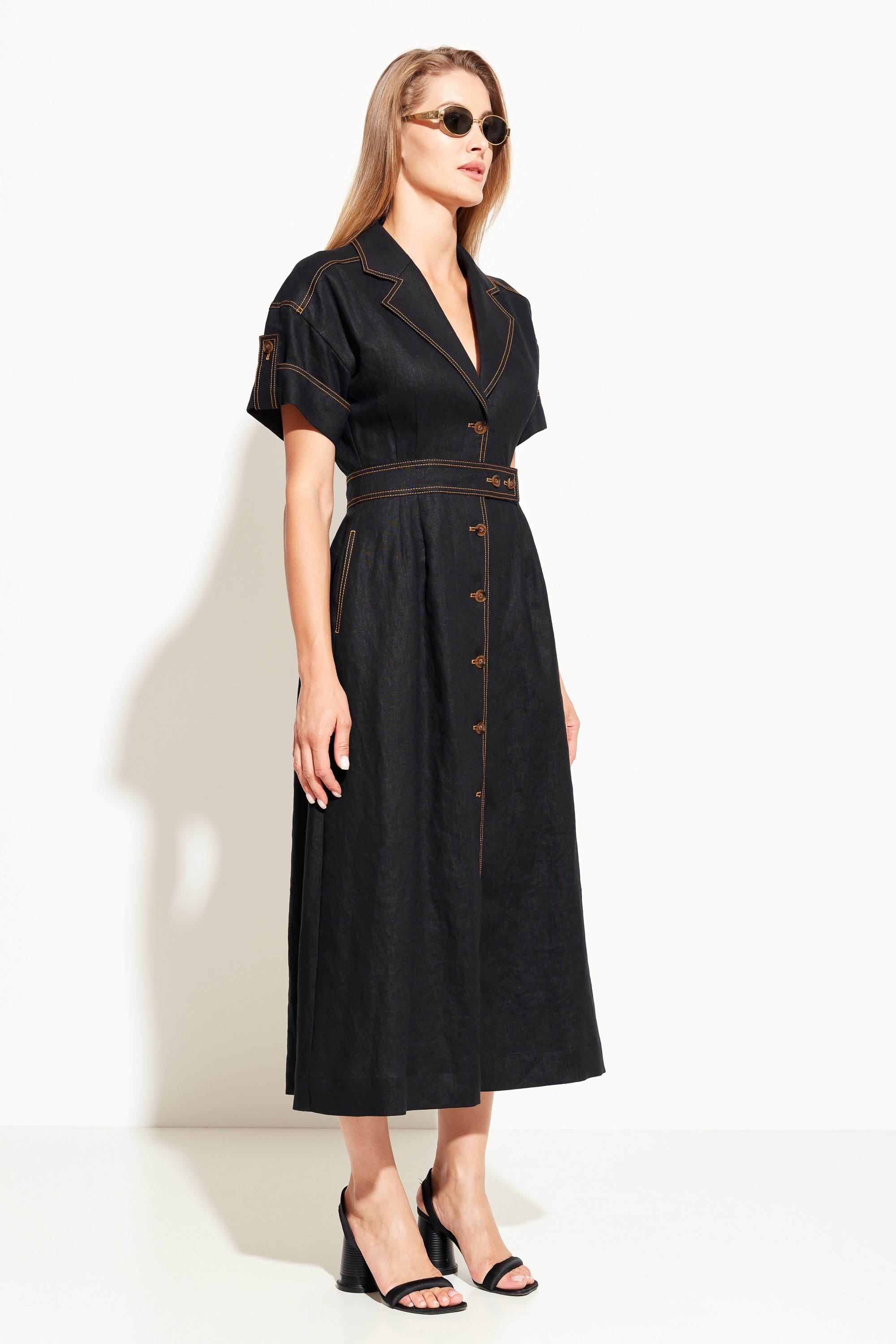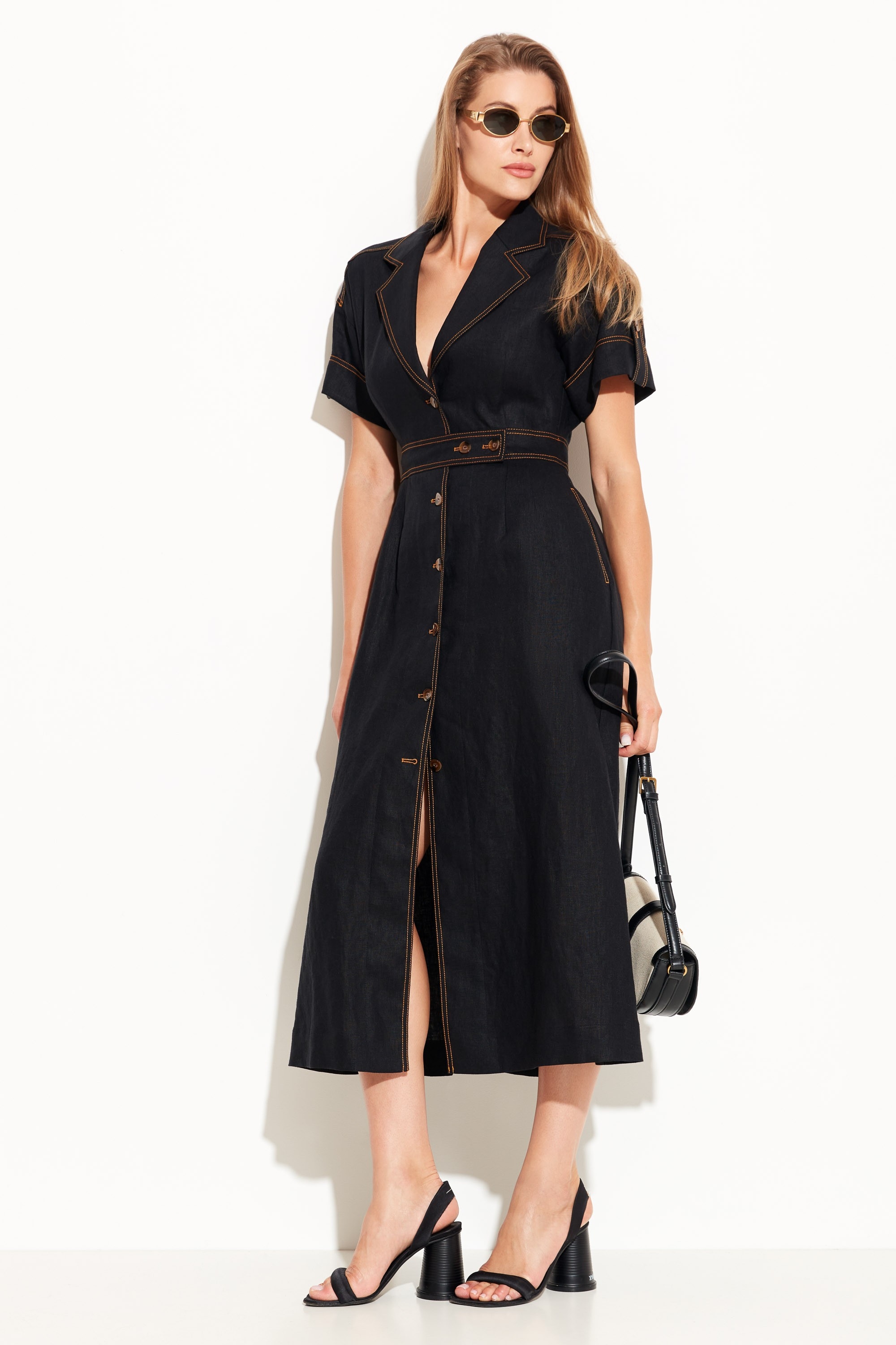 Платье полуприлегающего силуэта в длине миди. Воротник отложной. Линия плеч спущена. Объем талии регулируется при помощи пояса из аналогичной ткани. Платье застегивается на акцентные пуговицы. Классическая модель, которая сочетается как с обувью на каблуках, так и на низкой платформе.