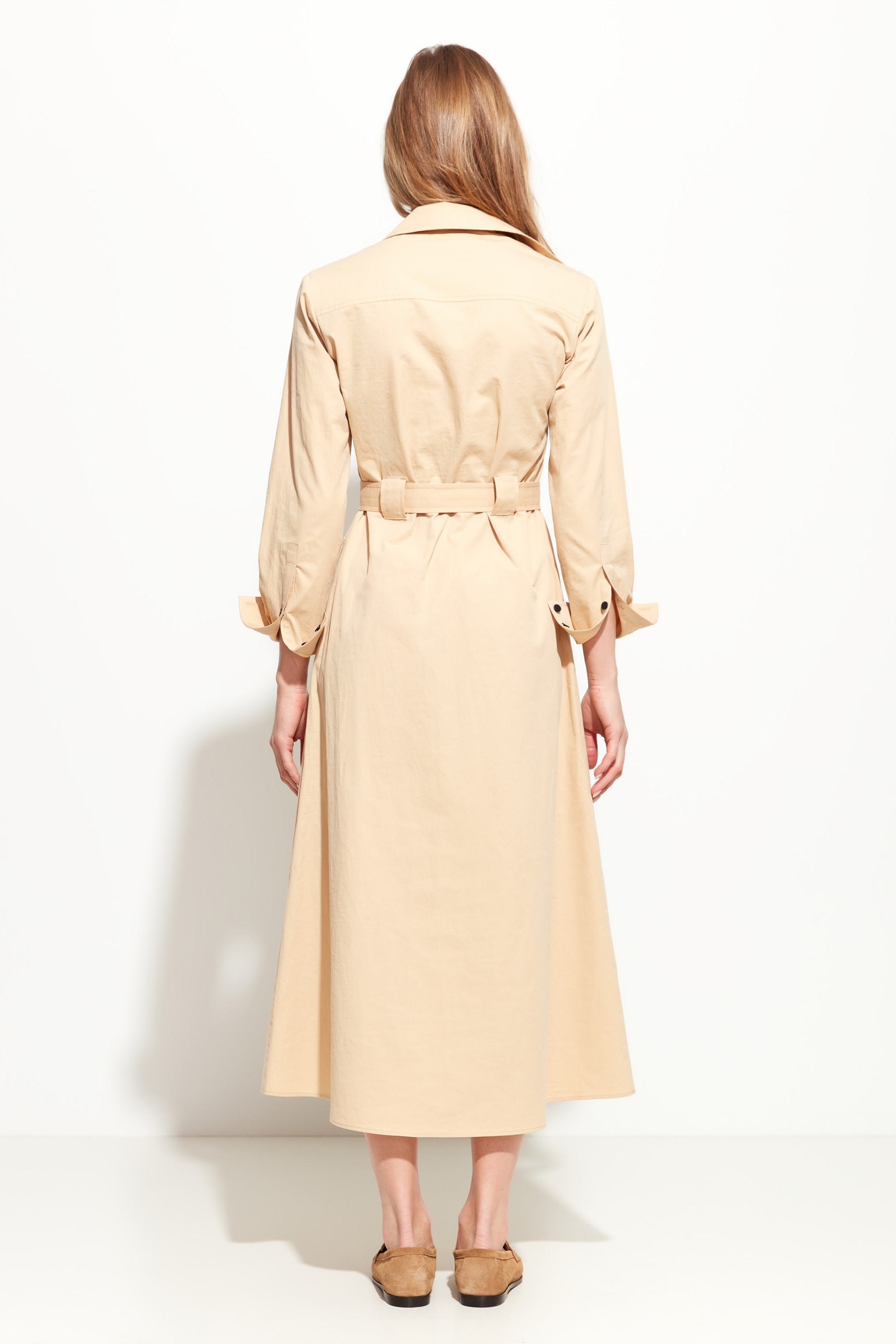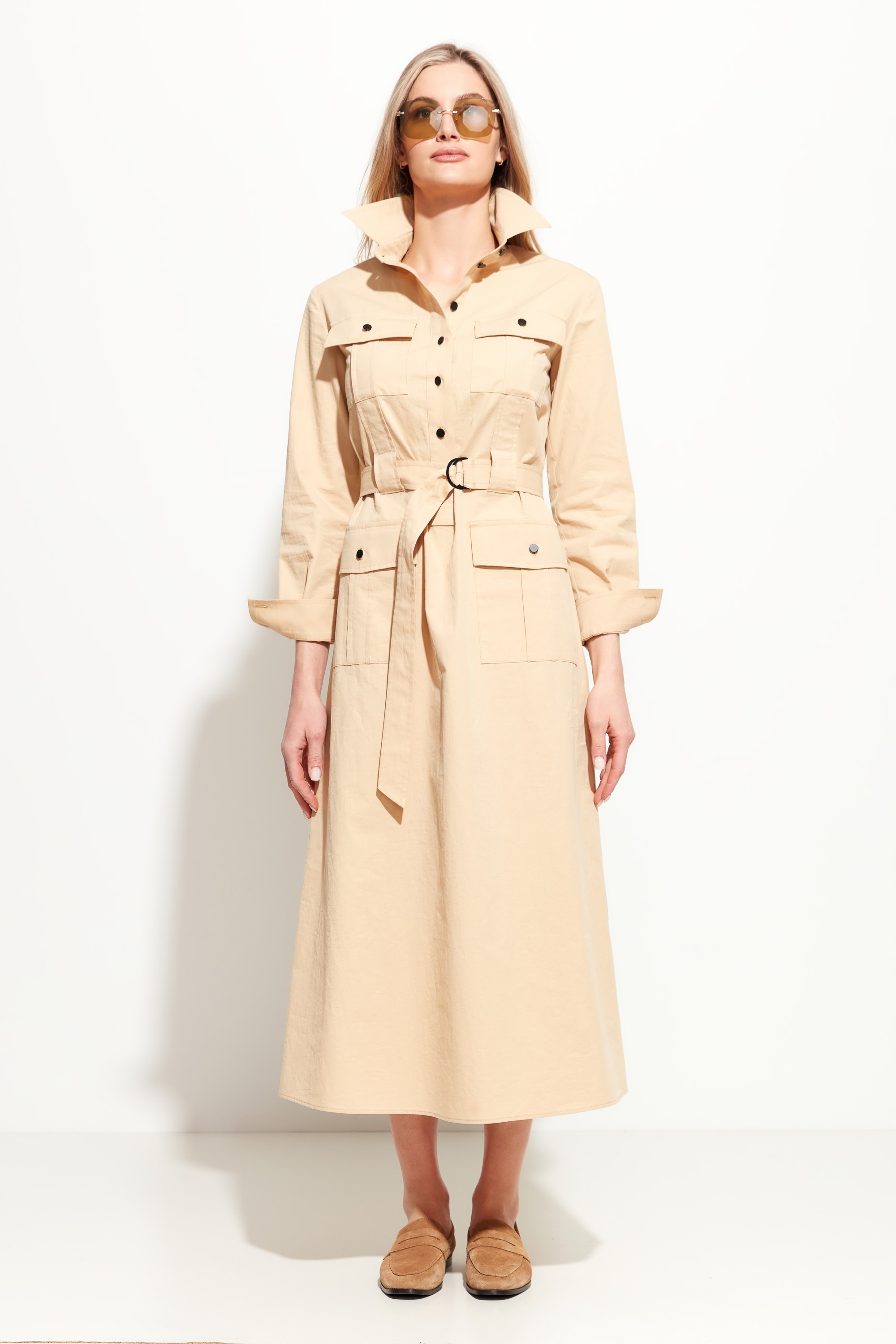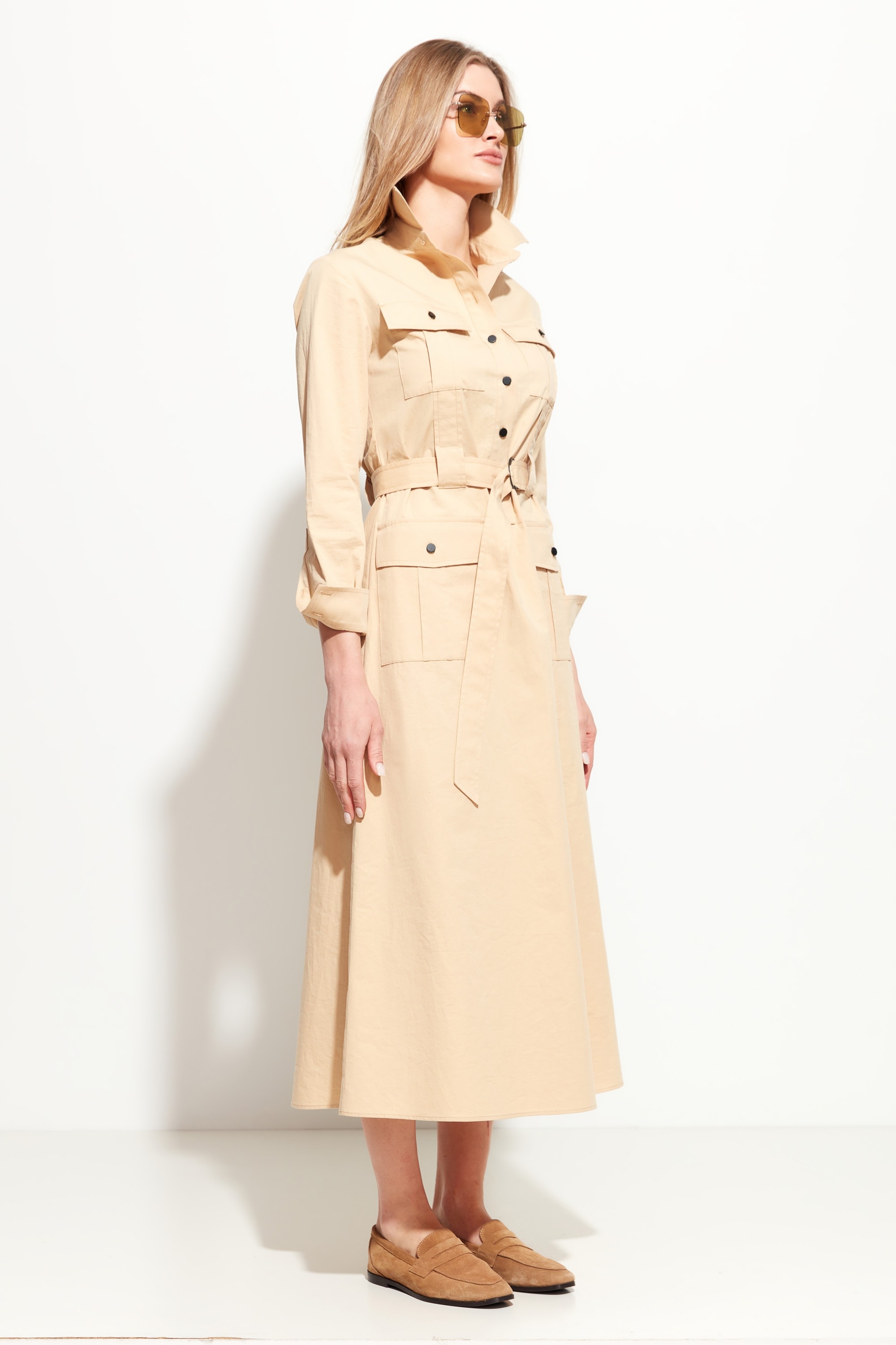 Платье полуприлегающего силуэта, в длине миди. Воротник стояче-отложной. Спереди накладные карманы с клапанами. Объем талии регулируется при помощи пояса из аналогичной ткани. Рукава длинные, на манжетах. Изделие застегивается на пуговицы акцентного цвета. Классическая модель, которая идеально подойдет для создания летних образов.