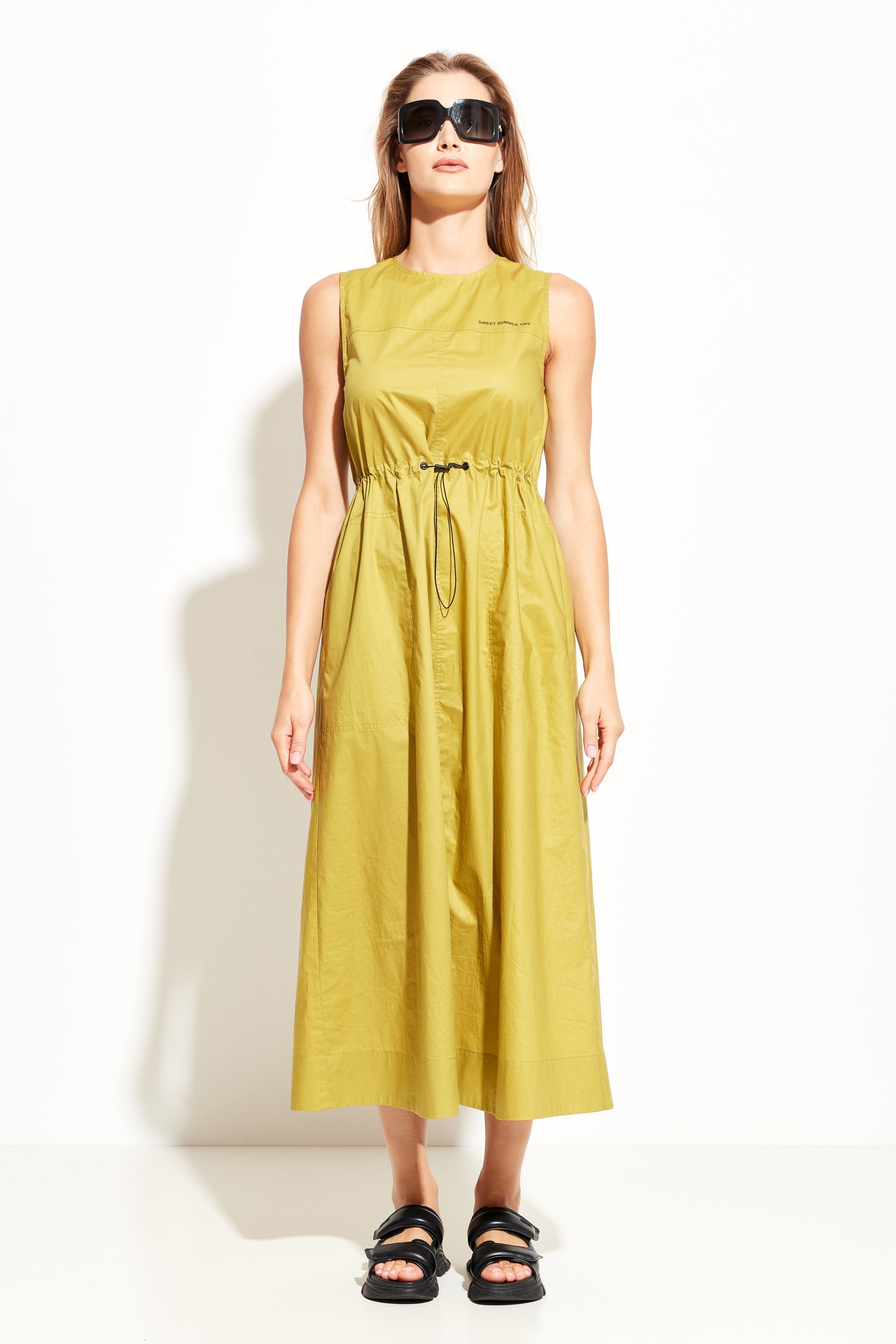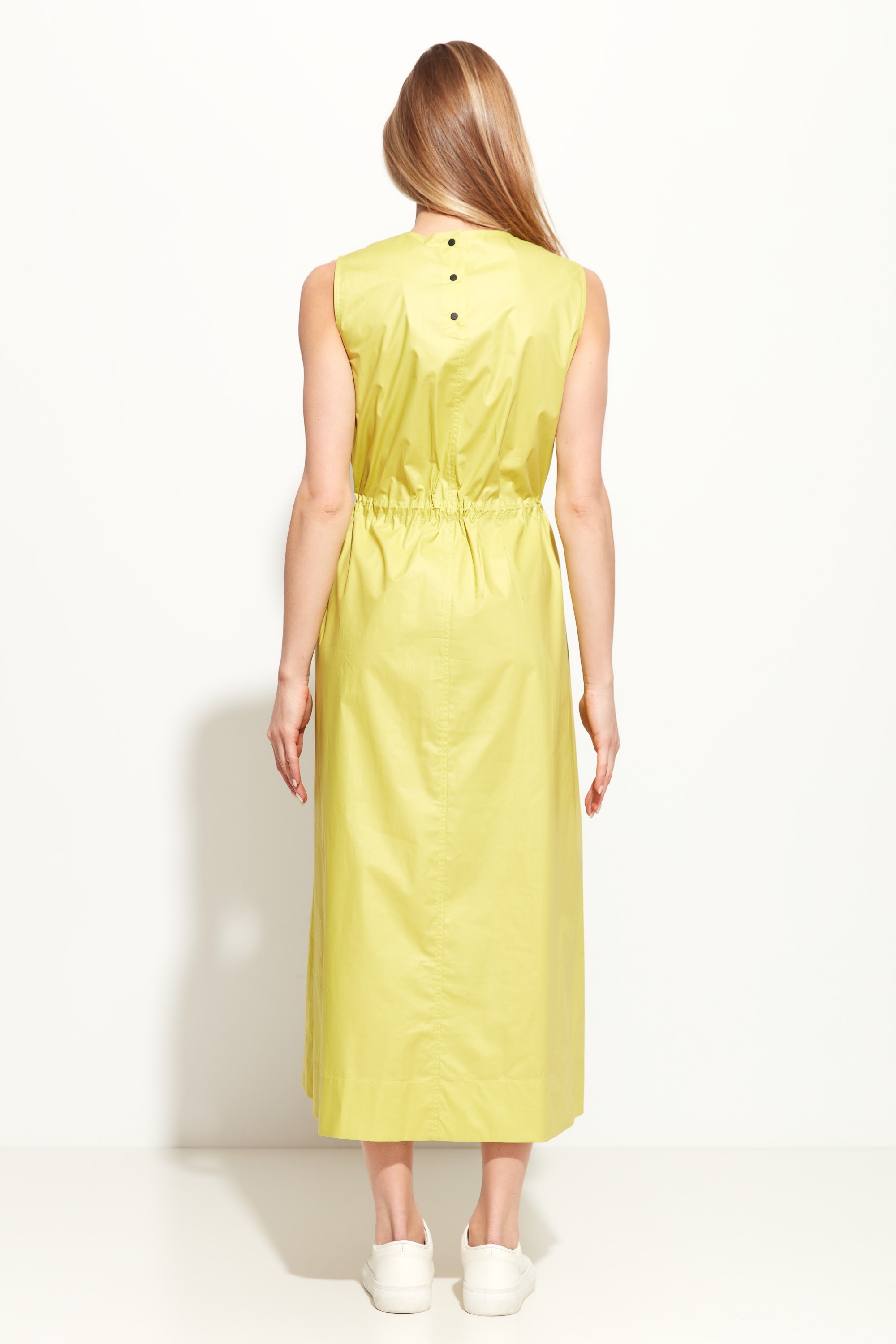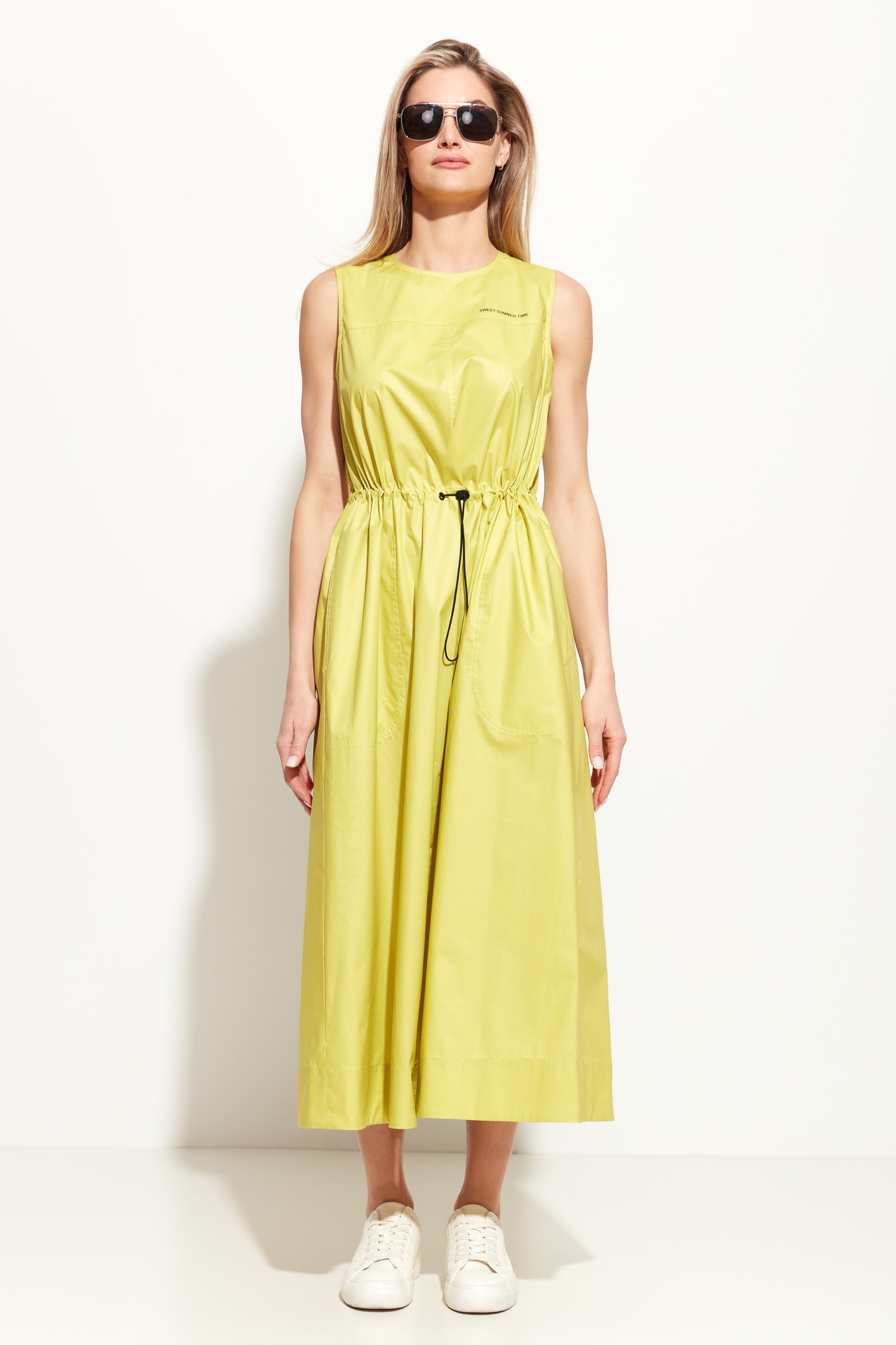 Платье А-силуэта в длине миди. Округлый вырез горловины. Объем талии регулируется при помощи протянутой резинки на фиксации. По бокам платья прорезные карманы. Базовая модель для создания стильных и комфортных летних образов.