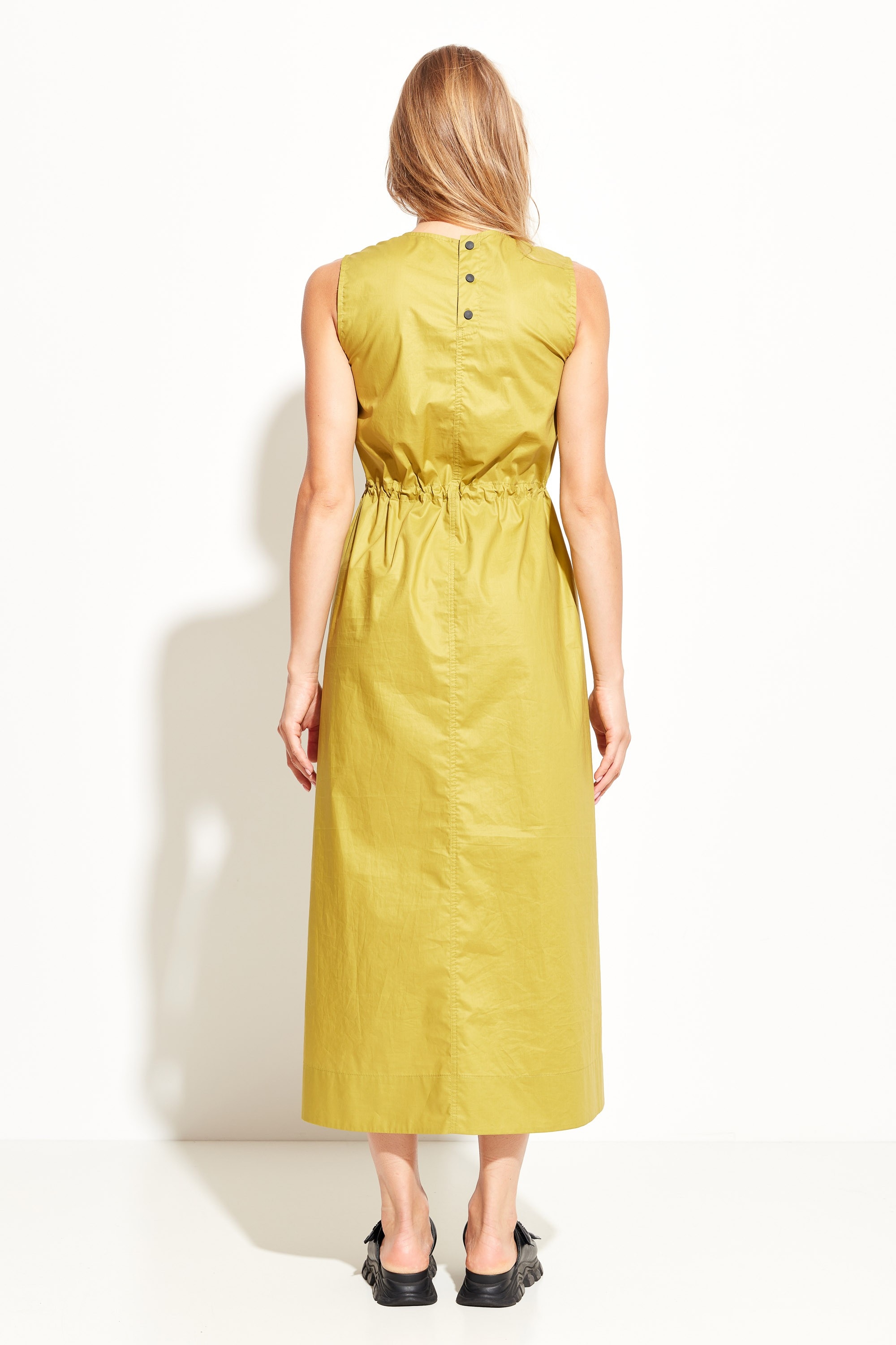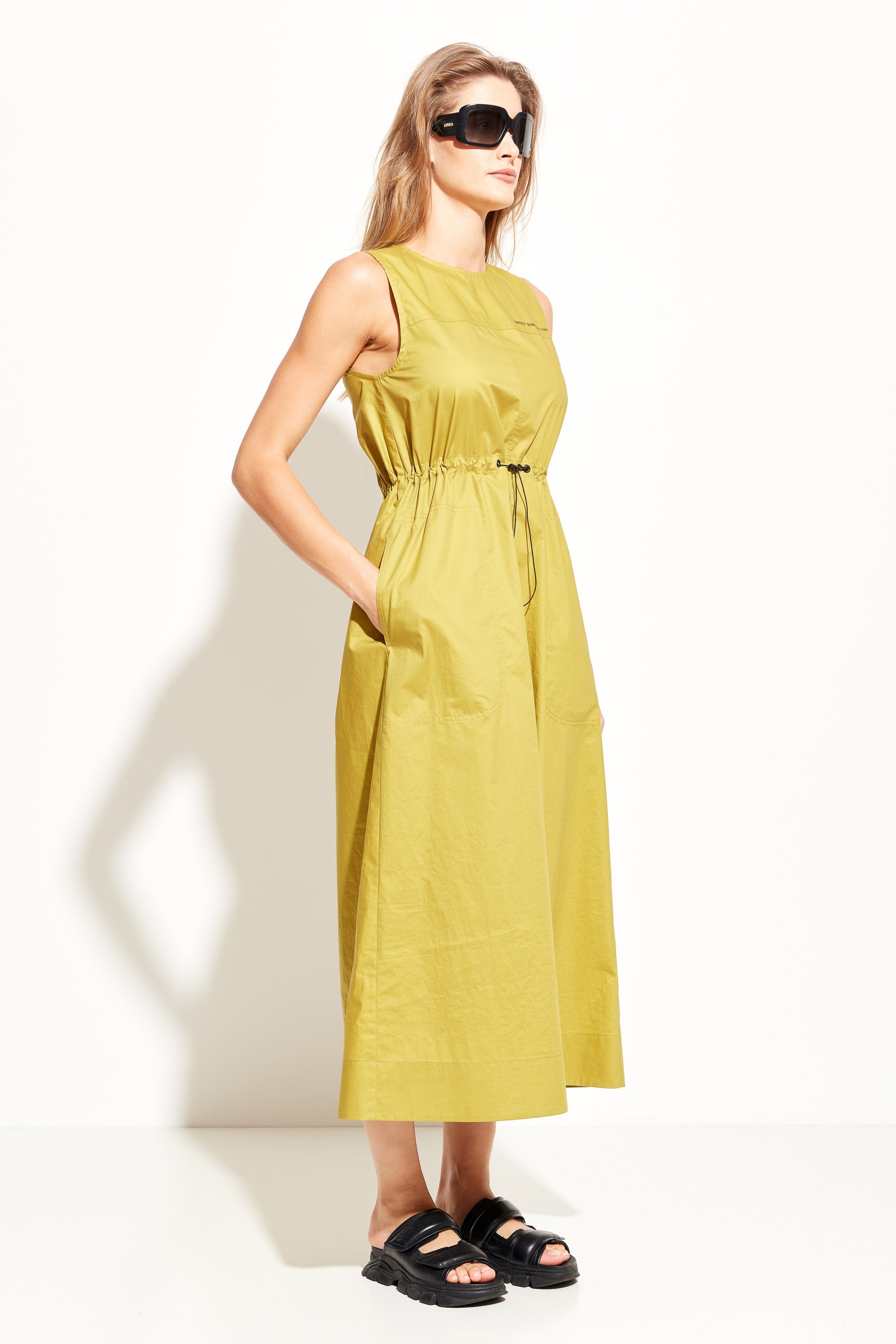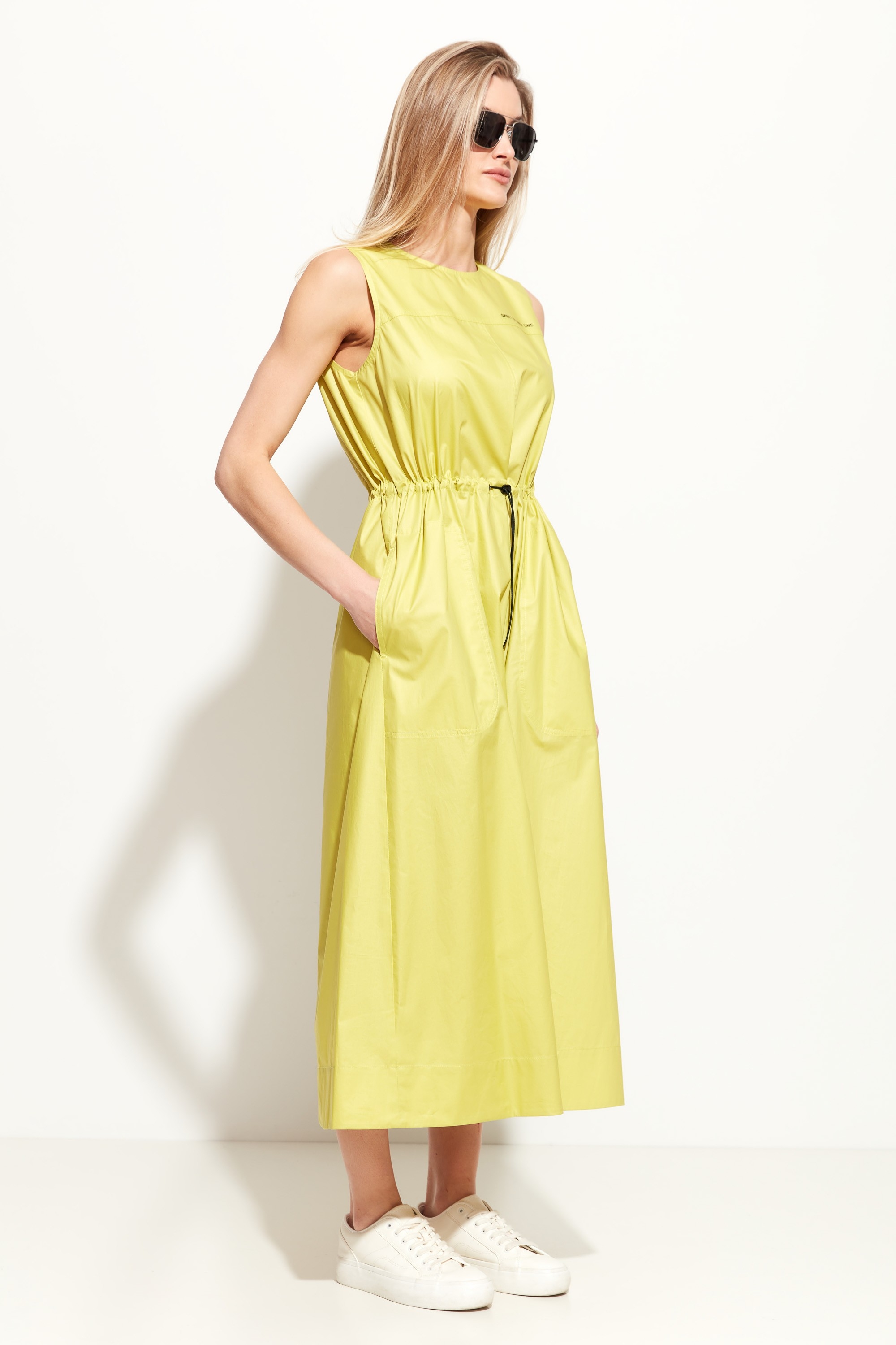 Платье А-силуэта в длине миди. Округлый вырез горловины. Объем талии регулируется при помощи протянутой резинки на фиксации. По бокам платья прорезные карманы. Базовая модель для создания стильных и комфортных летних образов.