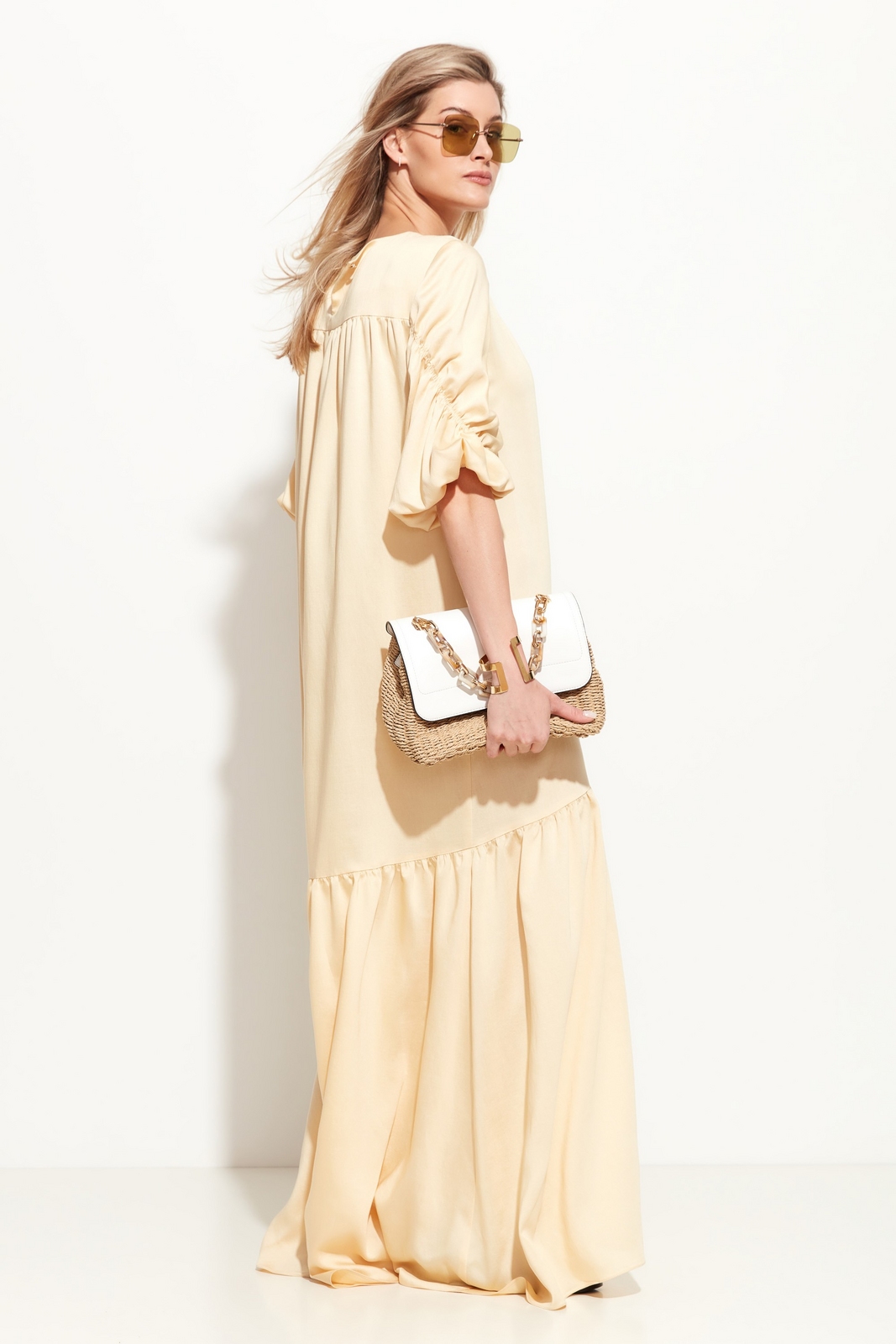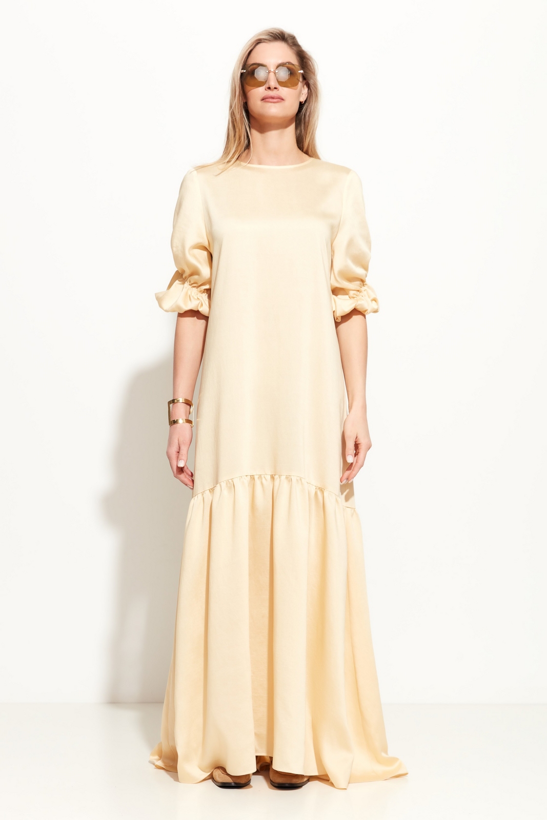 Платье свободного кроя в длине макси. Вырез горловины округлый. Линия плеч спущена. Спинка и рукава изделия декорированы драпировкой. Юбка в виде объемного волана добавляет образу легкости и расслабленности. Комфортная модель для жарких летних дней.