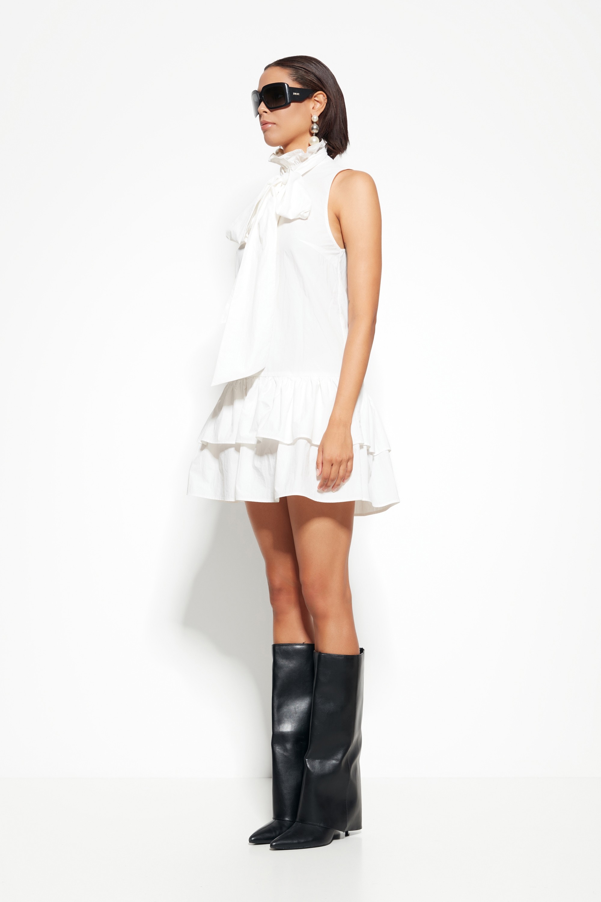 Модель из коллекции Party 2026 — платье без рукавов с выразительным объёмным бантом на лифе и юбкой, украшенной крупными воланами. Особая фактура, многослойность драпировки и чёткий женственный силуэт делают его притягательным выбором для торжественных случаев.