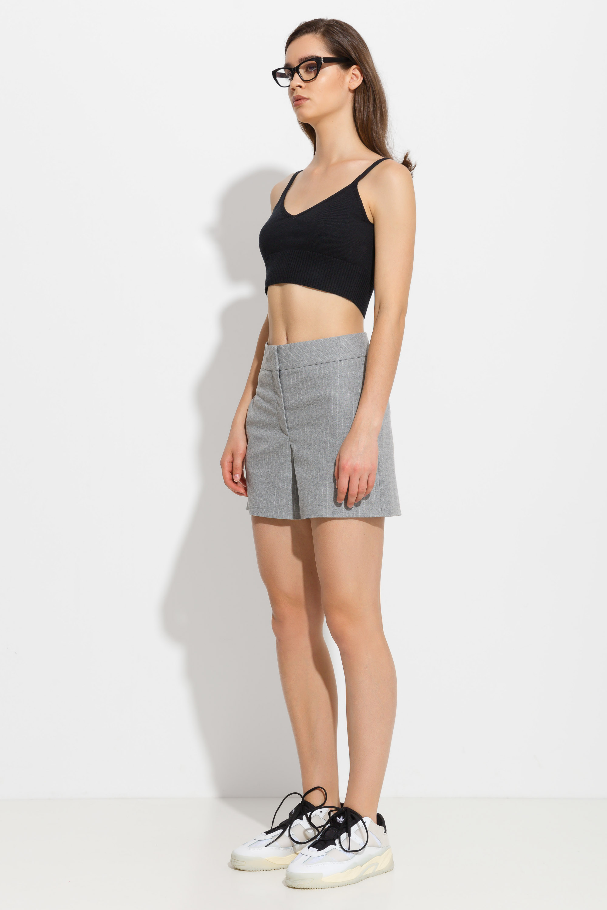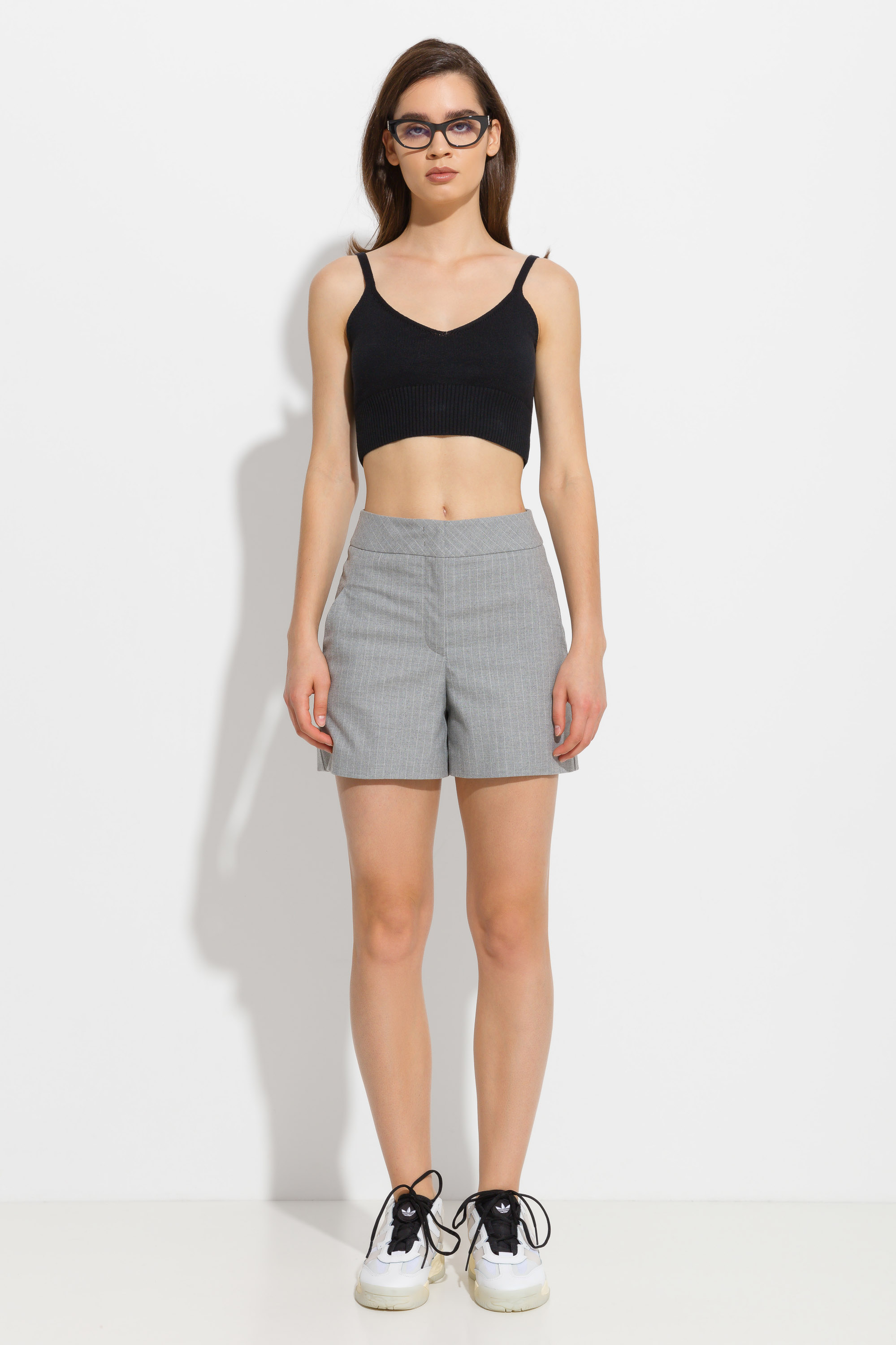 Шорты мини прямого кроя. Средняя посадка. По бокам обрезные карманы. Классический крой и цвет позволяют сочетать шорты с вещами из различного типа гардероба. Универсальная модель.